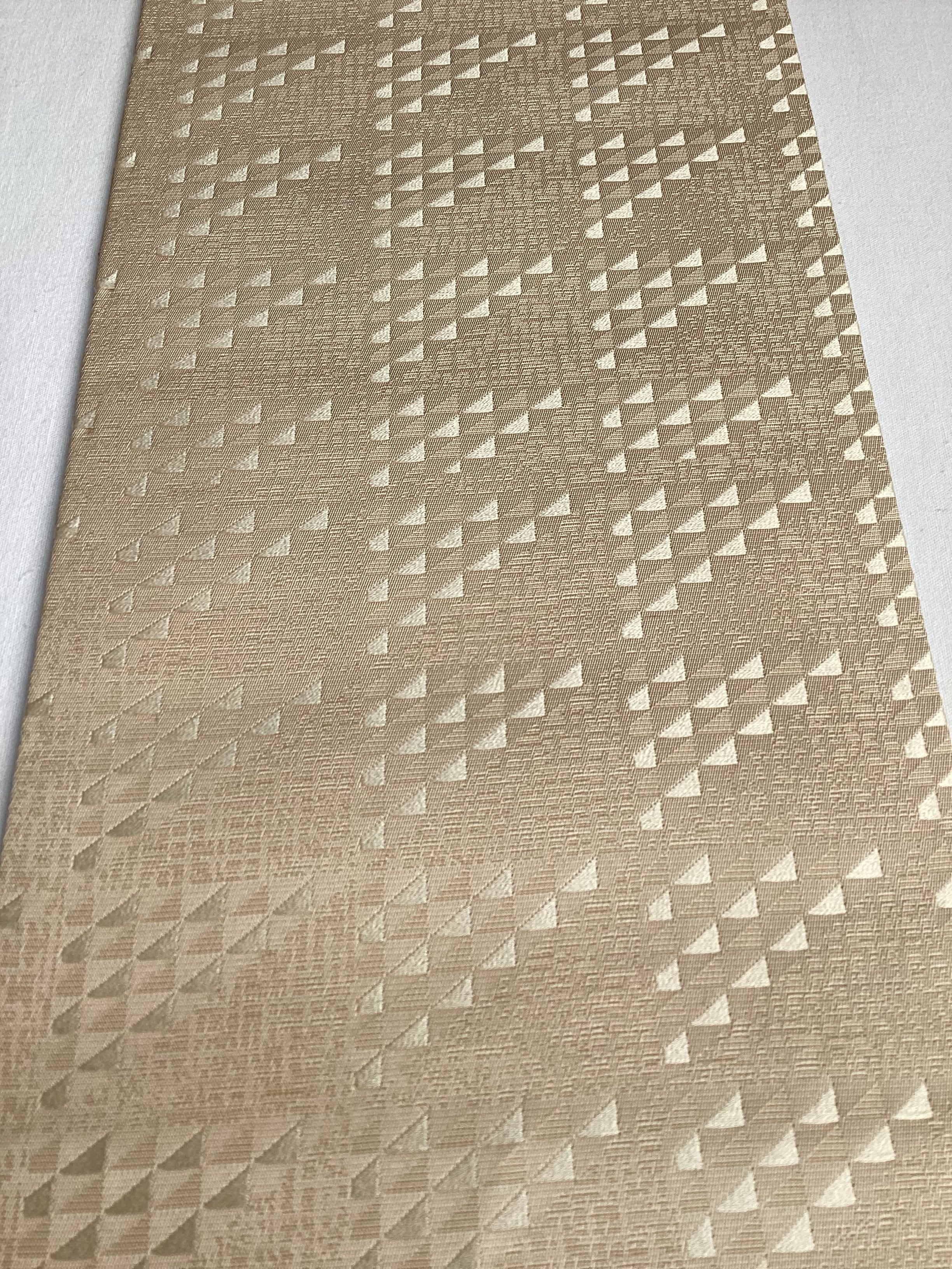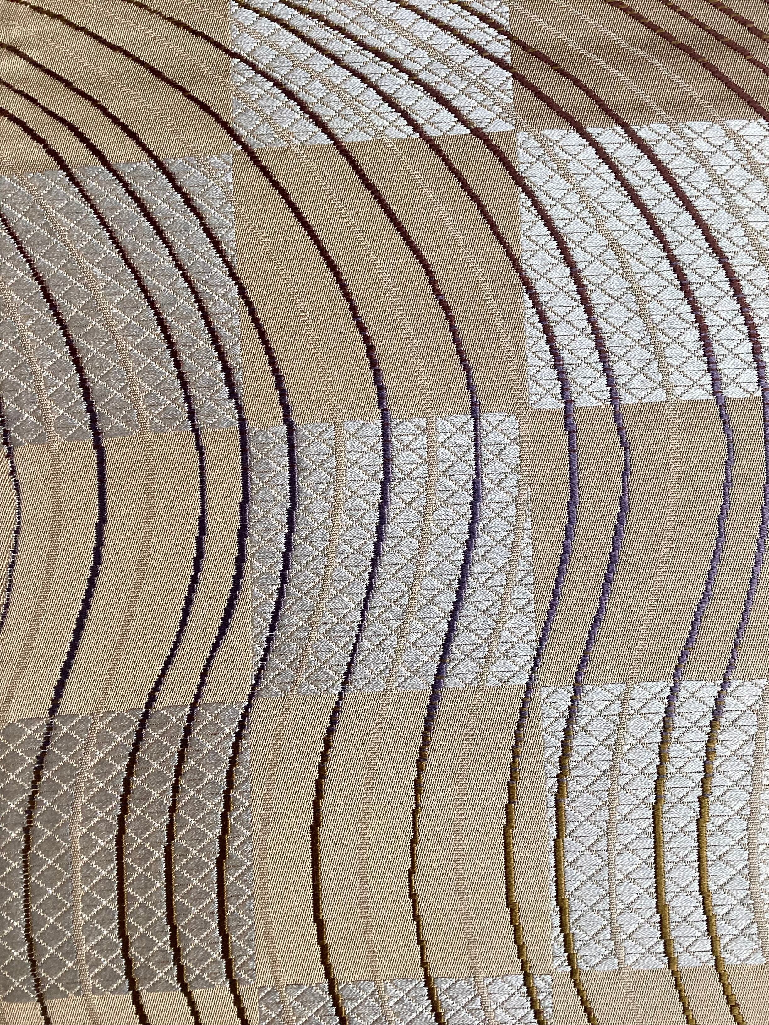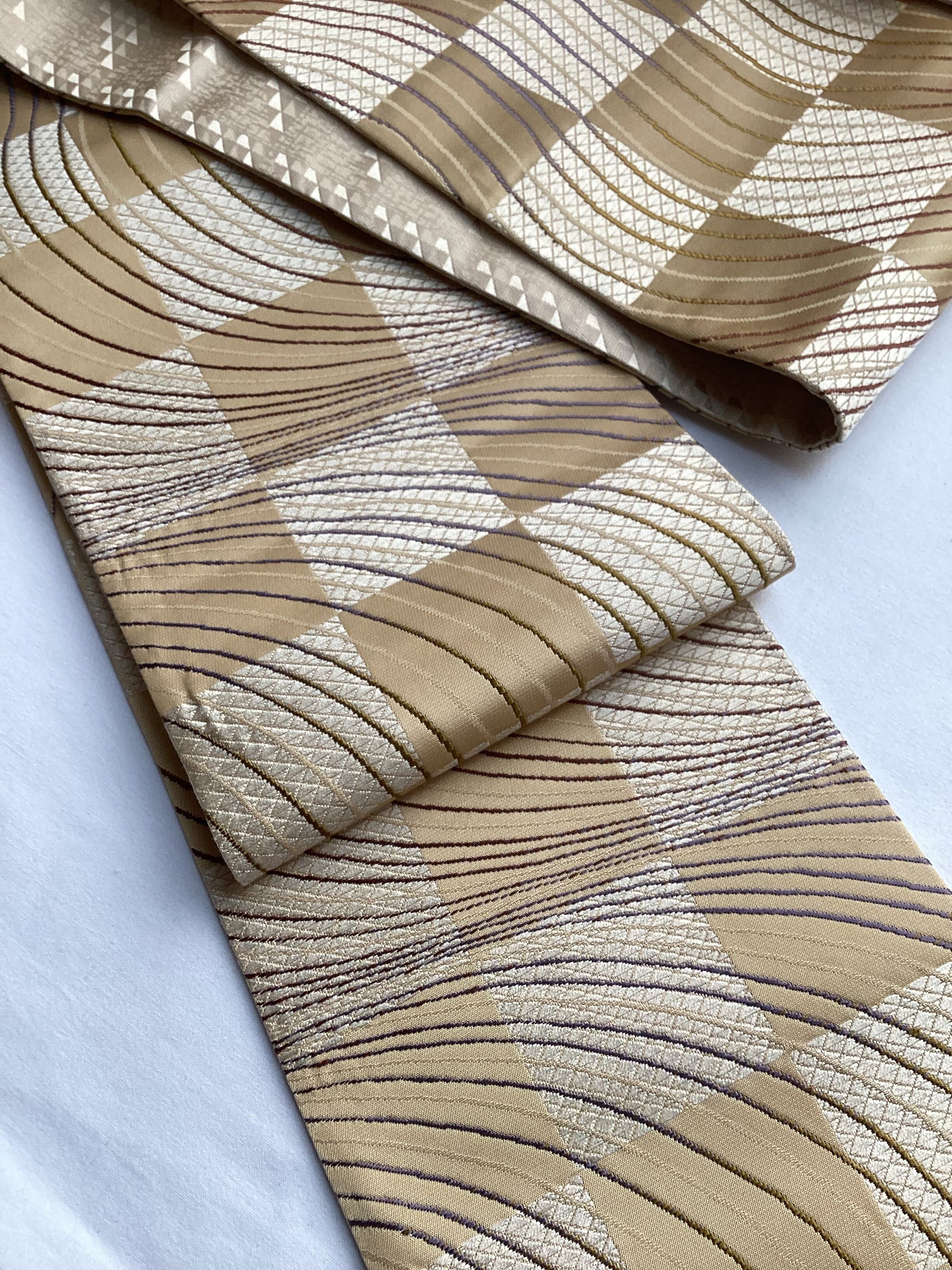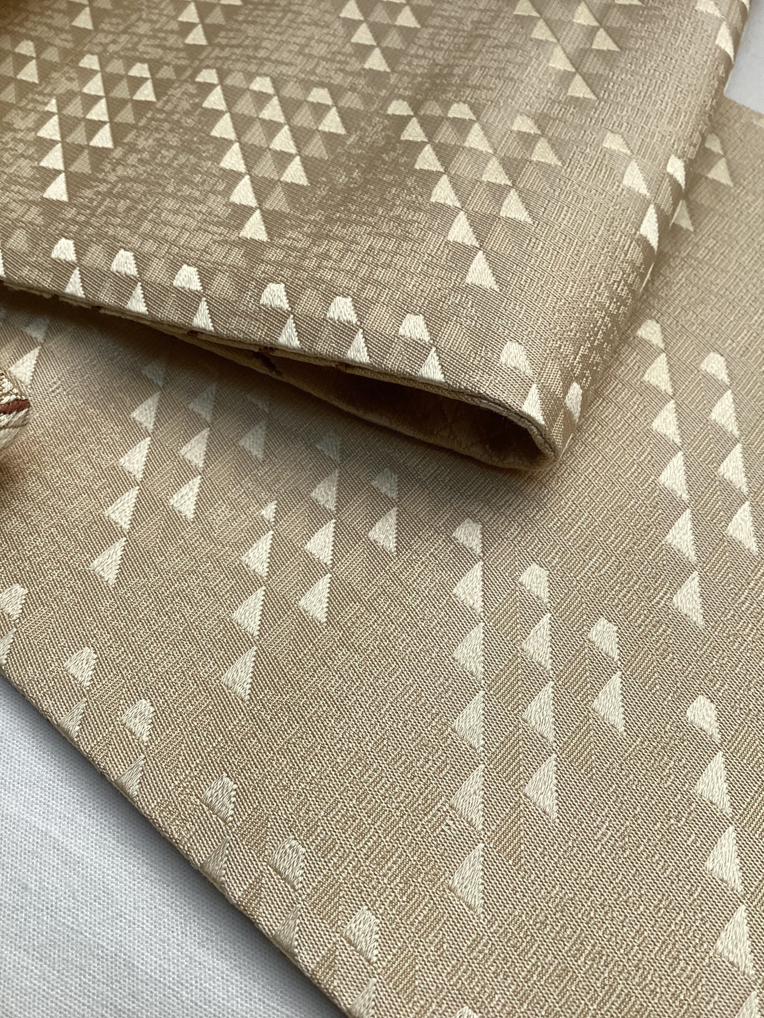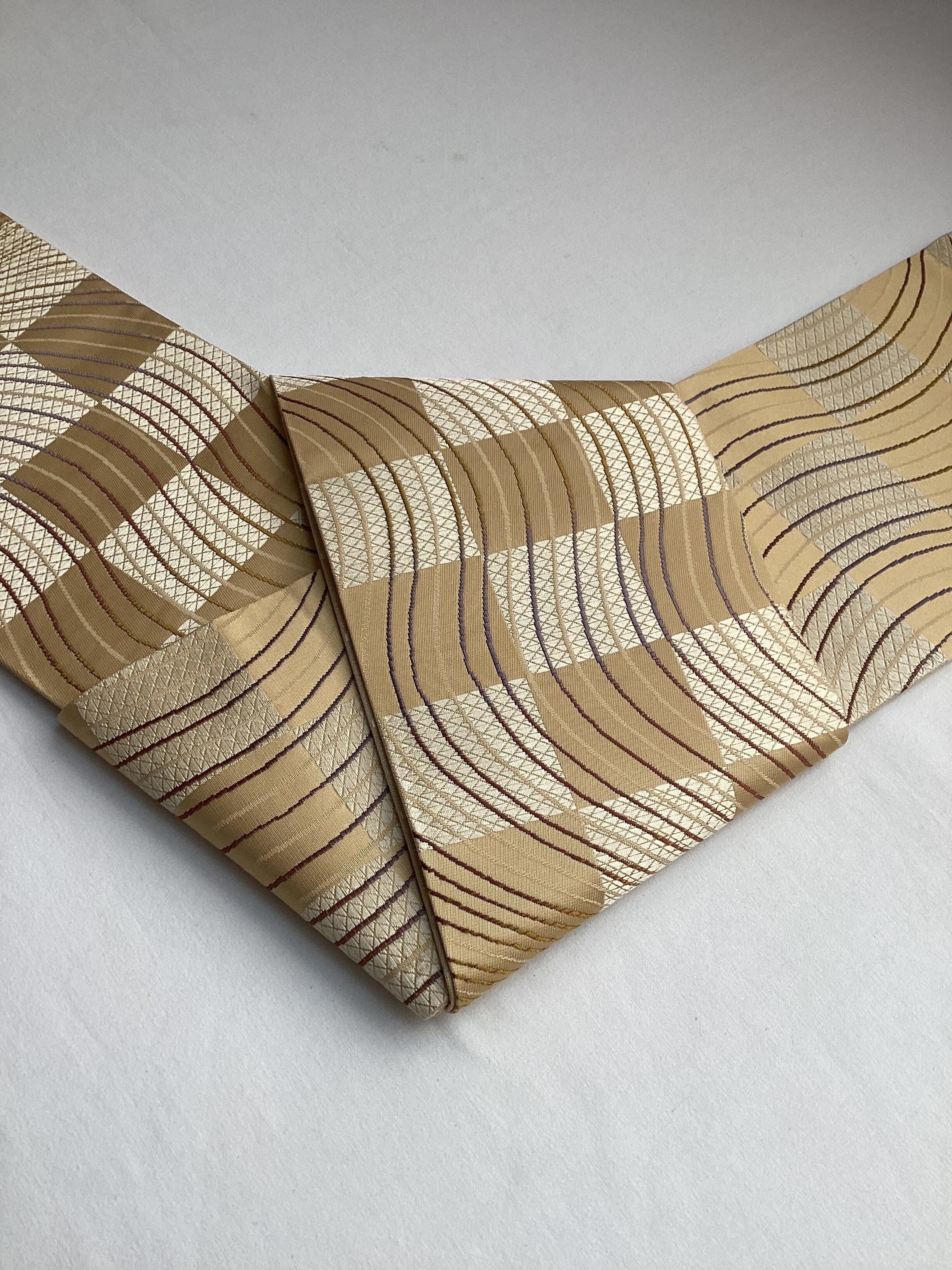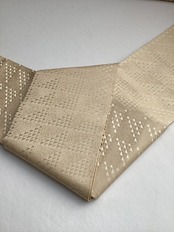 艶やかで上質な質感の両面お使いいただける半巾帯です。丁子色(イエローベージュ)の市松文様の上によろけたラインが躍動感のある面と、シンプルながら鱗文様が艶々と浮き立つ面の2つのお柄を楽しむことが出来ます。長さが充分ございますので、色んな飾り結びをお楽しみ下さい。半巾帯ながら、カジュアルになり過ぎず砕け過ぎない装いが出来る帯です。