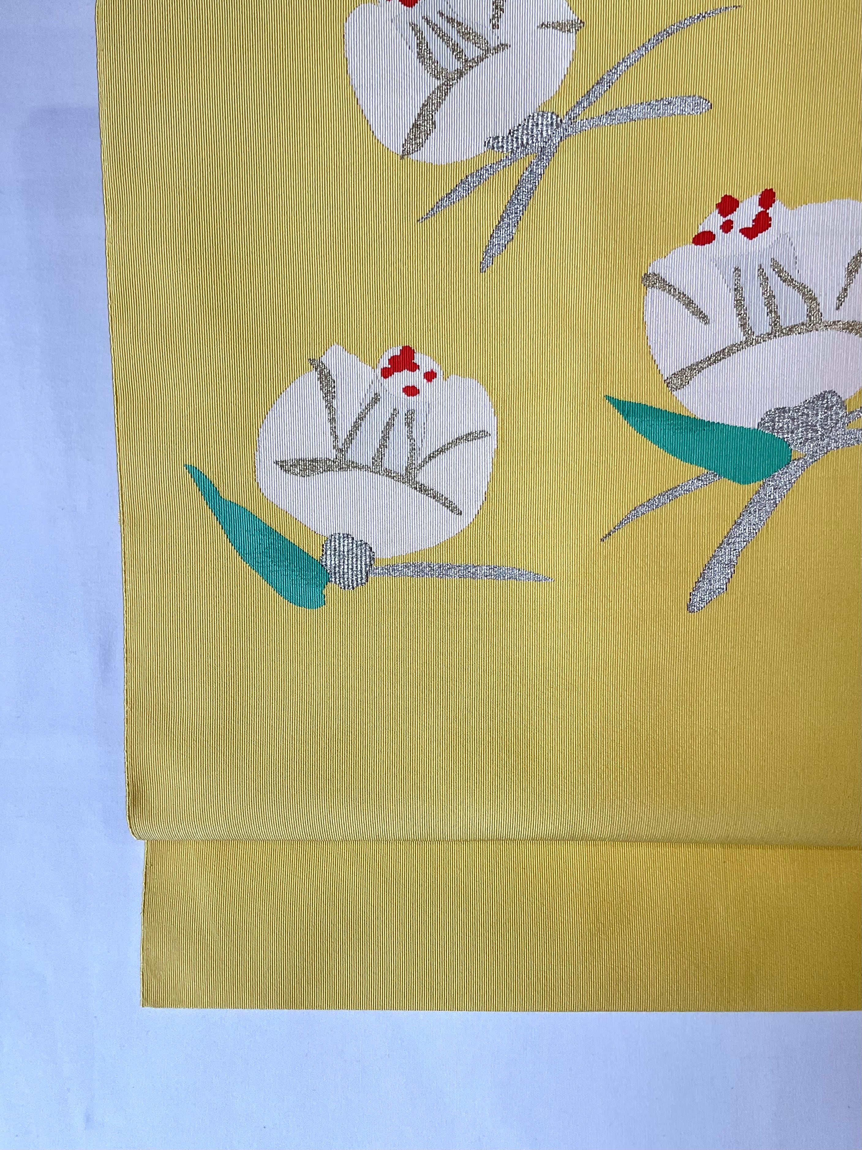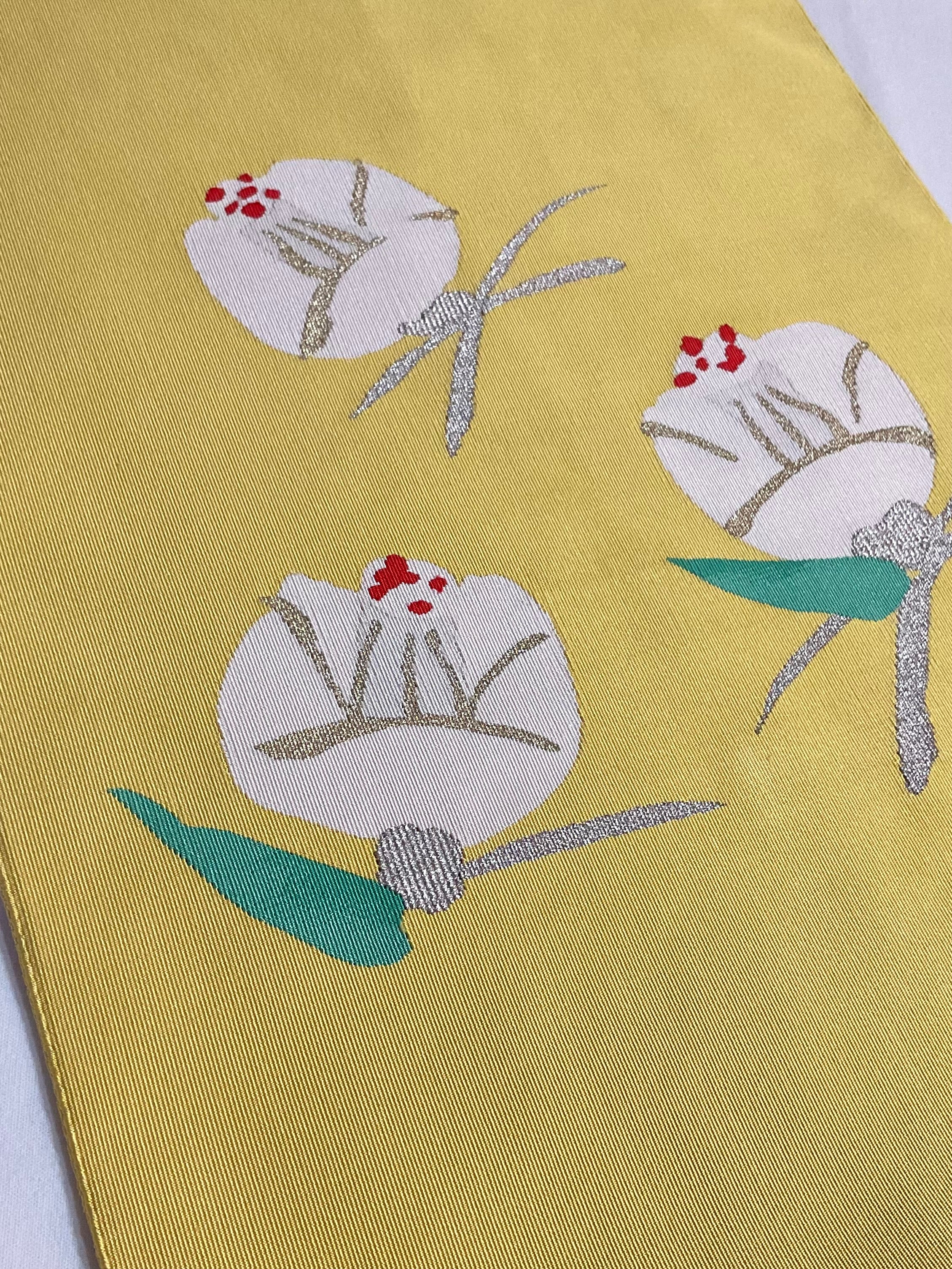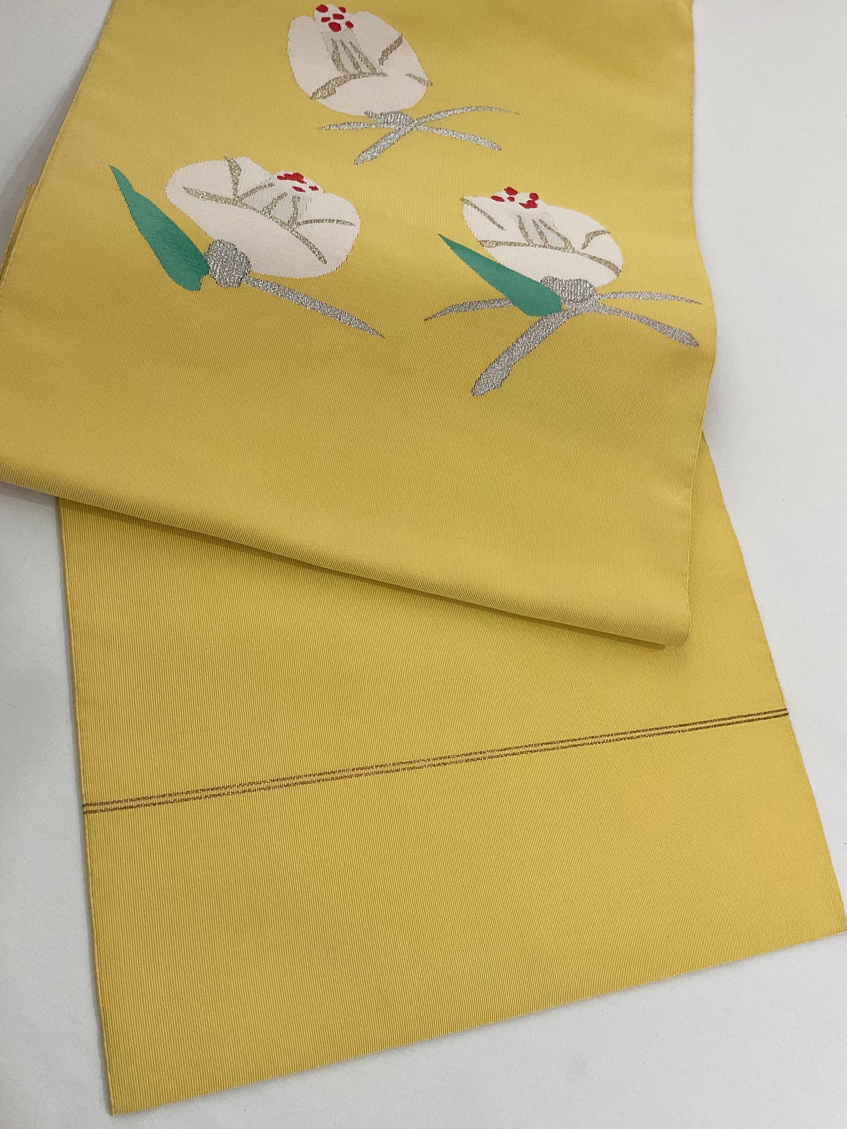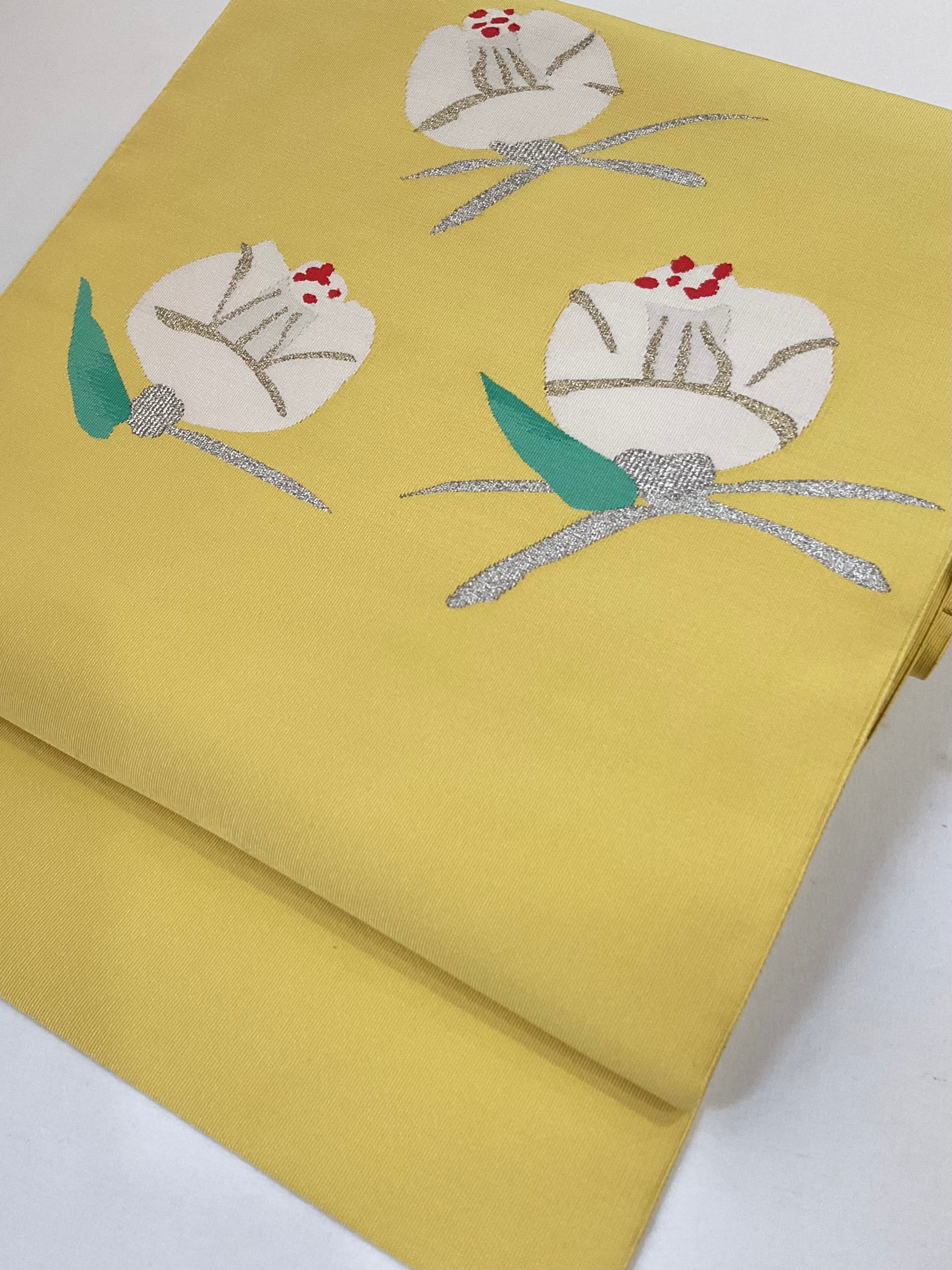 明るめの黄檗色地に椿の花の綴れ織八寸なごや帯です。デフォルメされた可憐な椿の花がイエローカラーに映えて印象的な着姿を演出します。着物ならではの季節の花を纏う楽しみを装いに取り入れてみてはいかがでしょうか。
