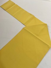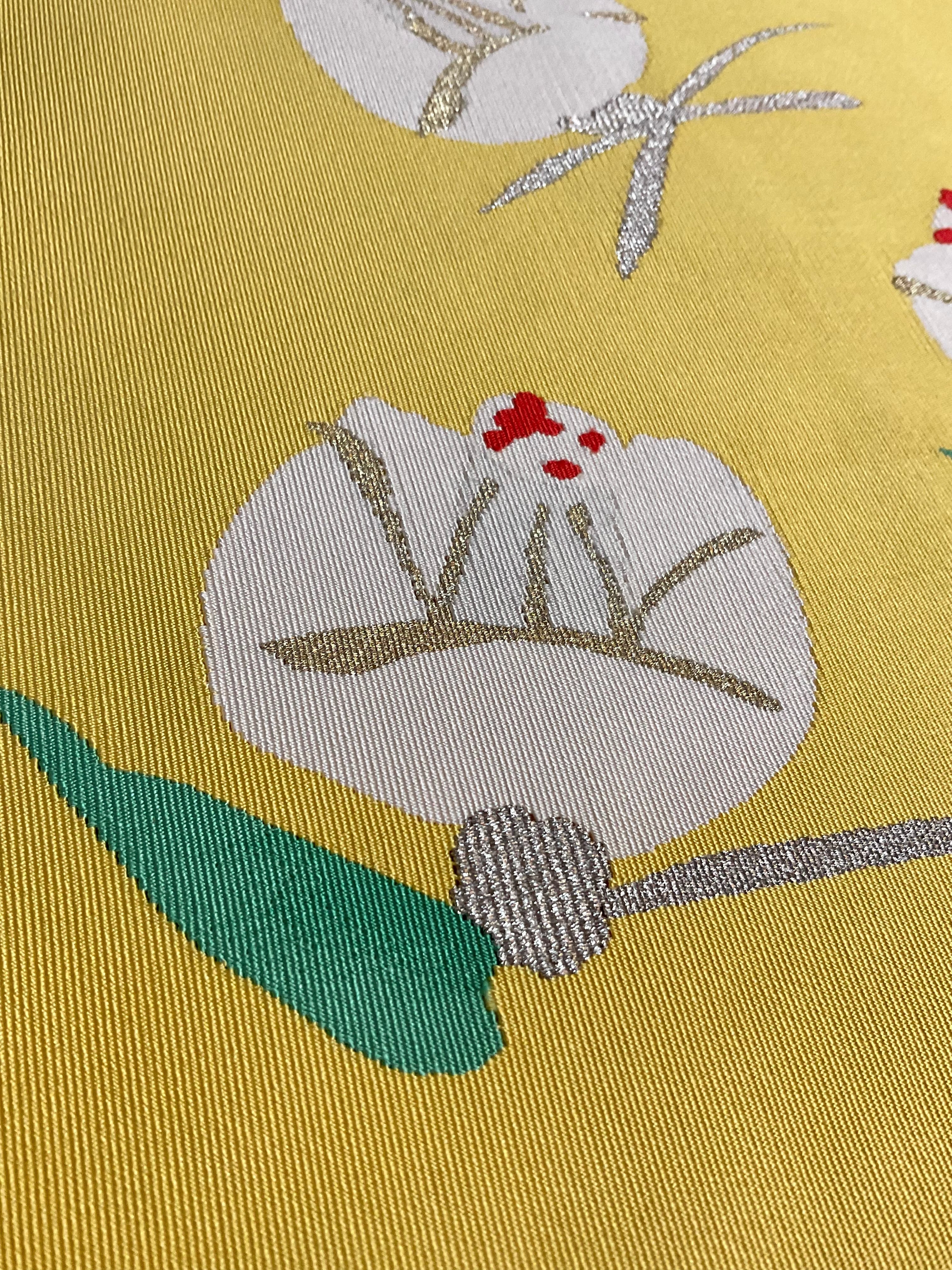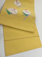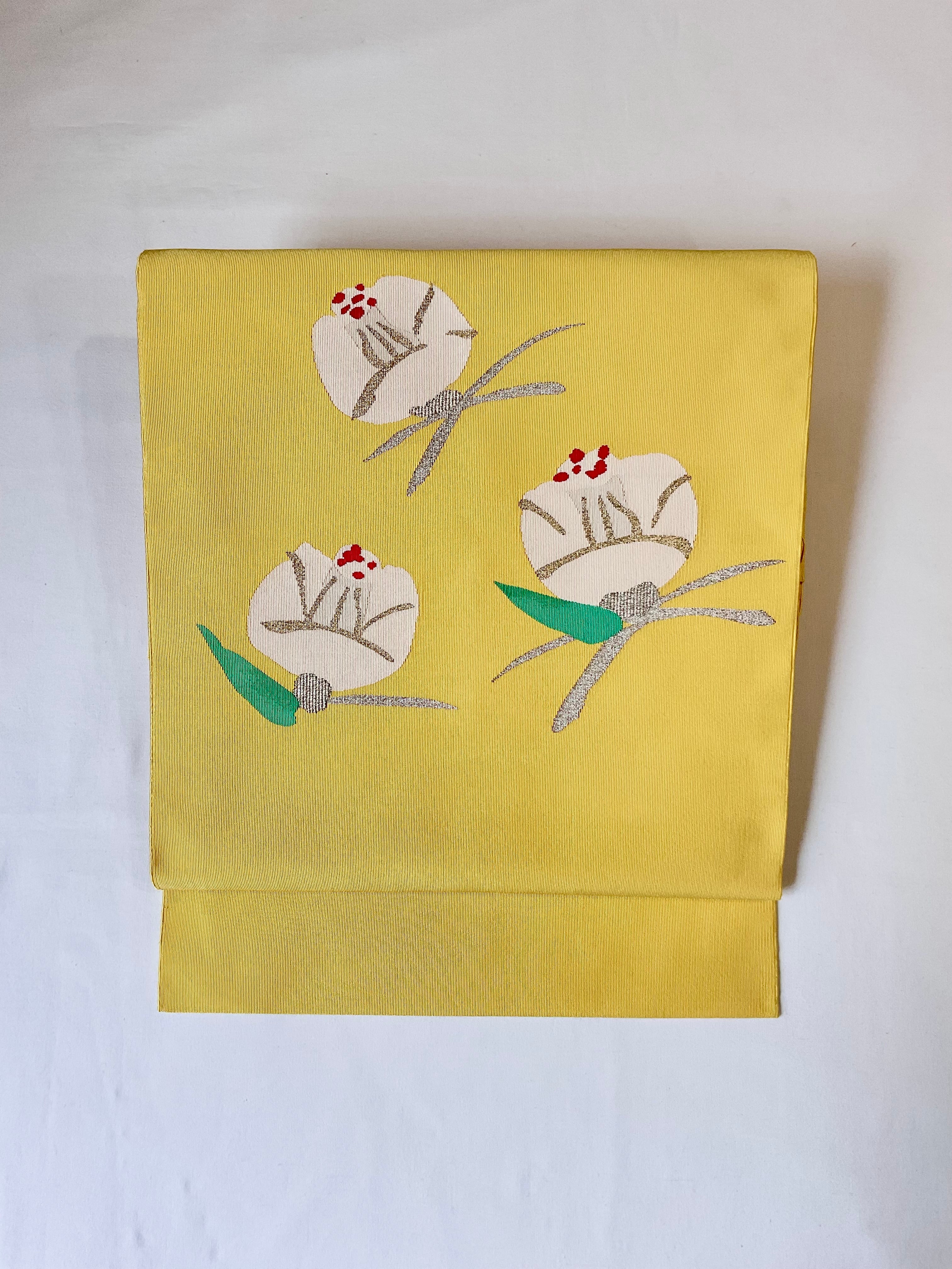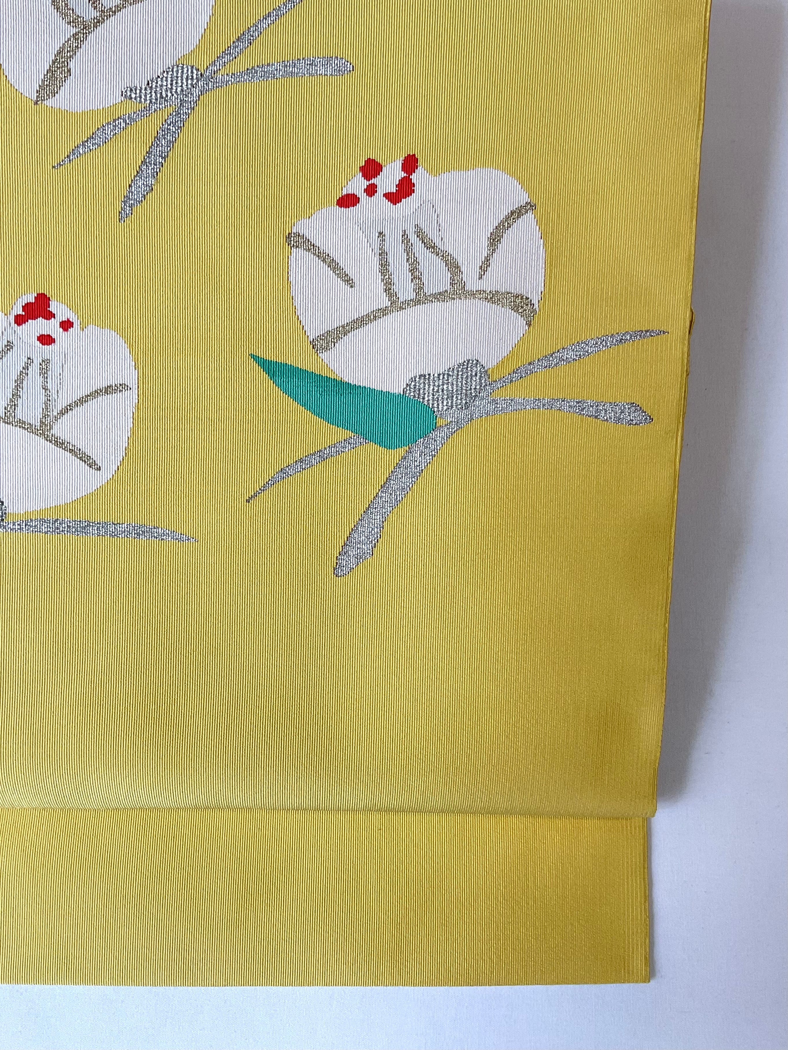 明るめの黄檗色地に椿の花の綴れ織八寸なごや帯です。デフォルメされた可憐な椿の花がイエローカラーに映えて印象的な着姿を演出します。着物ならではの季節の花を纏う楽しみを装いに取り入れてみてはいかがでしょうか。