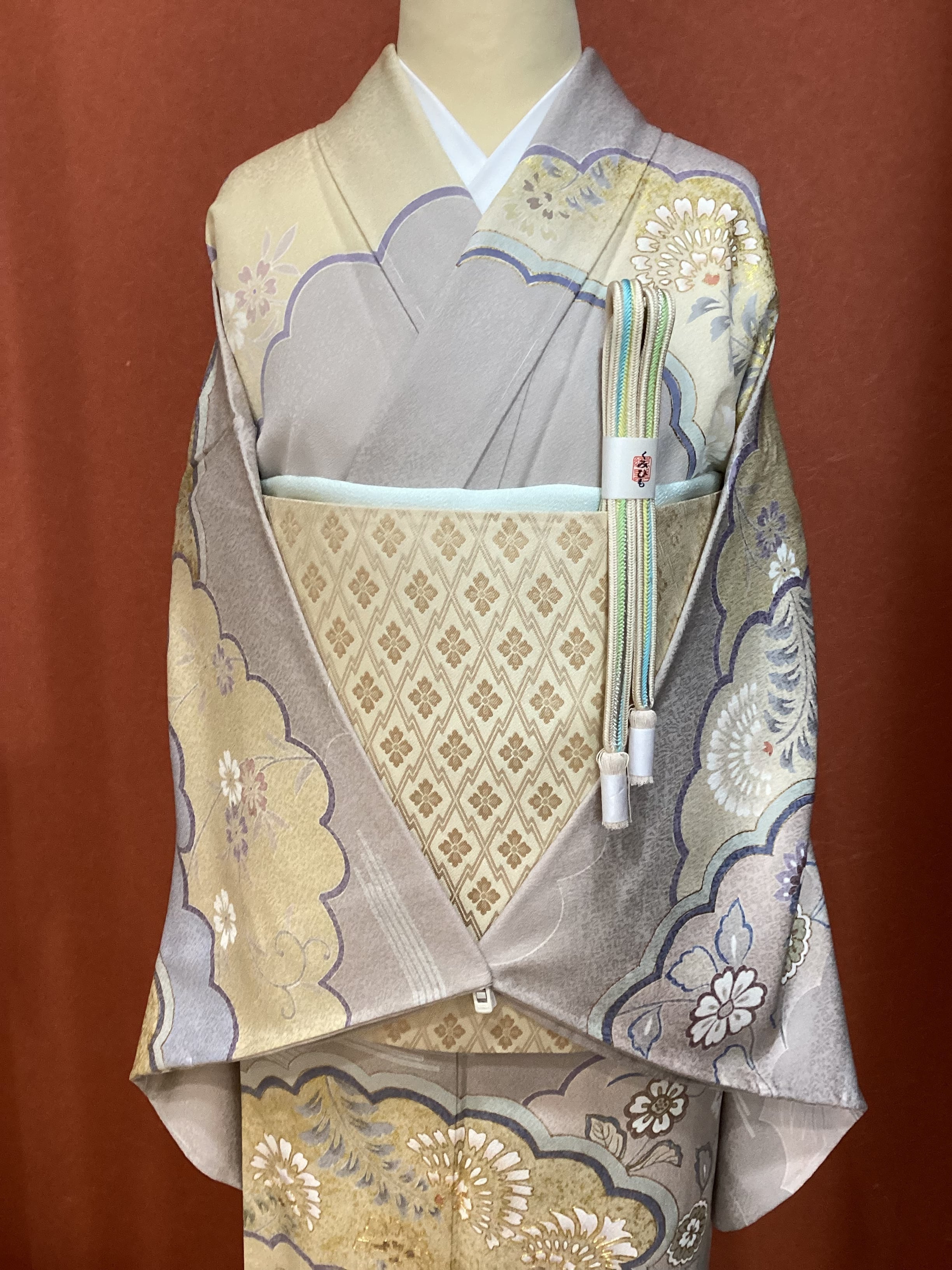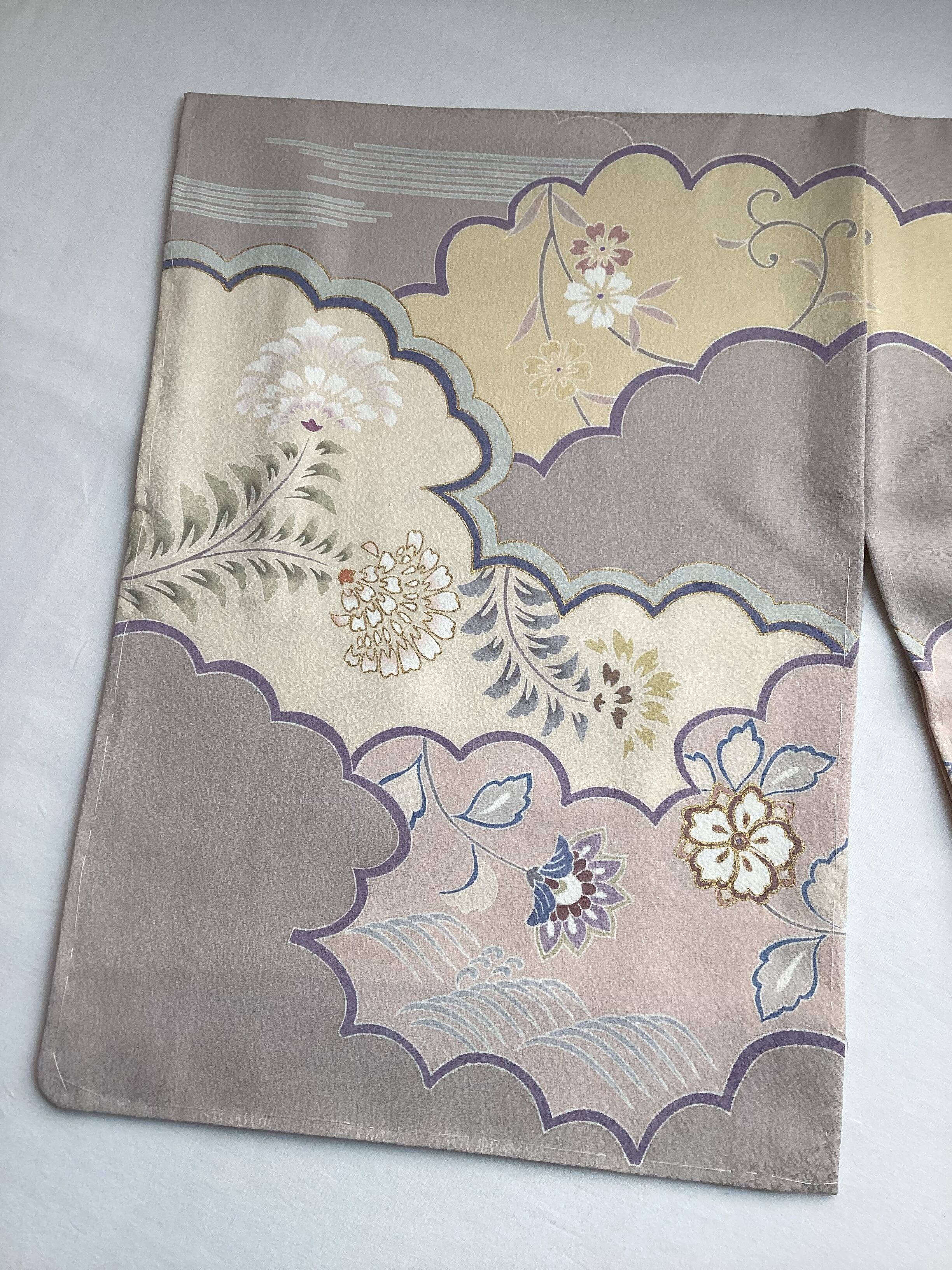 桜鼠色のニュアンスカラーをベース地に、きもの全体に雲取り文様がたっぷりと柄付けされた豪華な訪問着です。雲取りの中に、霞や波といった自然の空気感を感じるモチーフと、様々な形の架空の花々が描かれております。また、金彩や金駒刺繍が施されており華やかさもございます。裾の柄、そして背中から肩、袖への柄付けも絵羽に繋がって豪華な柄付けが華やかですが、お色目の優しさと柔らかさが調和しており派手にならず、上品な訪問着でございます。