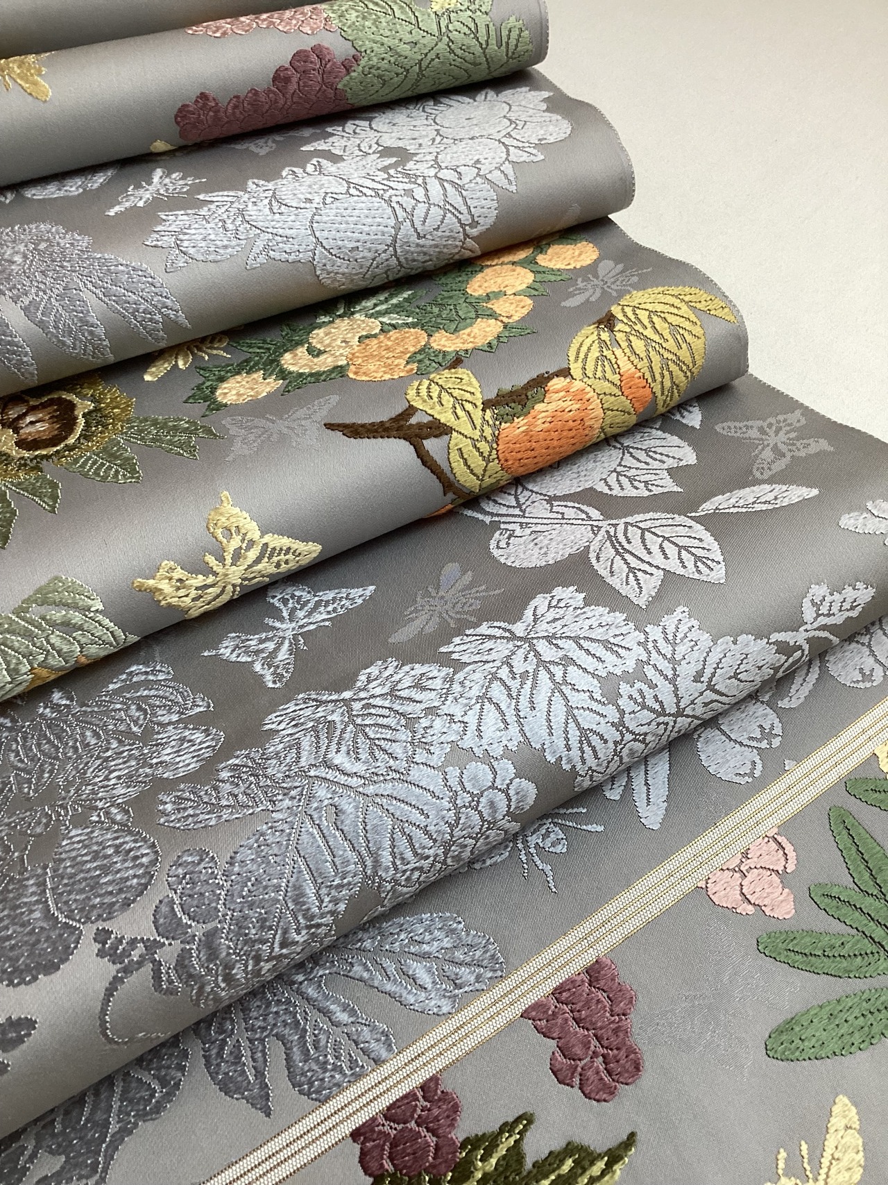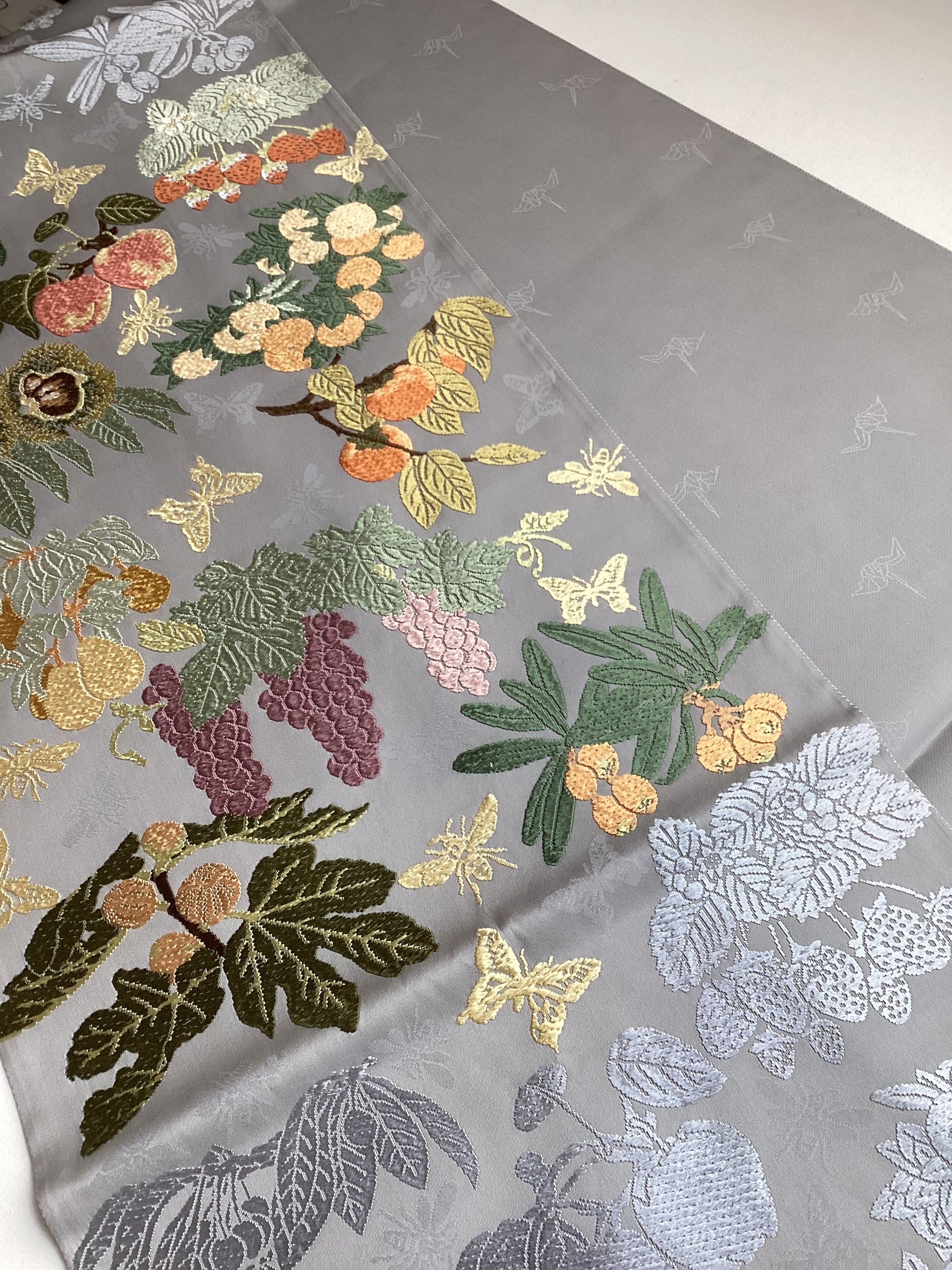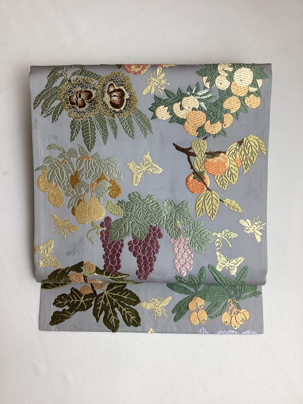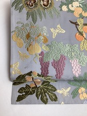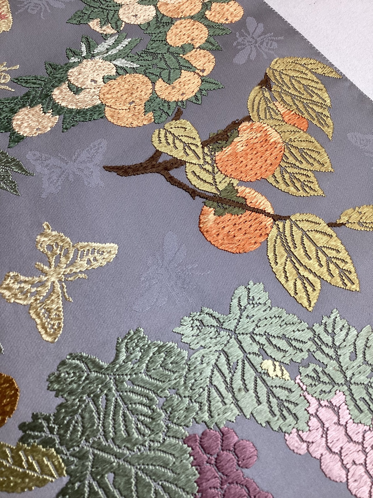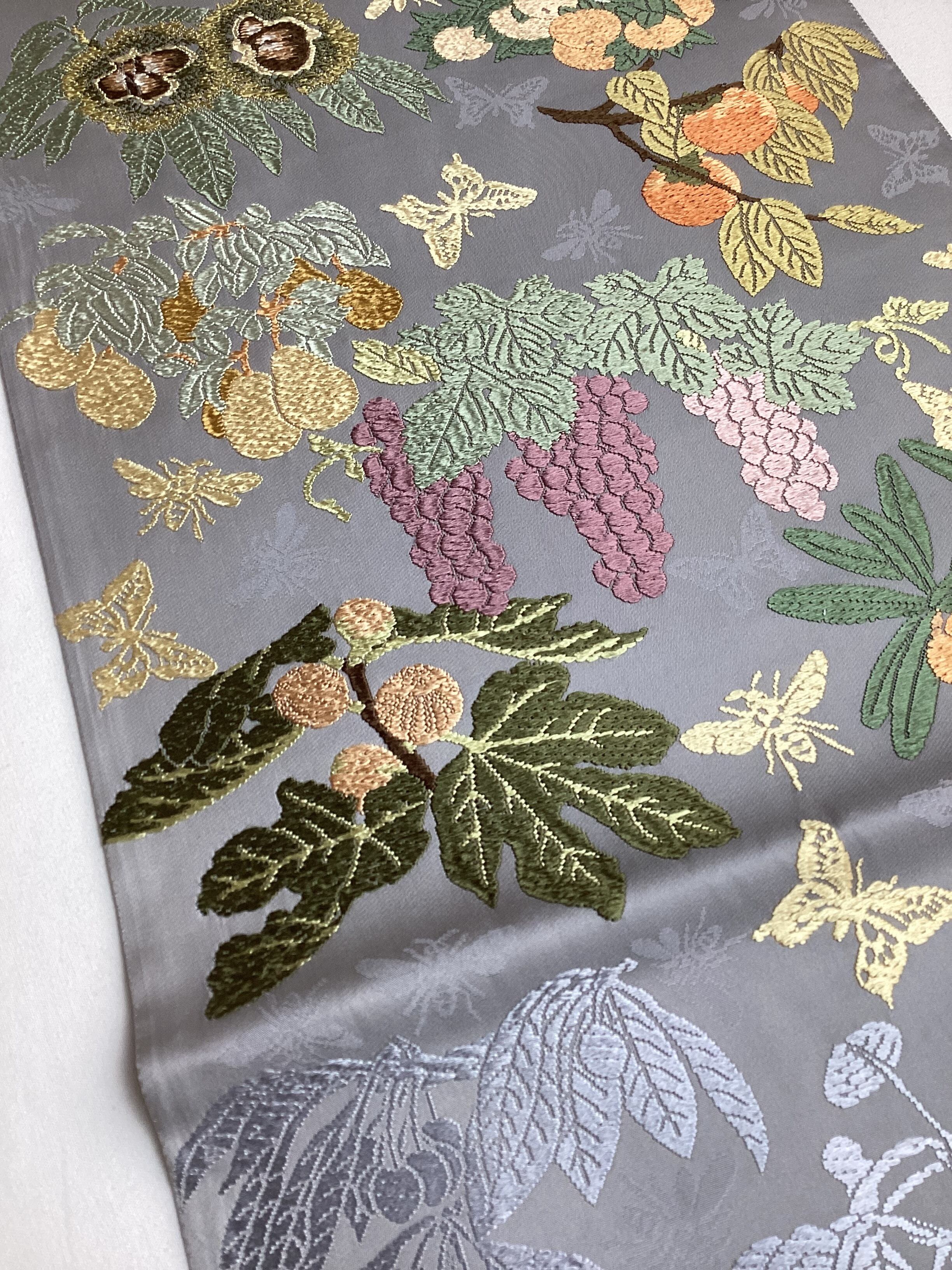 唐織で名高い西陣の名門【山口美術織物】のなんともお柄の可愛いらしい袋帯です。四季果実文と名付けられたこちらの袋帯は、落ち着いたグレー地に日本の四季折々のたくさんの果物が美しい彩色で織り上げられております。唐織のふくふくとした立体感、色糸の艶々とした奥行き感、なんと言っても果実たちの可愛らしい表情が眺めているだけでも嬉しくなってしまうような帯です。よく見ますと、そこここに小さな蜂や蝶々の姿が見え隠れしており、作り手の遊び心が感じられます。帯を主役にしたコーディネートでお出掛け先のお席でも見る方々を楽しませ、会話が弾みそうな逸品です。柔らかくしなやかな風合いです。
