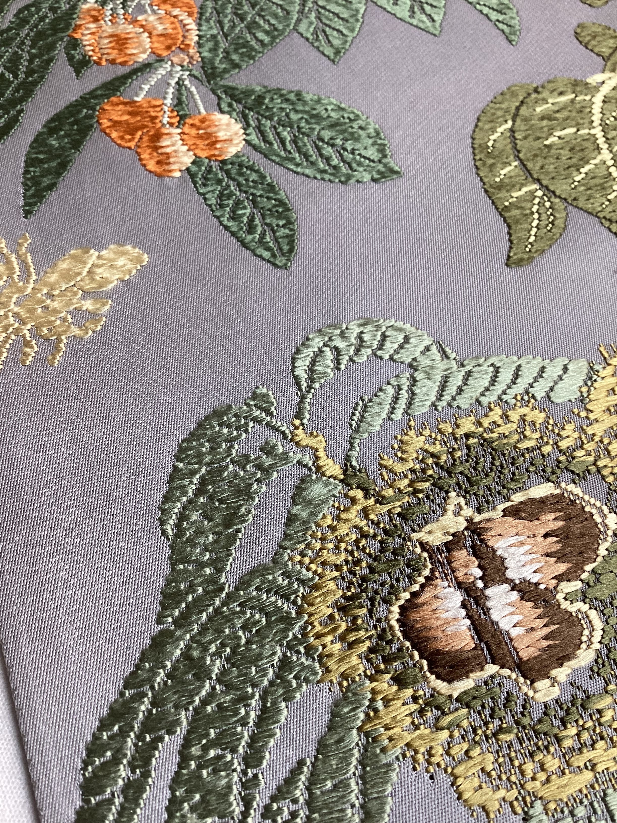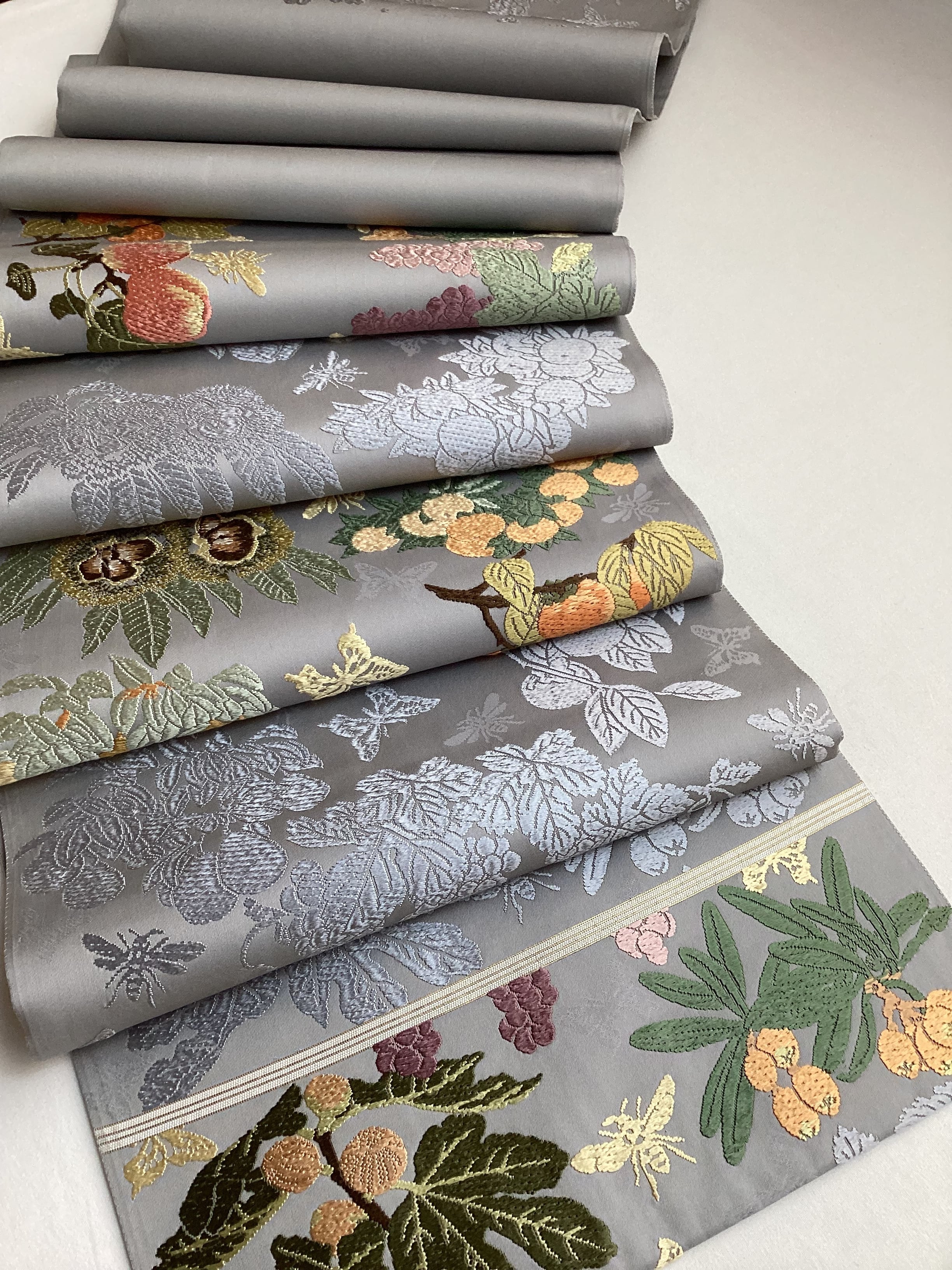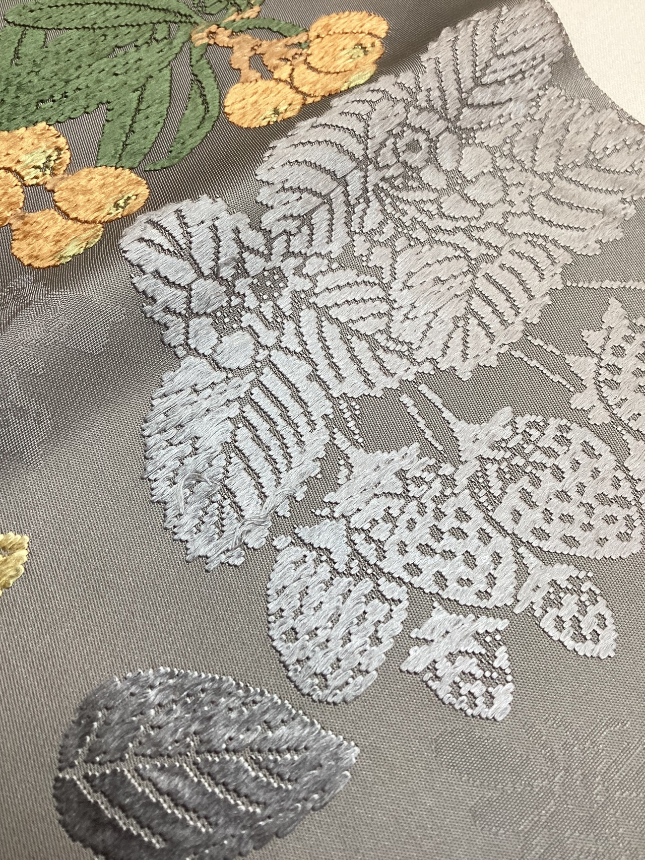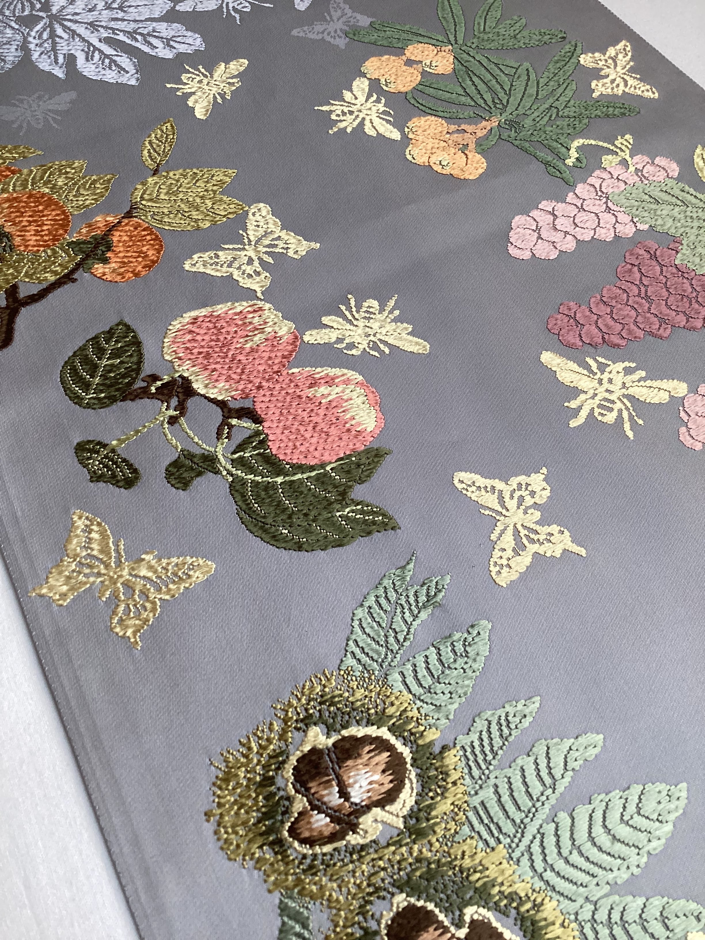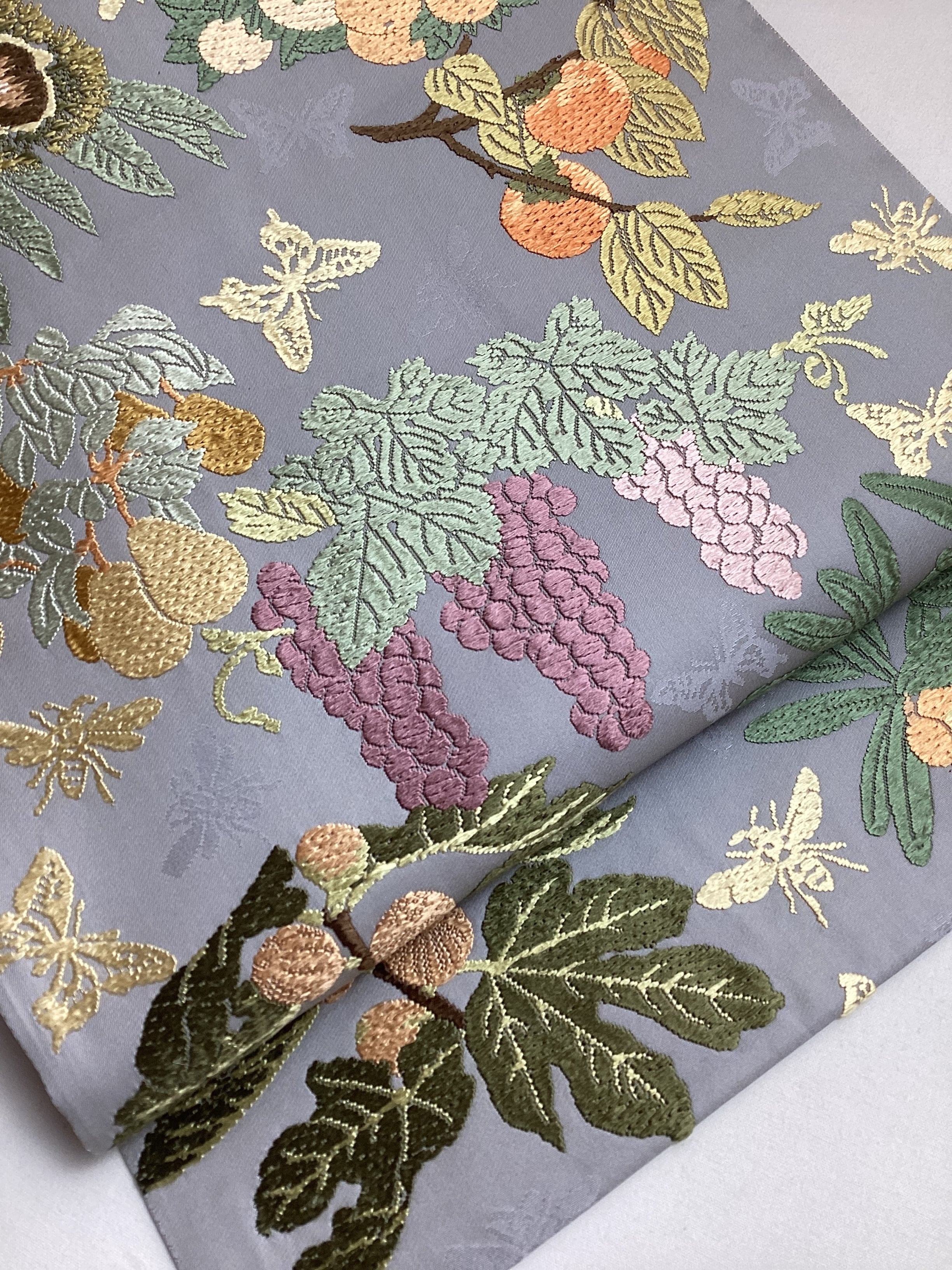唐織で名高い西陣の名門【山口美術織物】のなんともお柄の可愛いらしい袋帯です。四季果実文と名付けられたこちらの袋帯は、落ち着いたグレー地に日本の四季折々のたくさんの果物が美しい彩色で織り上げられております。唐織のふくふくとした立体感、色糸の艶々とした奥行き感、なんと言っても果実たちの可愛らしい表情が眺めているだけでも嬉しくなってしまうような帯です。よく見ますと、そこここに小さな蜂や蝶々の姿が見え隠れしており、作り手の遊び心が感じられます。帯を主役にしたコーディネートでお出掛け先のお席でも見る方々を楽しませ、会話が弾みそうな逸品です。柔らかくしなやかな風合いです。
