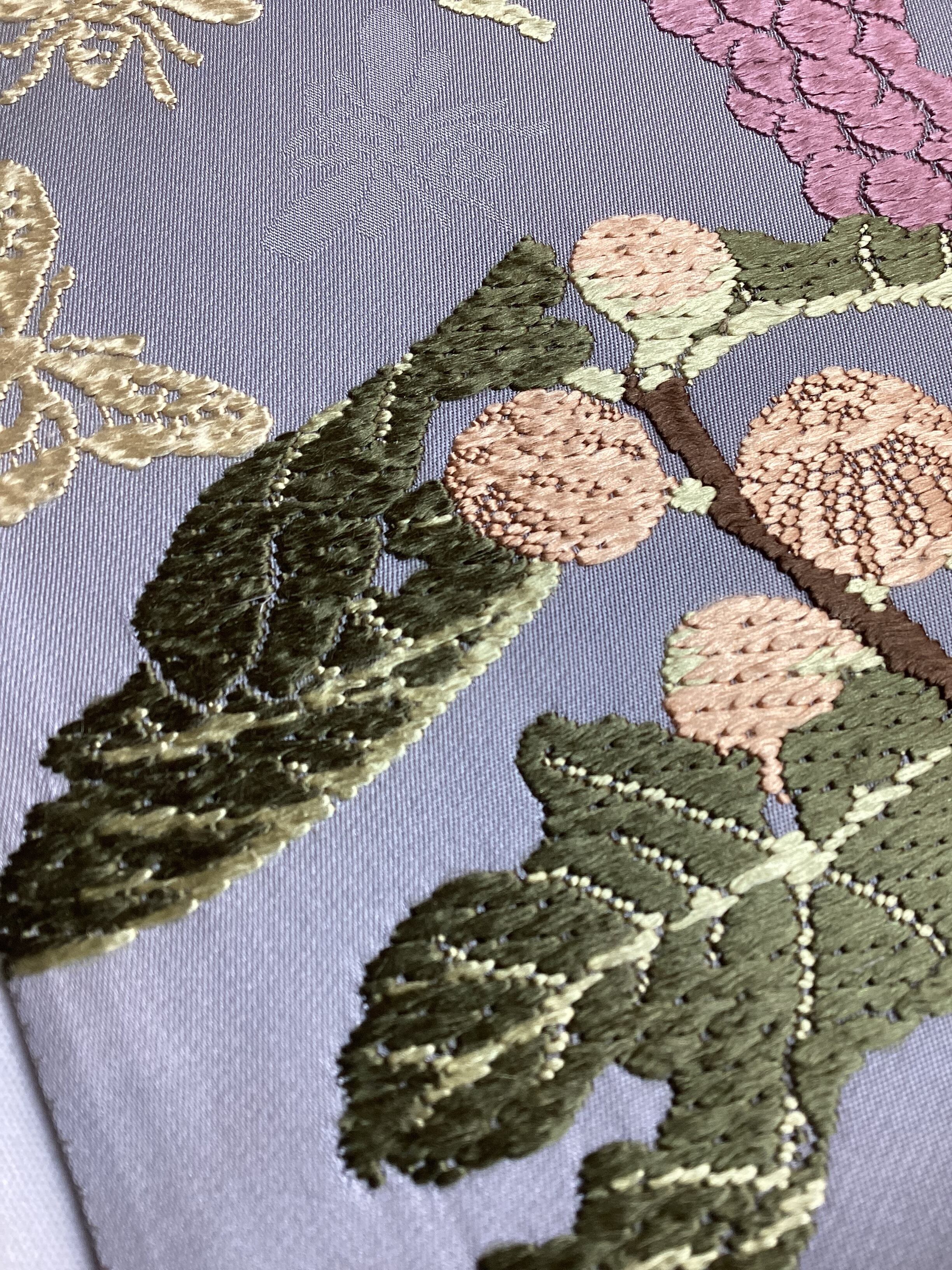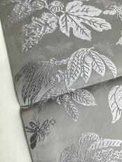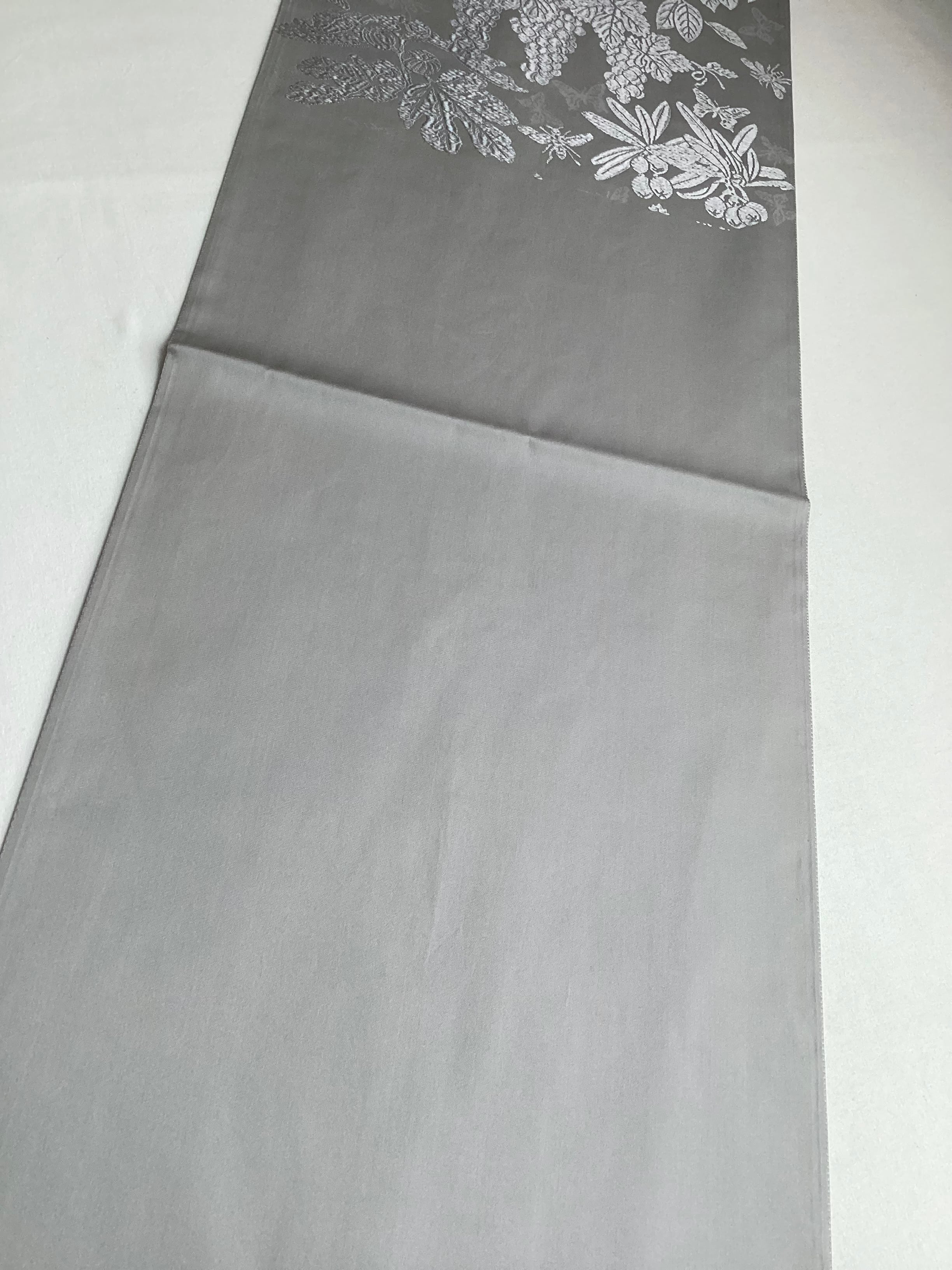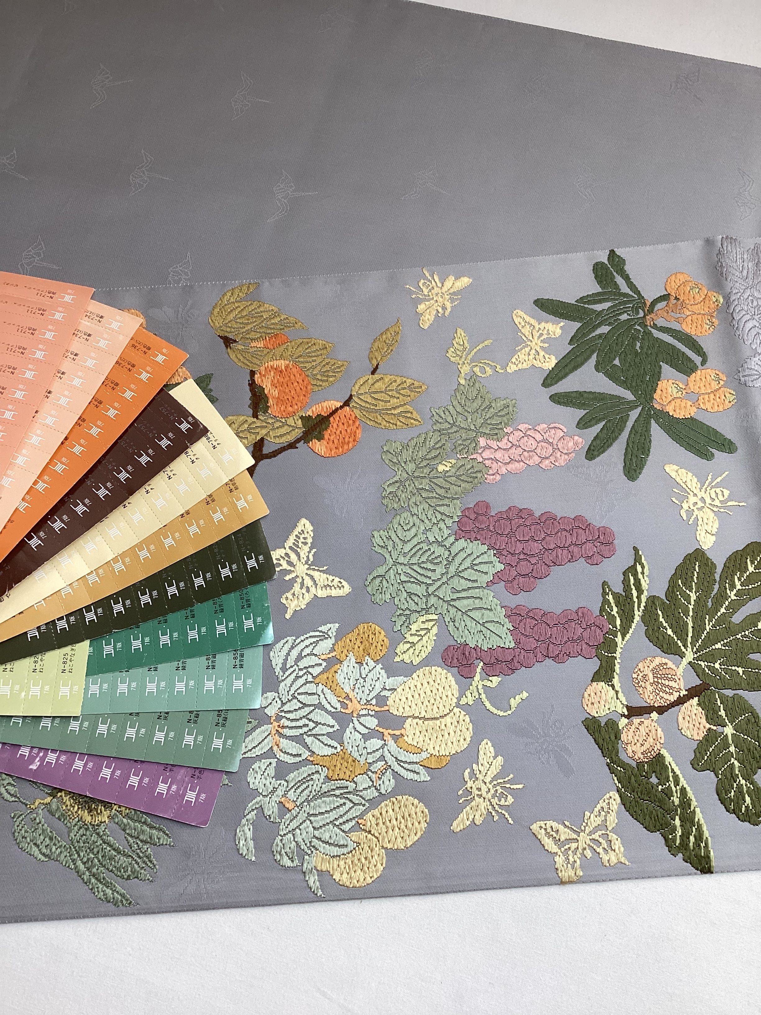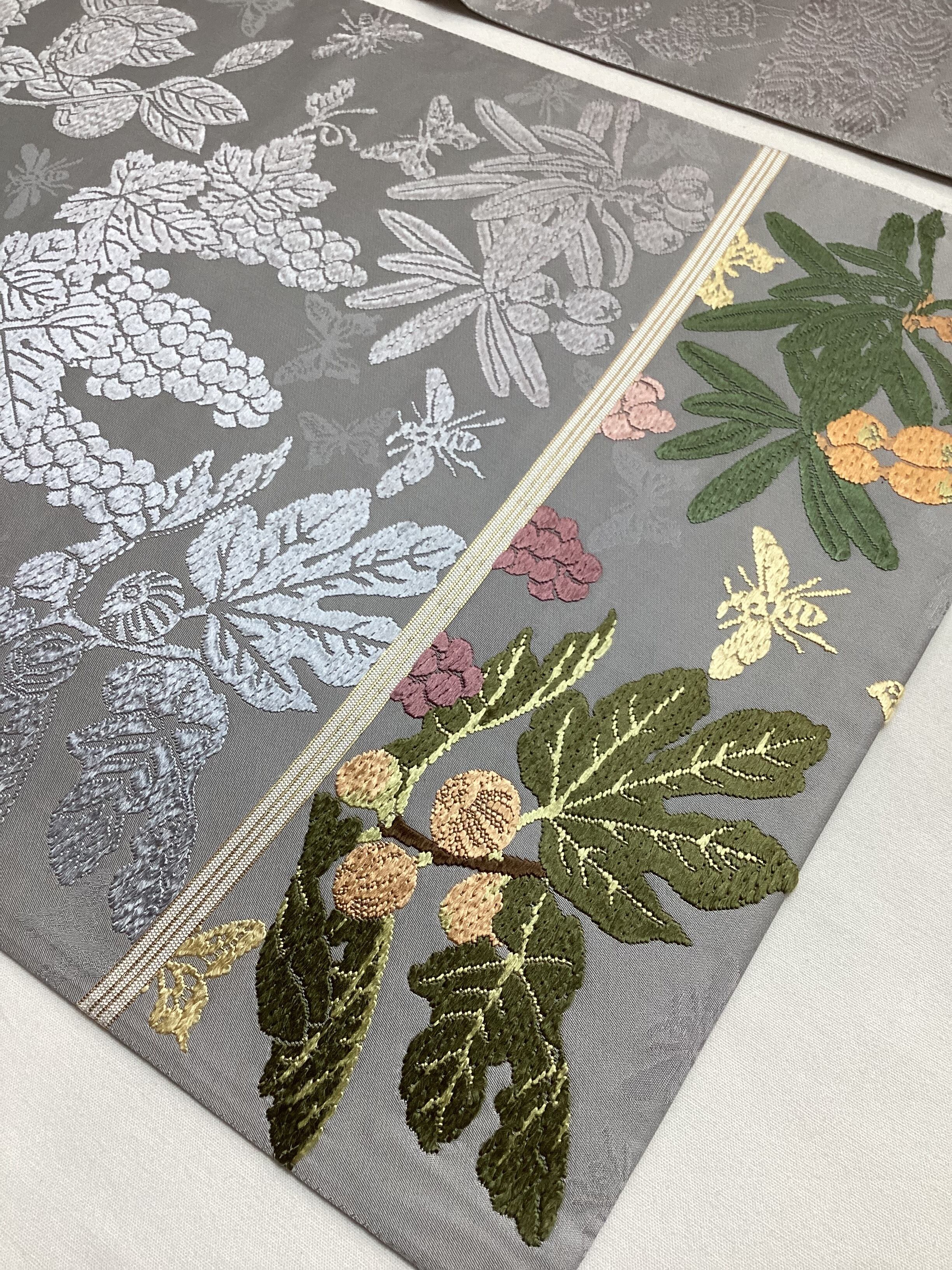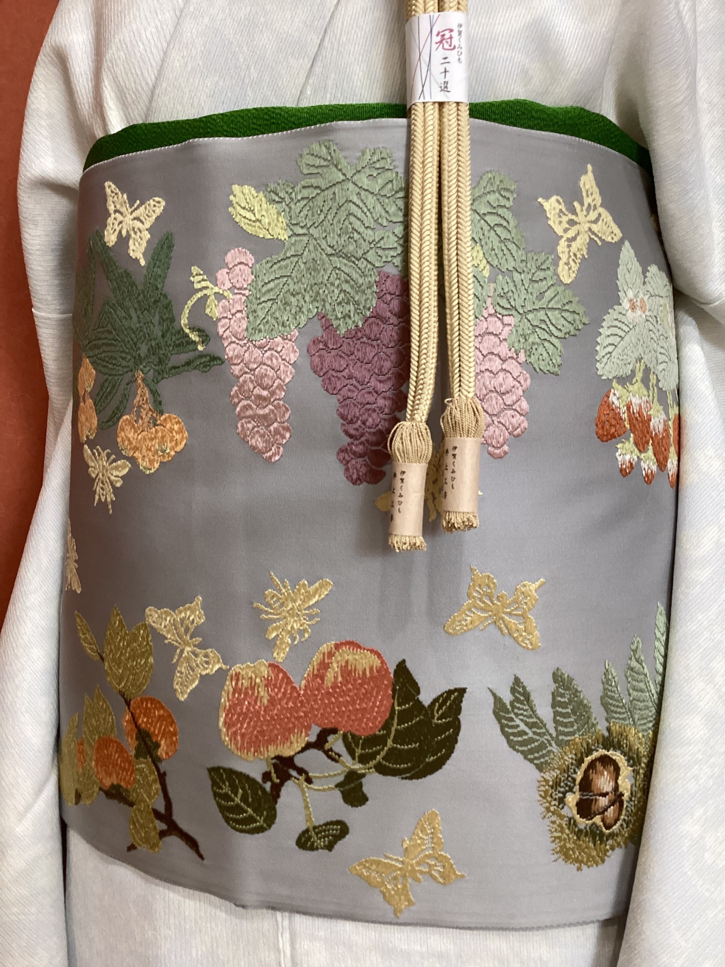 唐織で名高い西陣の名門【山口美術織物】のなんともお柄の可愛いらしい袋帯です。四季果実文と名付けられたこちらの袋帯は、落ち着いたグレー地に日本の四季折々のたくさんの果物が美しい彩色で織り上げられております。唐織のふくふくとした立体感、色糸の艶々とした奥行き感、なんと言っても果実たちの可愛らしい表情が眺めているだけでも嬉しくなってしまうような帯です。よく見ますと、そこここに小さな蜂や蝶々の姿が見え隠れしており、作り手の遊び心が感じられます。帯を主役にしたコーディネートでお出掛け先のお席でも見る方々を楽しませ、会話が弾みそうな逸品です。柔らかくしなやかな風合いです。