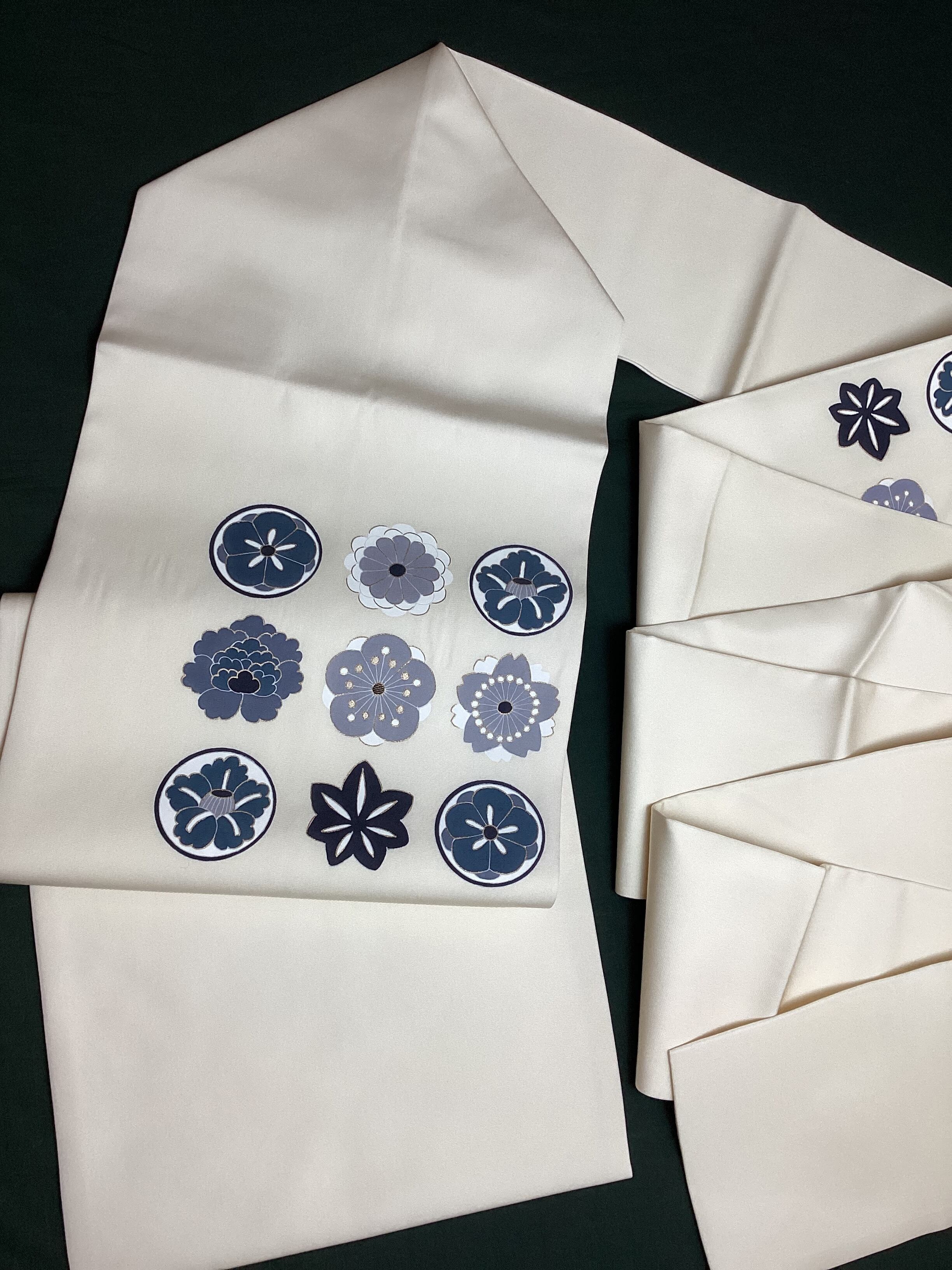 乳白色のしなやかな塩瀬地の染め帯です。オタイコと前柄には桜や梅や楓や、家紋のような花丸文様が並んでいます。真ん中を外してアシンメトリーに配置されたり、前柄の3つの花のバランスなど、敢えて外した意匠に洒落味を感じます。ブルーグレーからグレーのグラデーションでまとめた静かな配色がベースの乳白色に映えます。これから春に向かってカジュアルな装いにいかがでしょうか。