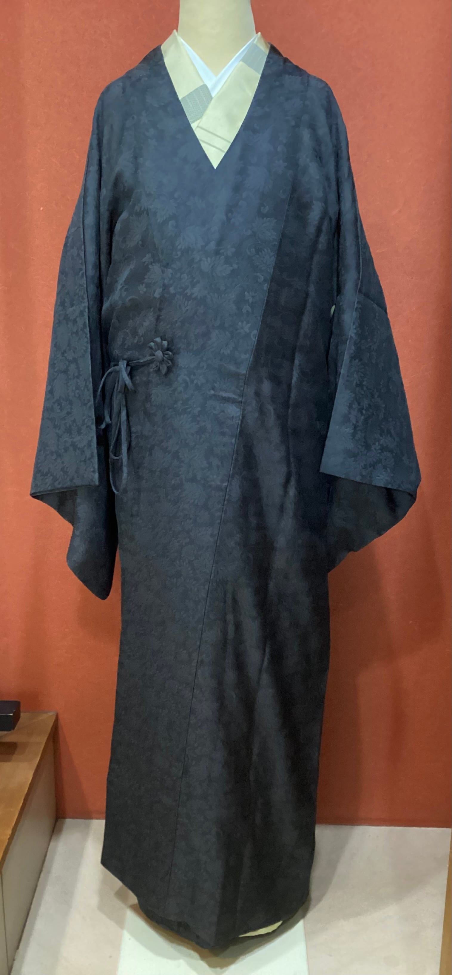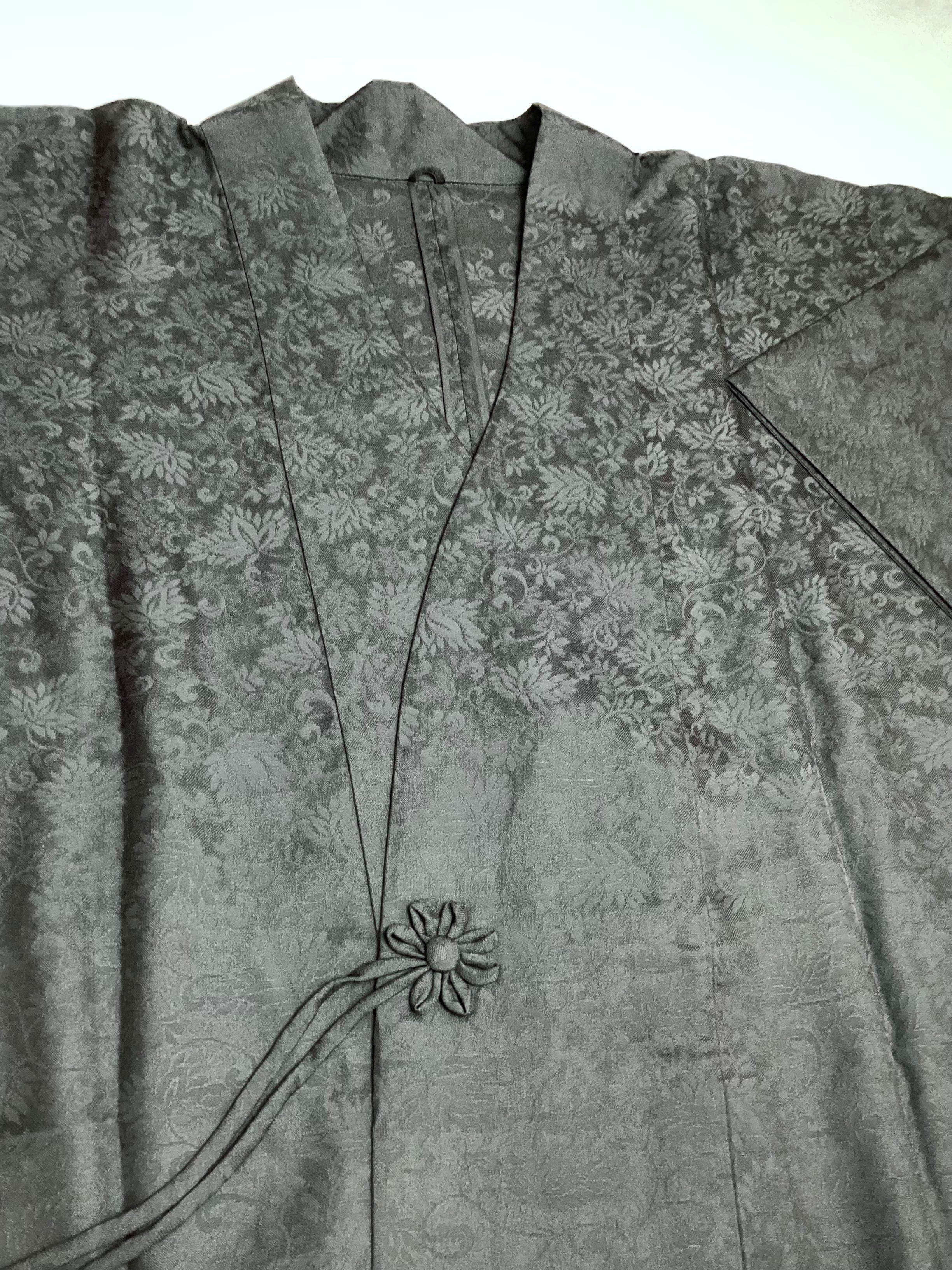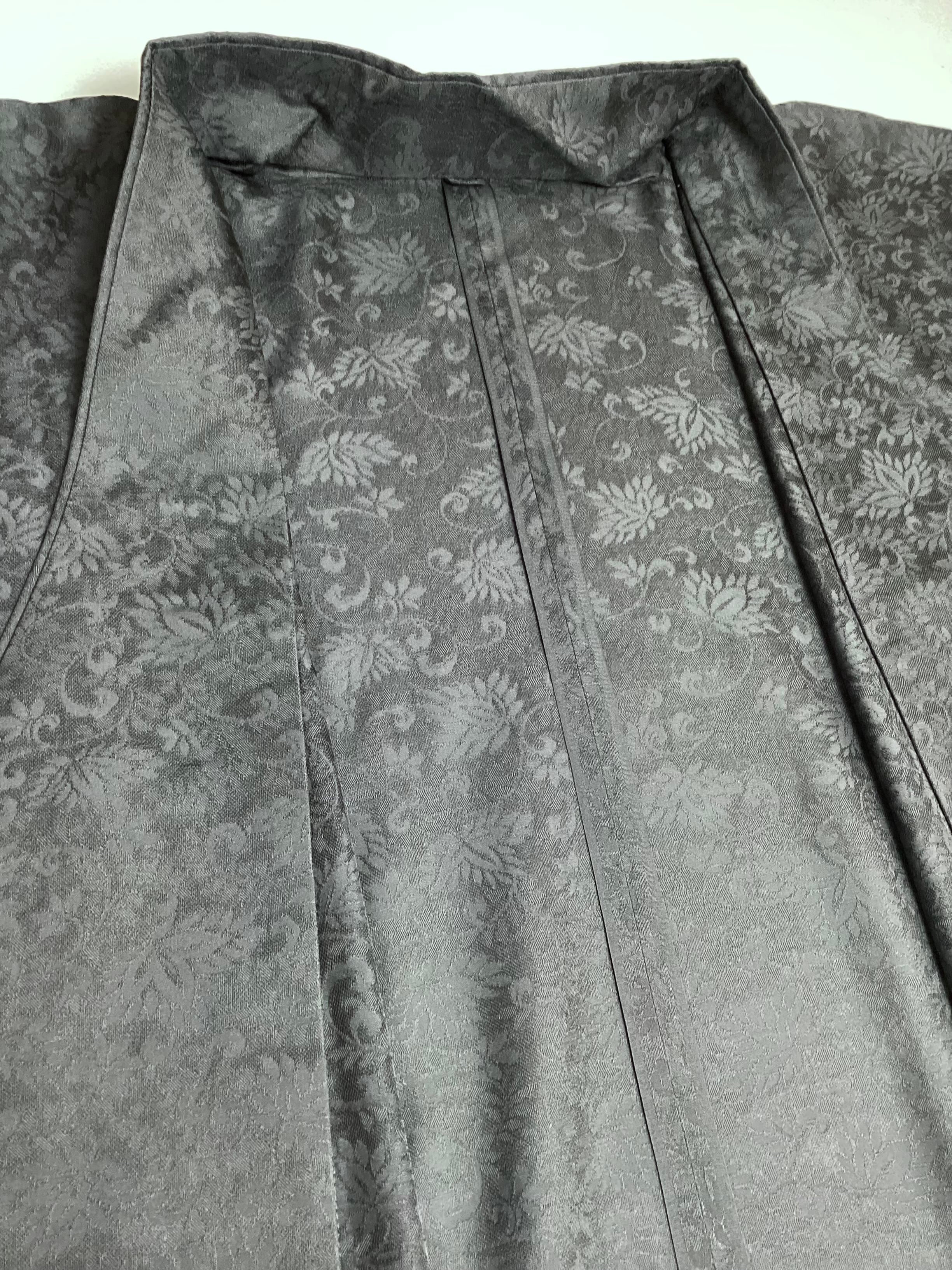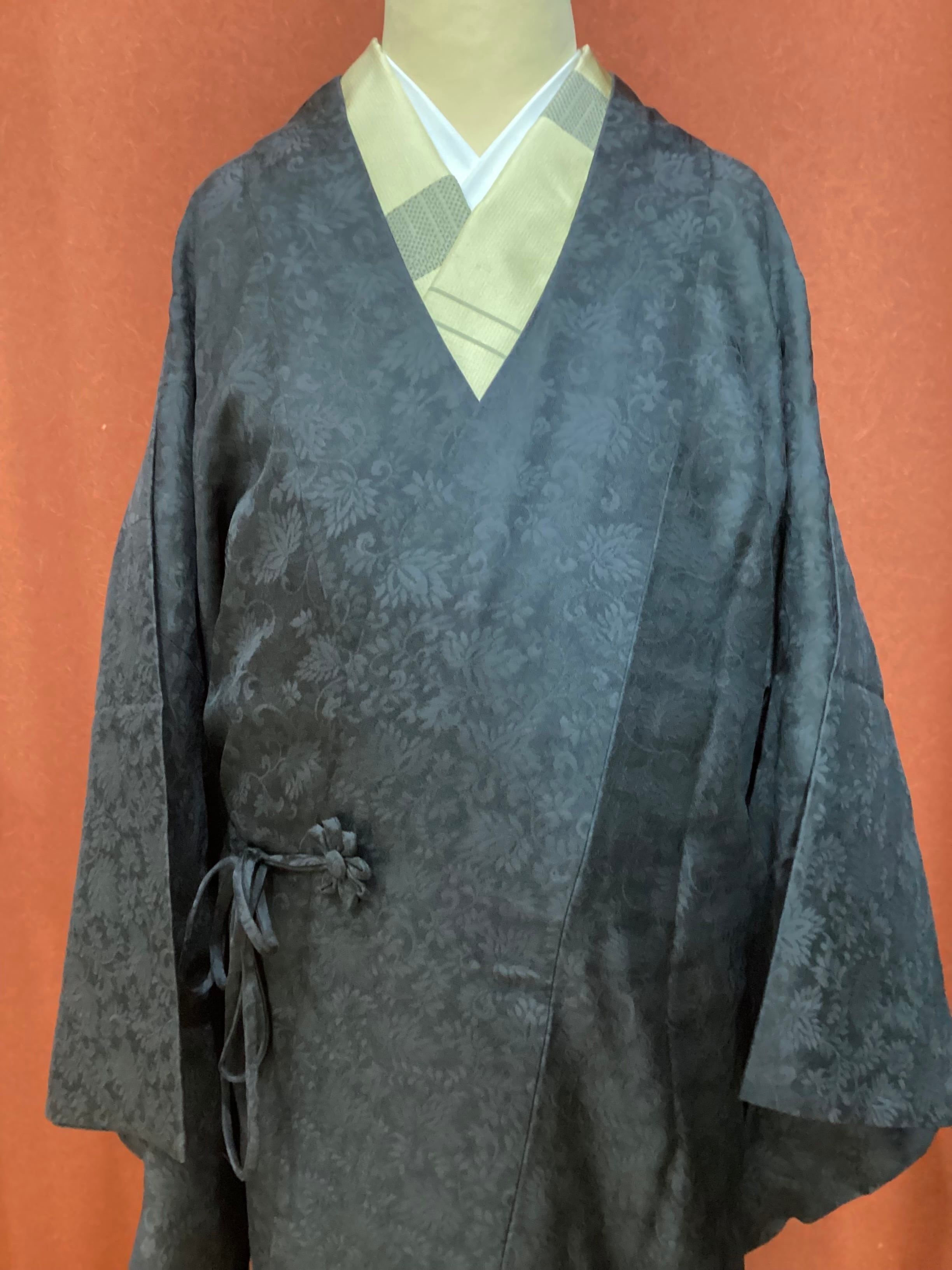 蔓草の植物文様の地紋が織り込まれた濃いチャコールグレー色の道中着コートです。紋紗なので、ほどよい透け感があり、3シーズンの軽い上ものとしてオススメです。春先でも気温の高い日が多い昨今は、薄物の羽織やコートの出番が早く、また着用期間も長くなっております。お出掛けの際の温度調整やチリよけとしていかがでしょうか。下前に付いている長い紐をぐるりと後ろ側に一周回して結ぶタイプなので、美しい裾すぼまりのフォルムが叶います。