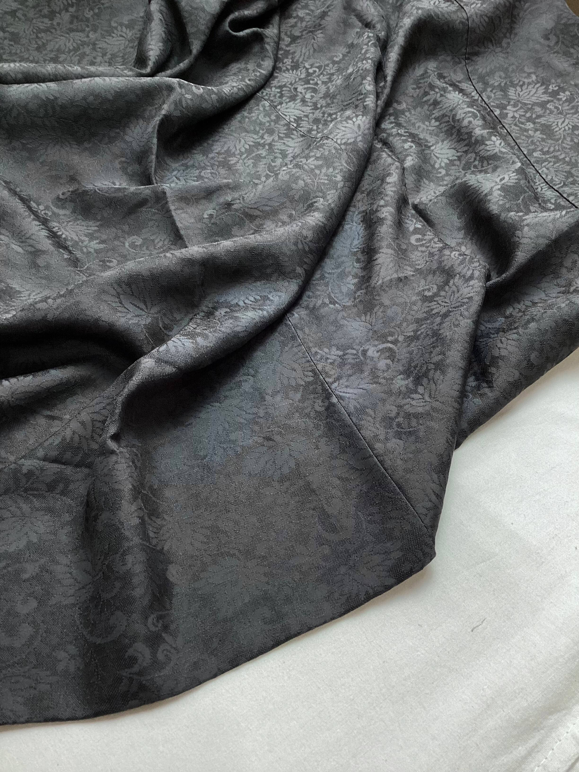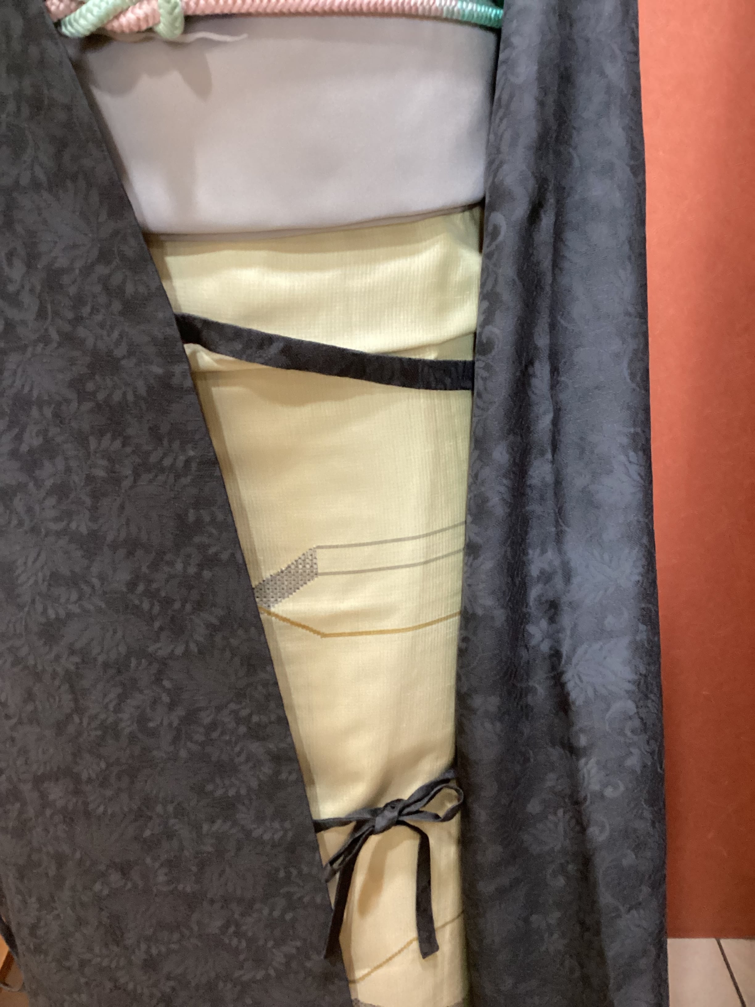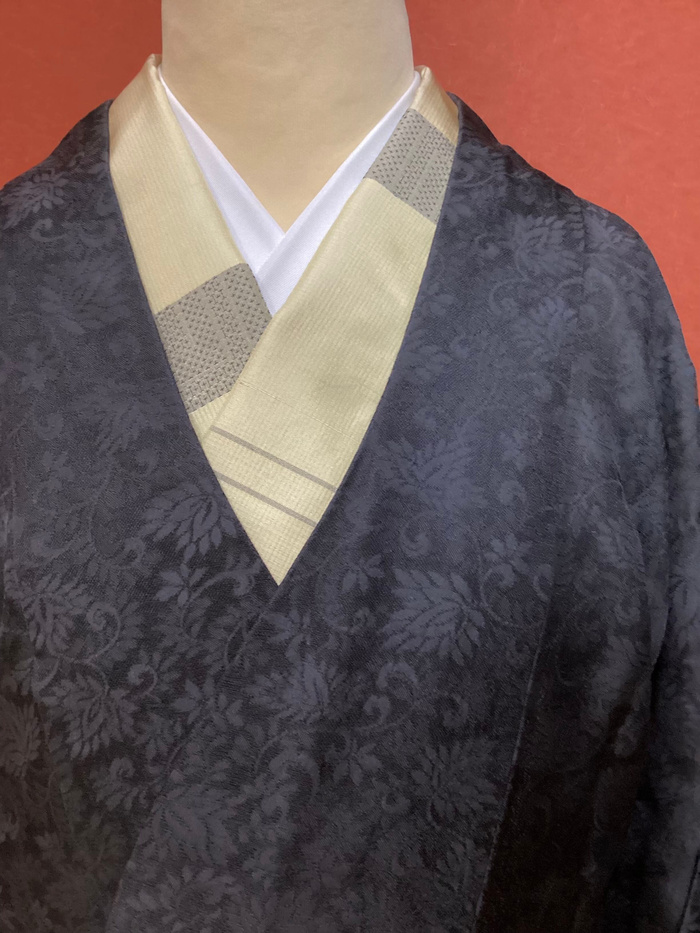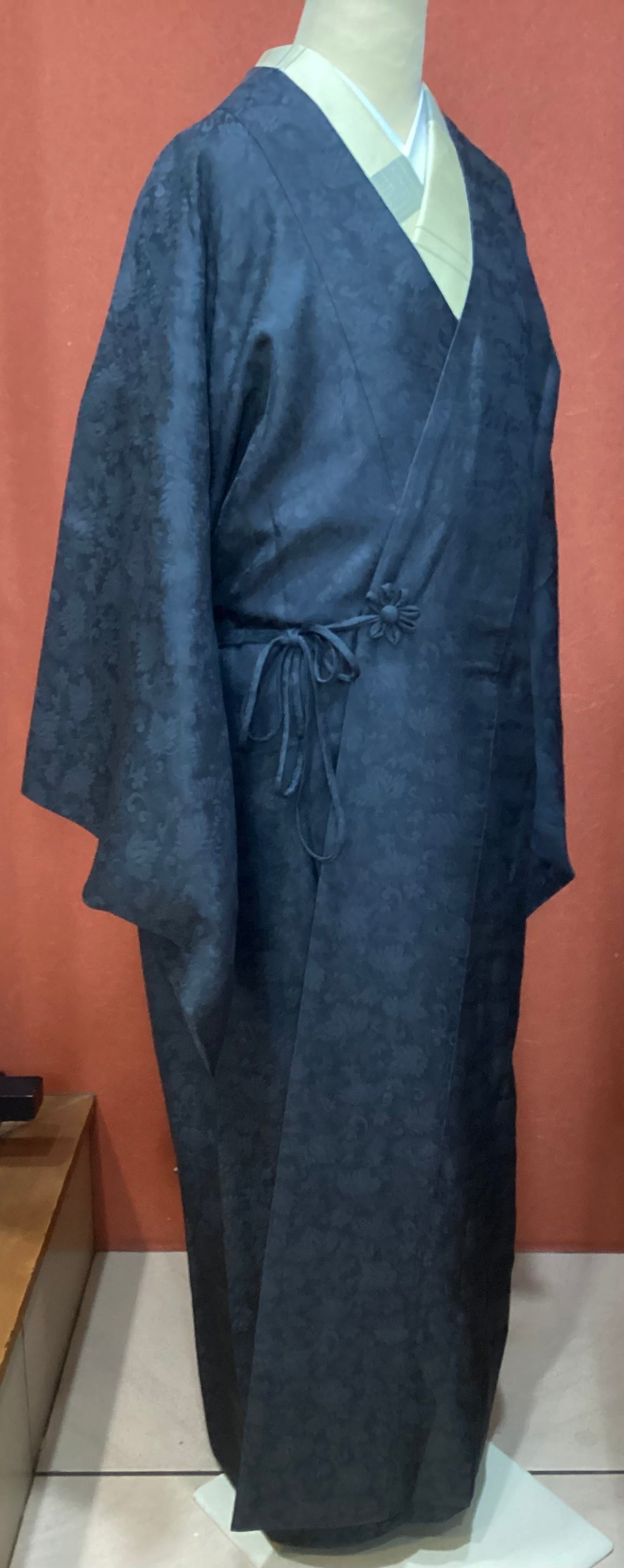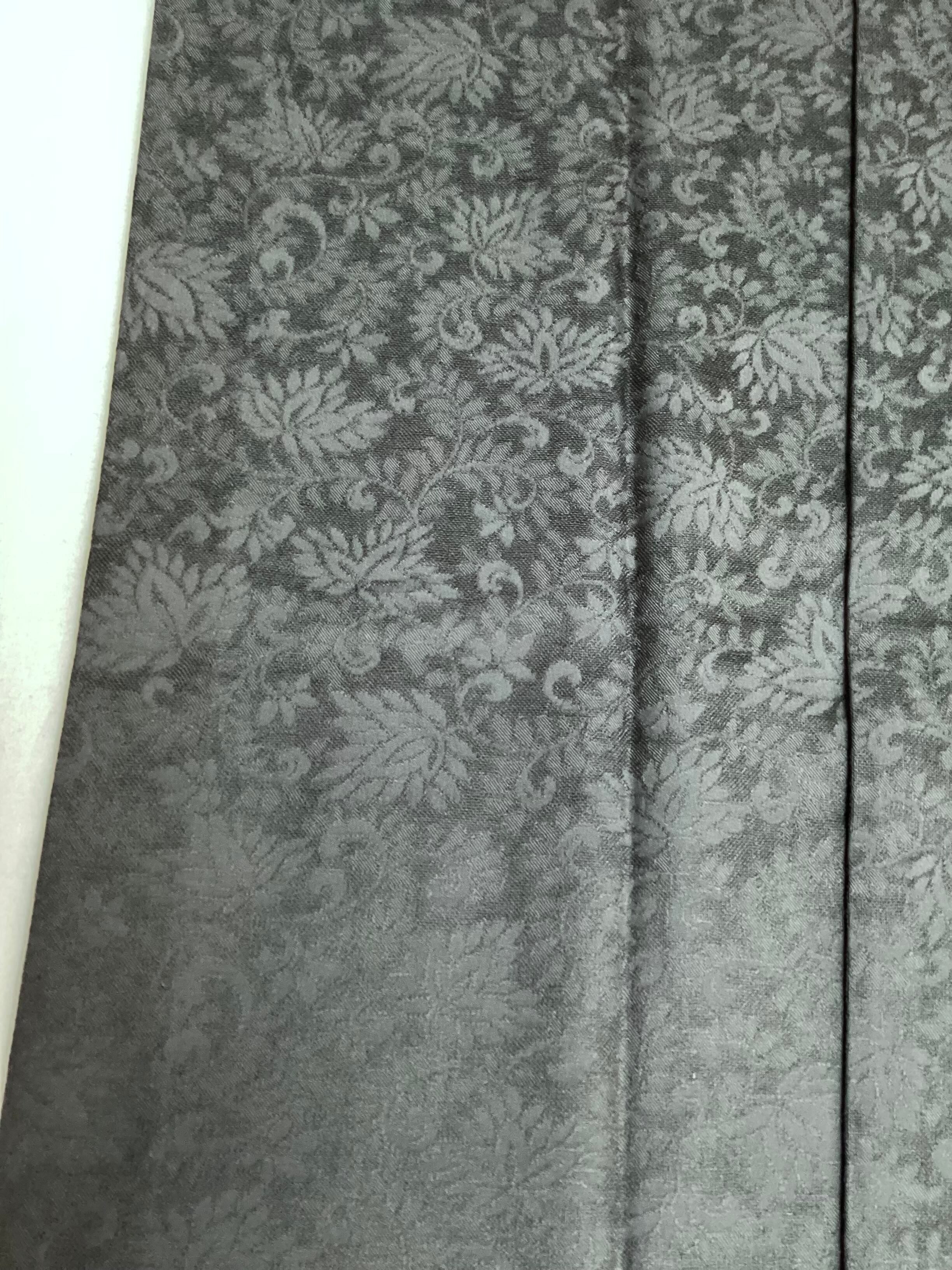 蔓草の植物文様の地紋が織り込まれた濃いチャコールグレー色の道中着コートです。紋紗なので、ほどよい透け感があり、3シーズンの軽い上ものとしてオススメです。春先でも気温の高い日が多い昨今は、薄物の羽織やコートの出番が早く、また着用期間も長くなっております。お出掛けの際の温度調整やチリよけとしていかがでしょうか。下前に付いている長い紐をぐるりと後ろ側に一周回して結ぶタイプなので、美しい裾すぼまりのフォルムが叶います。