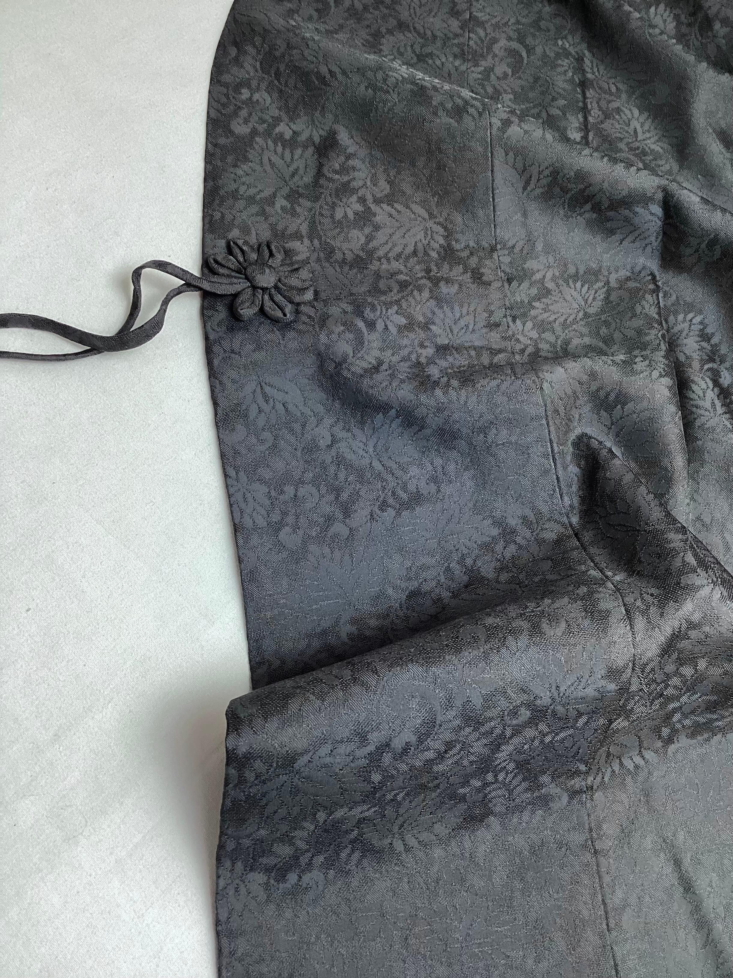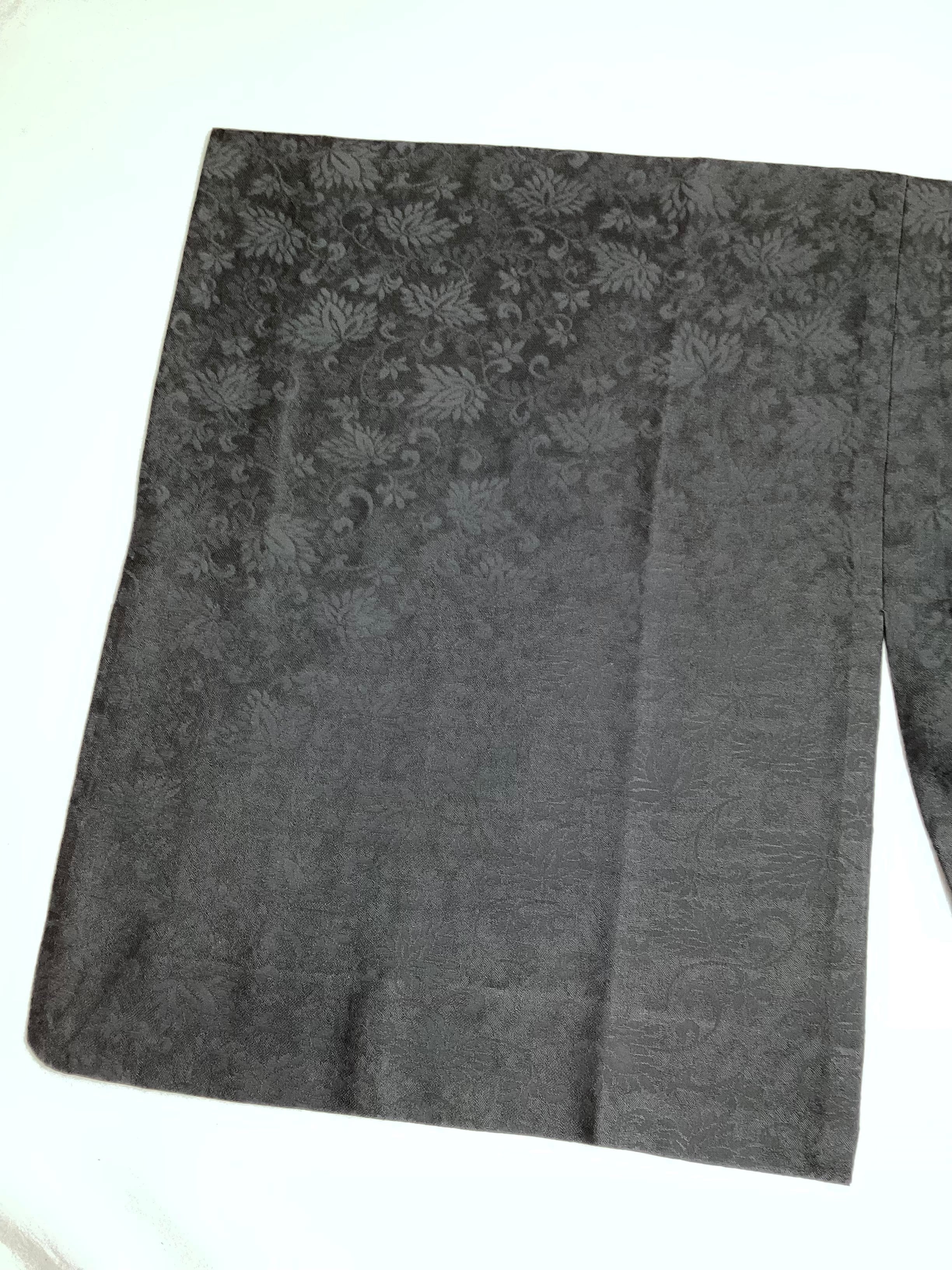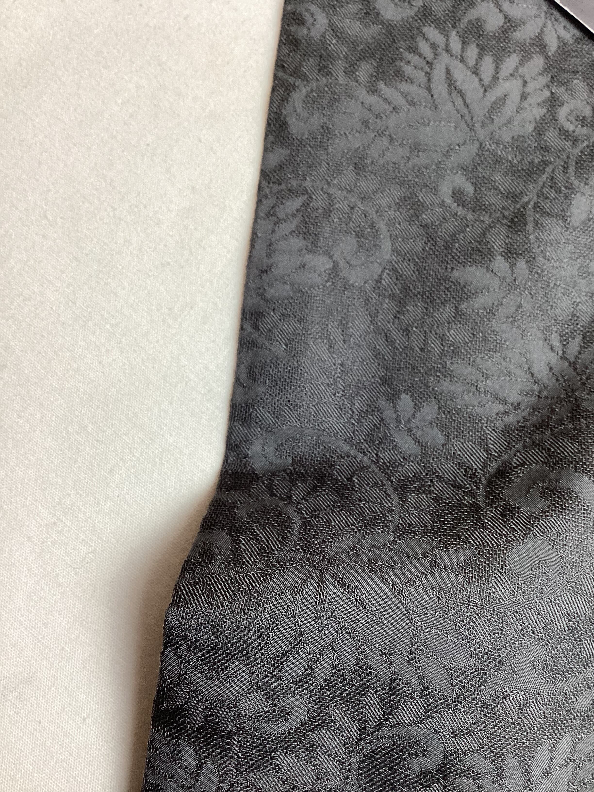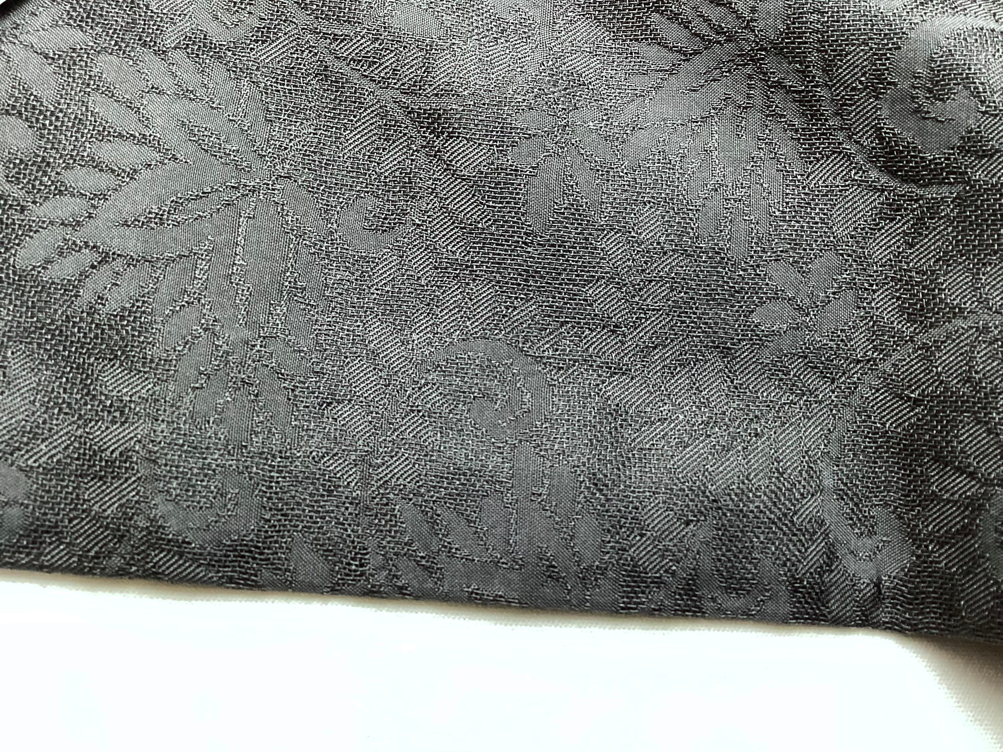 蔓草の植物文様の地紋が織り込まれた濃いチャコールグレー色の道中着コートです。紋紗なので、ほどよい透け感があり、3シーズンの軽い上ものとしてオススメです。春先でも気温の高い日が多い昨今は、薄物の羽織やコートの出番が早く、また着用期間も長くなっております。お出掛けの際の温度調整やチリよけとしていかがでしょうか。下前に付いている長い紐をぐるりと後ろ側に一周回して結ぶタイプなので、美しい裾すぼまりのフォルムが叶います。
