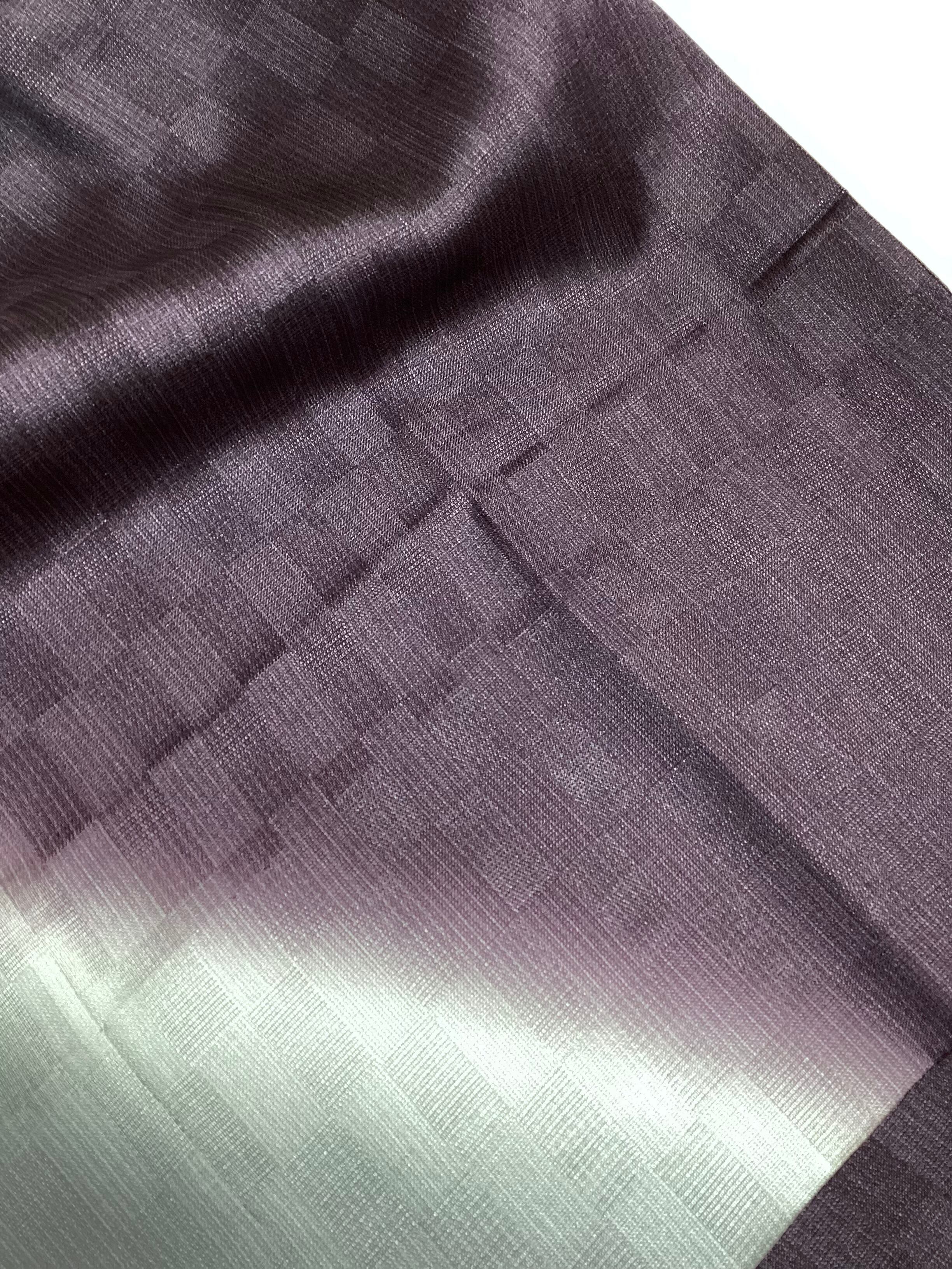 濃い紫色にグレーの暈しがアクセントに入った紋紗の道中着物コートです。軽くて柔らかでほどよい透け感のある紋紗の上ものは、着物でお出掛けの際には大変重宝するお品です。カジュアルからフォーマル寄りのお出掛けまで上品にまとめてくれる道中着です。