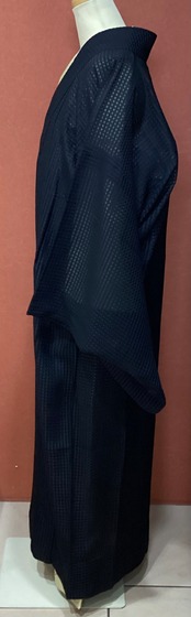 透け感のある黒地に格子文様の薄コートです。ポリエステル素材ですが、柔らかくしなやかで絹と大差ない質感です。ポリエステル素材なので、シワになりにくく気楽に羽織ってお出掛け出来る嬉しいお品です。ベーシックな黒地なので、コーディネートに困らず、大事なお着物や帯を守るチリよけとしていかがでしょうか。