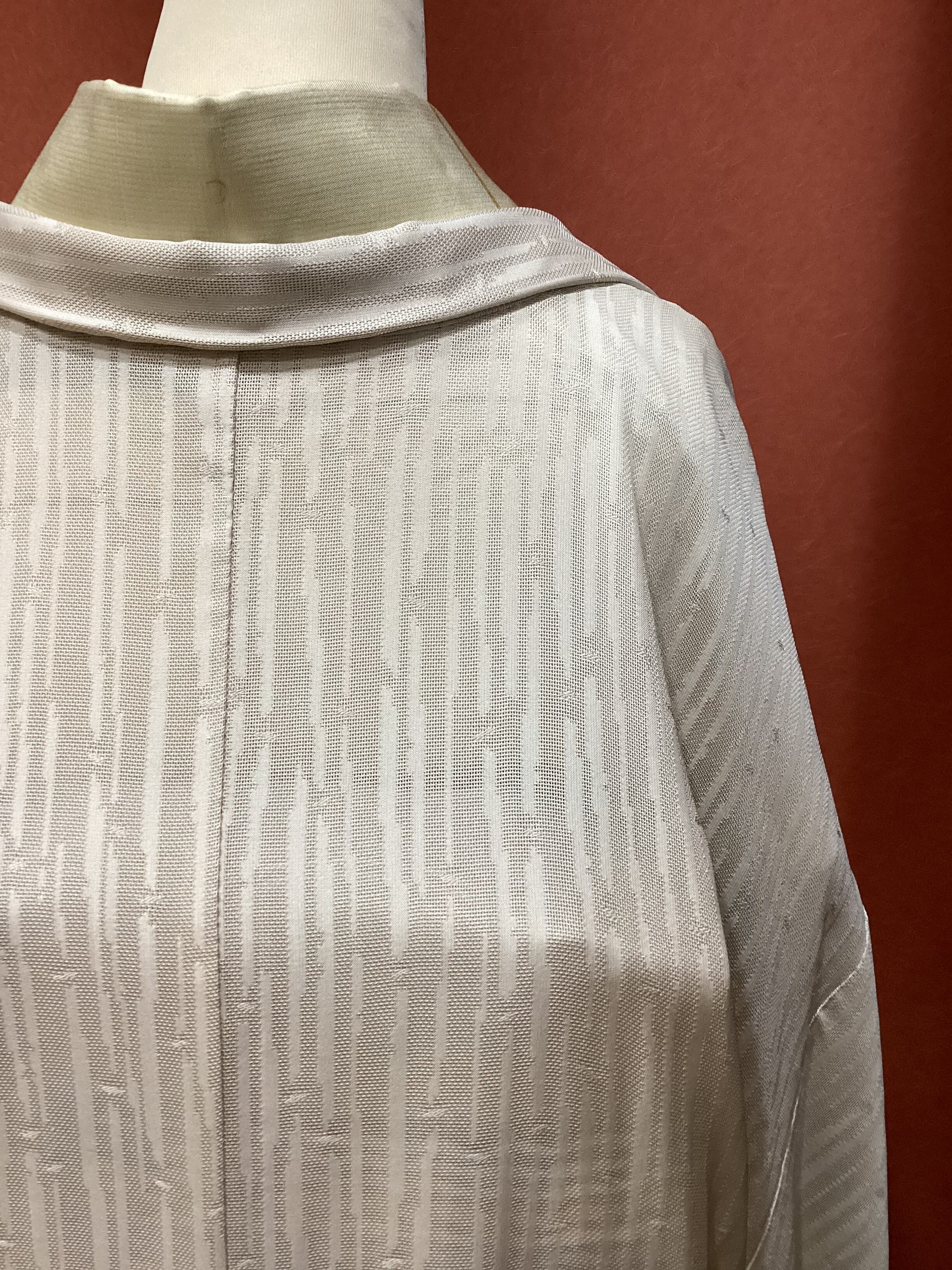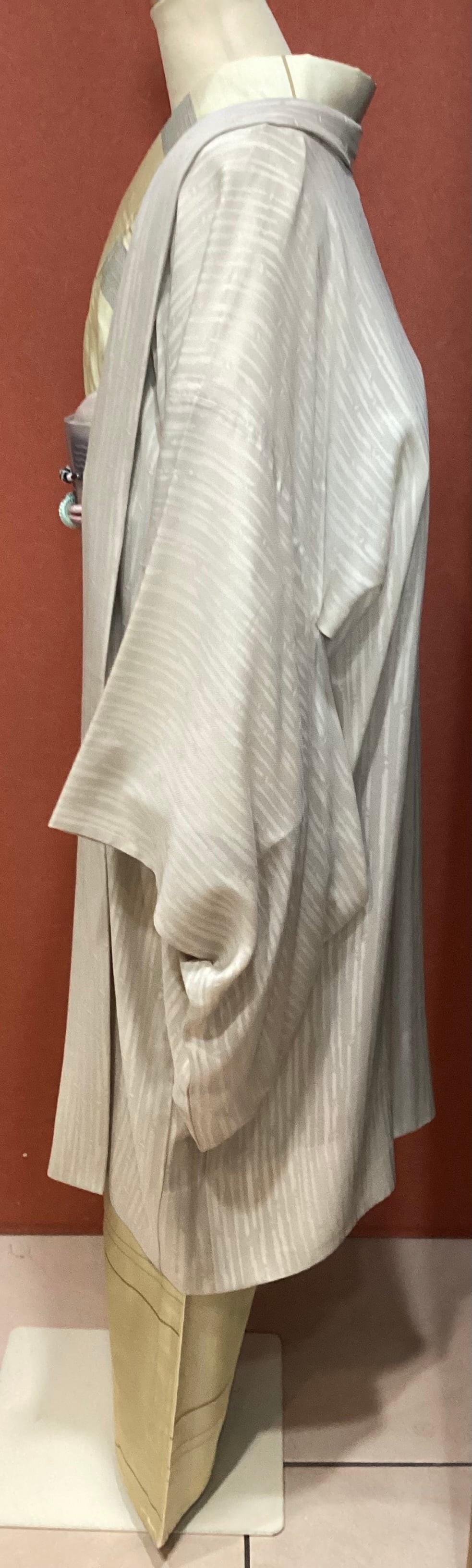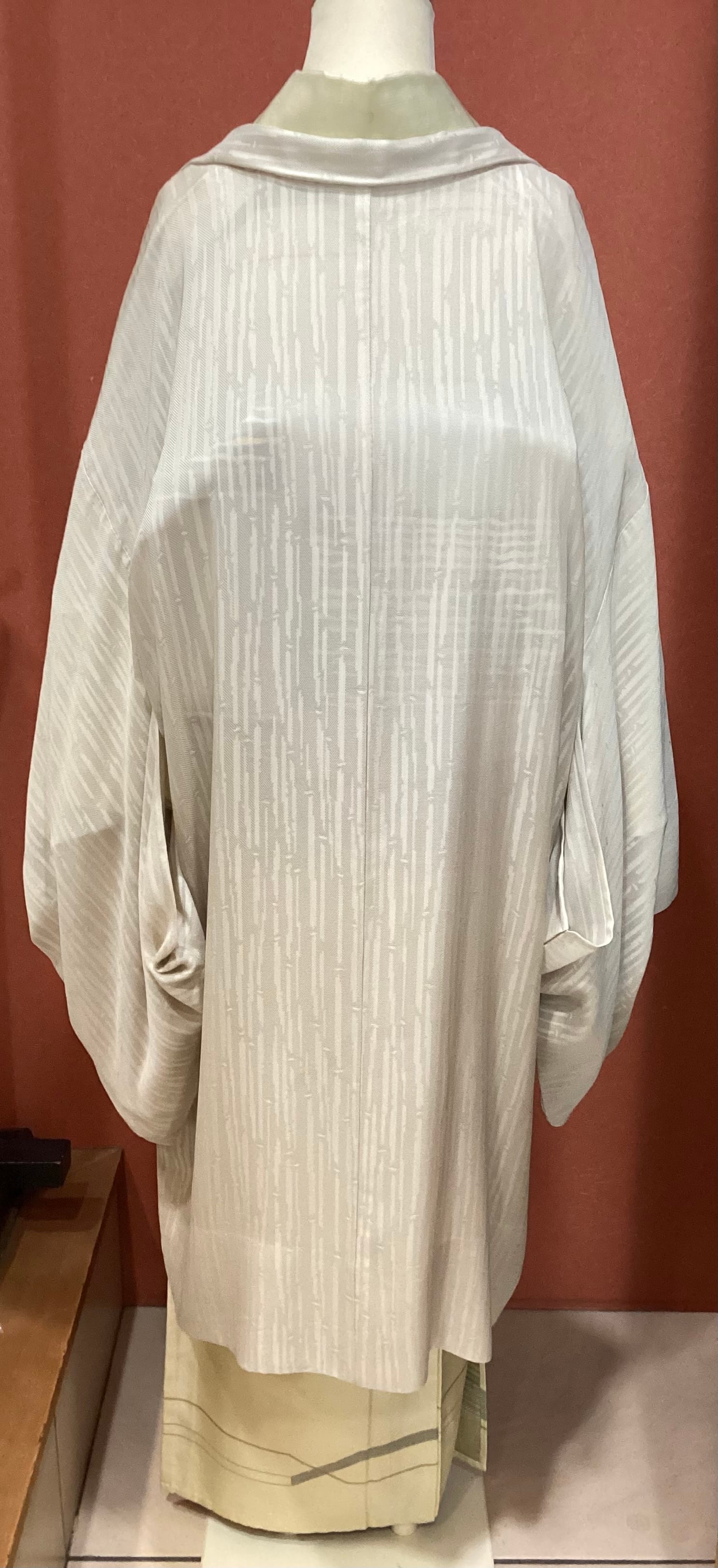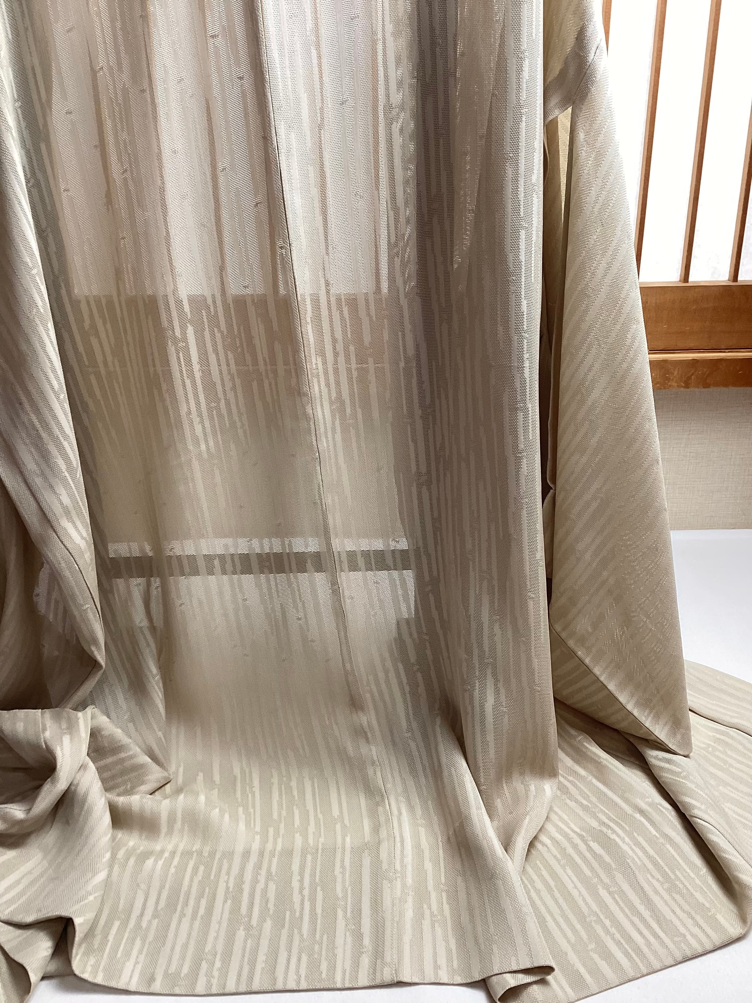 とろんと柔らかで落ち感よい薄羽織です。シンプルな竹縞文様が現代的でスッキリとした着姿を叶えます。柔らかな印象のくすみベージュのお色味、これからの季節に活躍する軽い羽織ものとしていかがでしょうか。