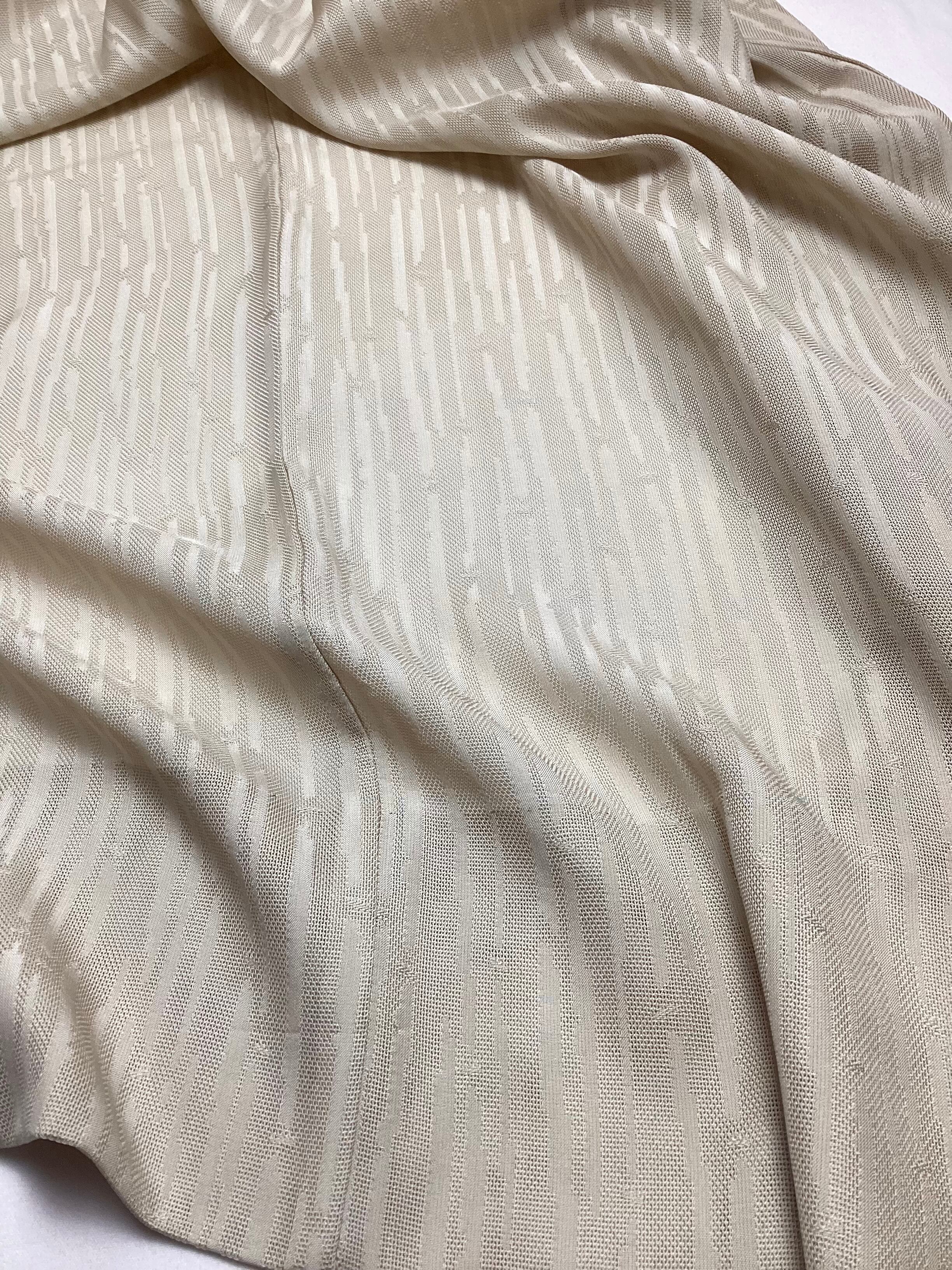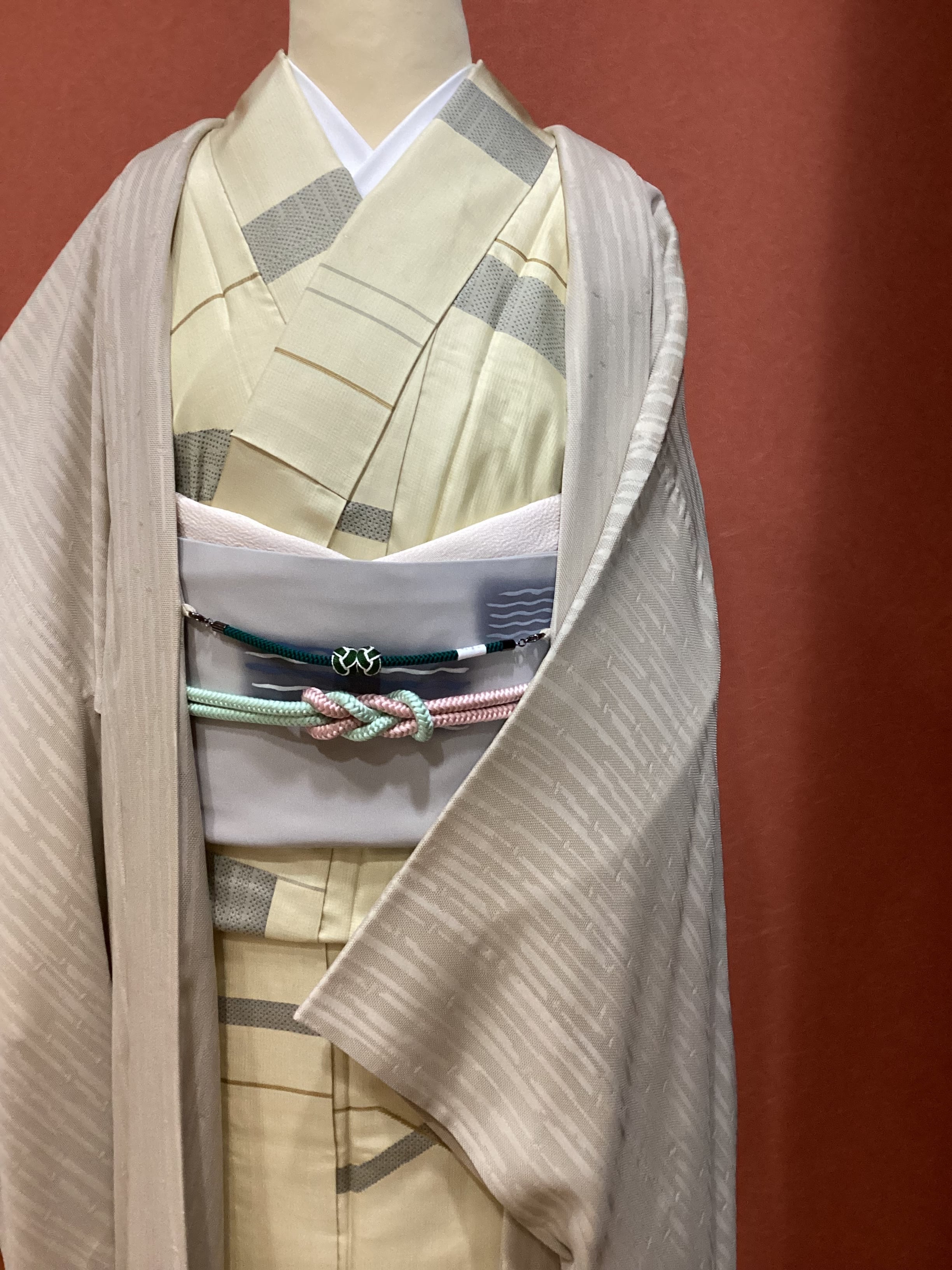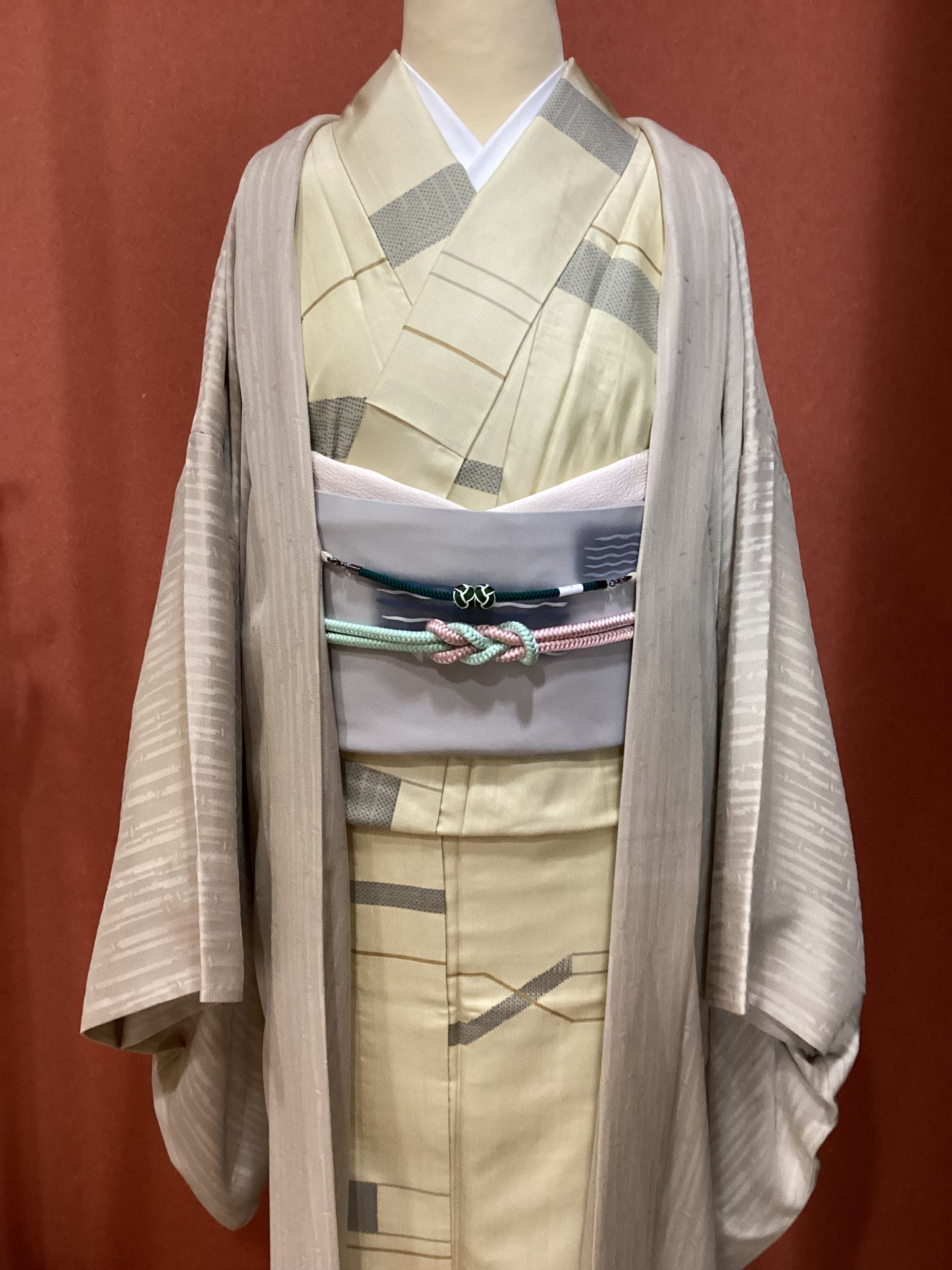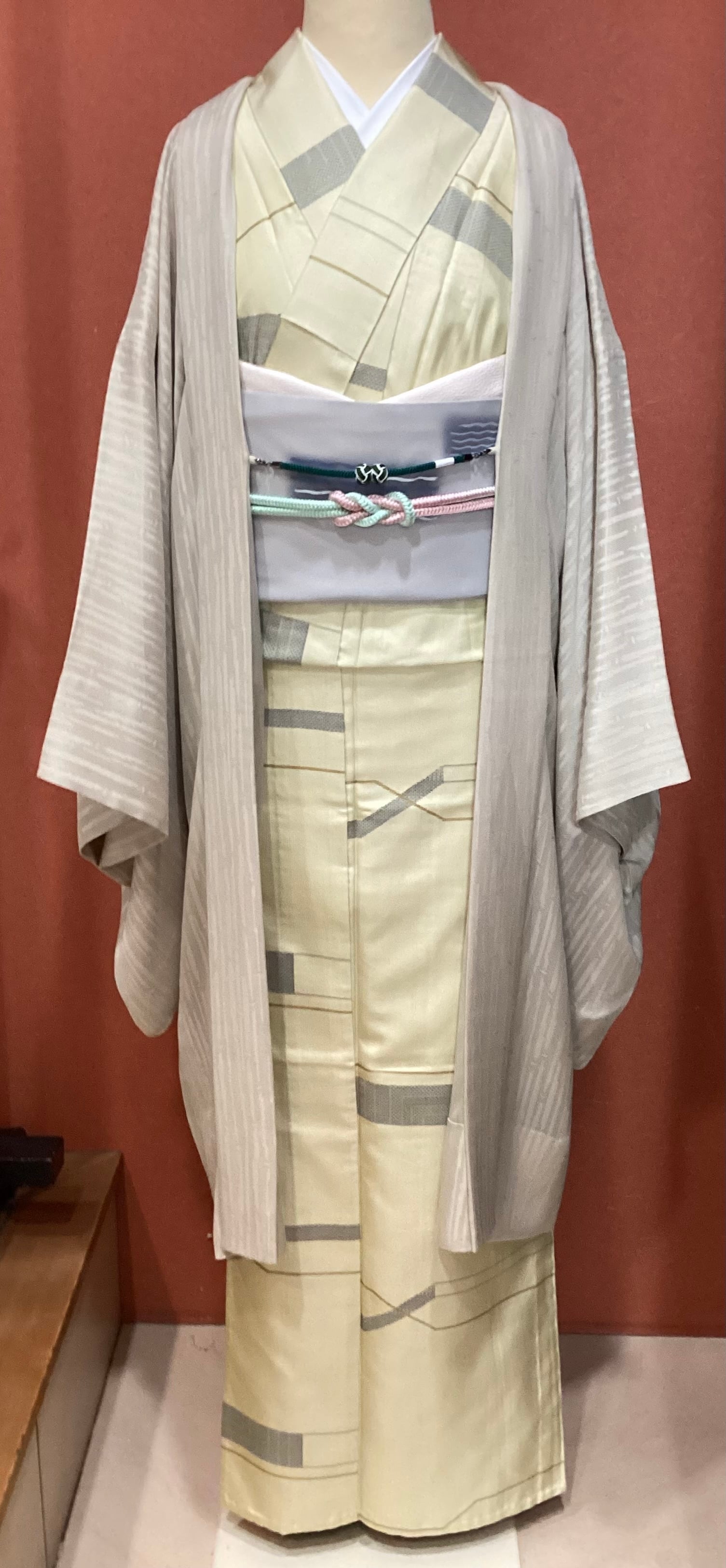 とろんと柔らかで落ち感よい薄羽織です。シンプルな竹縞文様が現代的でスッキリとした着姿を叶えます。柔らかな印象のくすみベージュのお色味、これからの季節に活躍する軽い羽織ものとしていかがでしょうか。