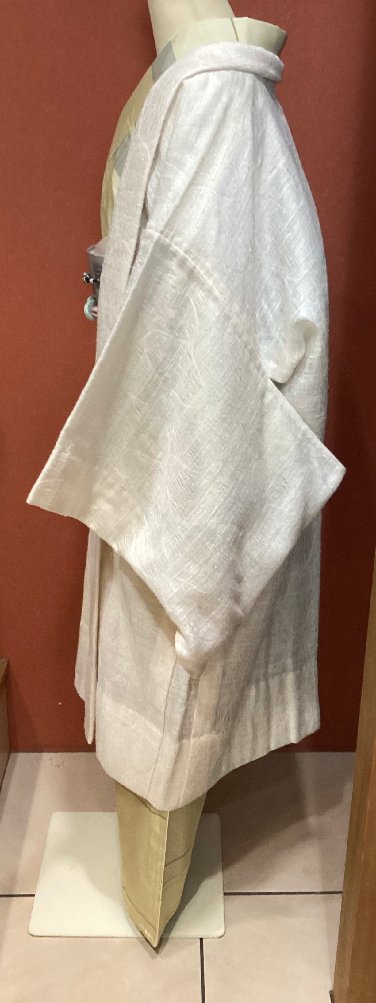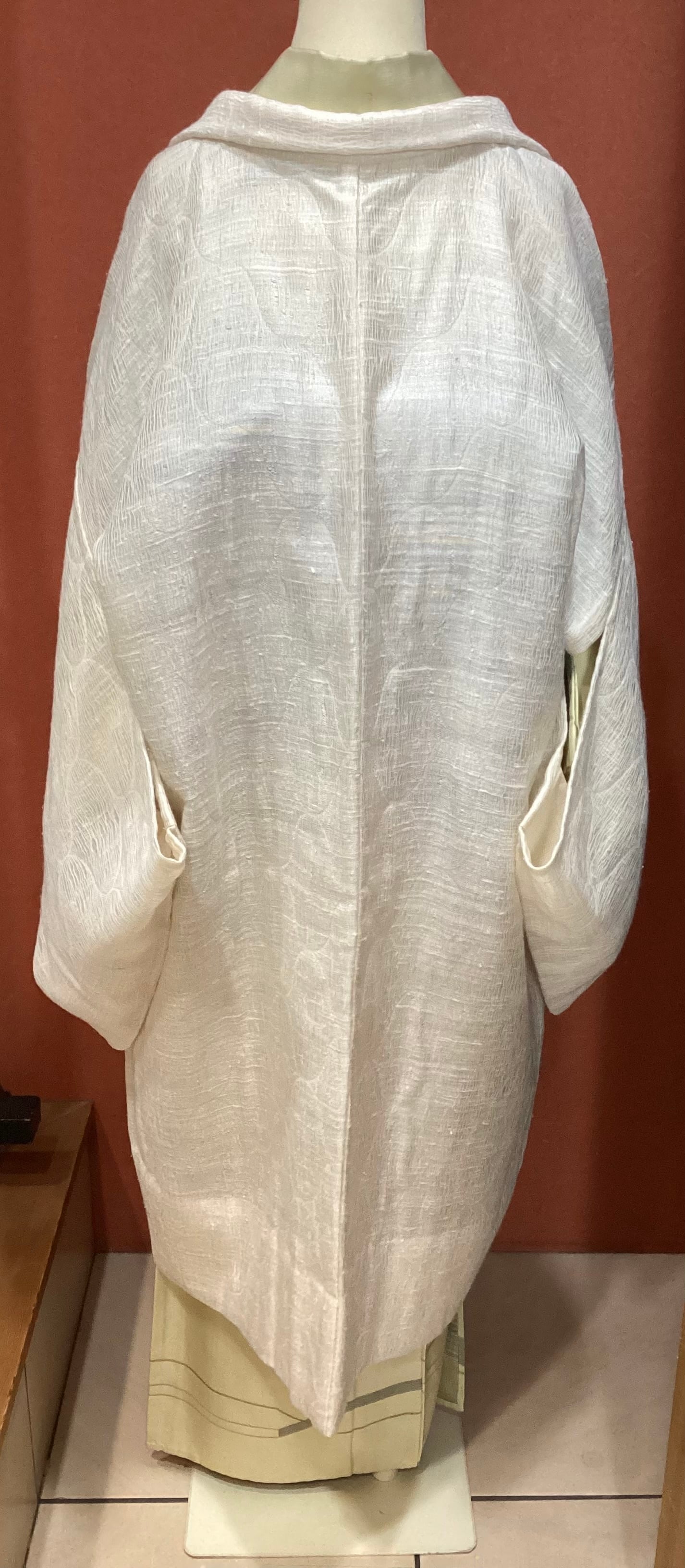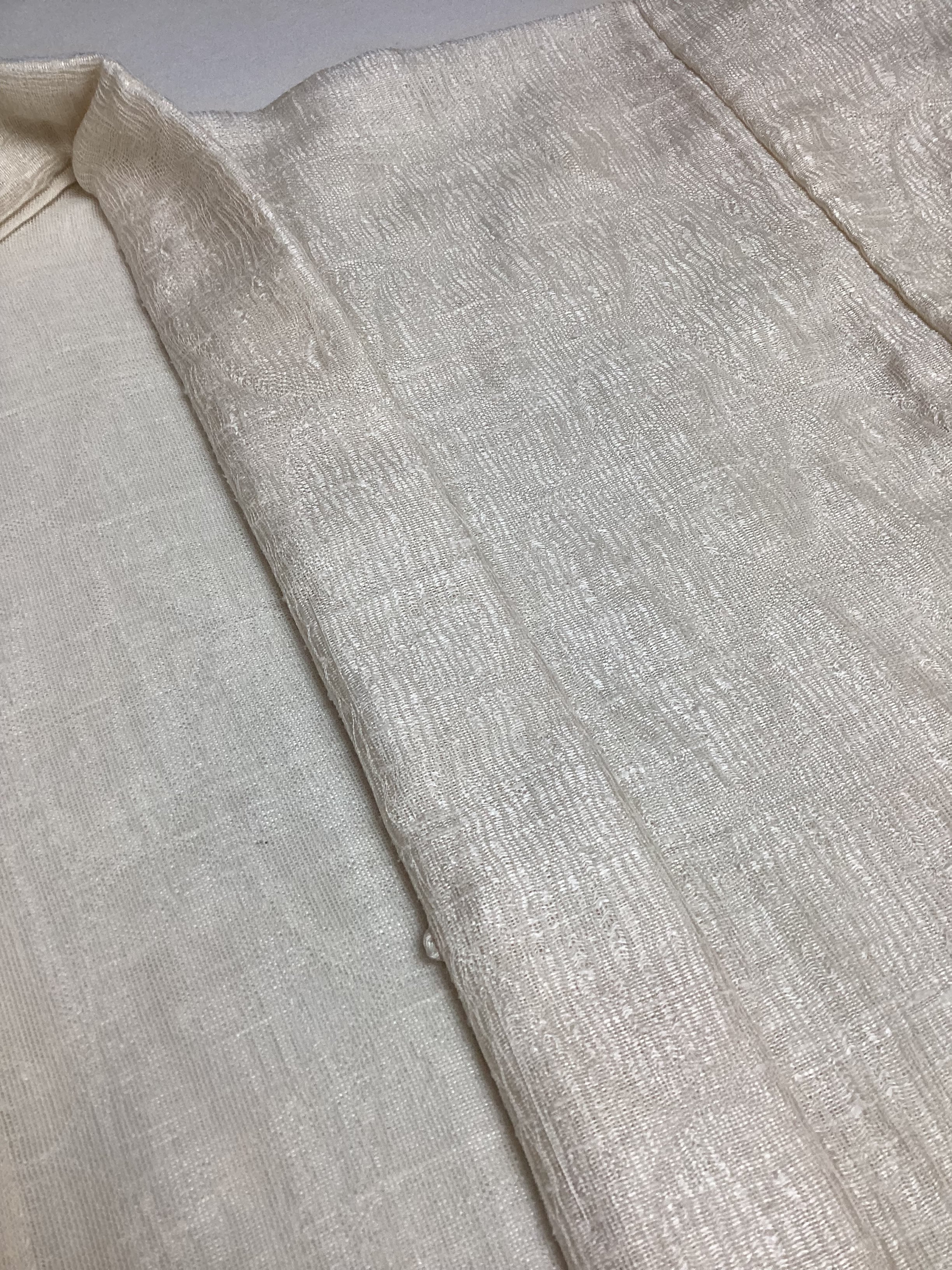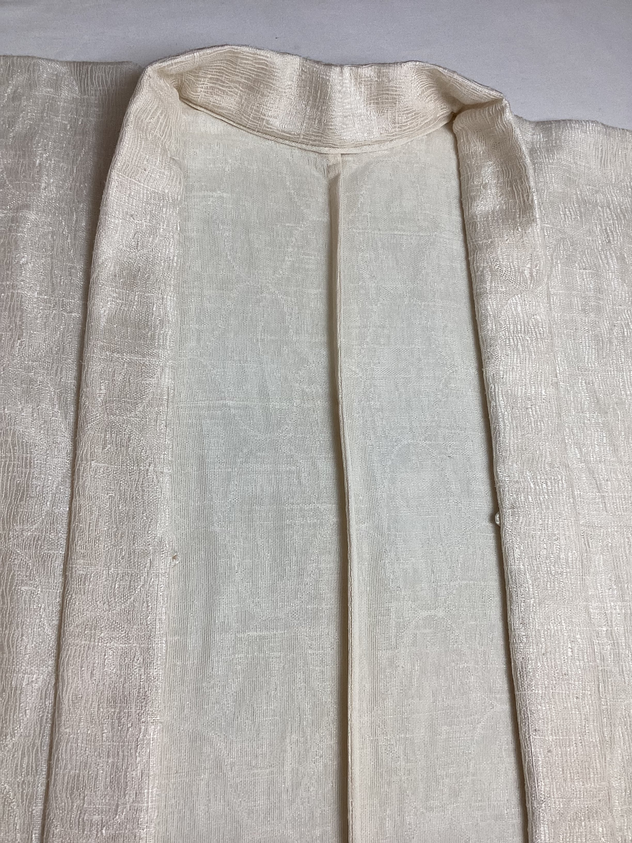 優しい乳白色の単衣羽織です。ふっくらとしたガーゼのような風合いで、一見無地のように見えますが、立涌文様の織地が浮かびます。細かく見ますと若干の毛羽立ちを感じますが、素材の持つ織地の風合いとしてご理解ください。
