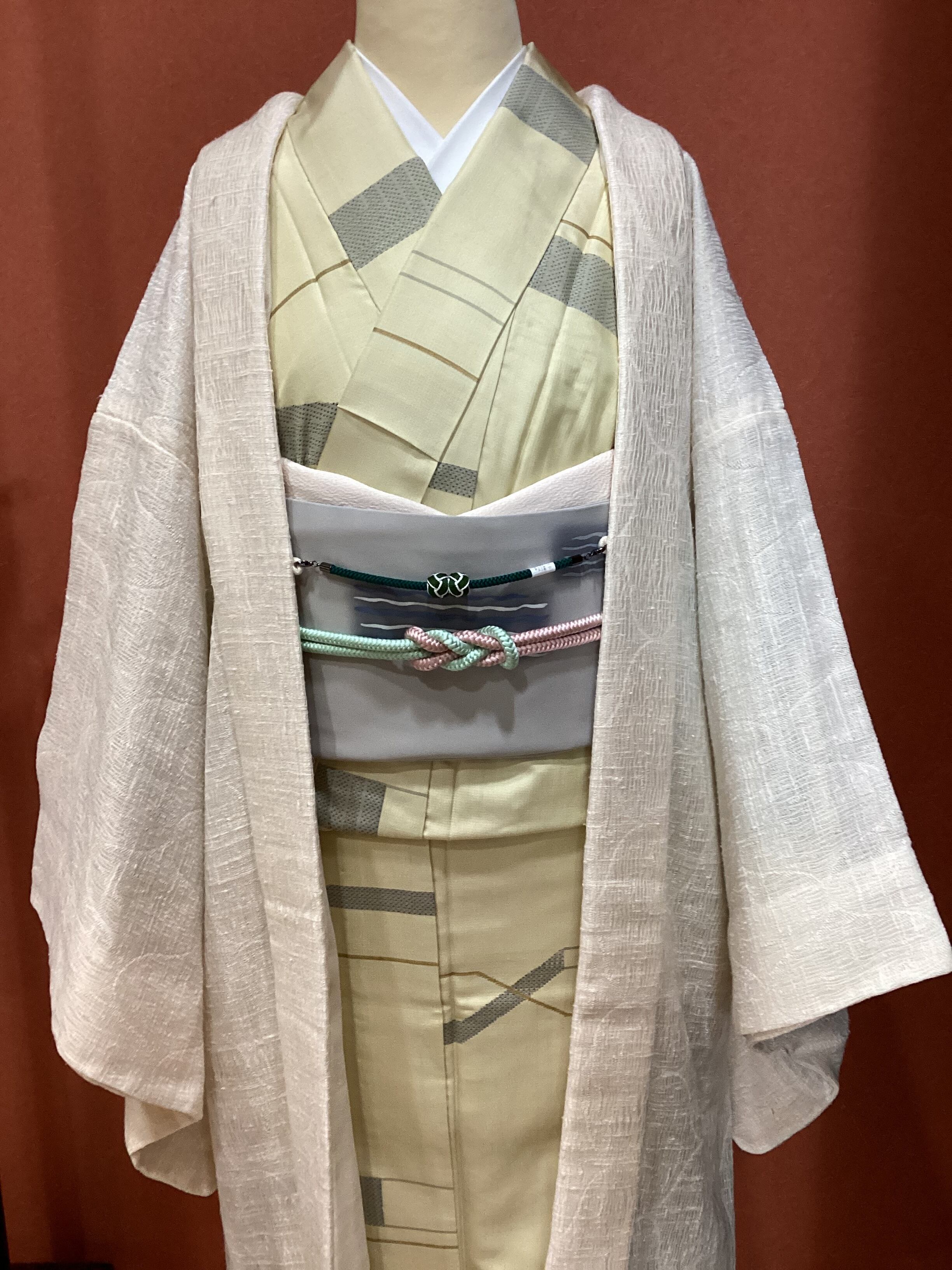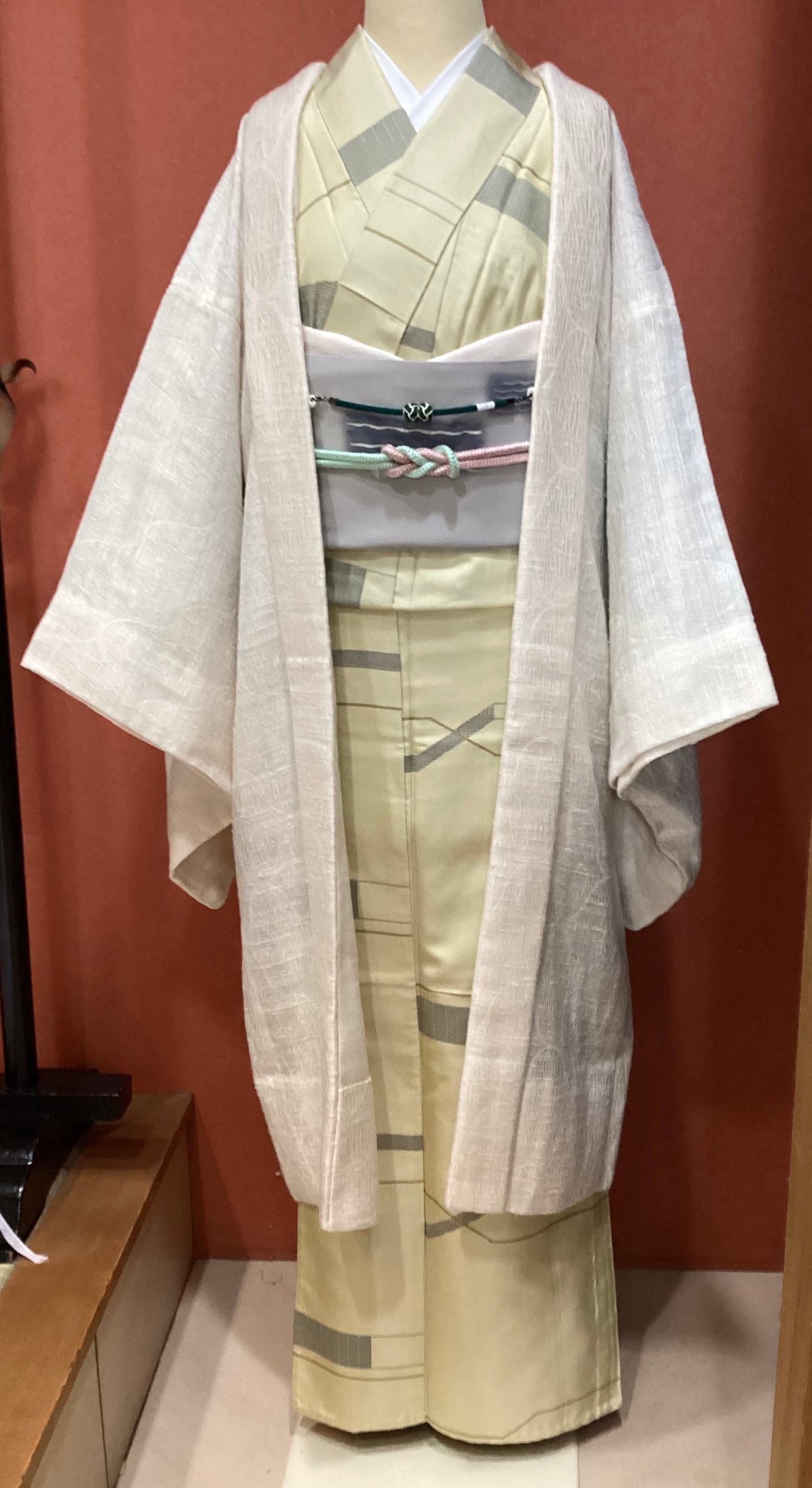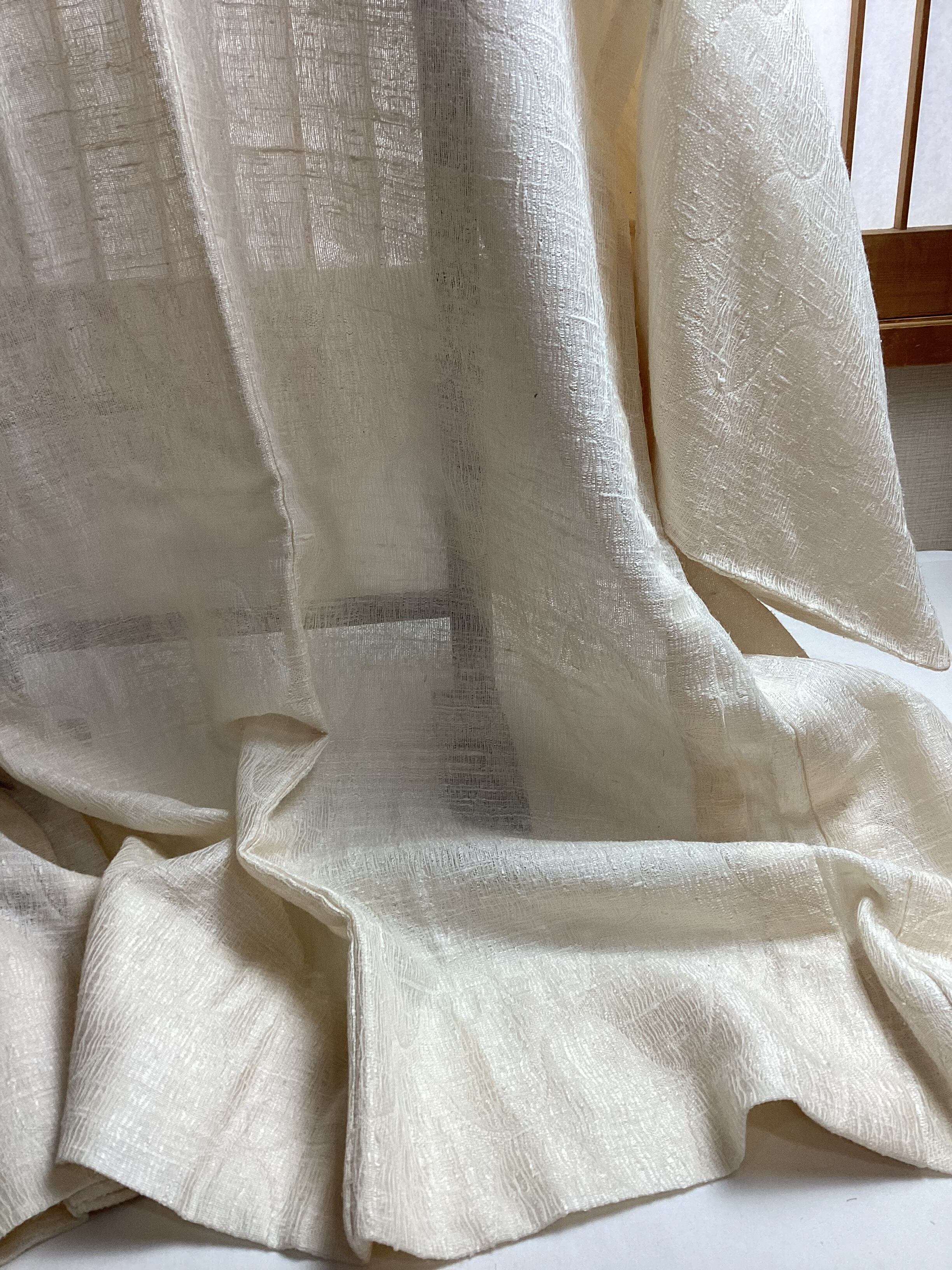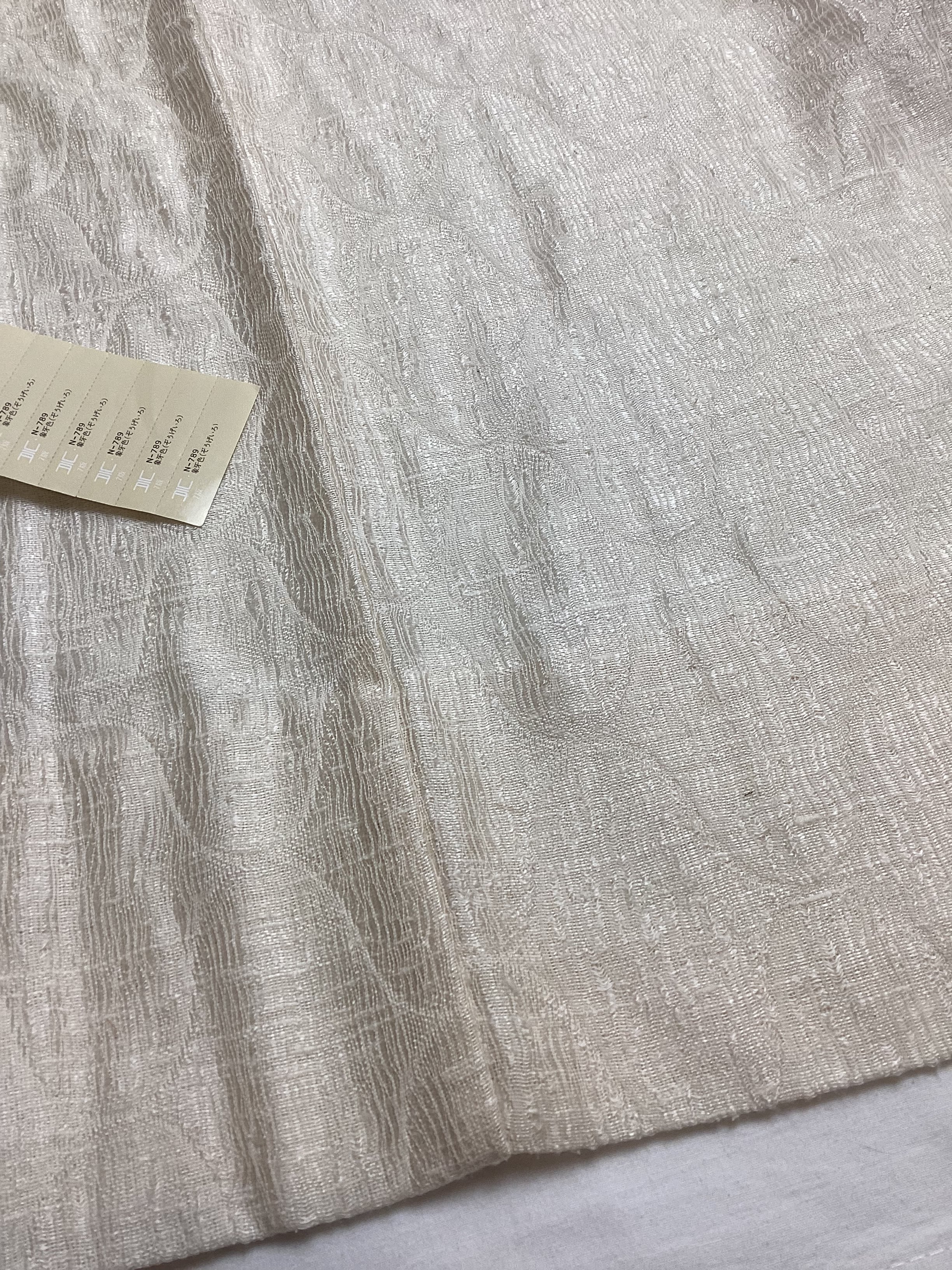 優しい乳白色の単衣羽織です。ふっくらとしたガーゼのような風合いで、一見無地のように見えますが、立涌文様の織地が浮かびます。細かく見ますと若干の毛羽立ちを感じますが、素材の持つ織地の風合いとしてご理解ください。
