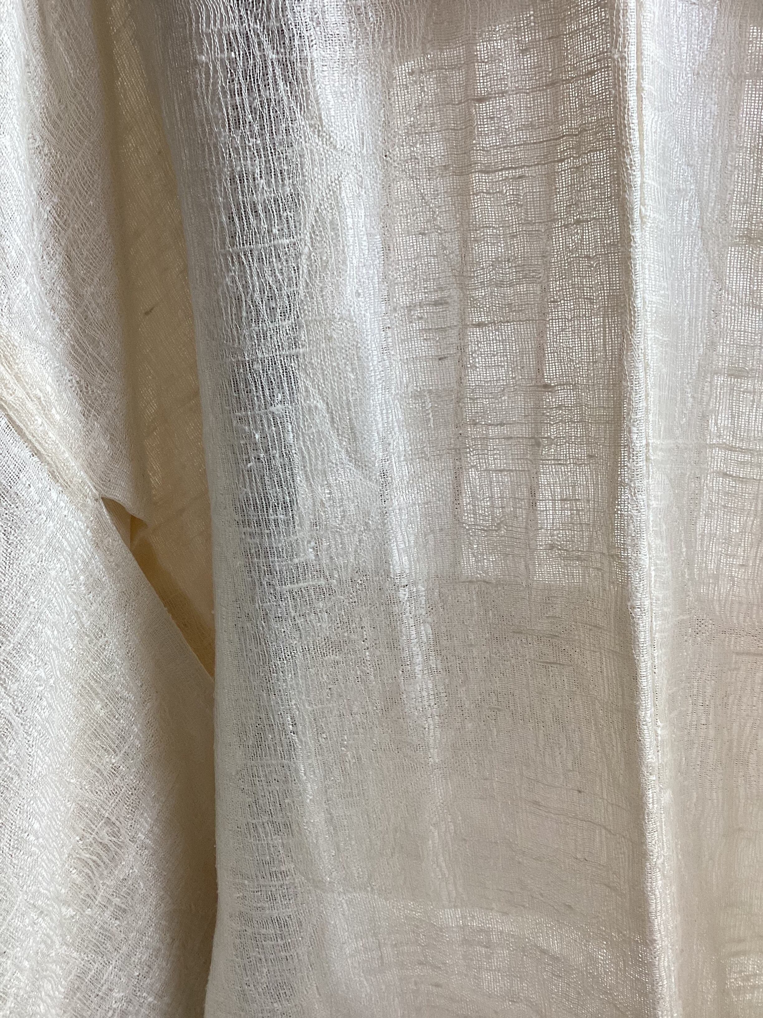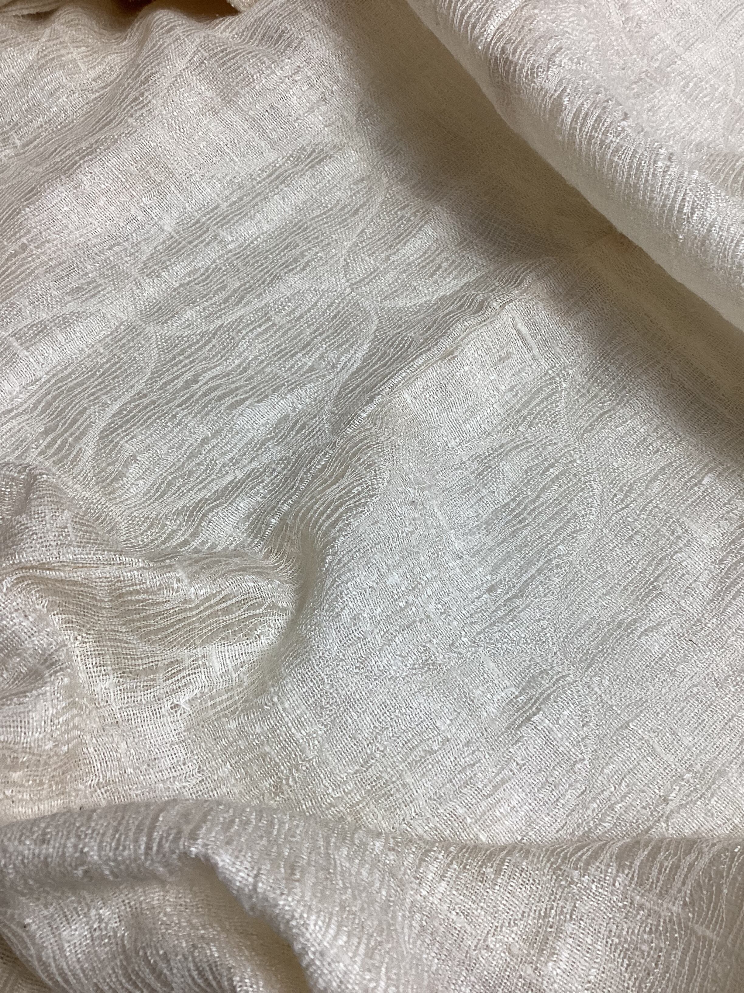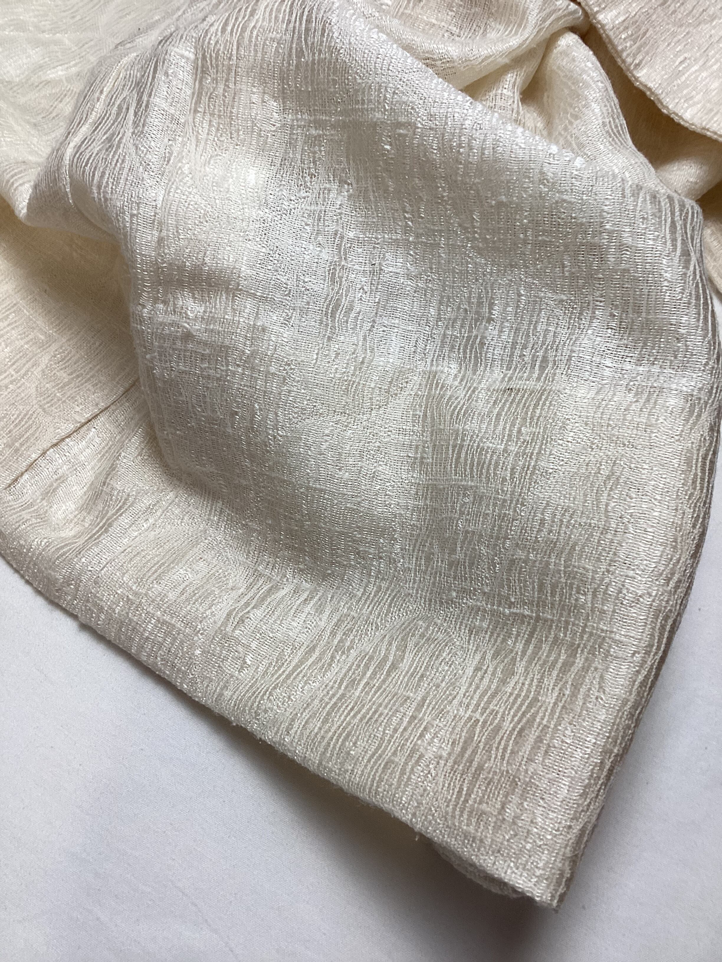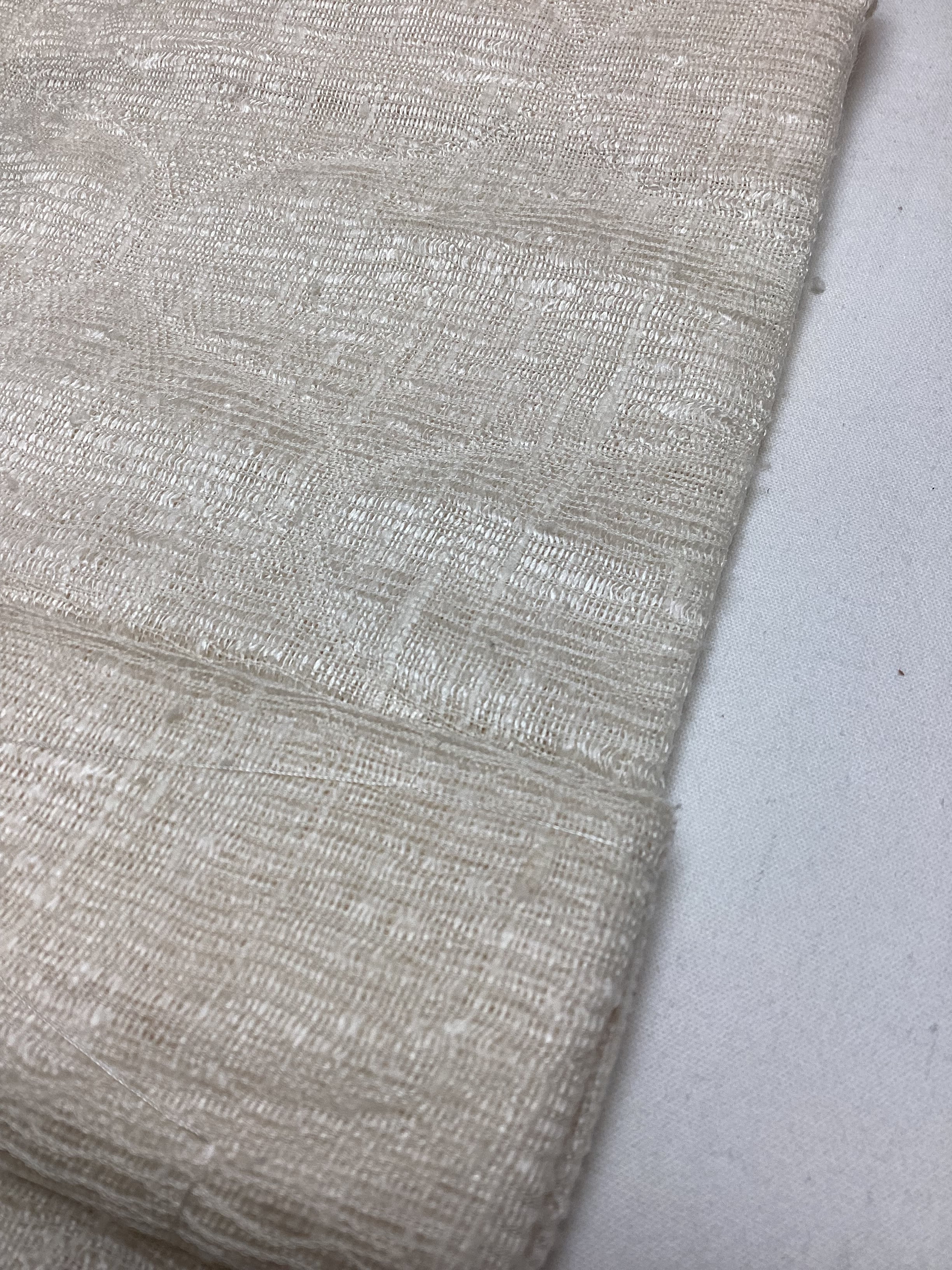優しい乳白色の単衣羽織です。ふっくらとしたガーゼのような風合いで、一見無地のように見えますが、立涌文様の織地が浮かびます。細かく見ますと若干の毛羽立ちを感じますが、素材の持つ織地の風合いとしてご理解ください。
