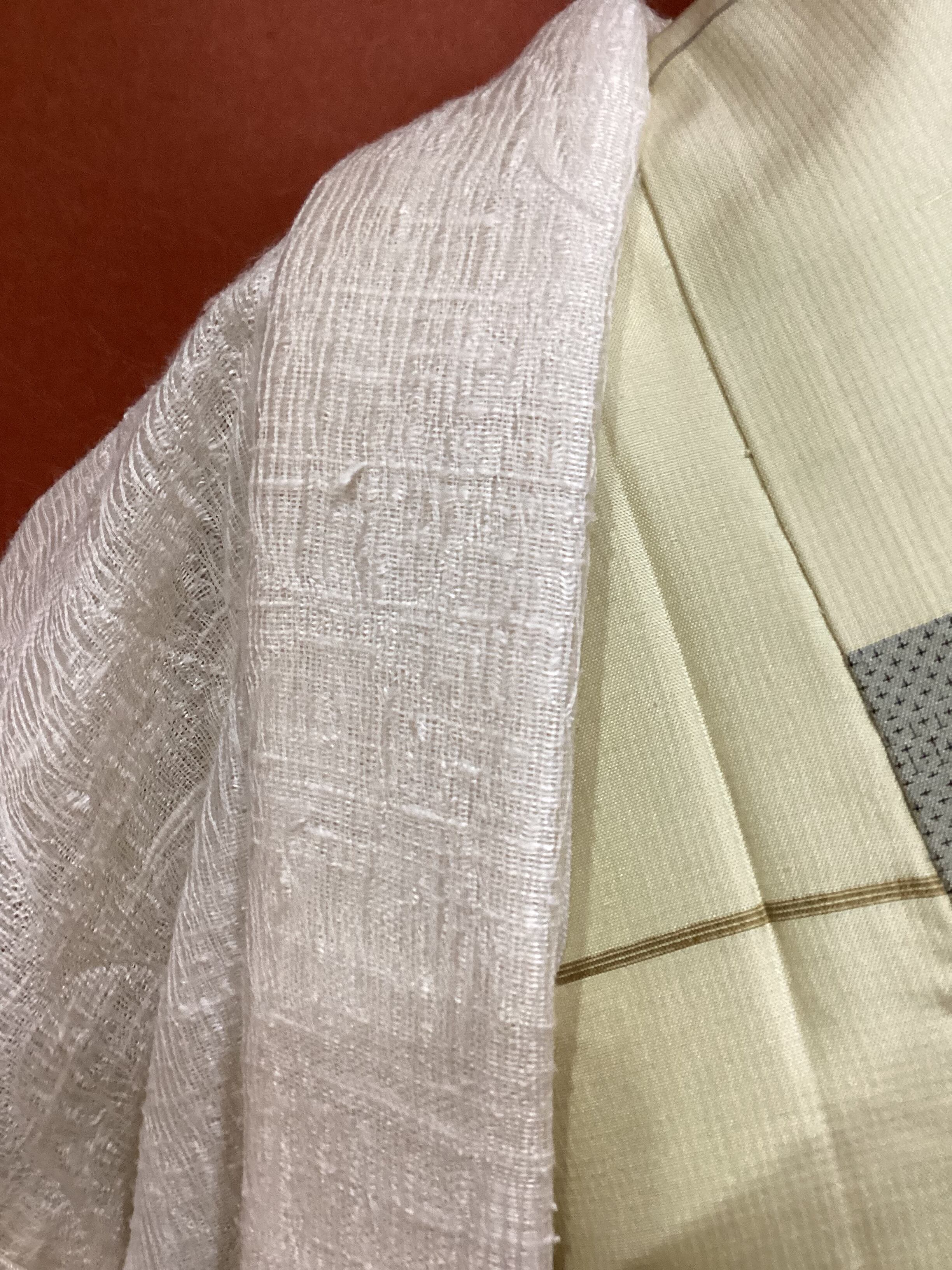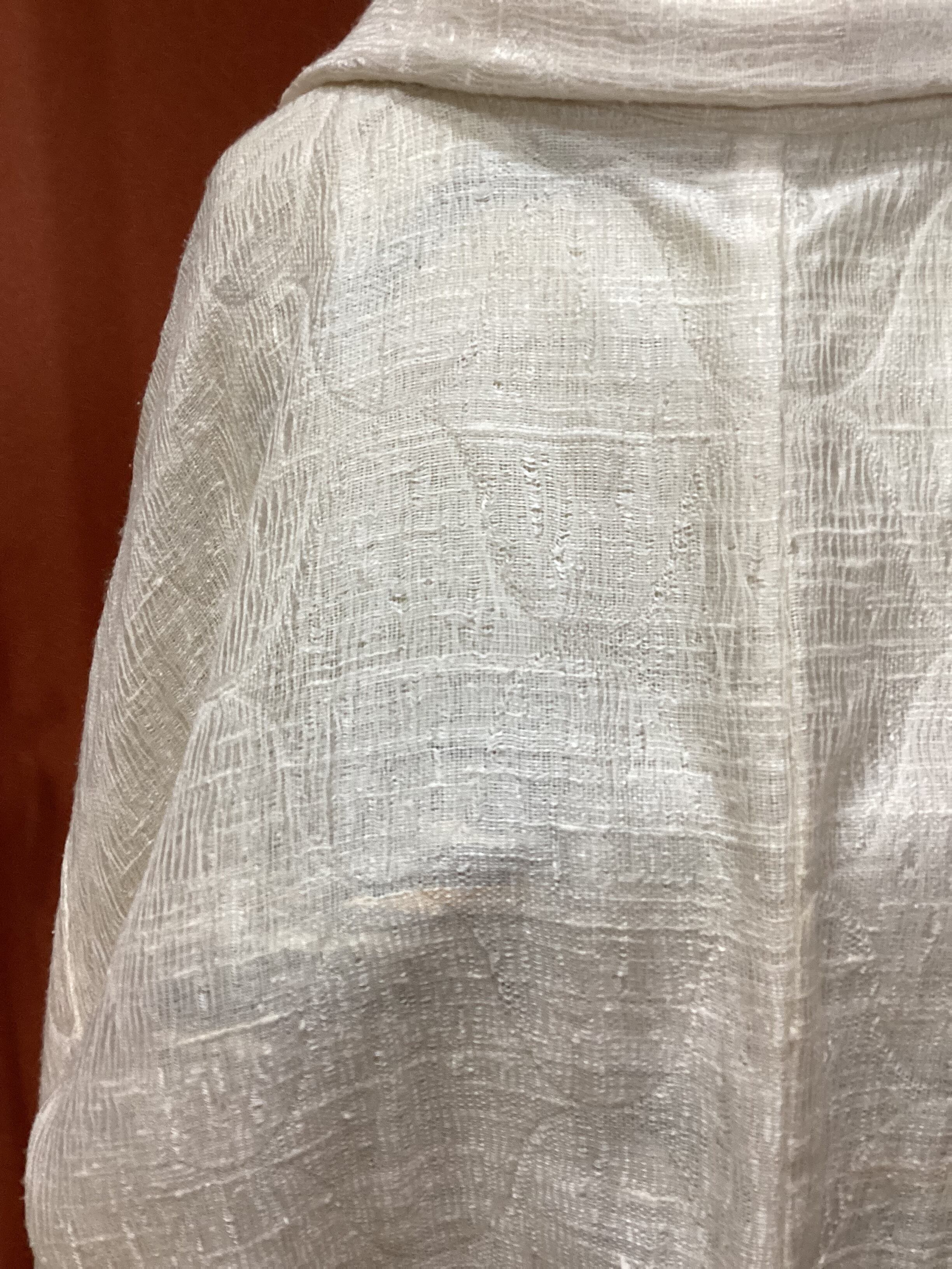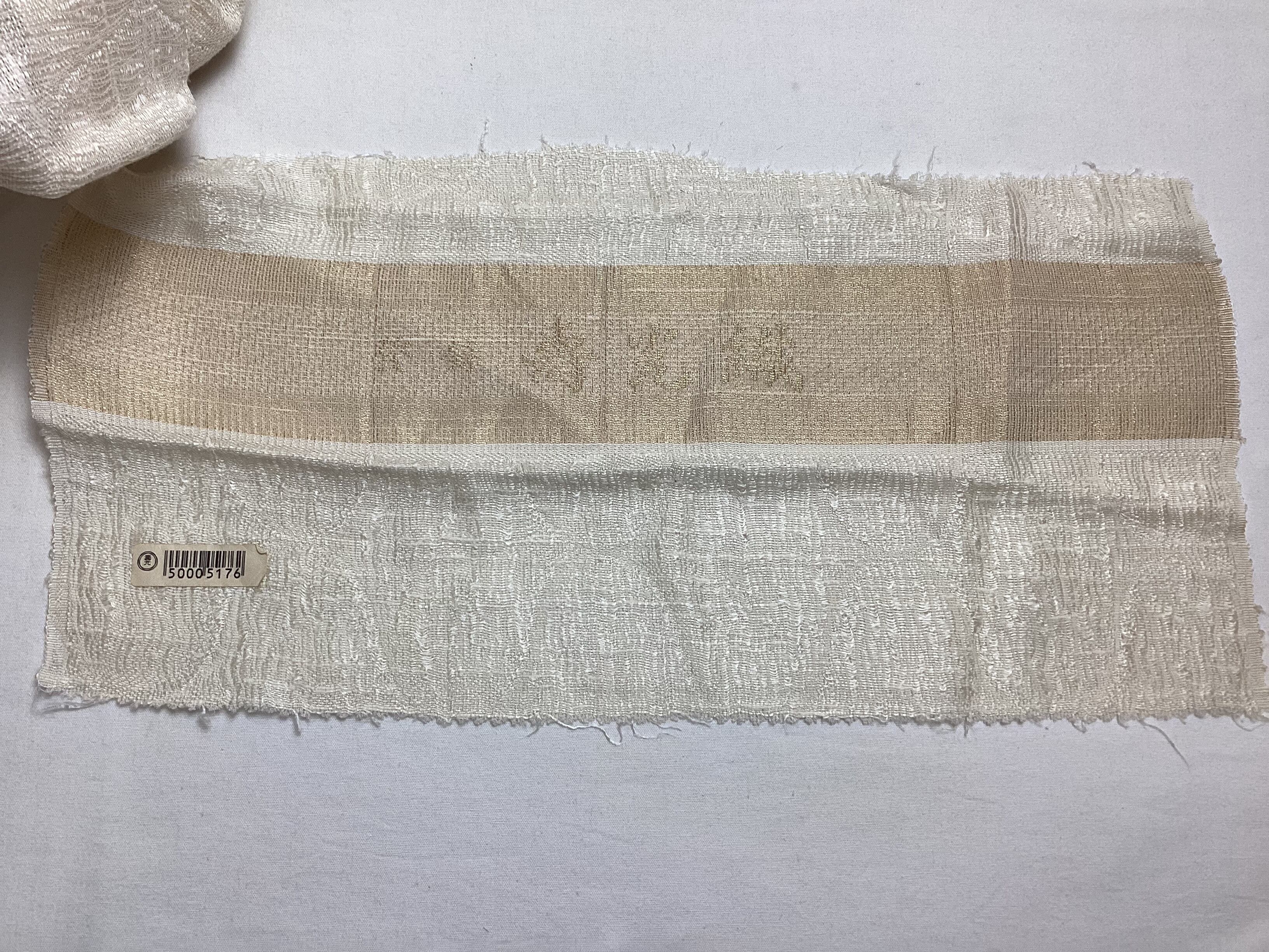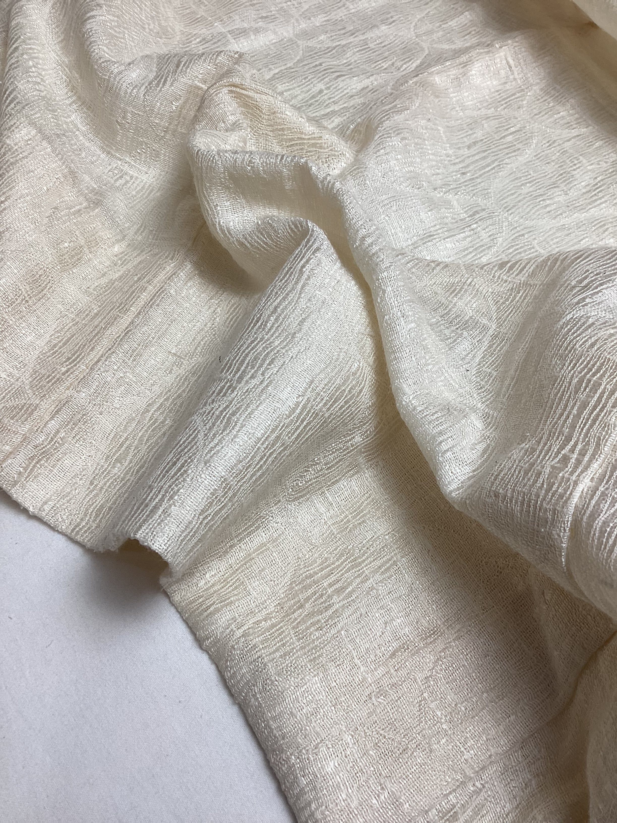 優しい乳白色の単衣羽織です。ふっくらとしたガーゼのような風合いで、一見無地のように見えますが、立涌文様の織地が浮かびます。細かく見ますと若干の毛羽立ちを感じますが、素材の持つ織地の風合いとしてご理解ください。