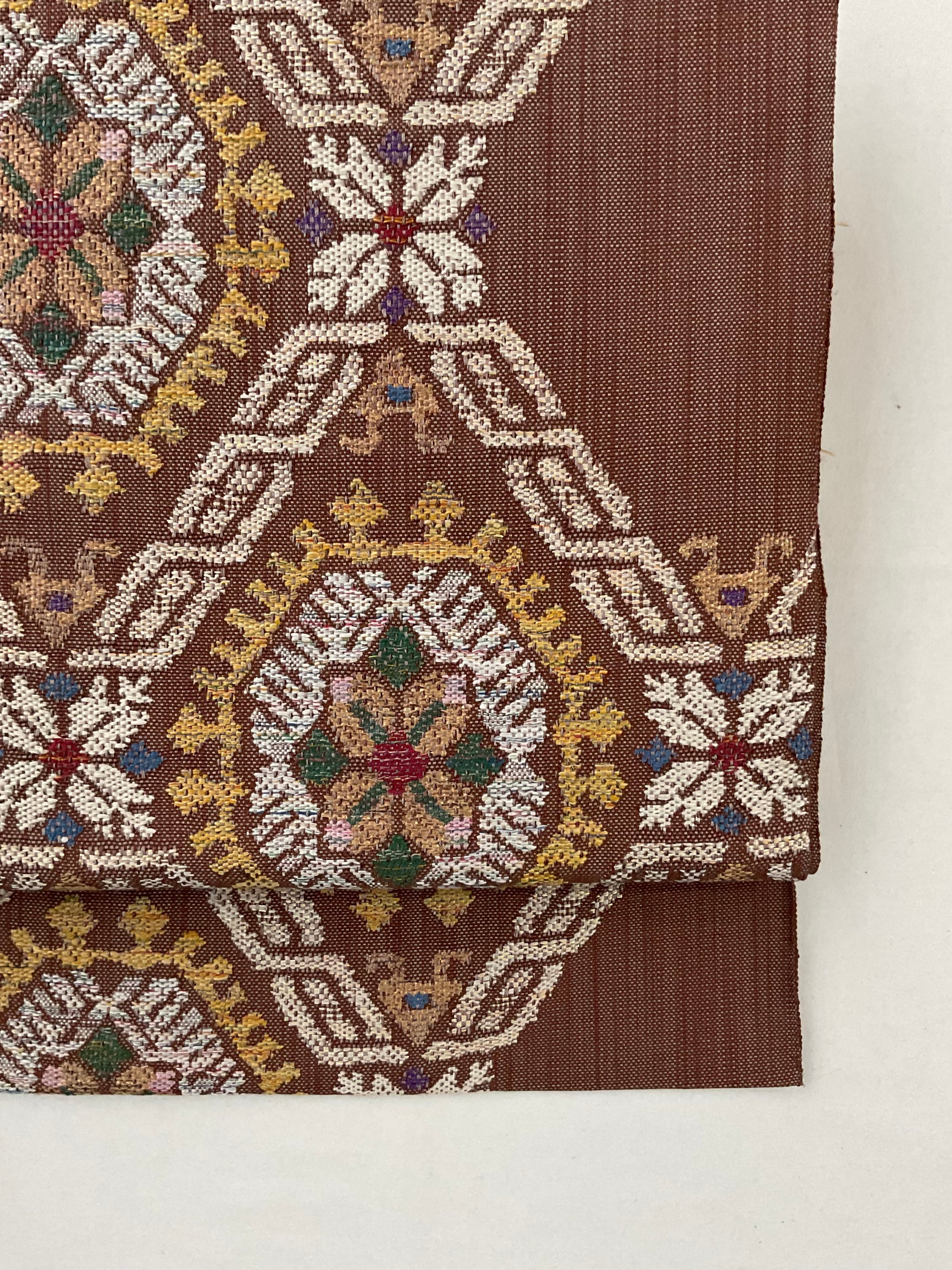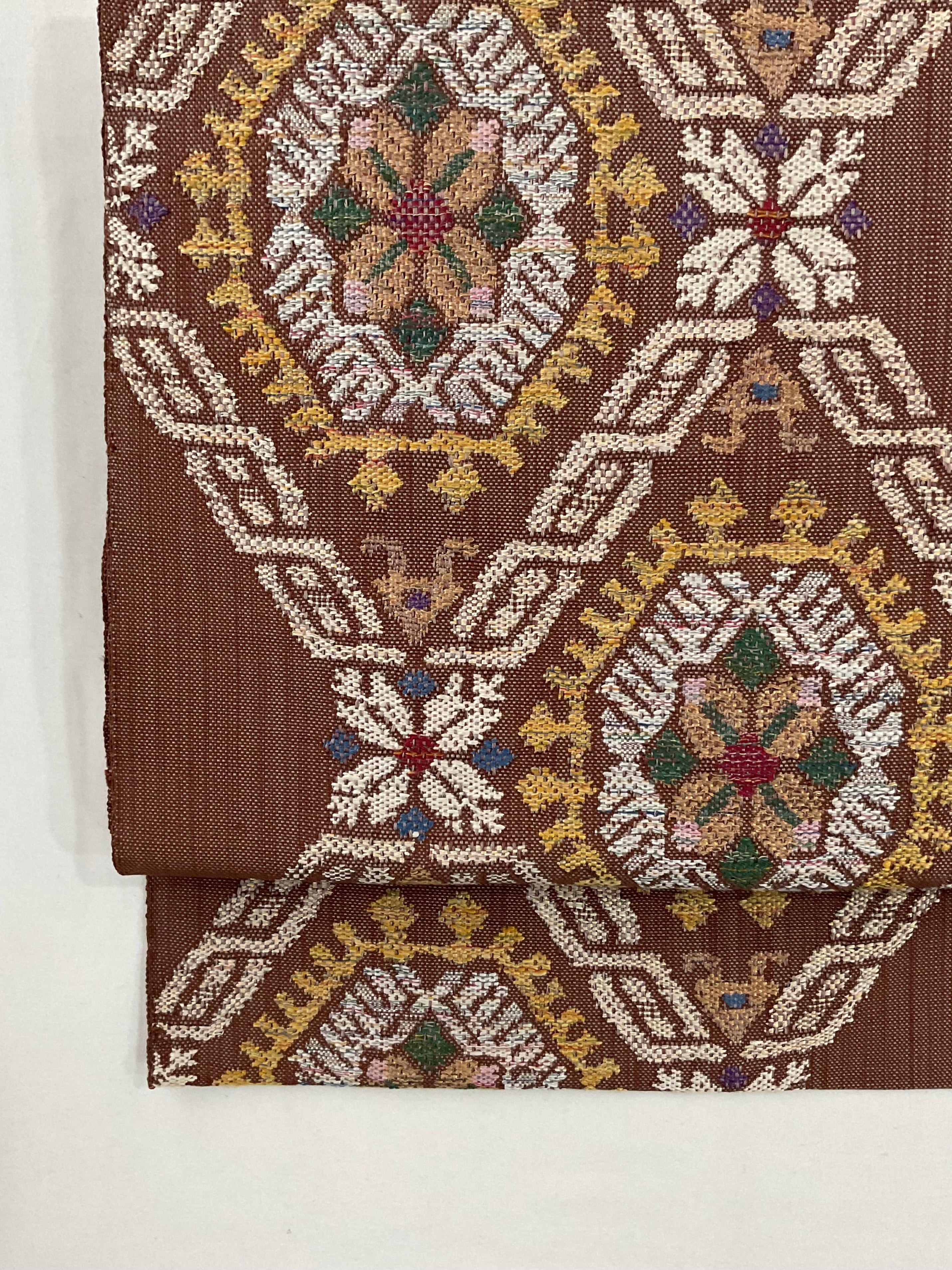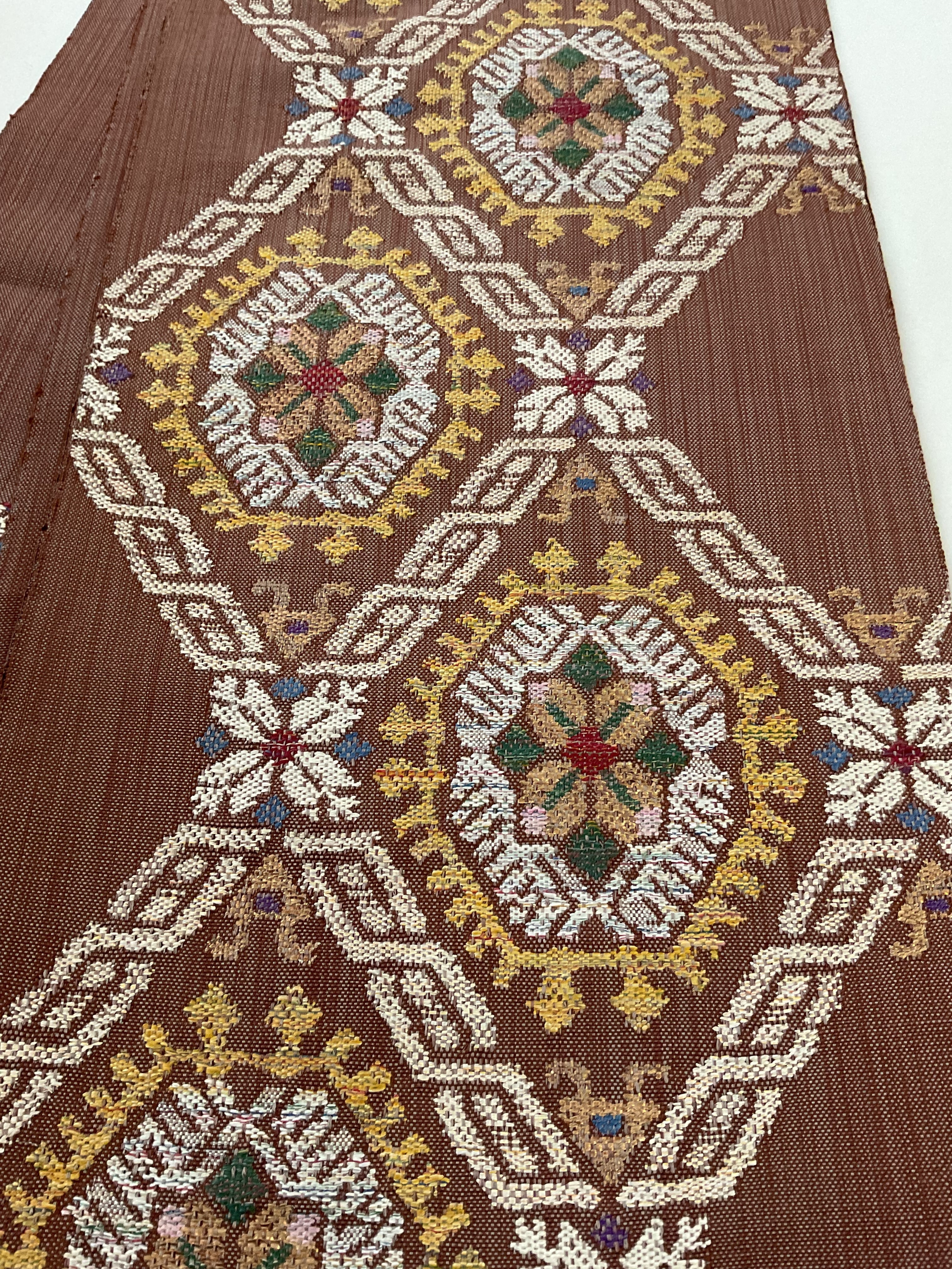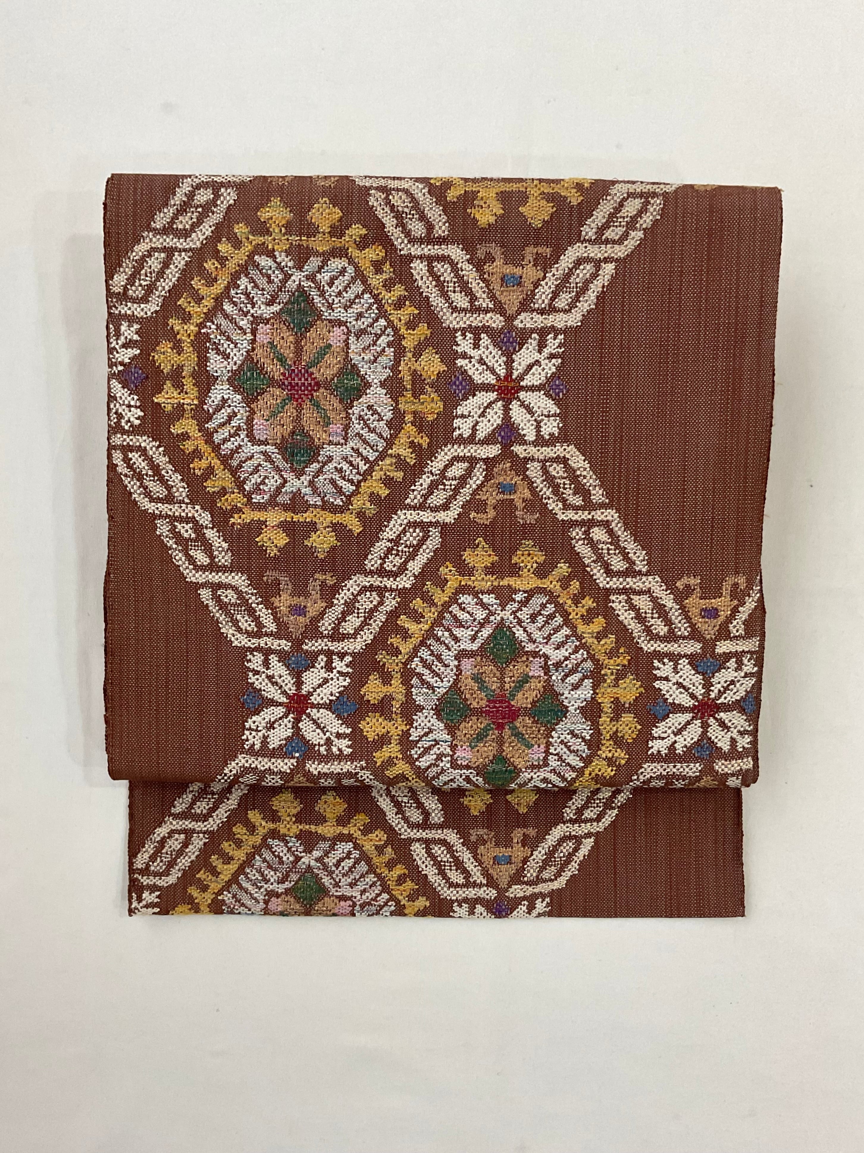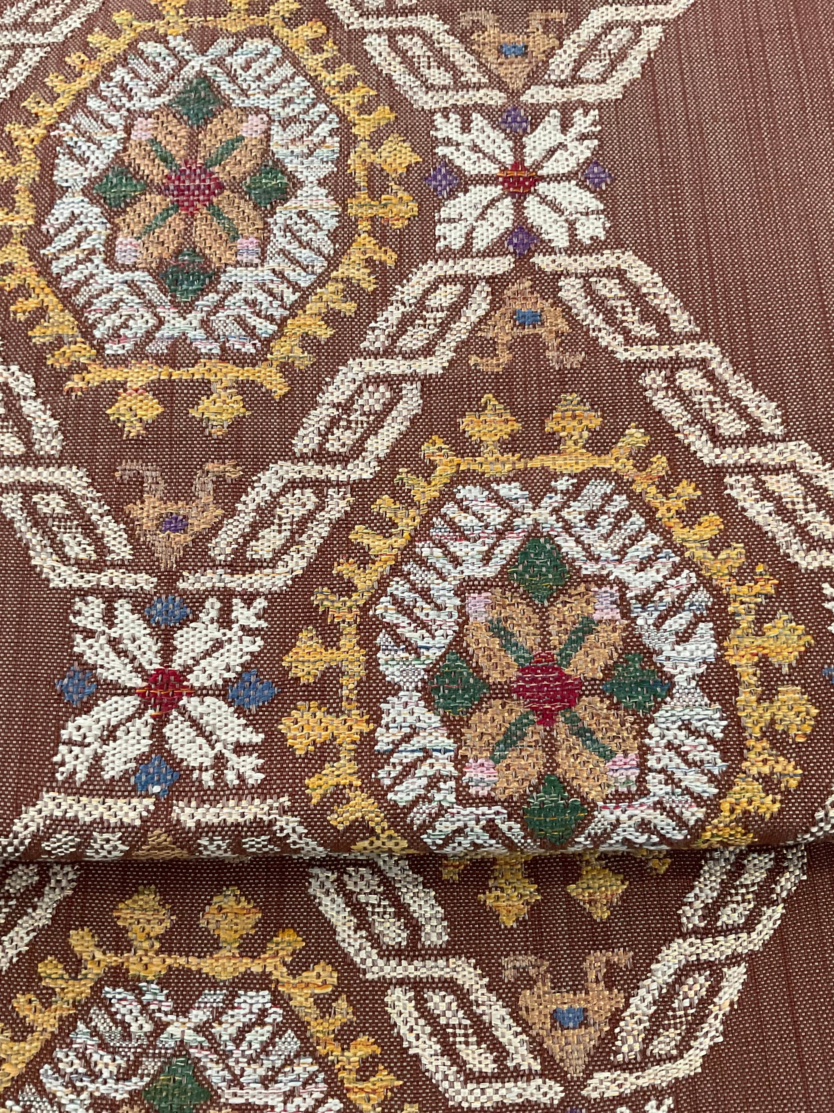 普段のお洒落に活躍する紬八寸なごや帯です。カラフルな色糸をふんだんに使ってお花と幾何学文様を組み合わせた可愛らしいお柄が織り出されています。紬や小紋に合わせて気軽なお出掛け用にいかがでしょうか。