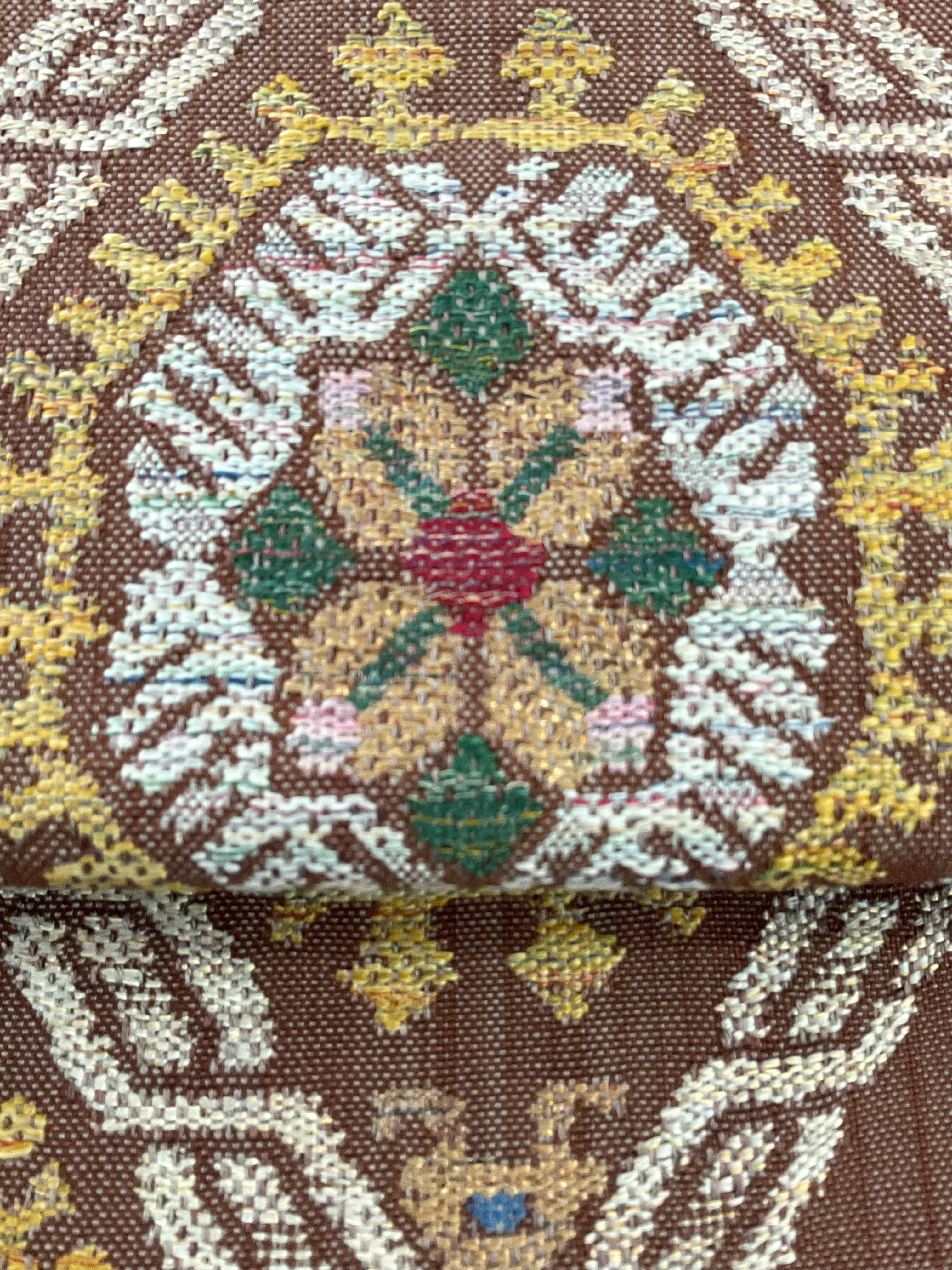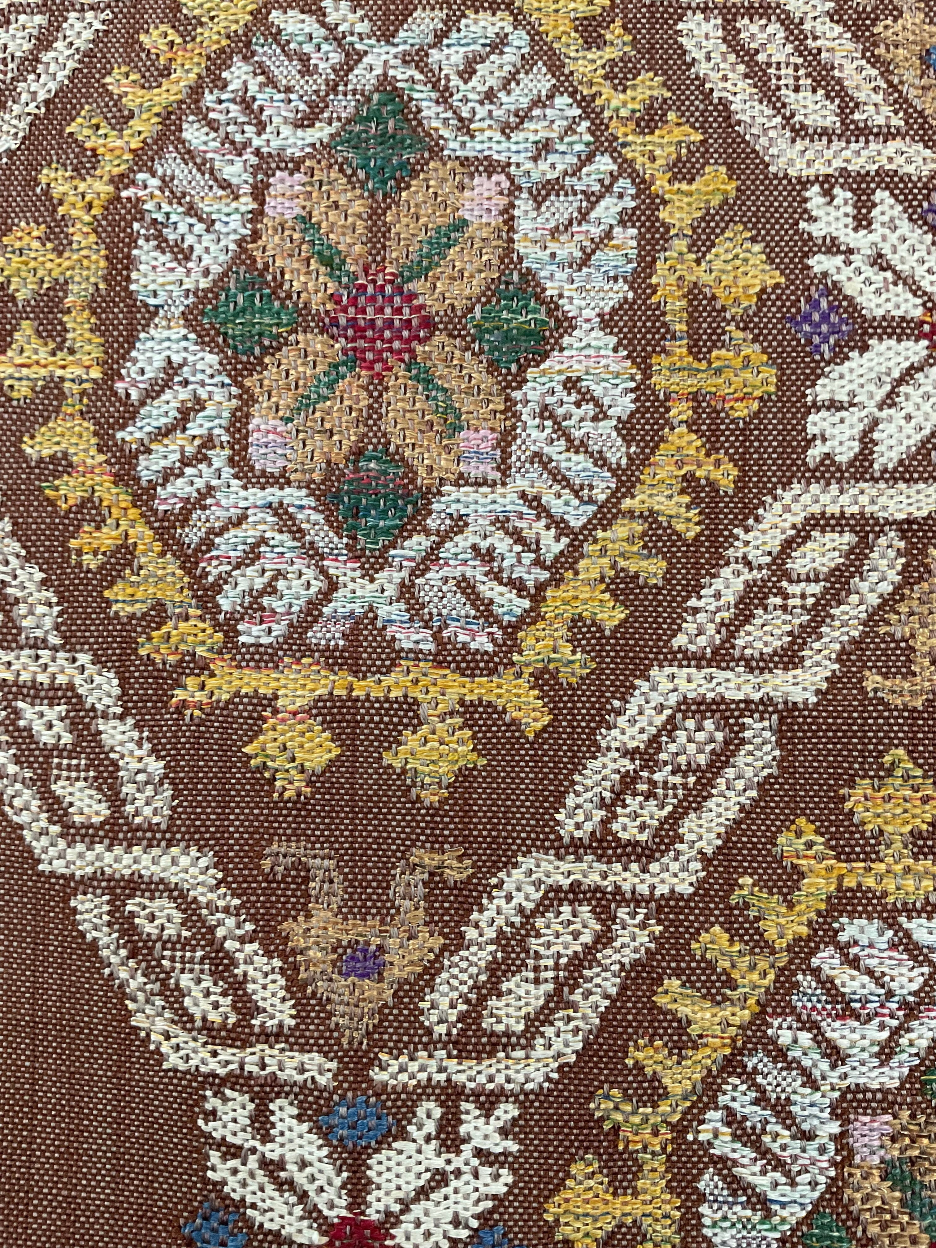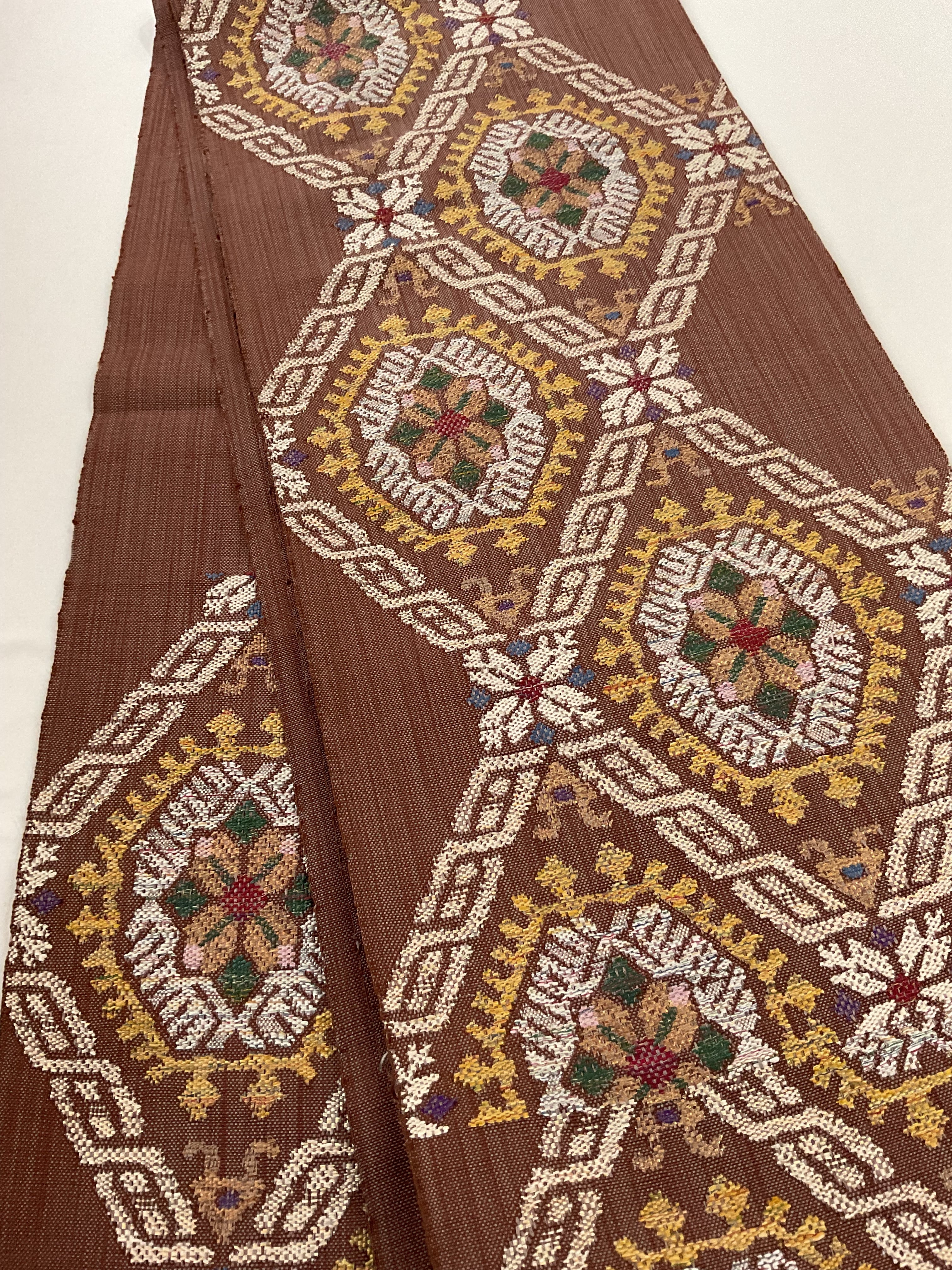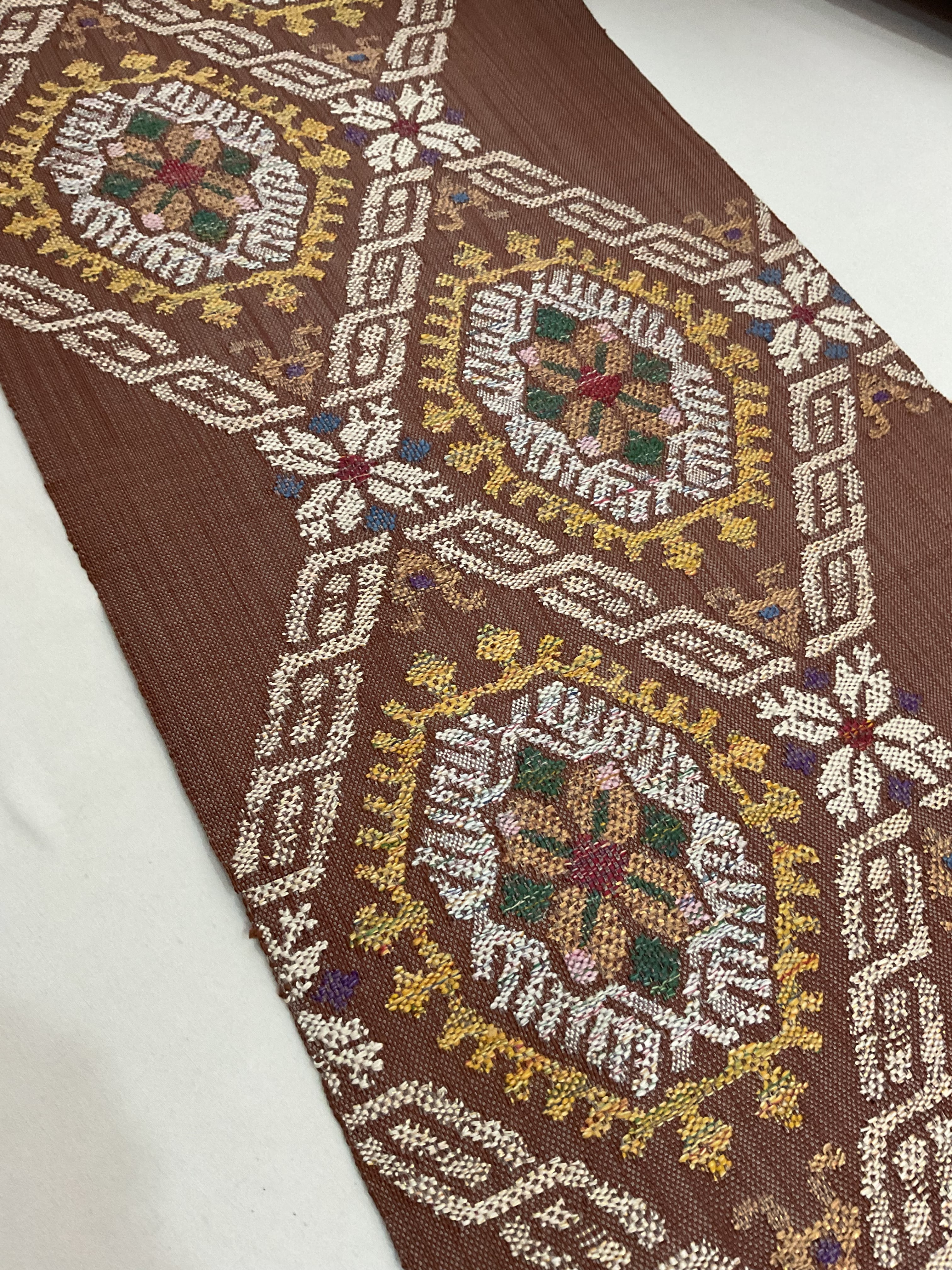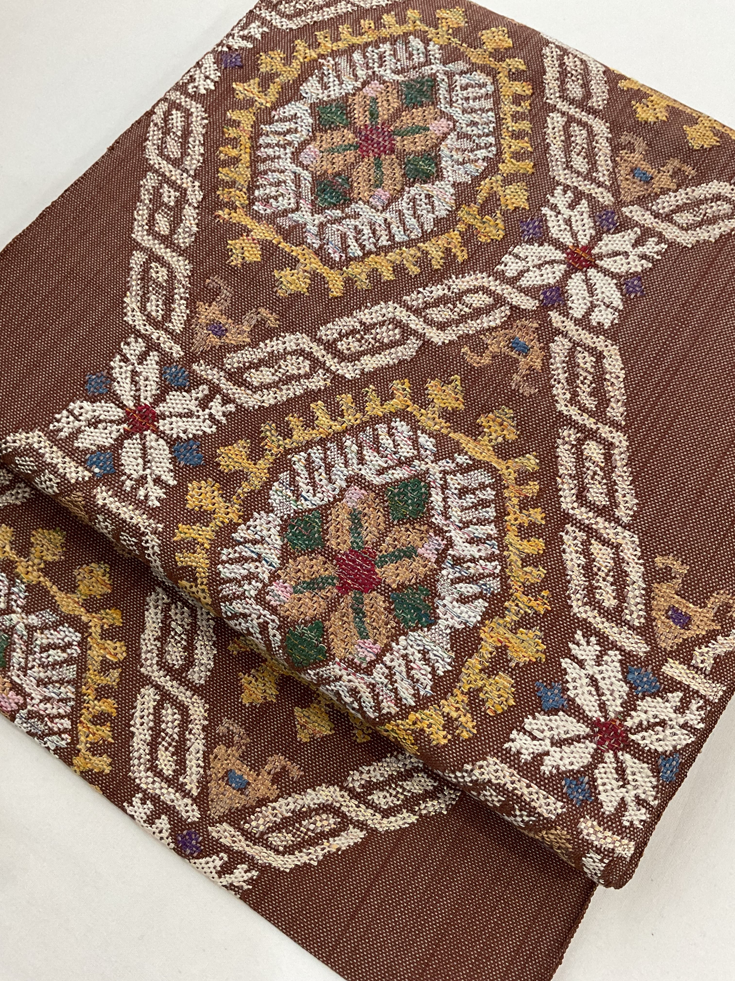普段のお洒落に活躍する紬八寸なごや帯です。カラフルな色糸をふんだんに使ってお花と幾何学文様を組み合わせた可愛らしいお柄が織り出されています。紬や小紋に合わせて気軽なお出掛け用にいかがでしょうか。