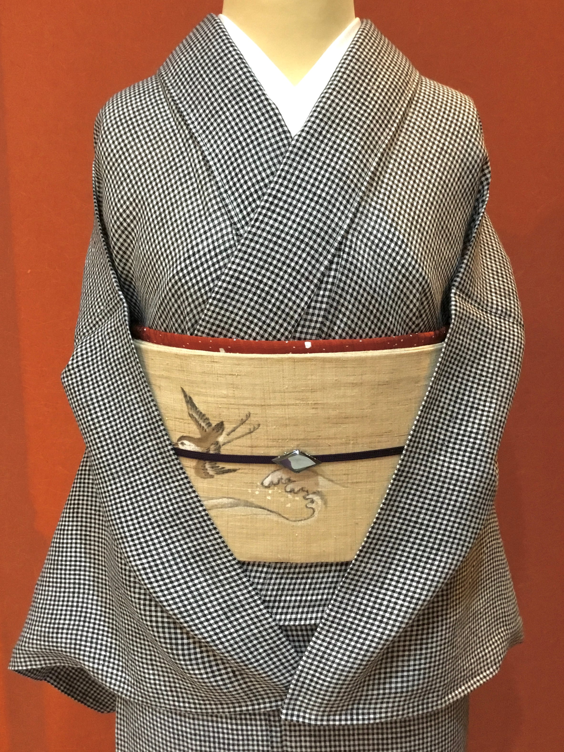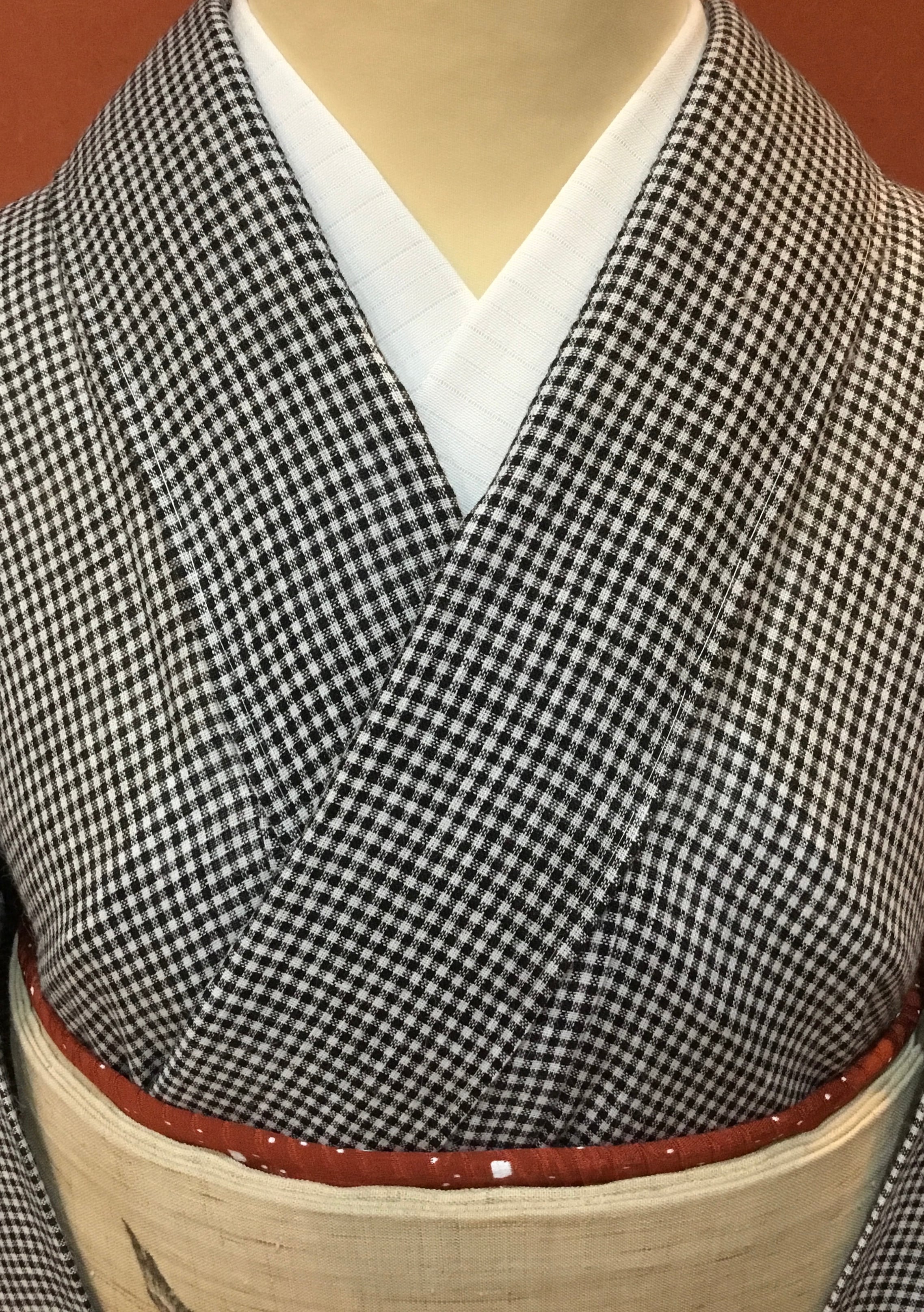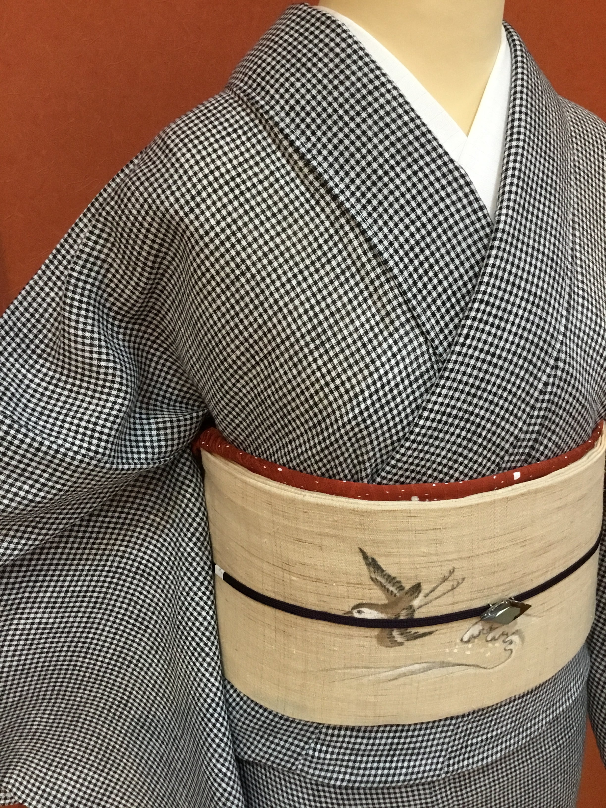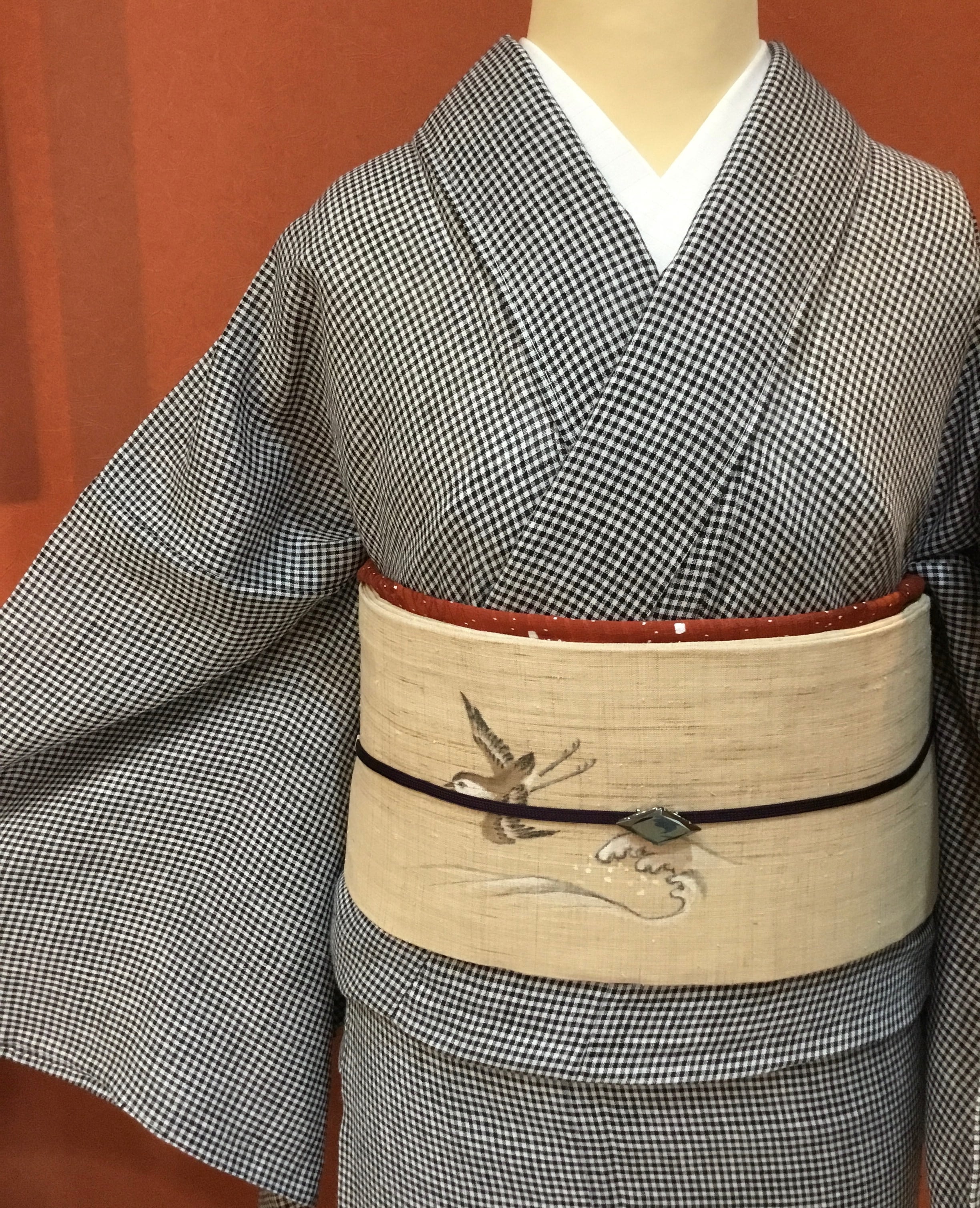 黒地にギンガムチェックのしっかりとした生地感の麻地きものです。衿裏布も麻生地が付いており、ご自宅でのお手入れが可能です。気軽にお召しいただけ、季節の変わり目や暑い季節の普段きものとして重宝する一枚です。シンプルなモノトーンのギンガムチェックなので、帯合わせしやすく、お洋服の方とご一緒のお出掛けにも馴染むカジュアル着物です。