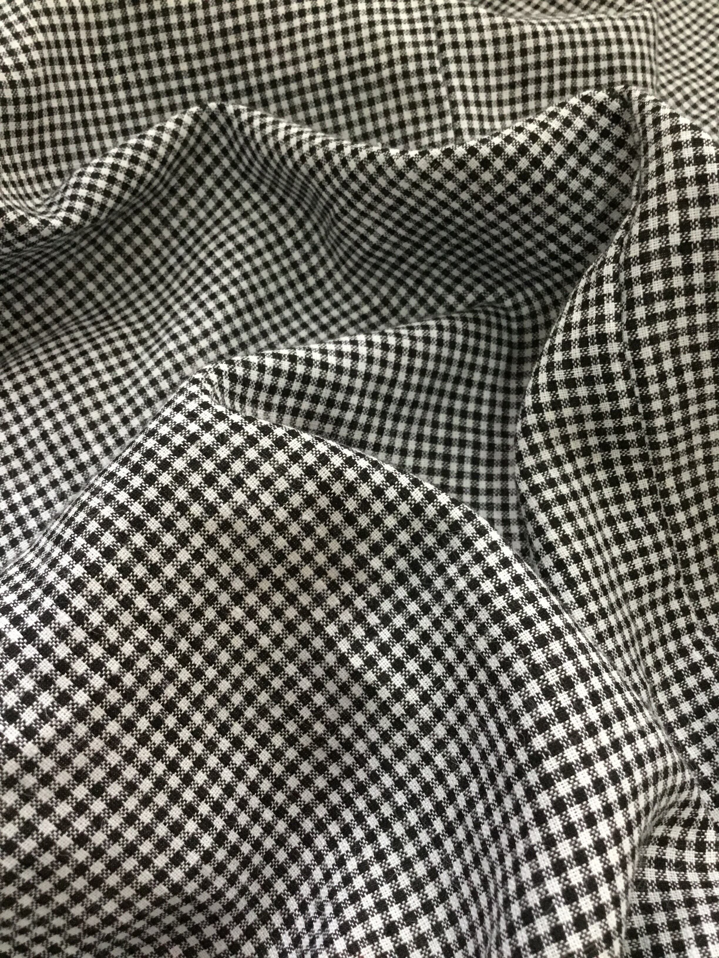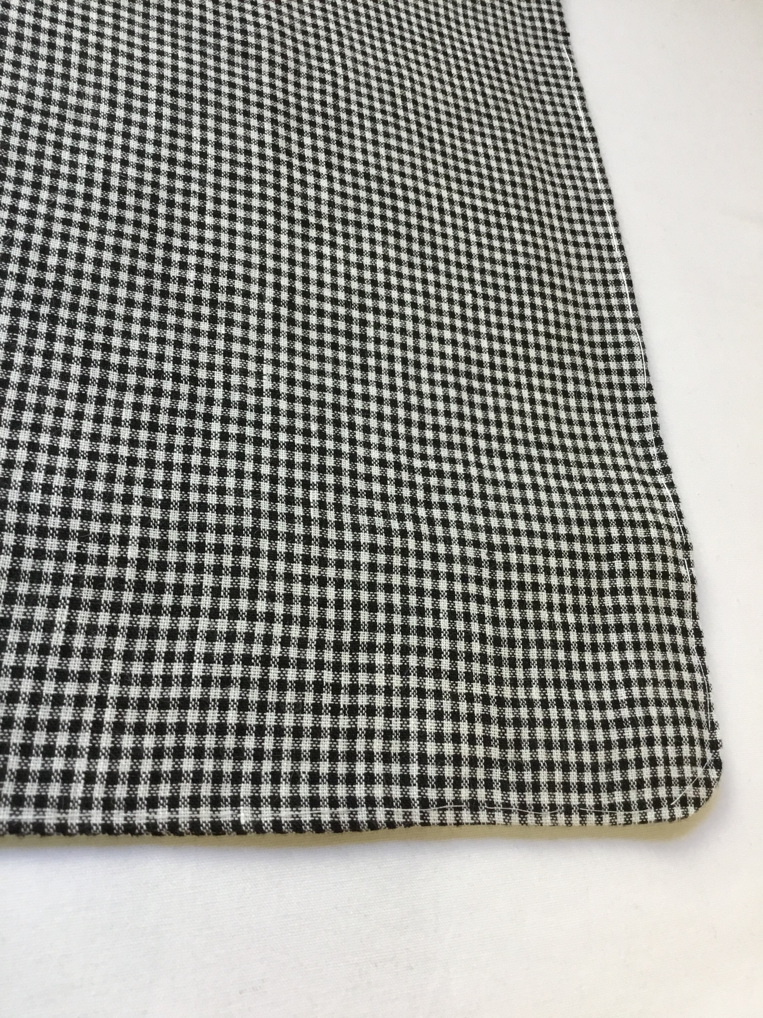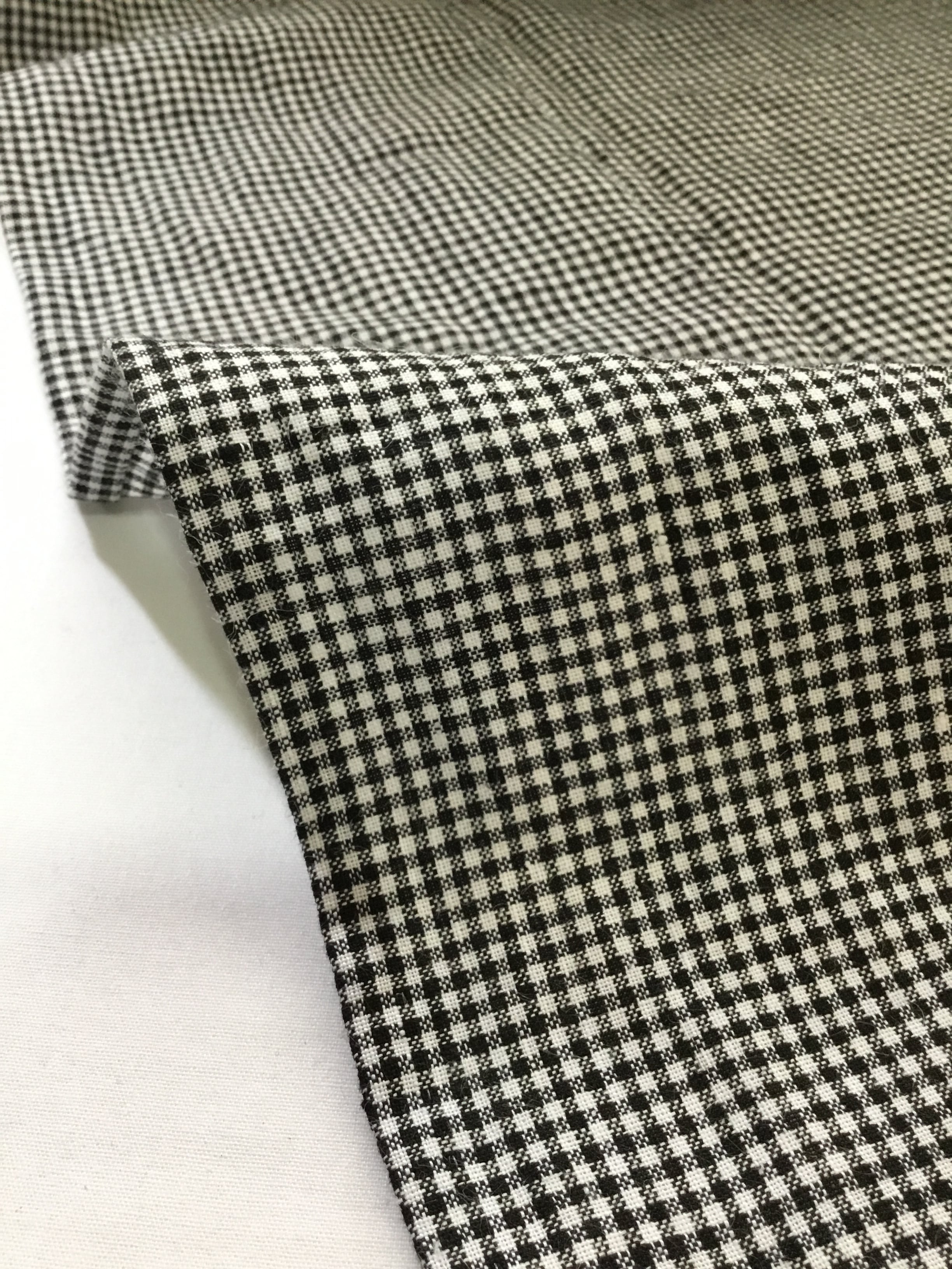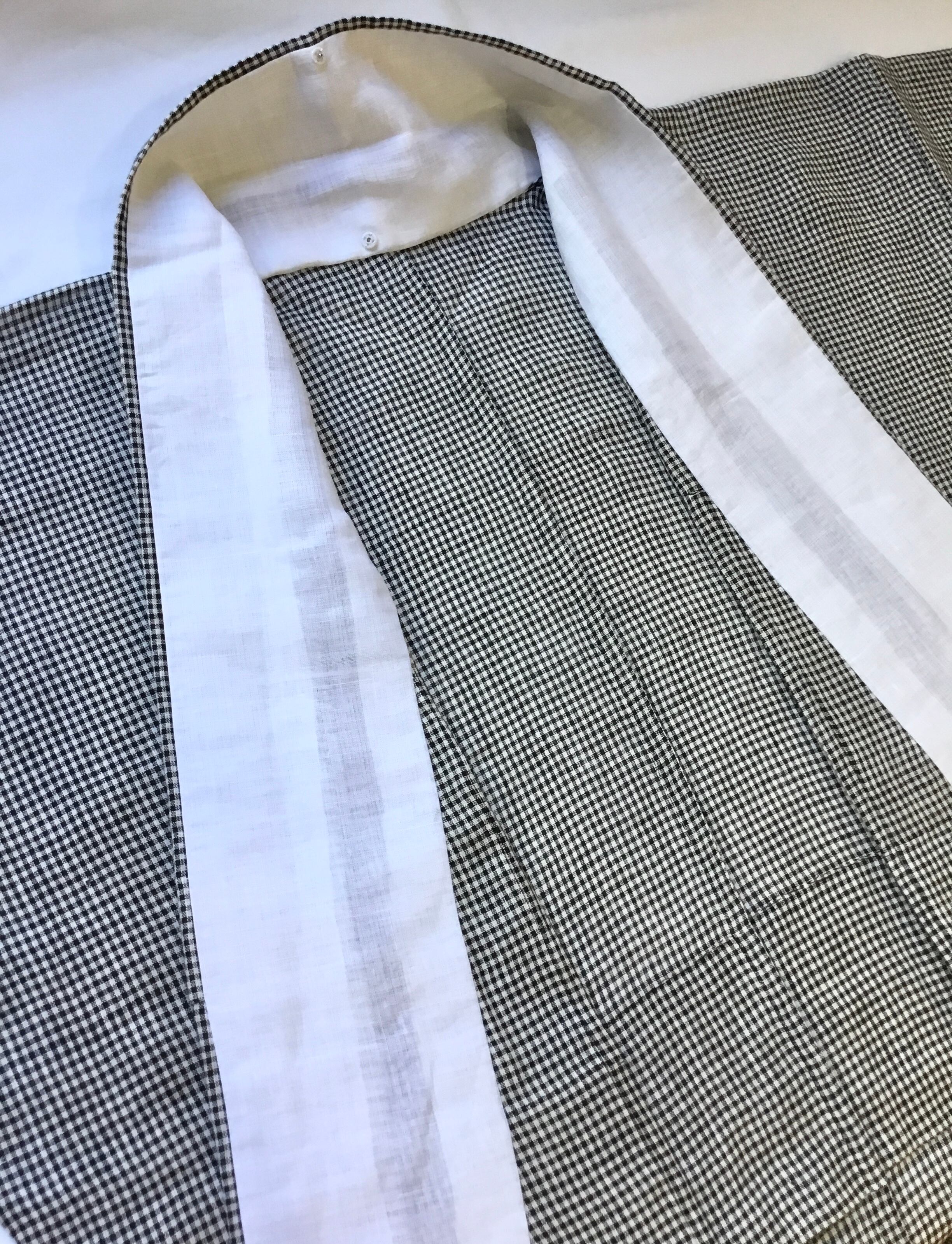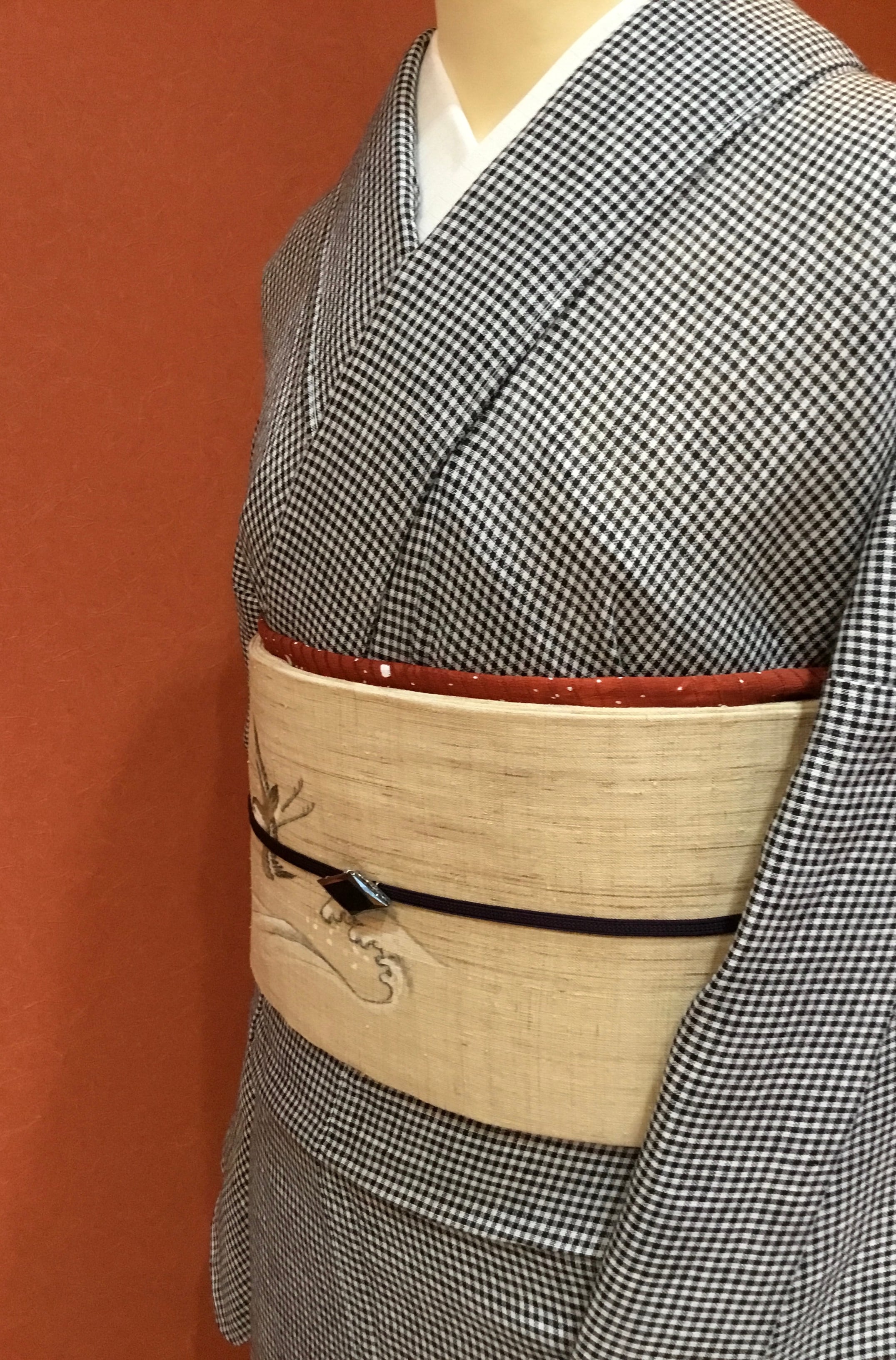 黒地にギンガムチェックのしっかりとした生地感の麻地きものです。衿裏布も麻生地が付いており、ご自宅でのお手入れが可能です。気軽にお召しいただけ、季節の変わり目や暑い季節の普段きものとして重宝する一枚です。シンプルなモノトーンのギンガムチェックなので、帯合わせしやすく、お洋服の方とご一緒のお出掛けにも馴染むカジュアル着物です。
