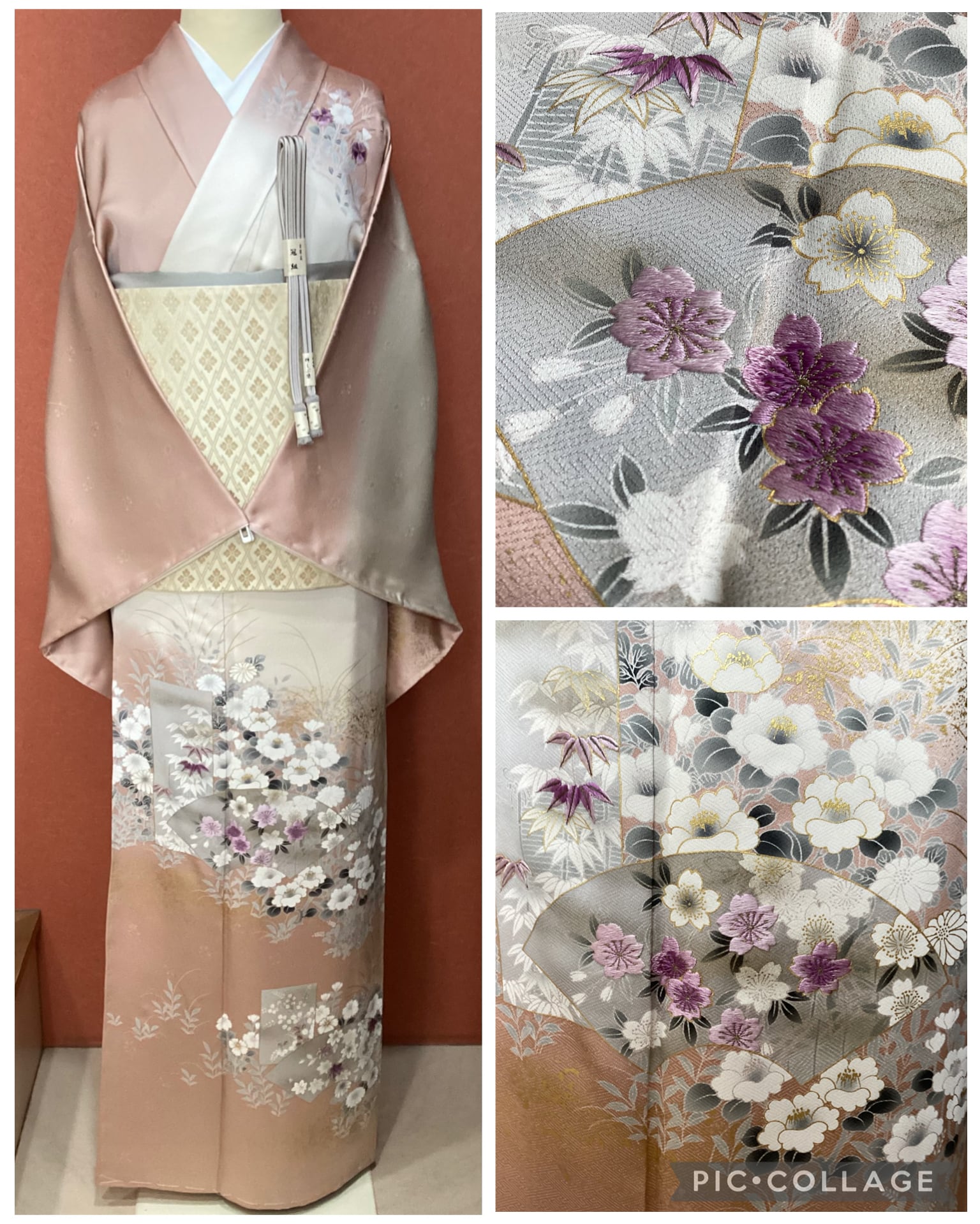 クリーム色×長春色暈し色紙と地紙に金彩四季花文【帝王紫】刺繍訪問着(しつけ付き)260310-1