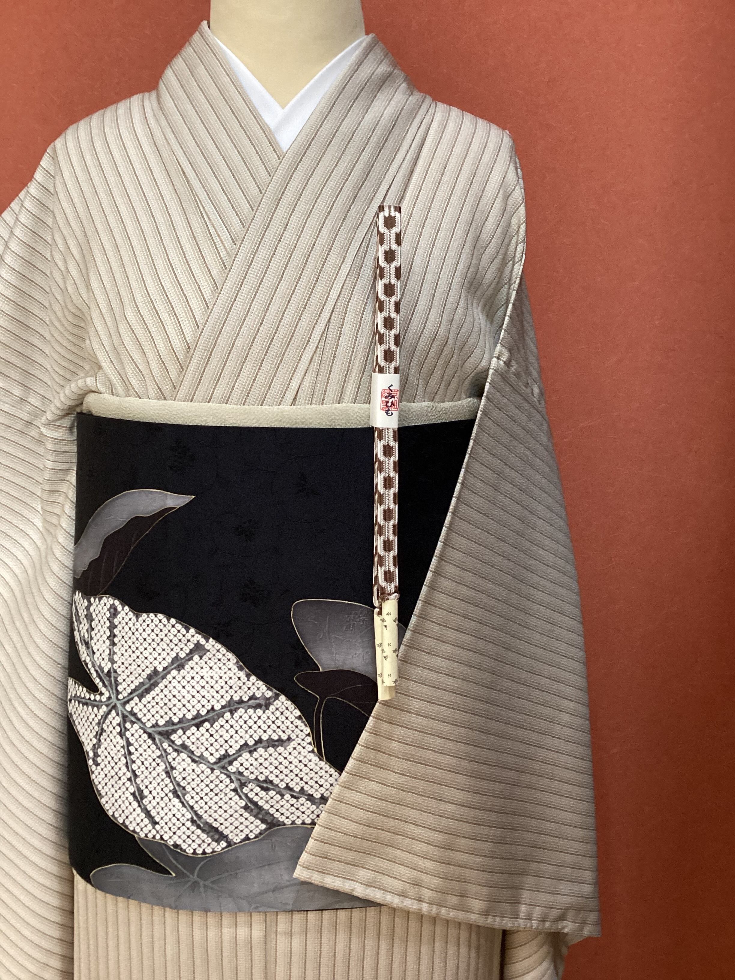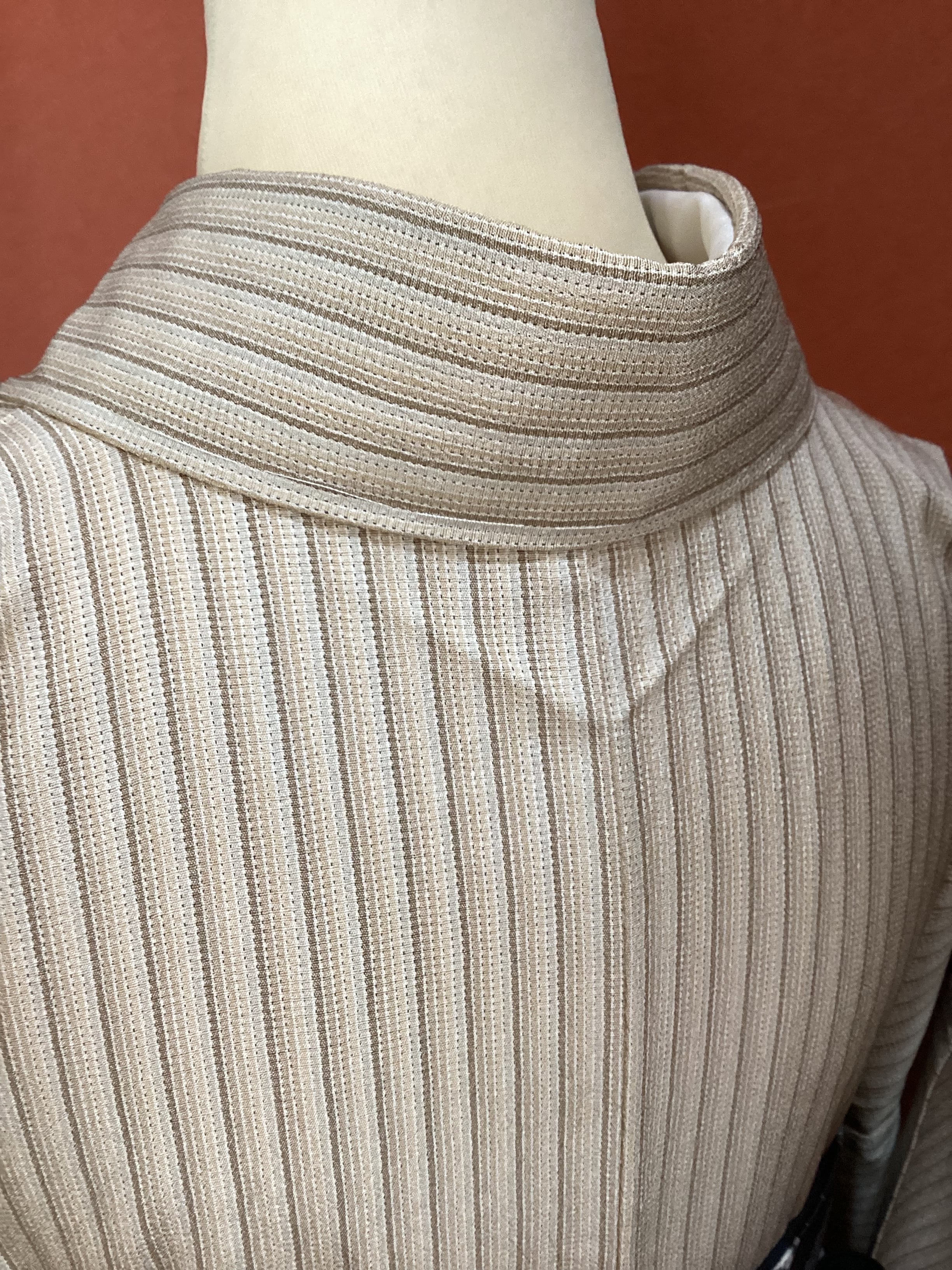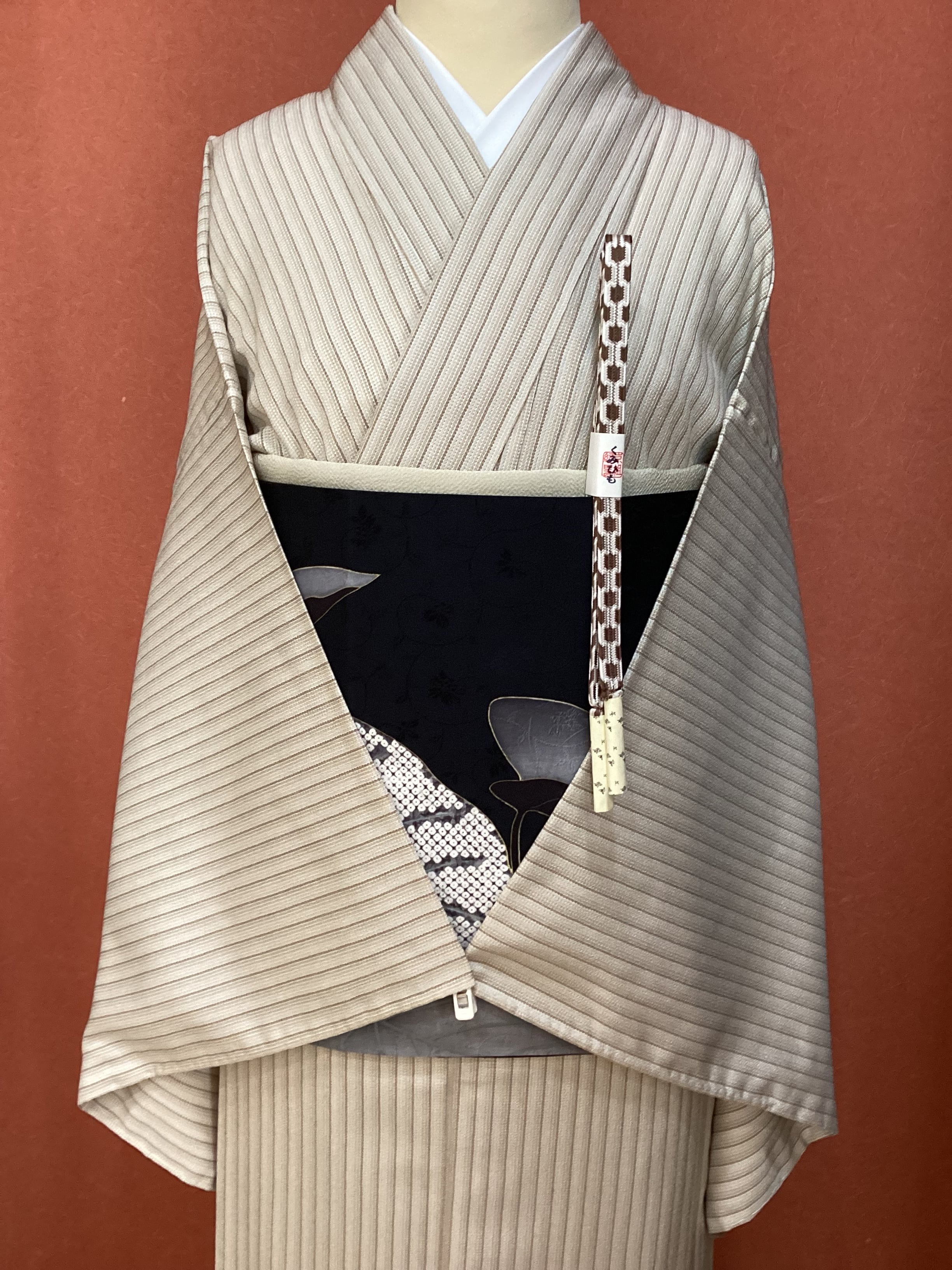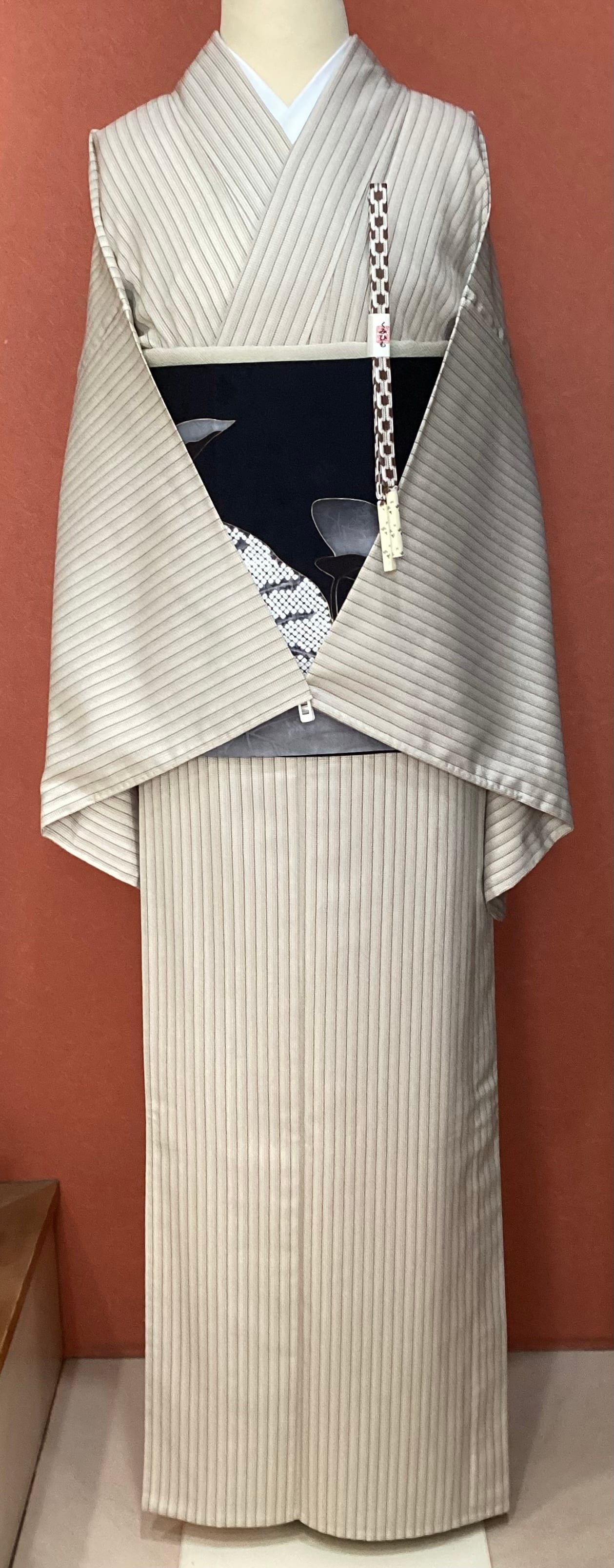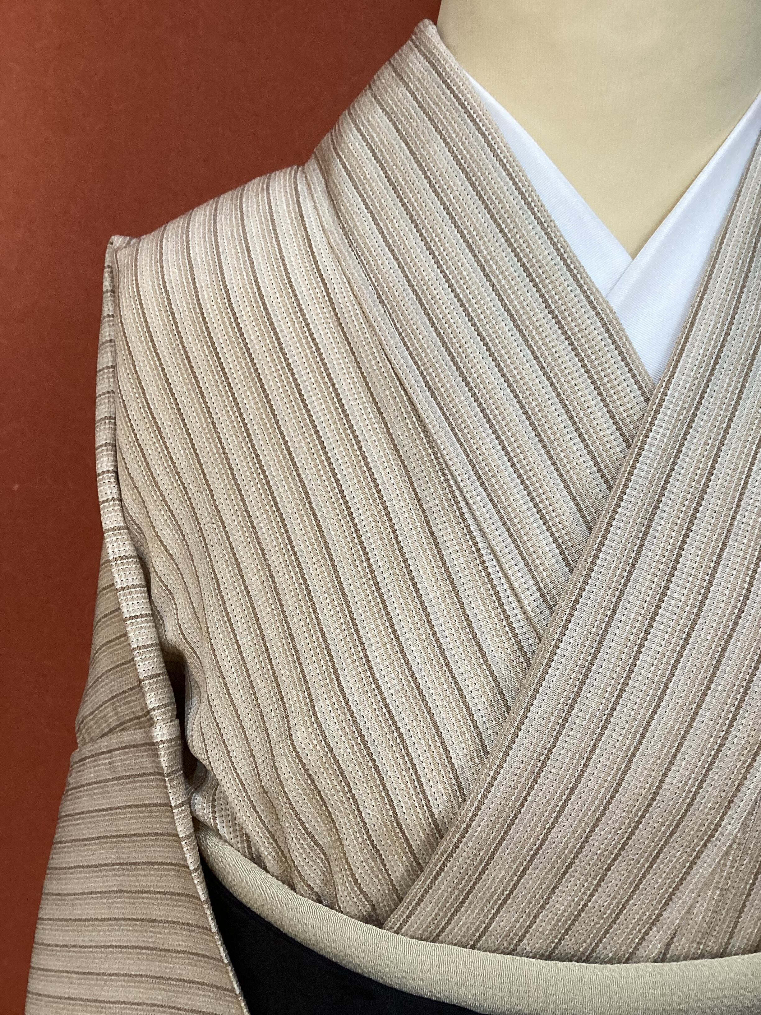 ベージュから茶色へのグラデーションの縦縞のベーシックなデザインで、着回しの効くお単衣のご紹介です。塩沢紬に似た凹凸のある肌に張り付かない軽やかな織地です。温暖化により、年々お単衣への移行期間が早まっております。暑い季節に備えていかがでしょうか。茶系のお色味なので、秋単衣としても活躍してくれる小紋です。