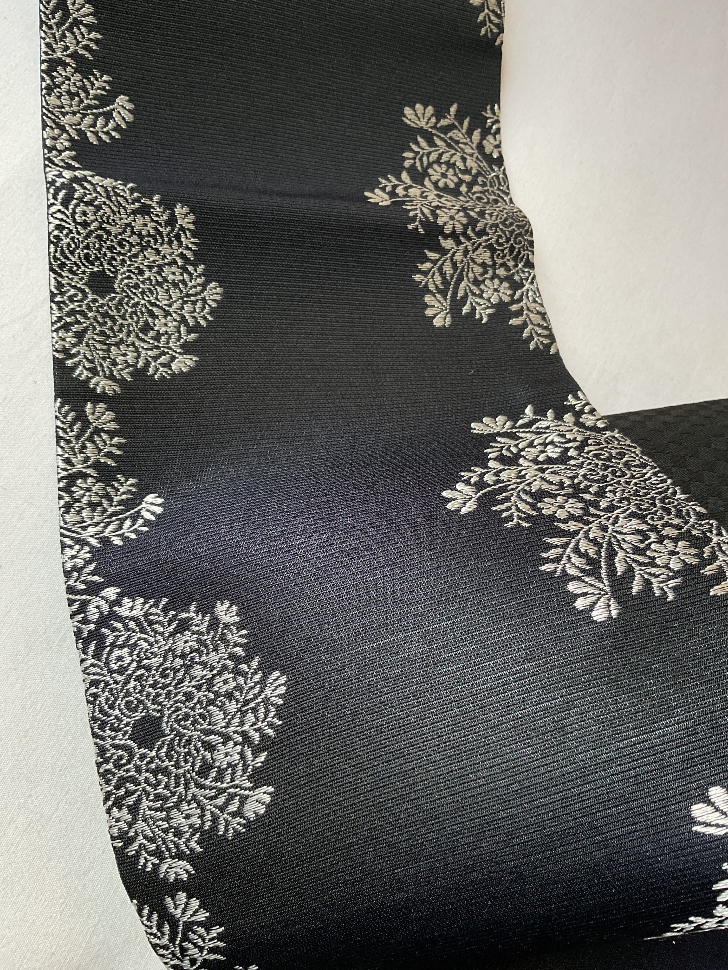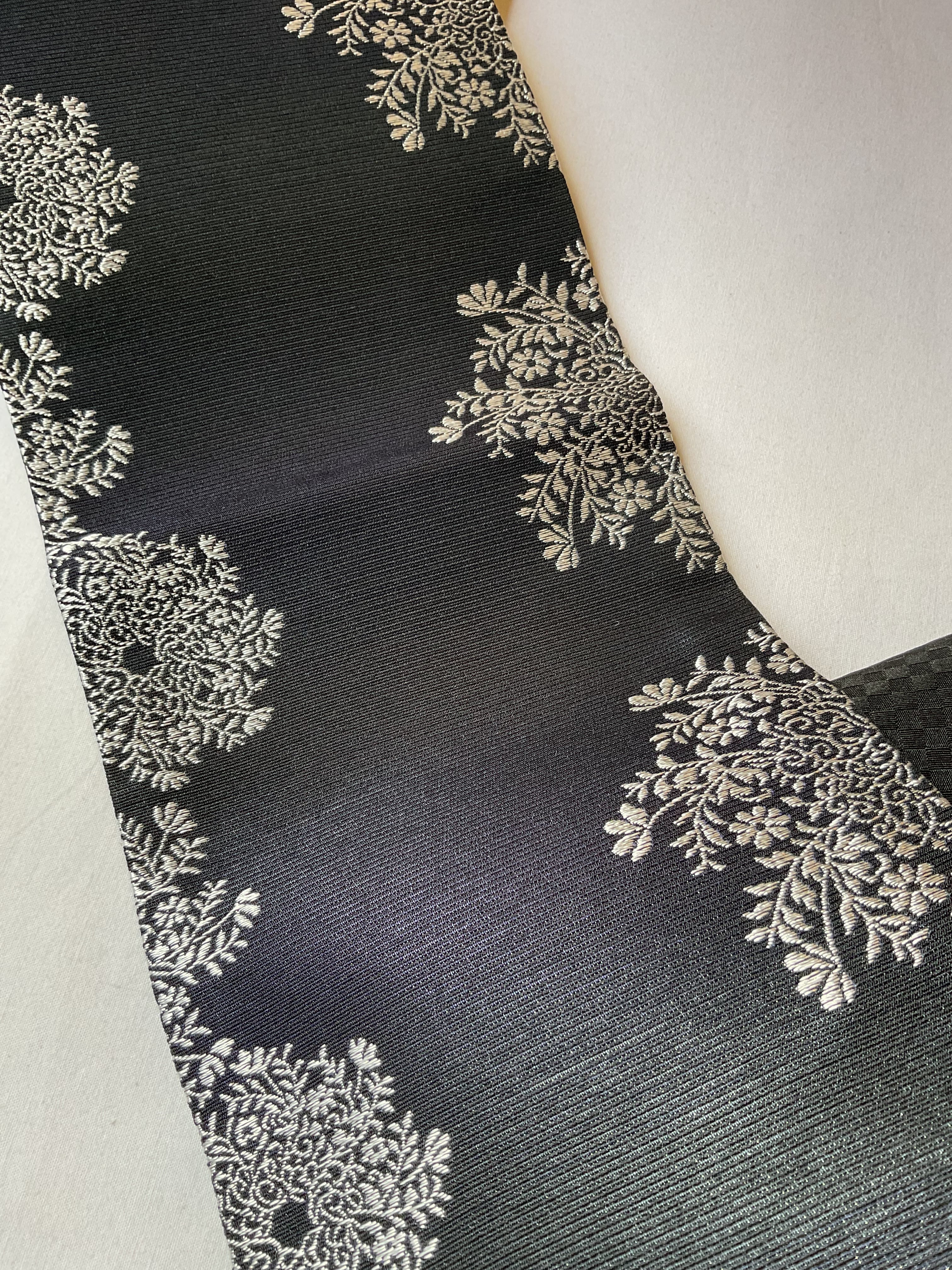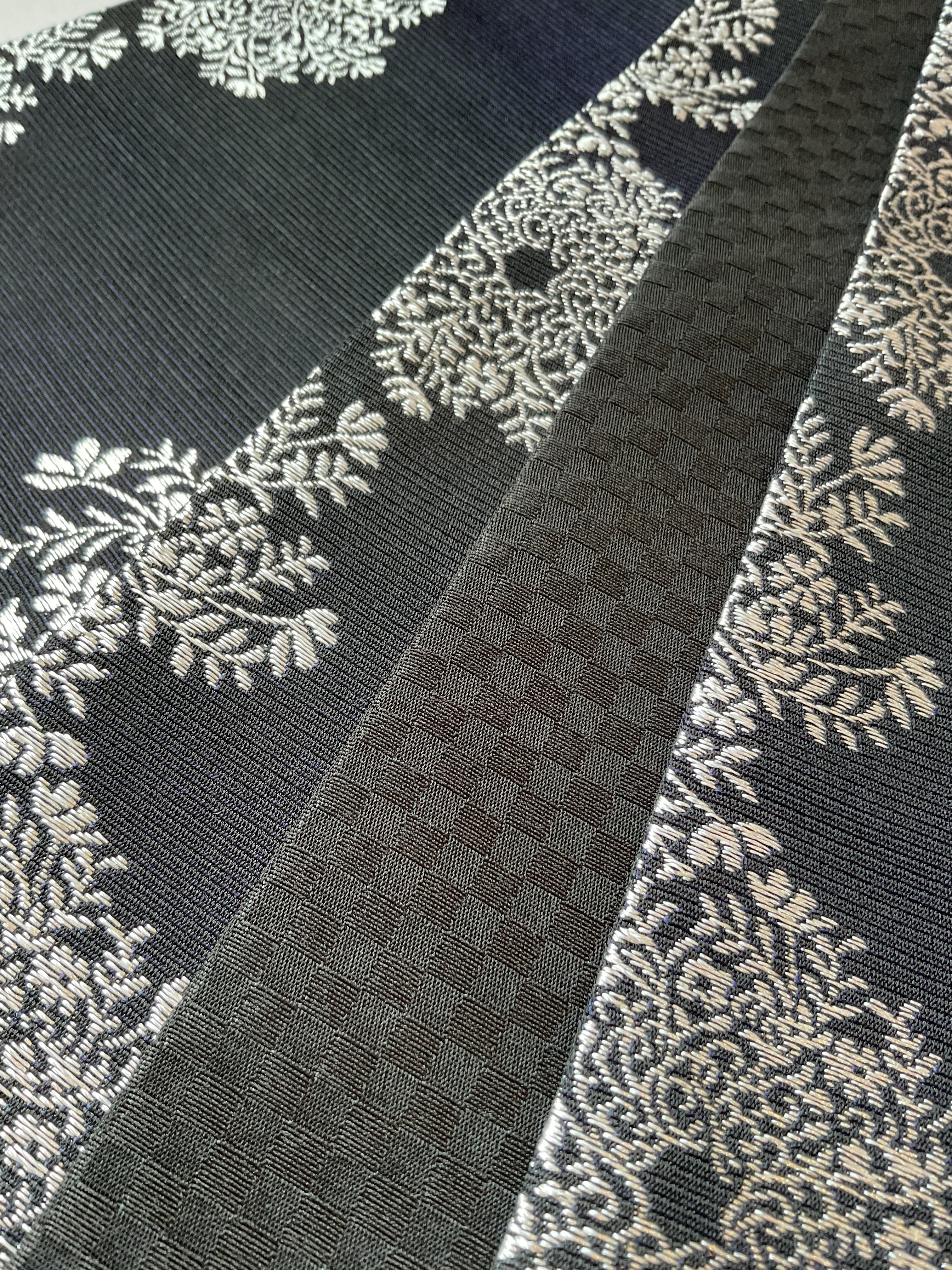 一見すると両面共に黒地なのですが、表の銀花文のほうは、光の当たり方によりグリーンから紫っぽい玉虫色のような色味を感じます。裏面は細かい市松文の地紋になっています。
