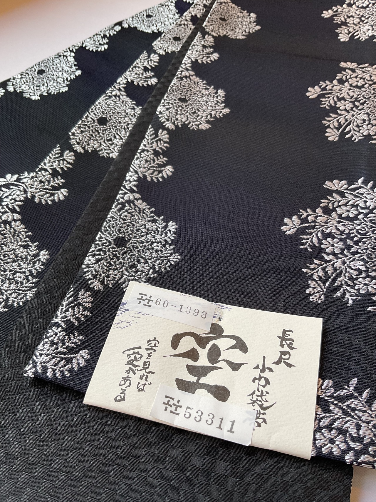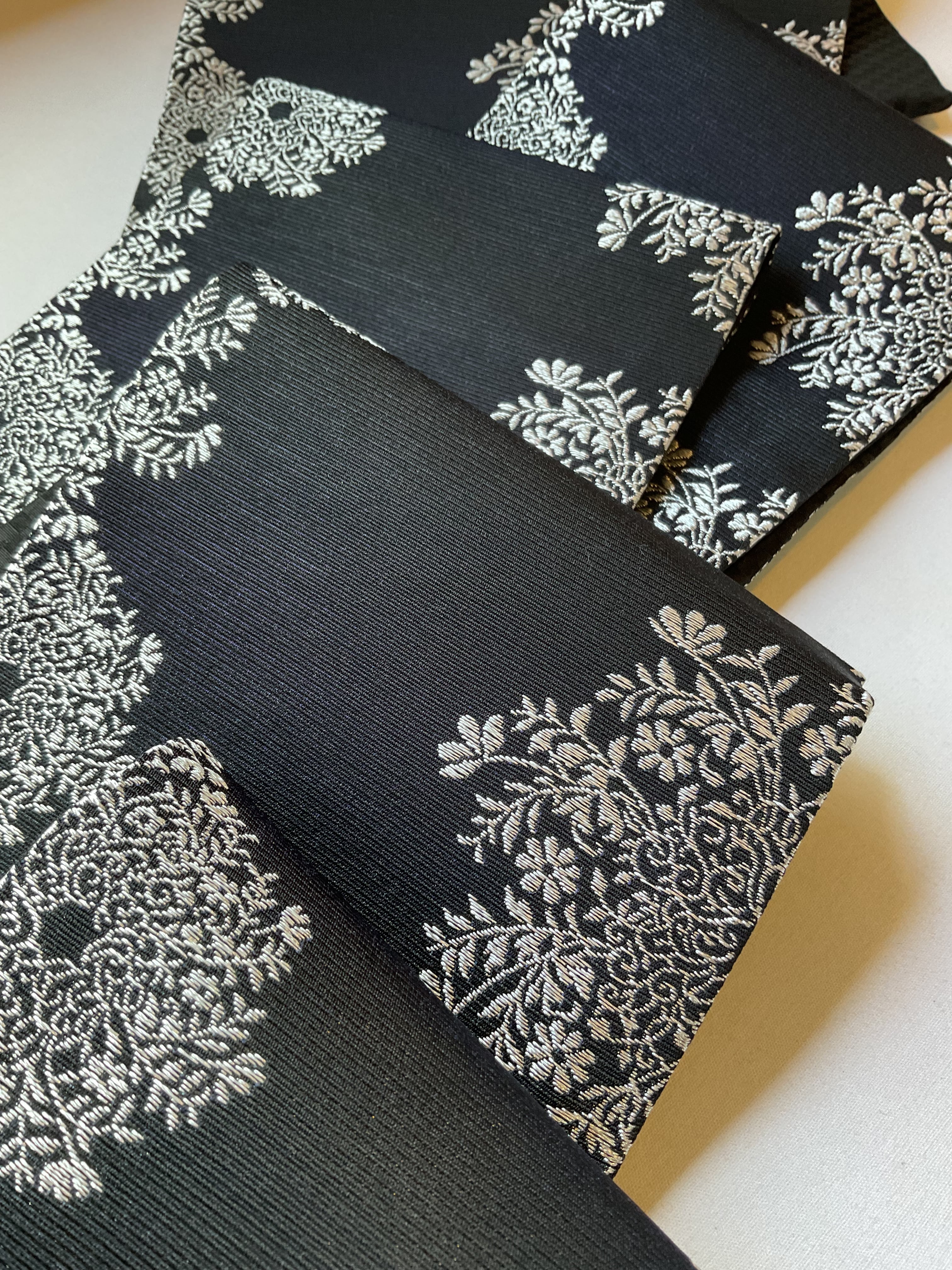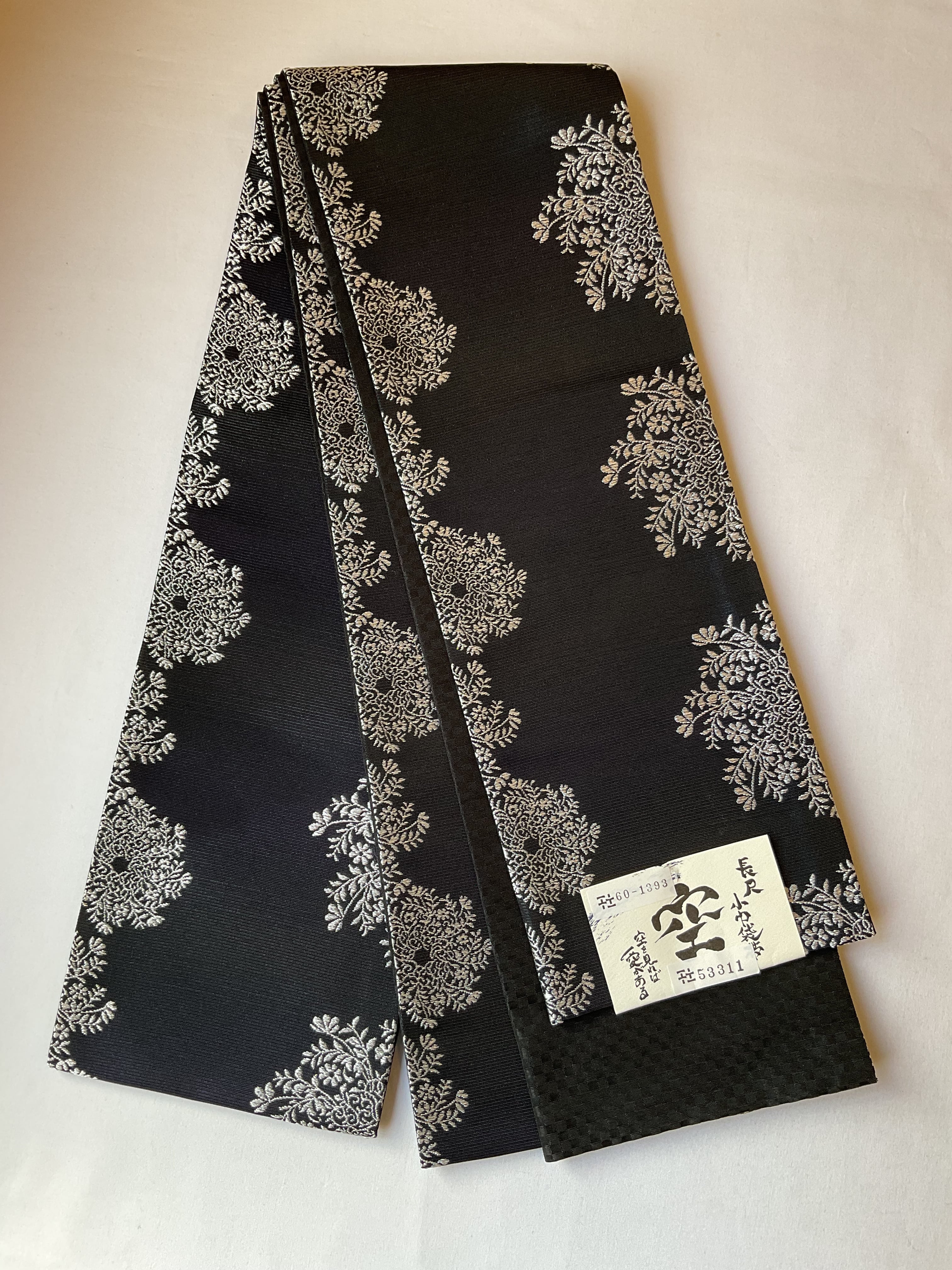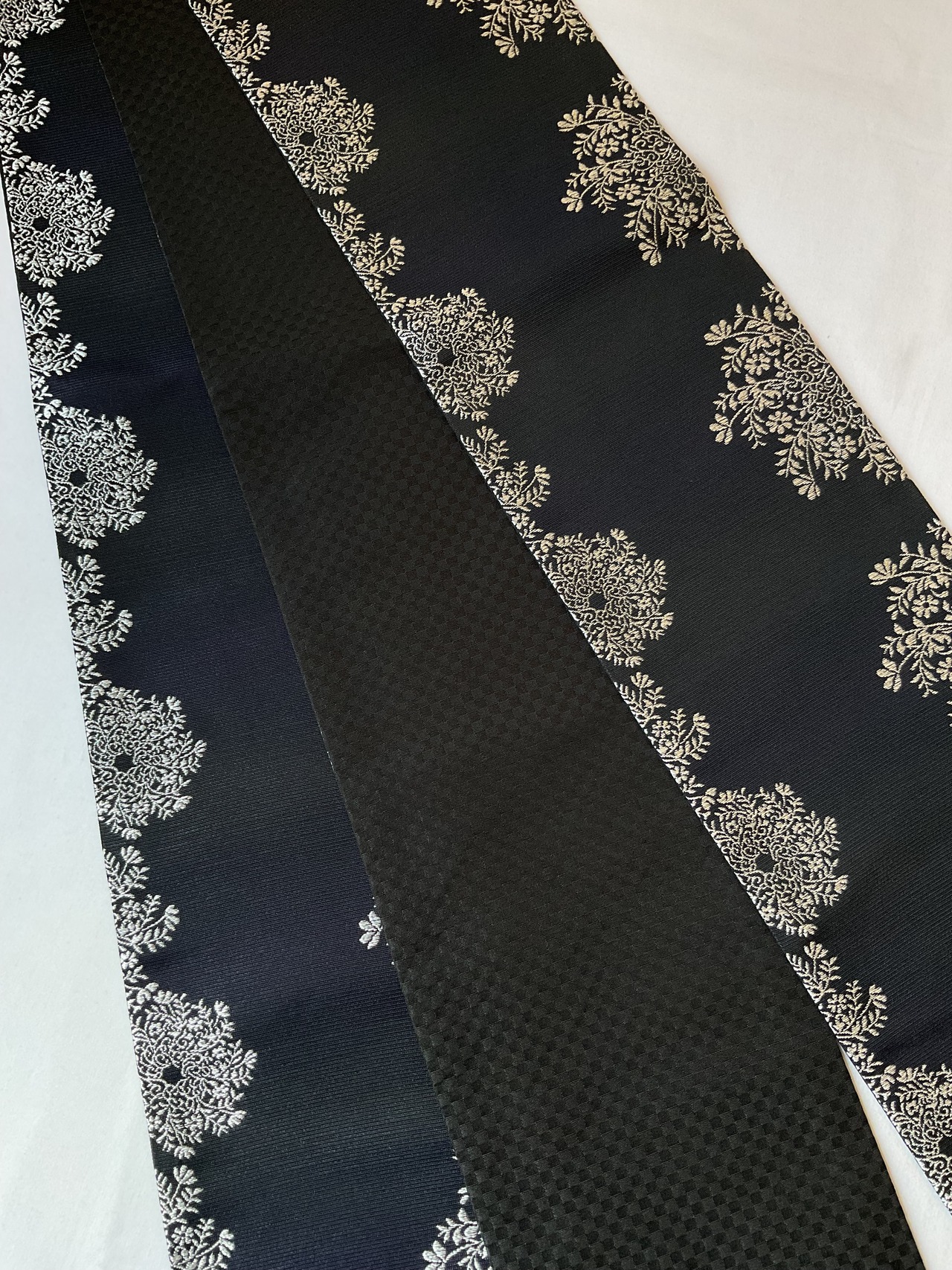 一見すると両面共に黒地なのですが、表の銀花文のほうは、光の当たり方によりグリーンから紫っぽい玉虫色のような色味を感じます。裏面は細かい市松文の地紋になっています。