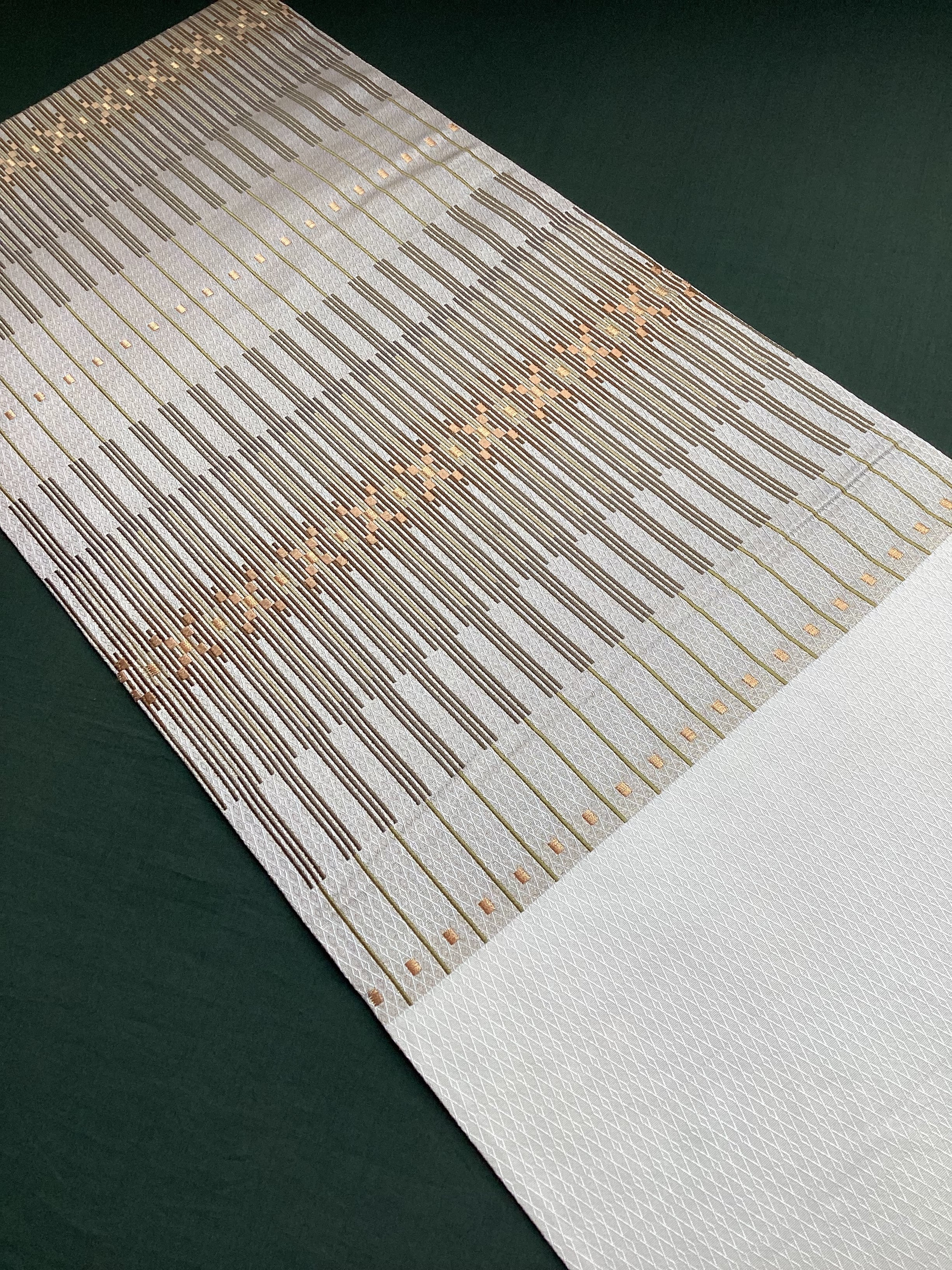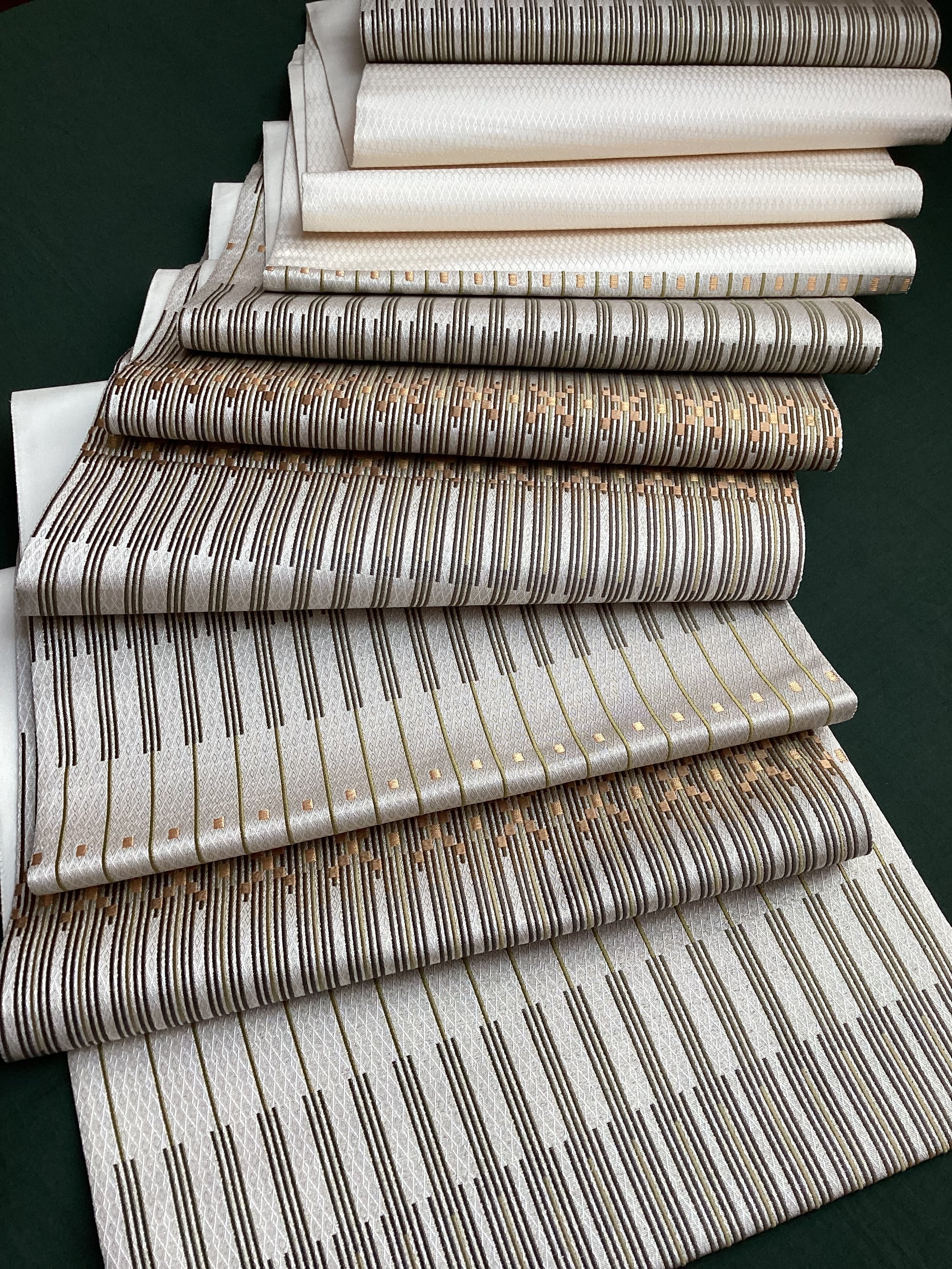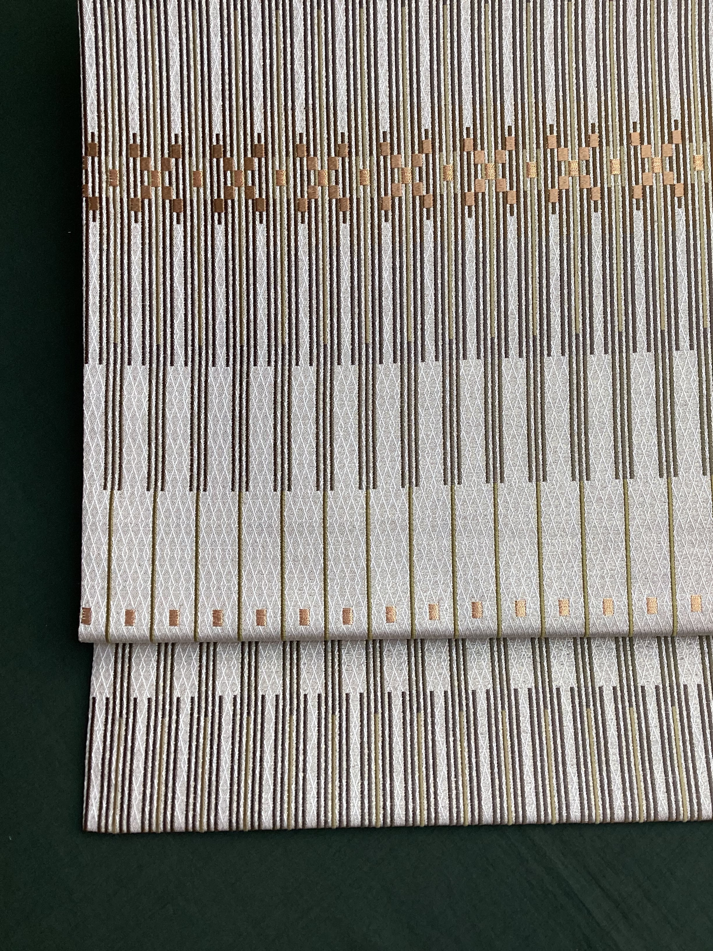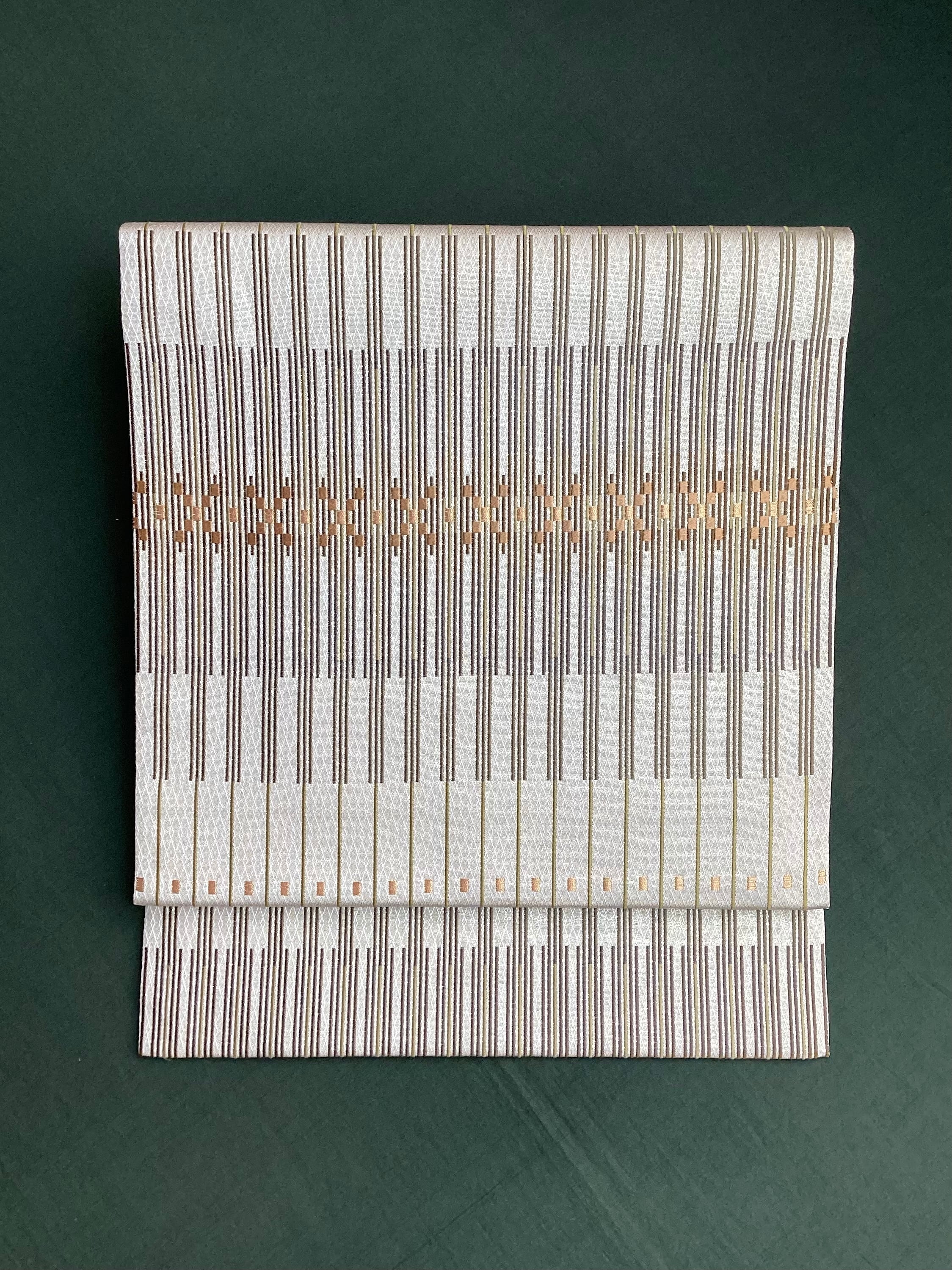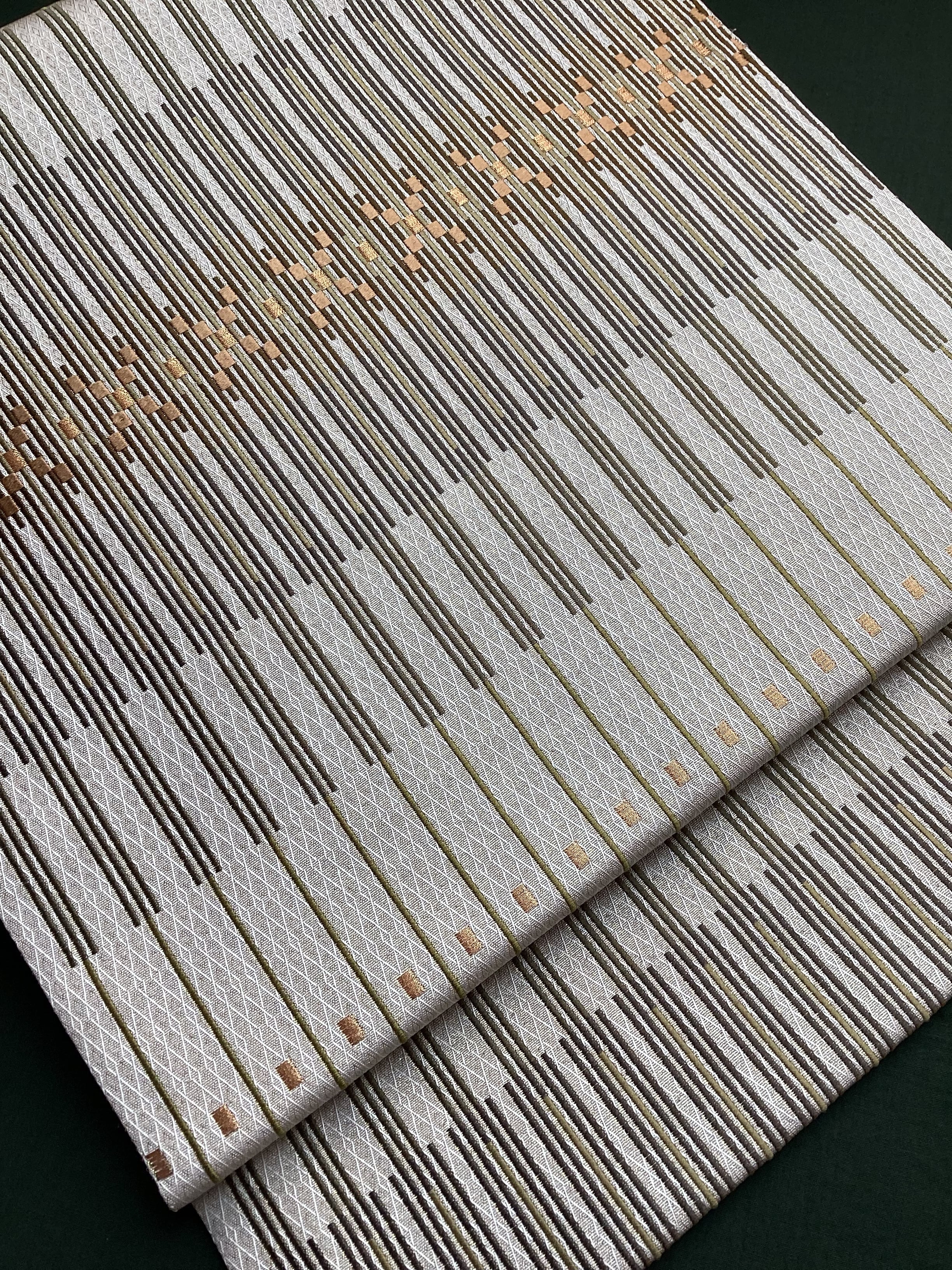 艶と煌めき感のあるシャンパンベージュ地に馴染むオリーブや茶系のお色目で変化のある縦縞文様が織りなされた袋帯です。緻密な織地が美しく、派手過ぎない適度な煌めきがあるので、セミフォーマルな装いにも締めていただけます。また、紬などに合わせていただきカジュアルなシーンをモダンにまとめる、使い勝手の良いお品です。適度な張りがあり締めやすく、美しいオタイコ姿が叶います。