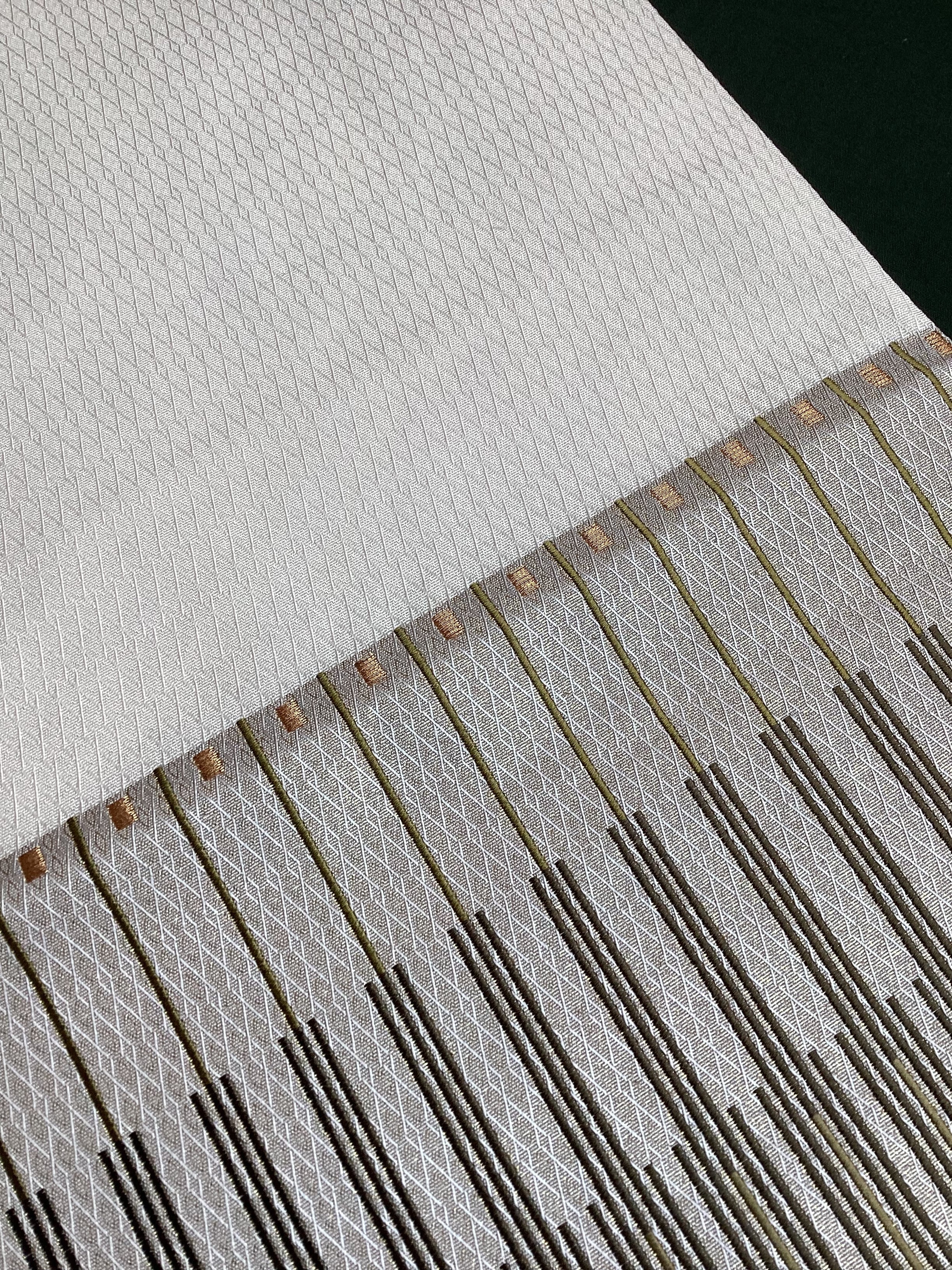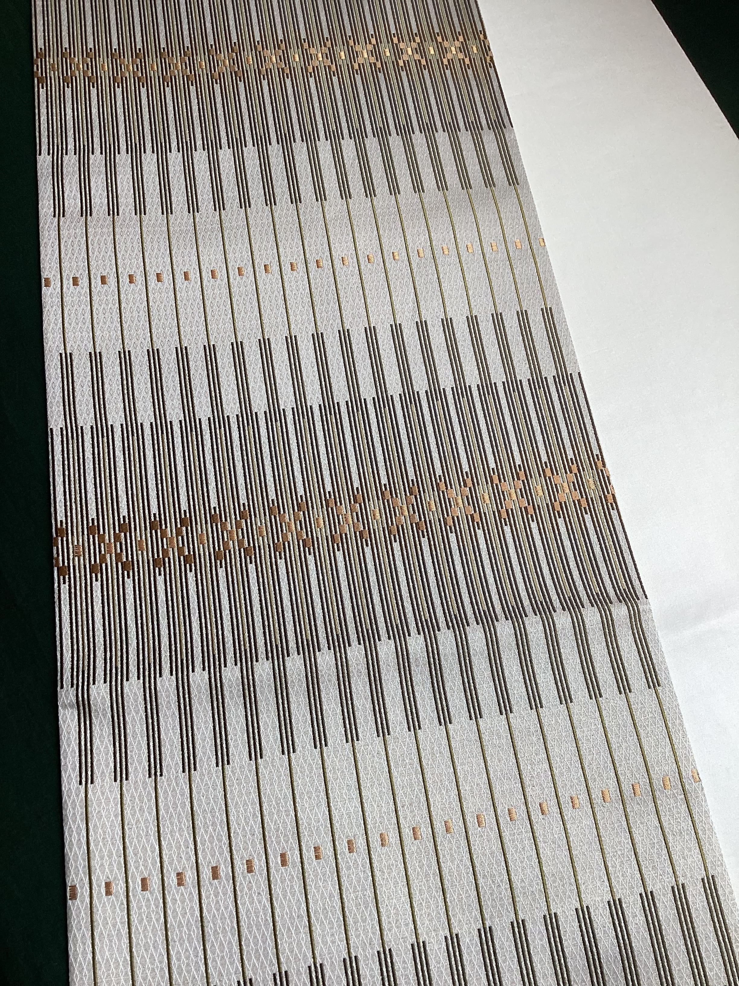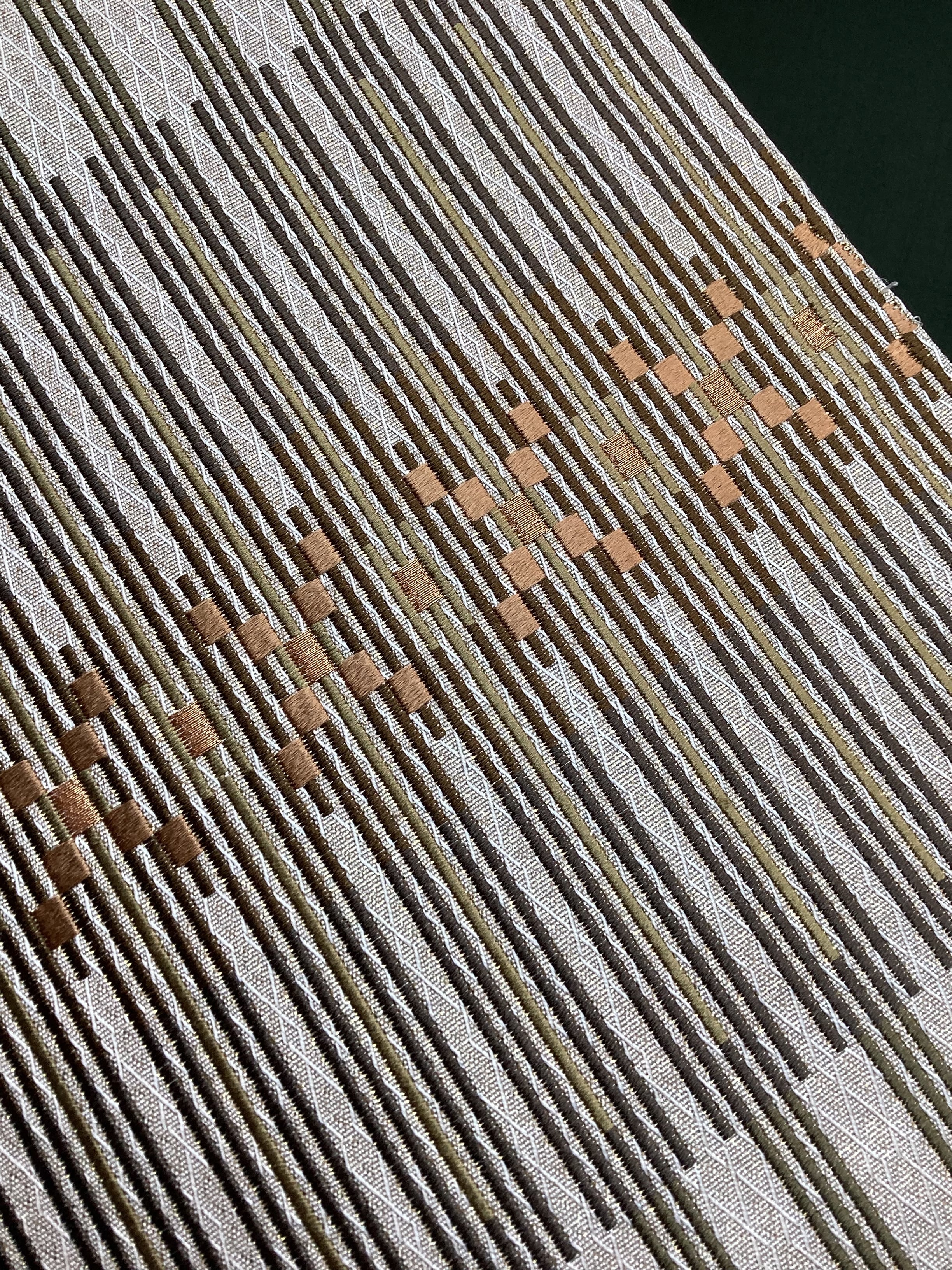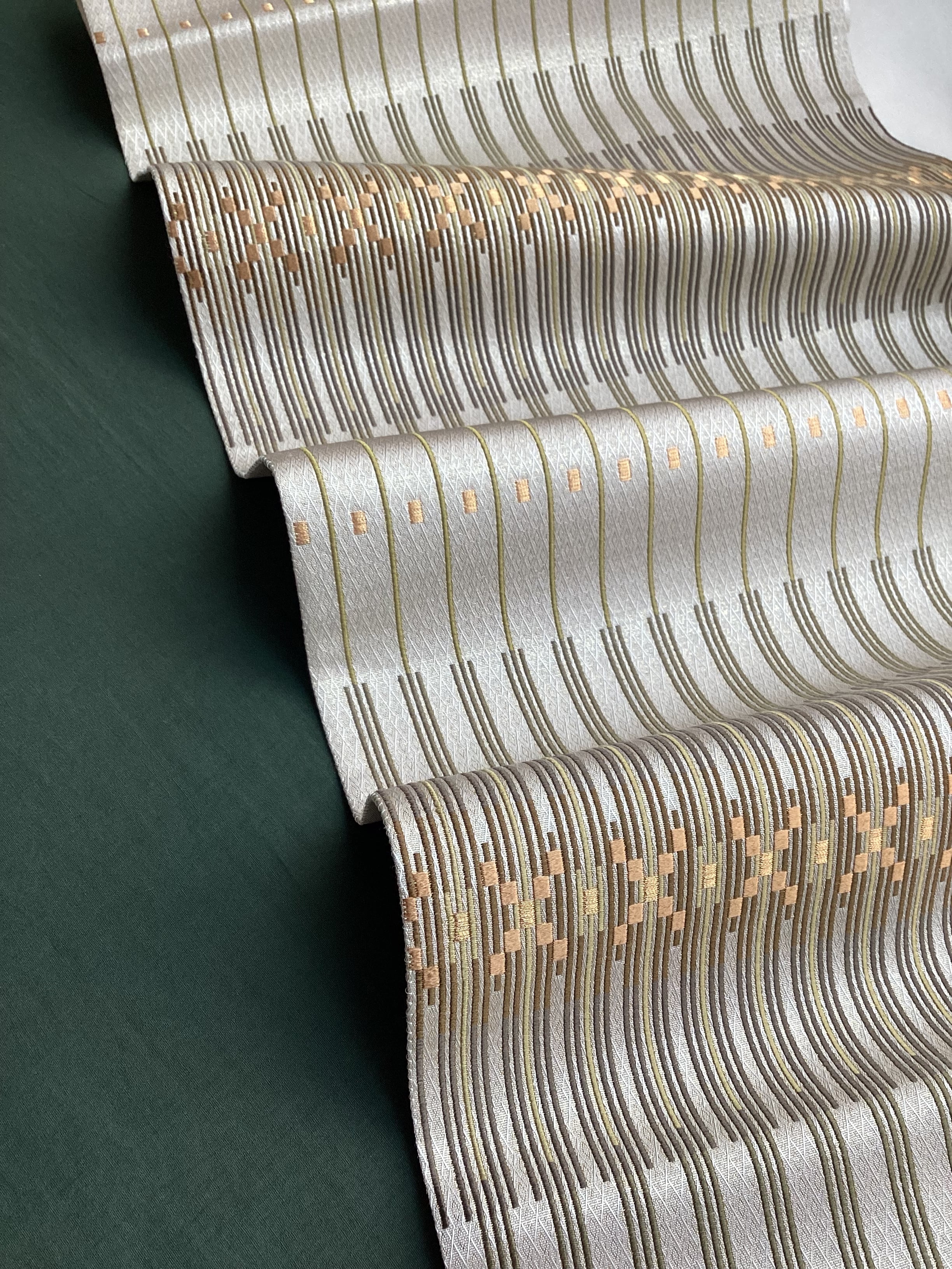 艶と煌めき感のあるシャンパンベージュ地に馴染むオリーブや茶系のお色目で変化のある縦縞文様が織りなされた袋帯です。緻密な織地が美しく、派手過ぎない適度な煌めきがあるので、セミフォーマルな装いにも締めていただけます。また、紬などに合わせていただきカジュアルなシーンをモダンにまとめる、使い勝手の良いお品です。適度な張りがあり締めやすく、美しいオタイコ姿が叶います。