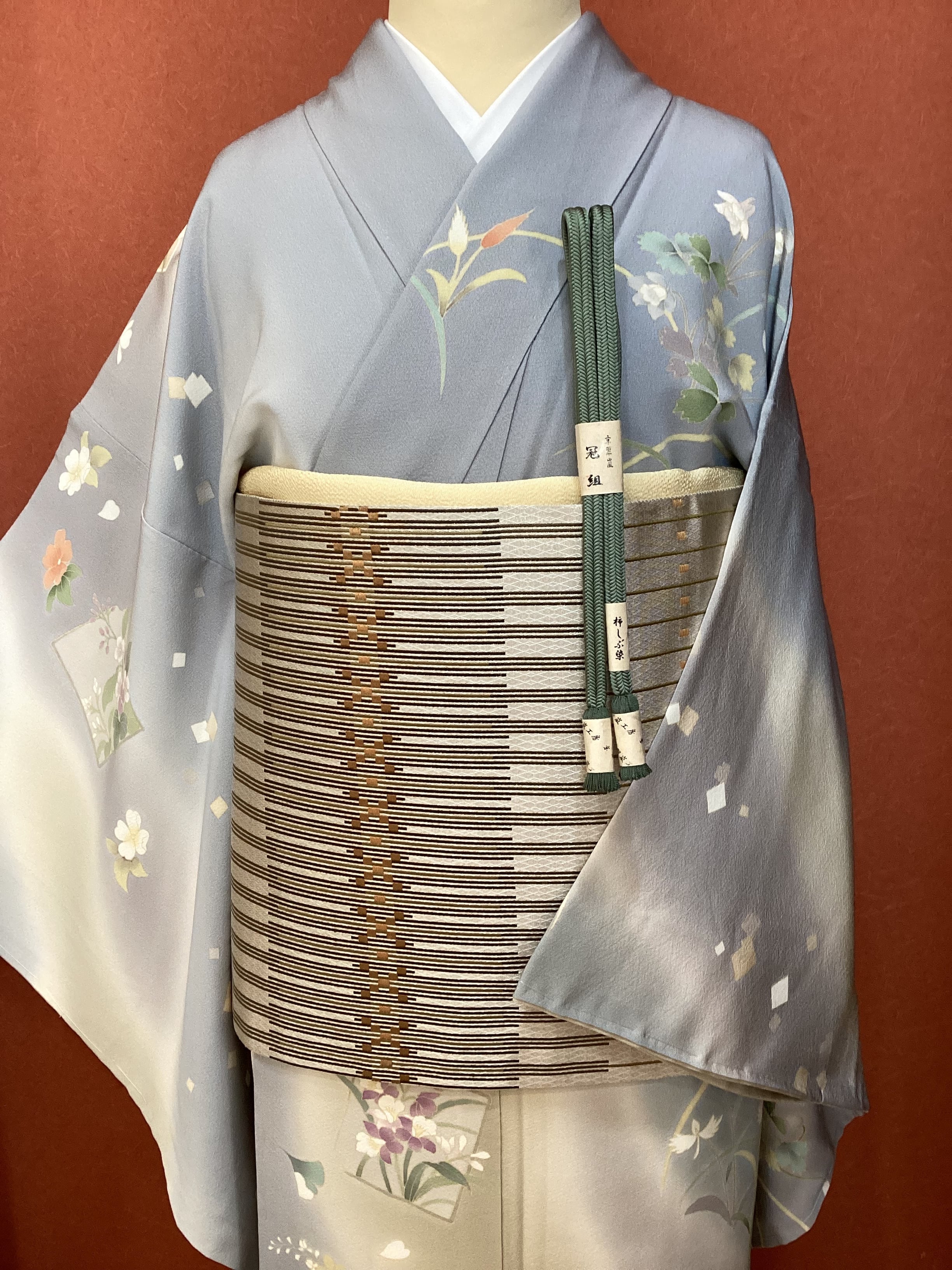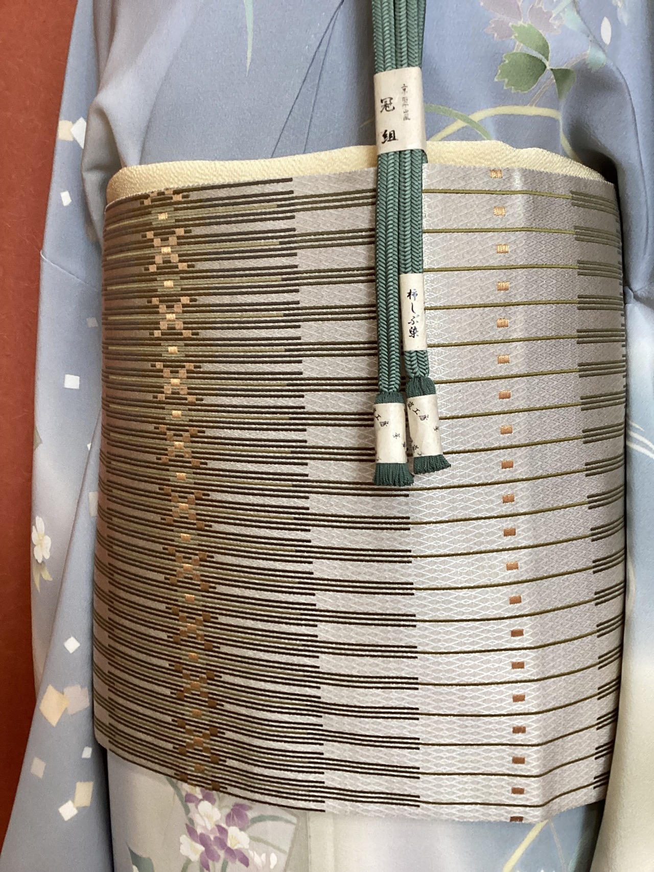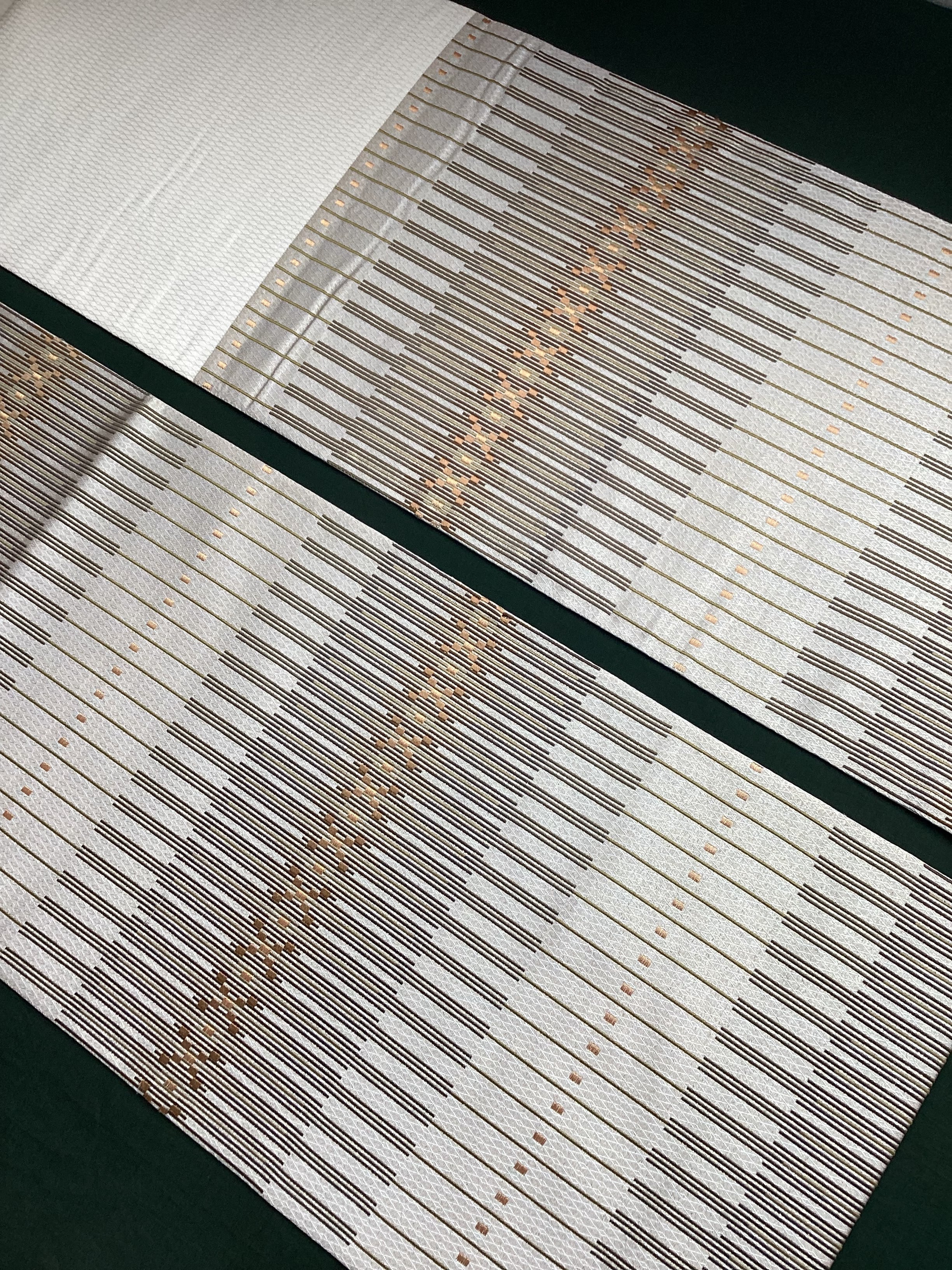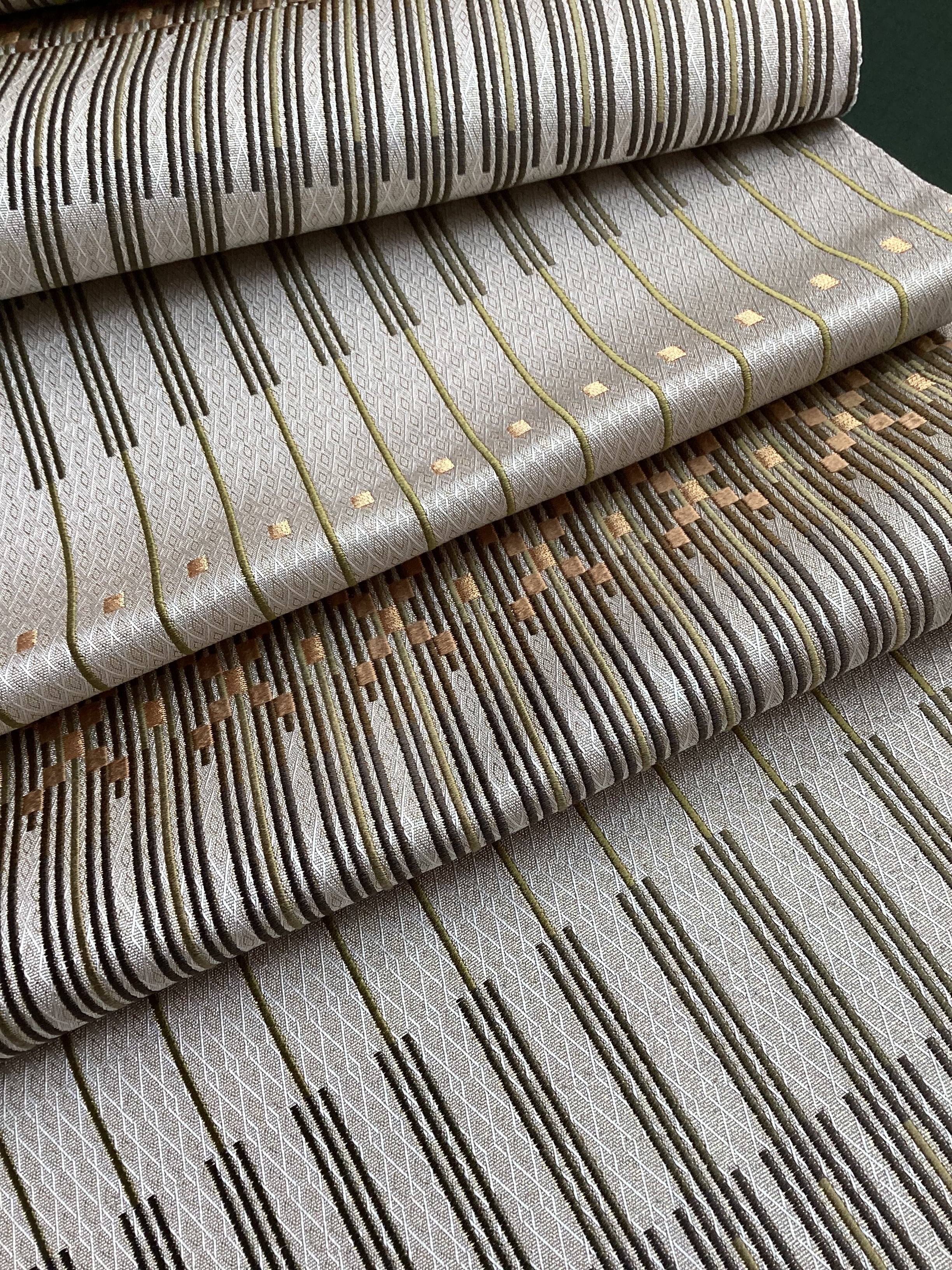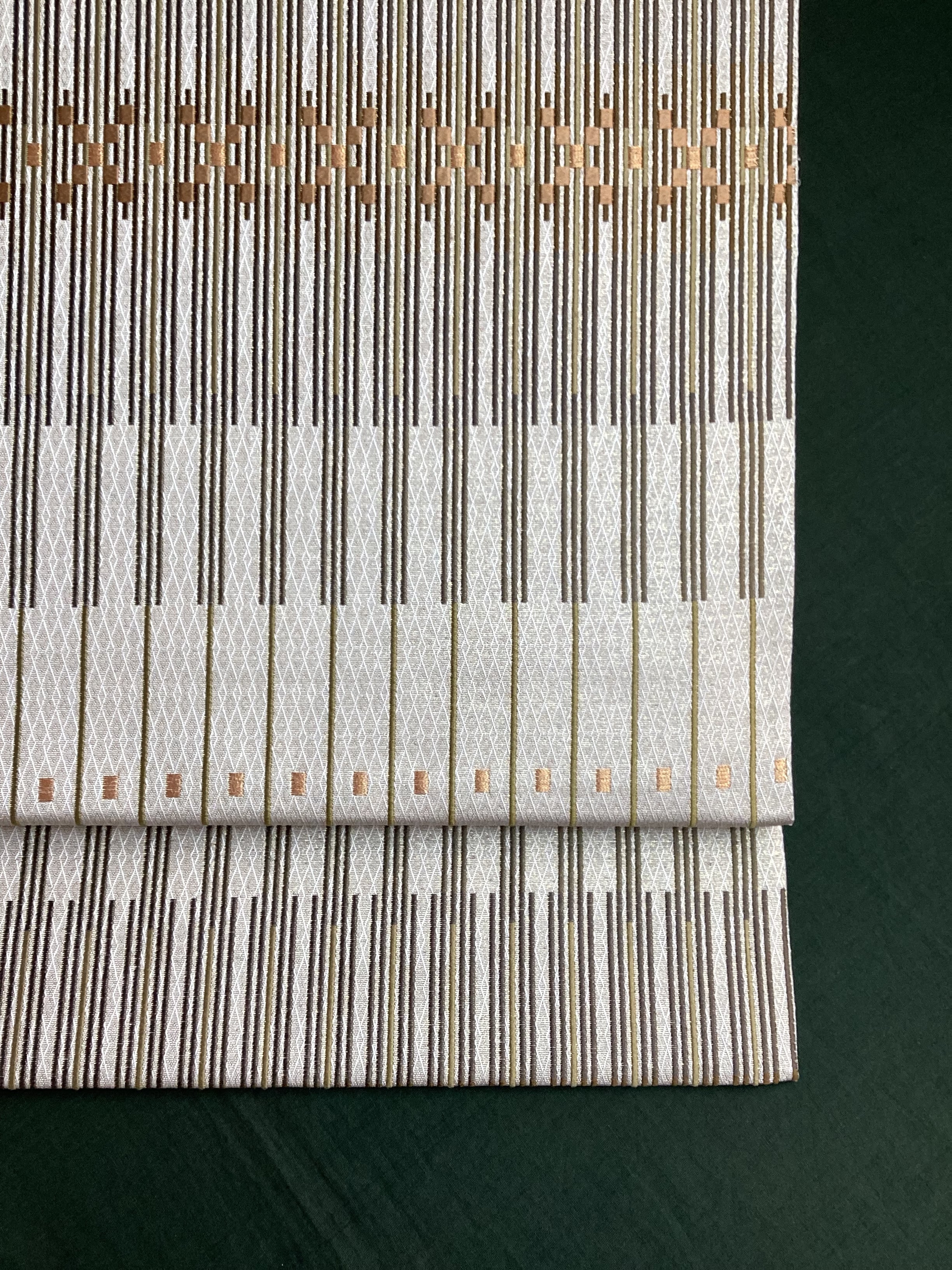 艶と煌めき感のあるシャンパンベージュ地に馴染むオリーブや茶系のお色目で変化のある縦縞文様が織りなされた袋帯です。緻密な織地が美しく、派手過ぎない適度な煌めきがあるので、セミフォーマルな装いにも締めていただけます。また、紬などに合わせていただきカジュアルなシーンをモダンにまとめる、使い勝手の良いお品です。適度な張りがあり締めやすく、美しいオタイコ姿が叶います。