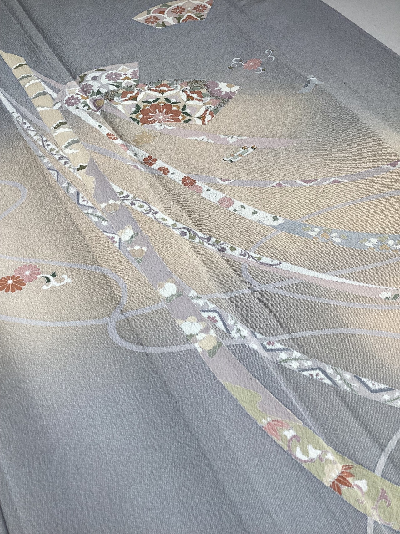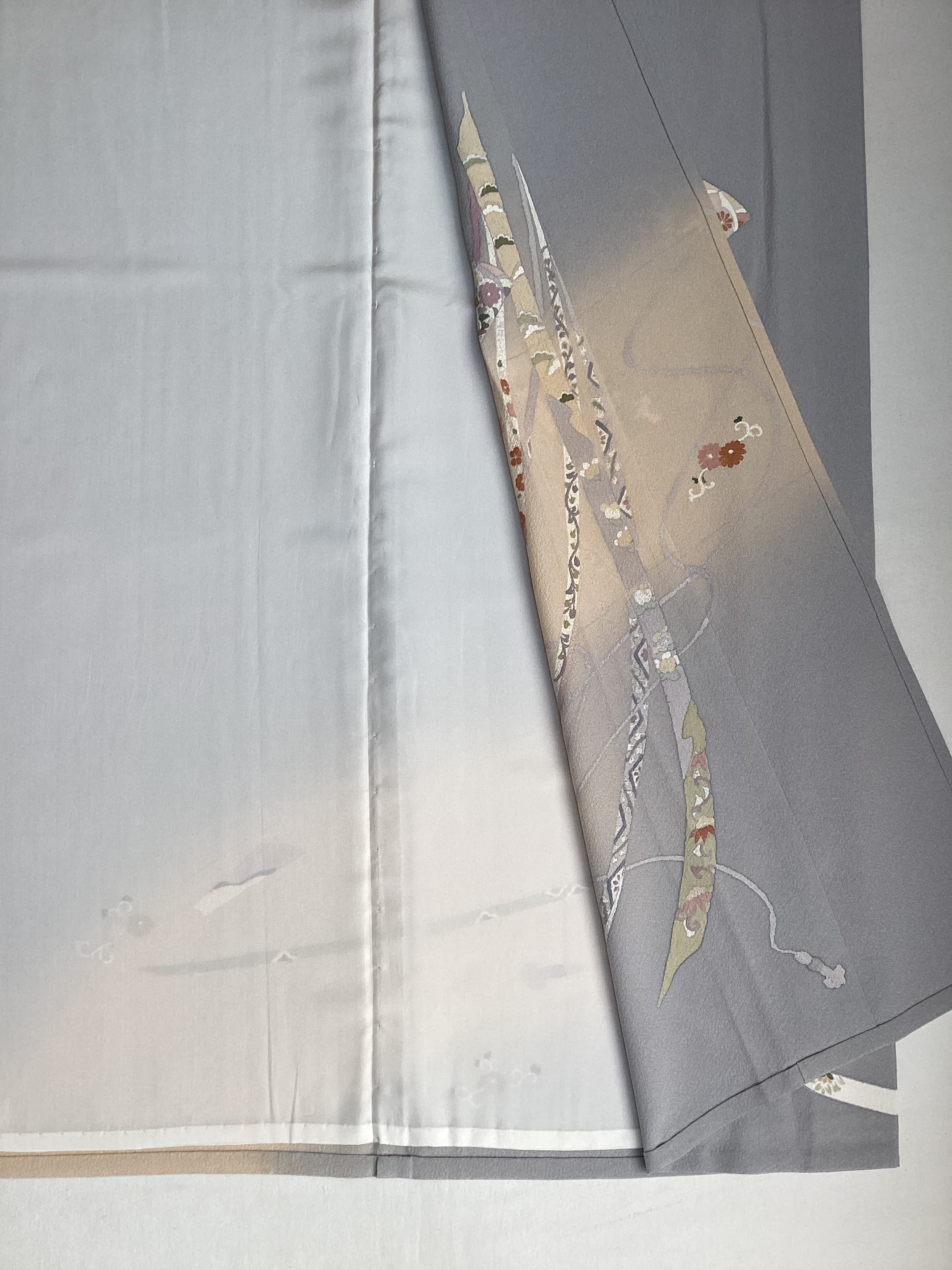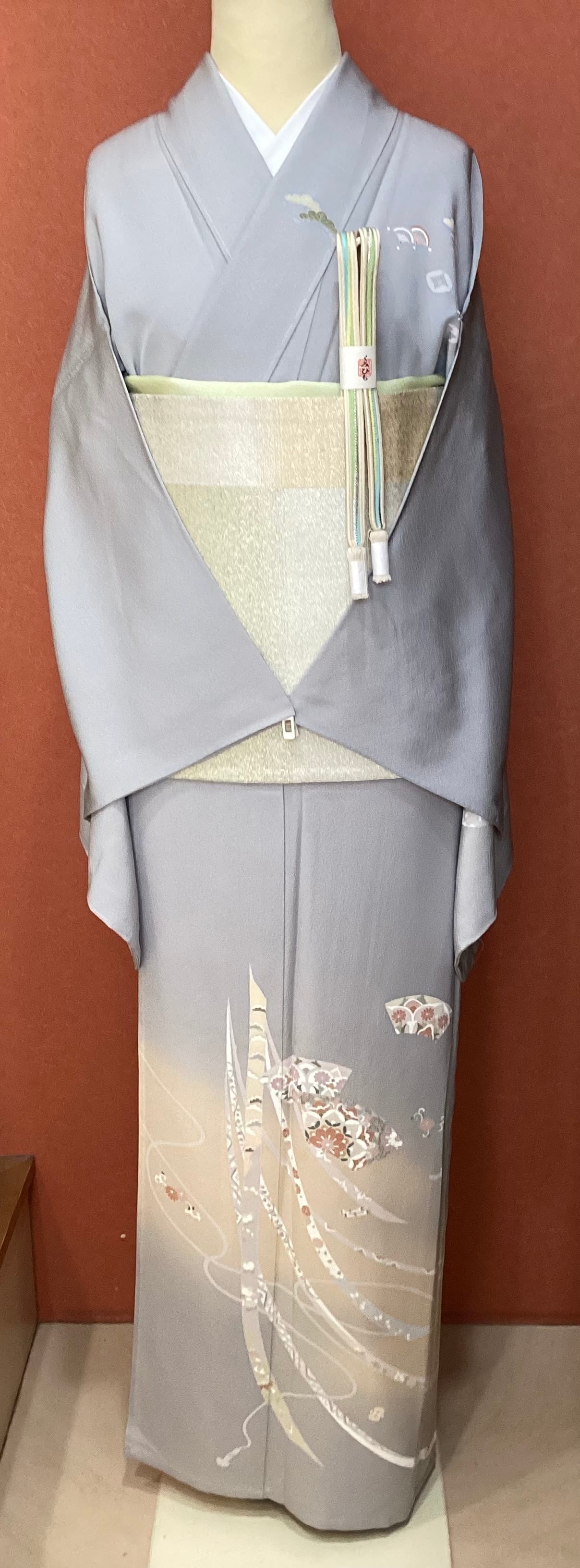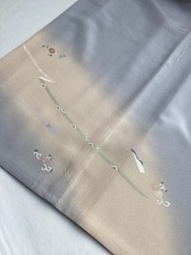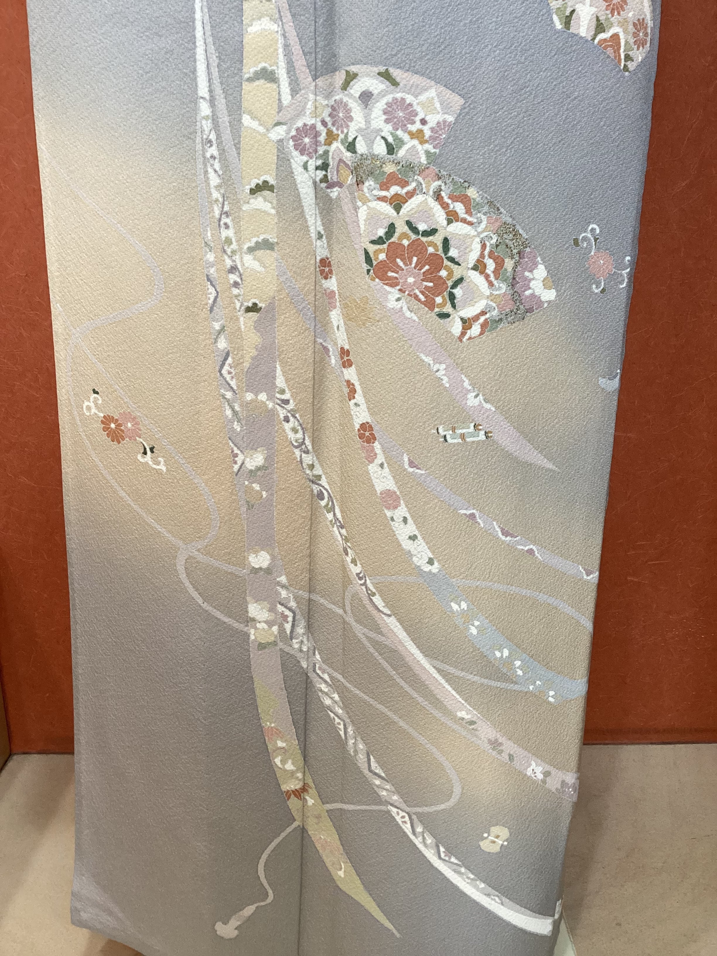 薄い紫がかった灰色をベースに、裾に赤みのあるベージュ色の暈しが入った優しい雰囲気の単衣の訪問着です。柔らかく軽やかな生地の上に扇の地紙と流れる美しい曲線の鬘帯が描かれており、後ろ姿や袖には宝尽くしのモチーフが点々と配置されています。あっさりとした柄付けではありますが、古典的な吉祥文様が上品で、一歩下がった礼を尽くした装いが叶います。