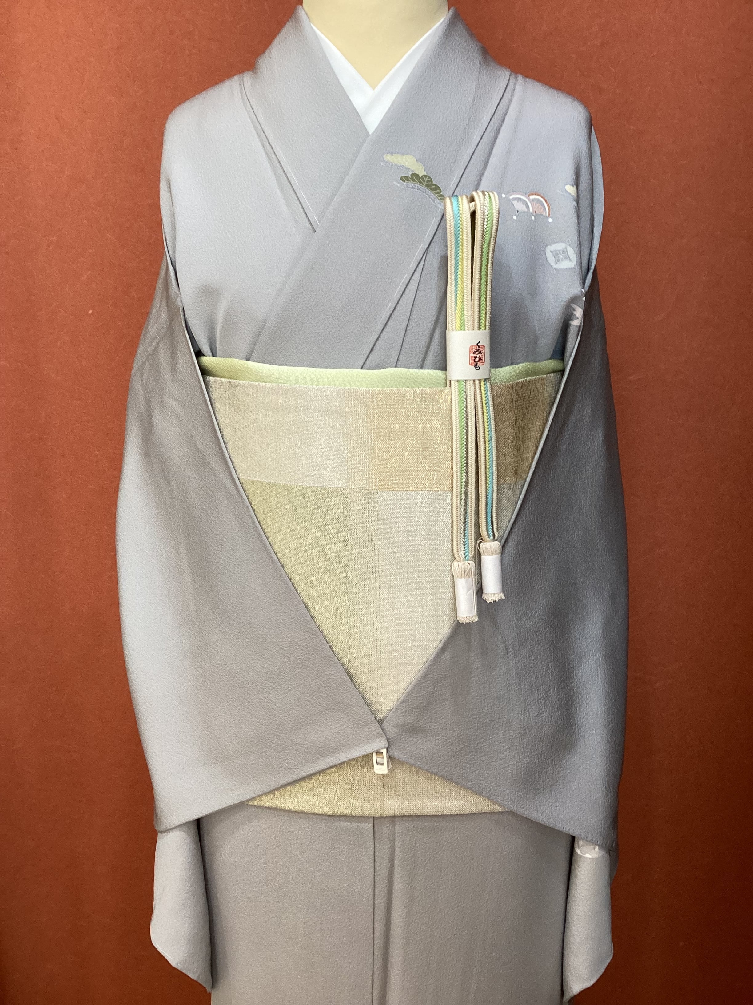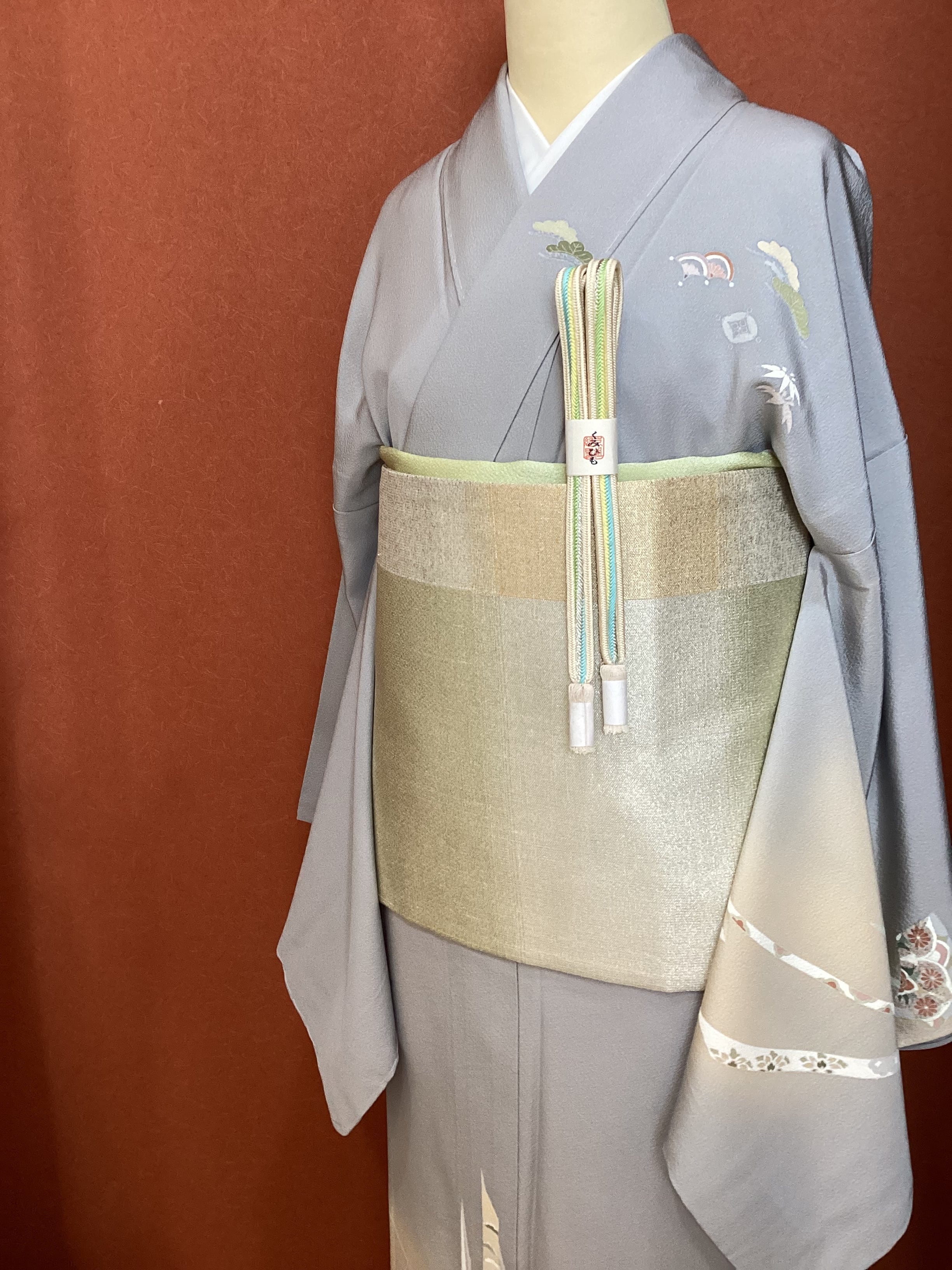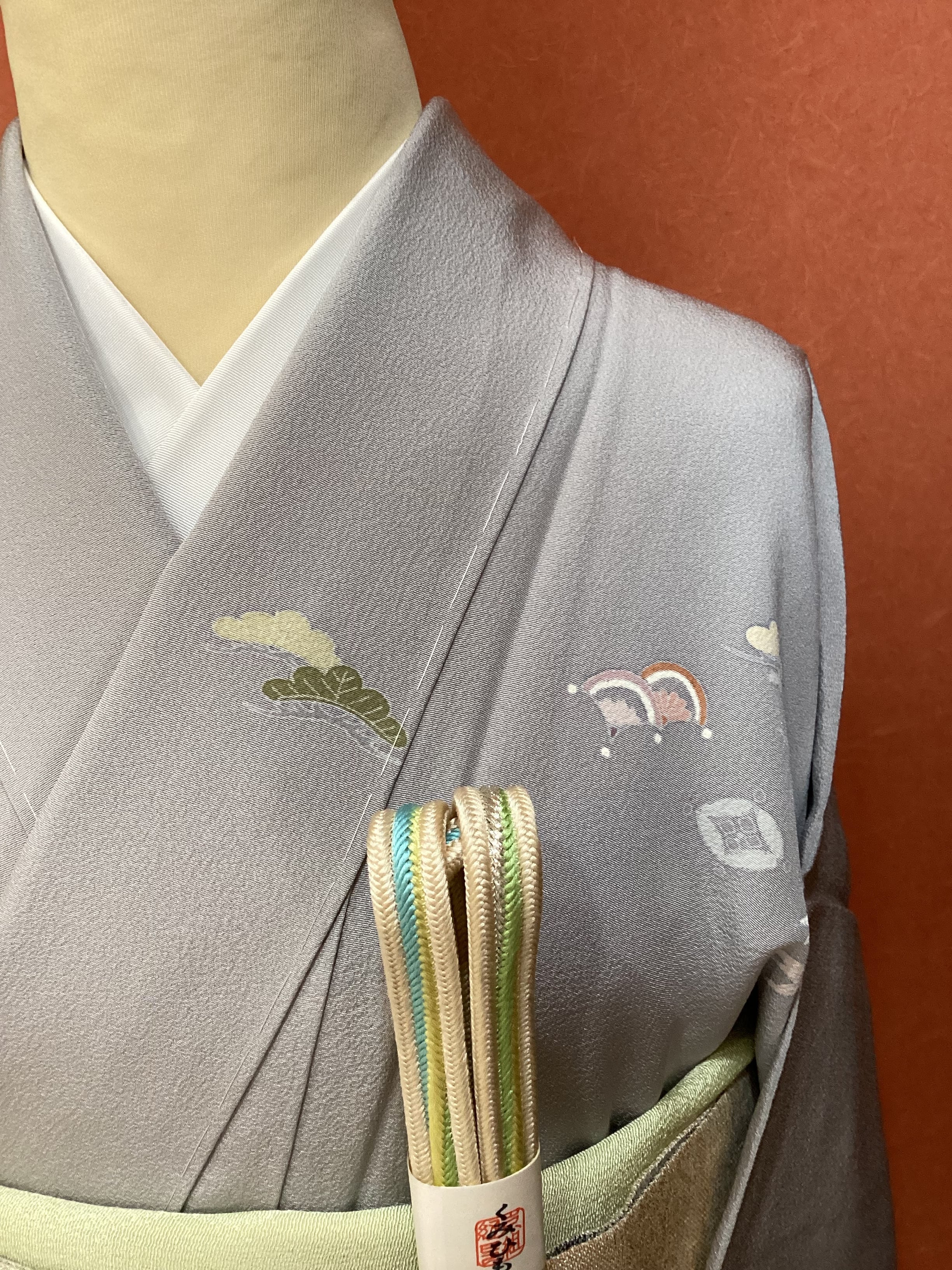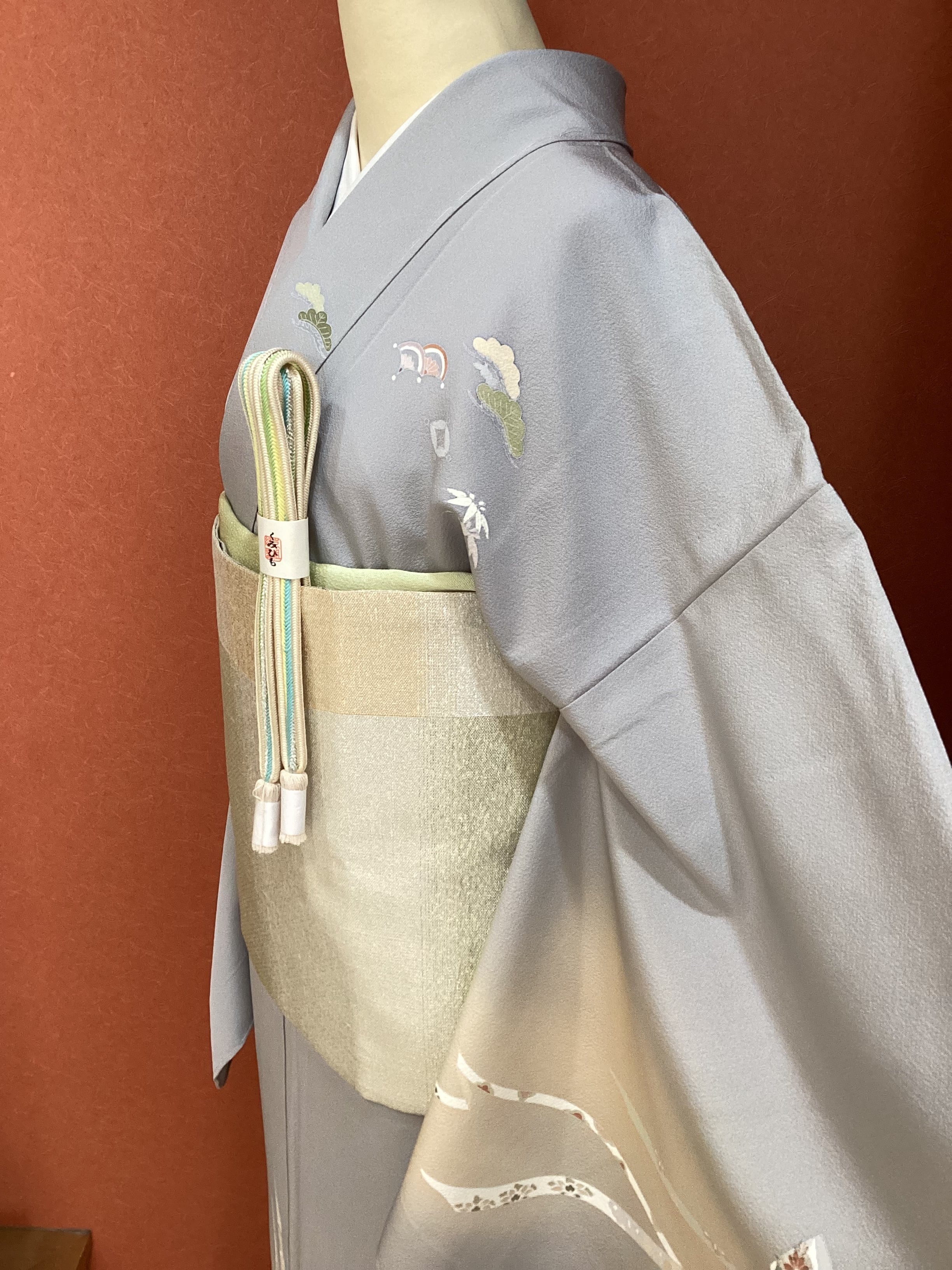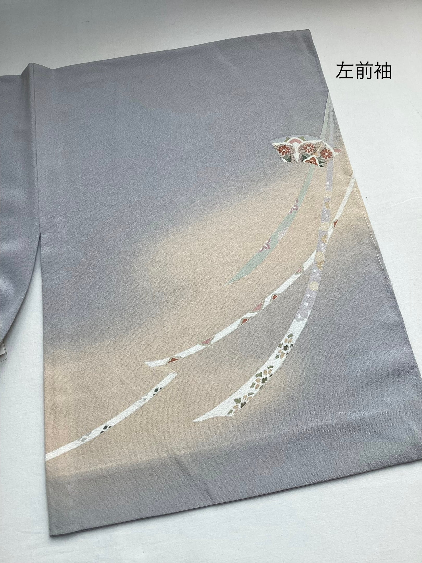 薄い紫がかった灰色をベースに、裾に赤みのあるベージュ色の暈しが入った優しい雰囲気の単衣の訪問着です。柔らかく軽やかな生地の上に扇の地紙と流れる美しい曲線の鬘帯が描かれており、後ろ姿や袖には宝尽くしのモチーフが点々と配置されています。あっさりとした柄付けではありますが、古典的な吉祥文様が上品で、一歩下がった礼を尽くした装いが叶います。