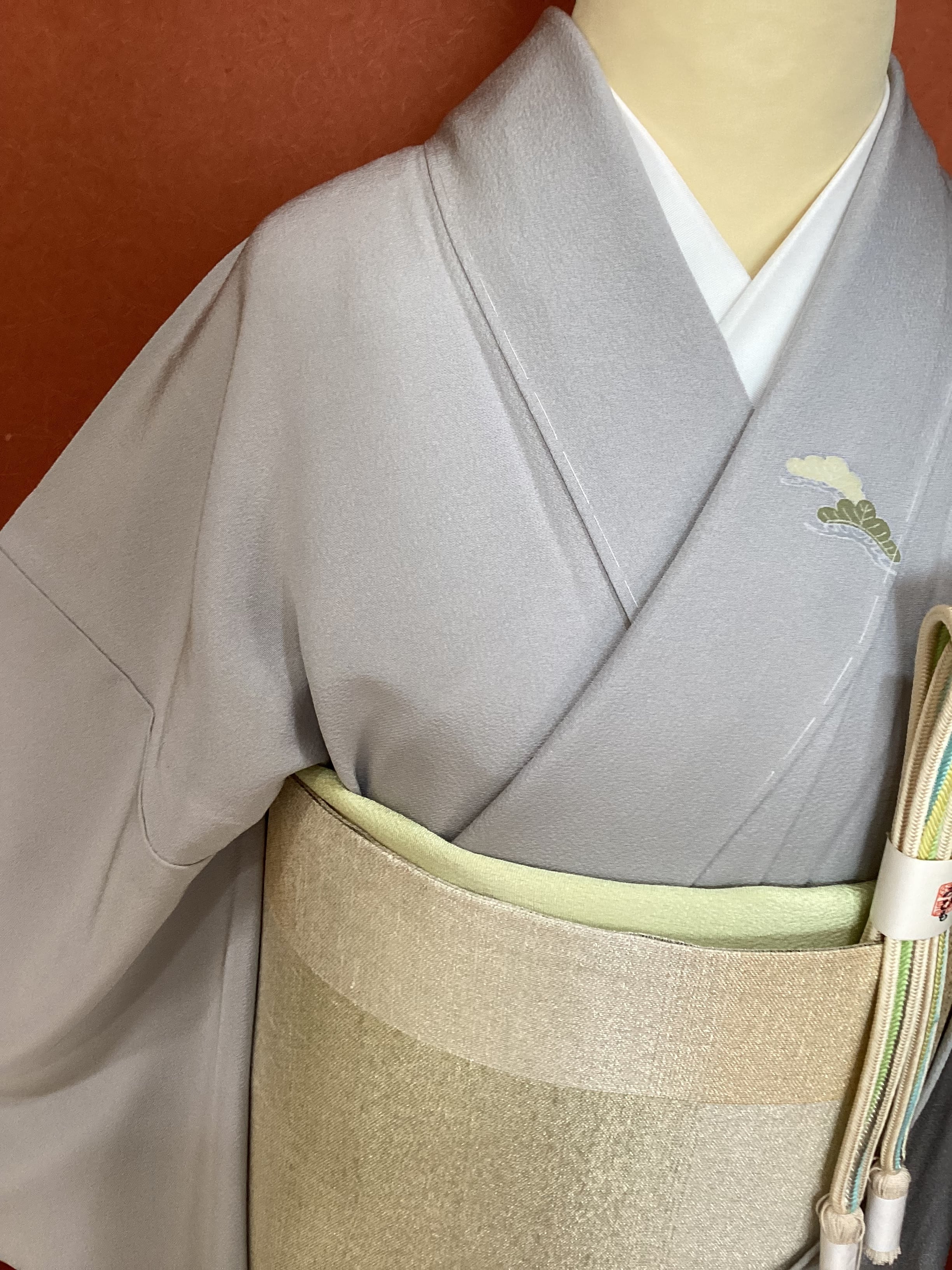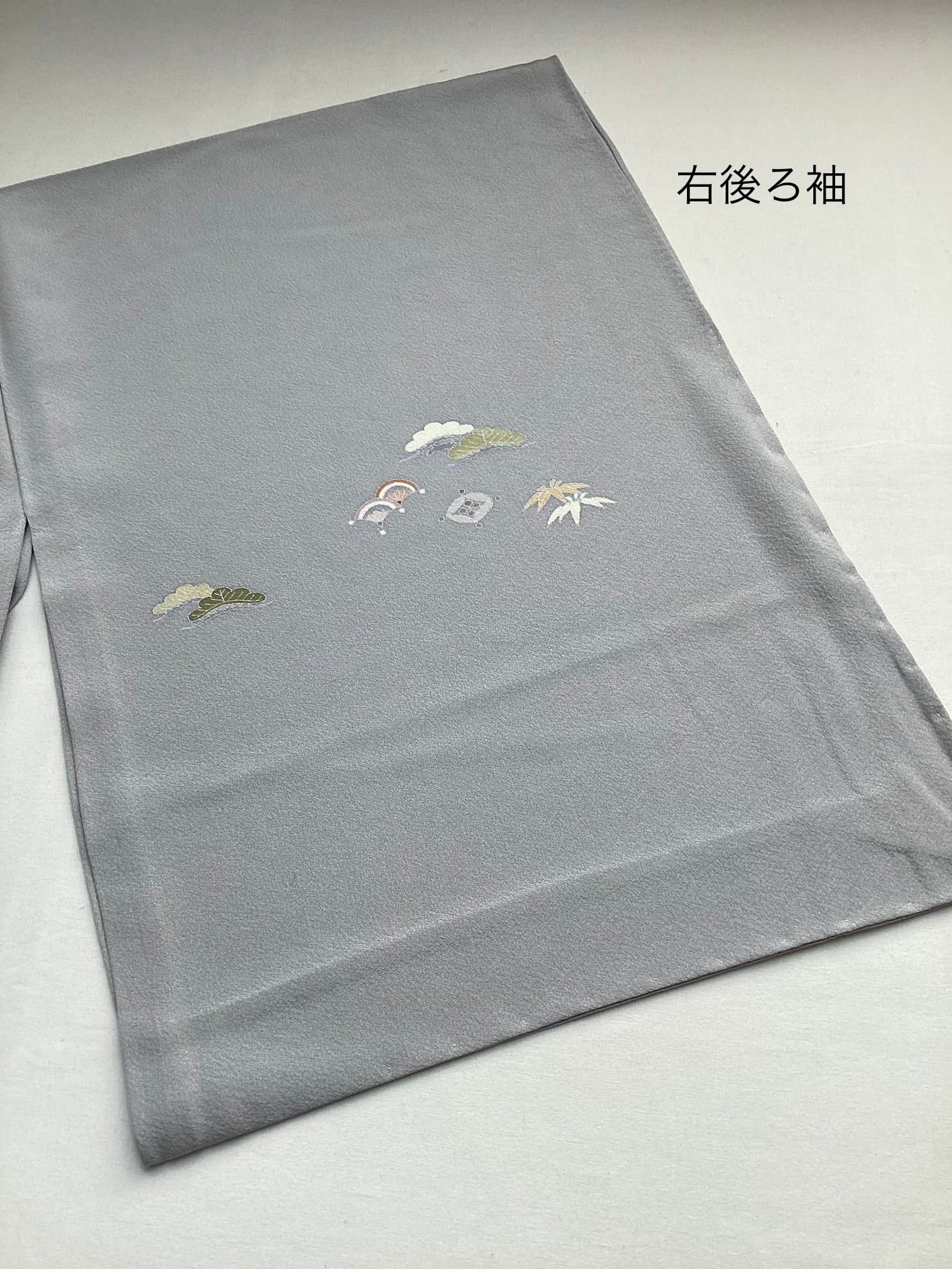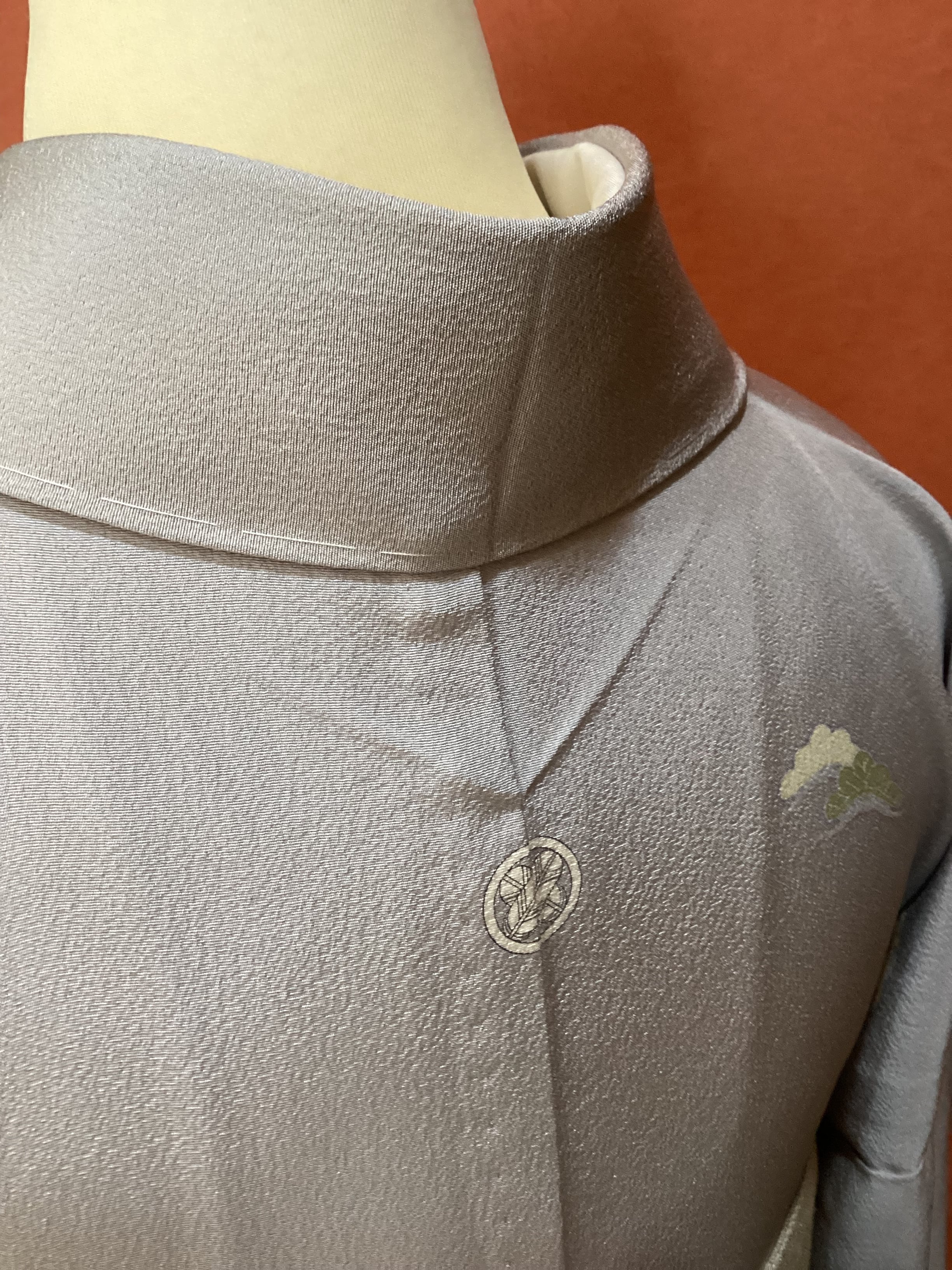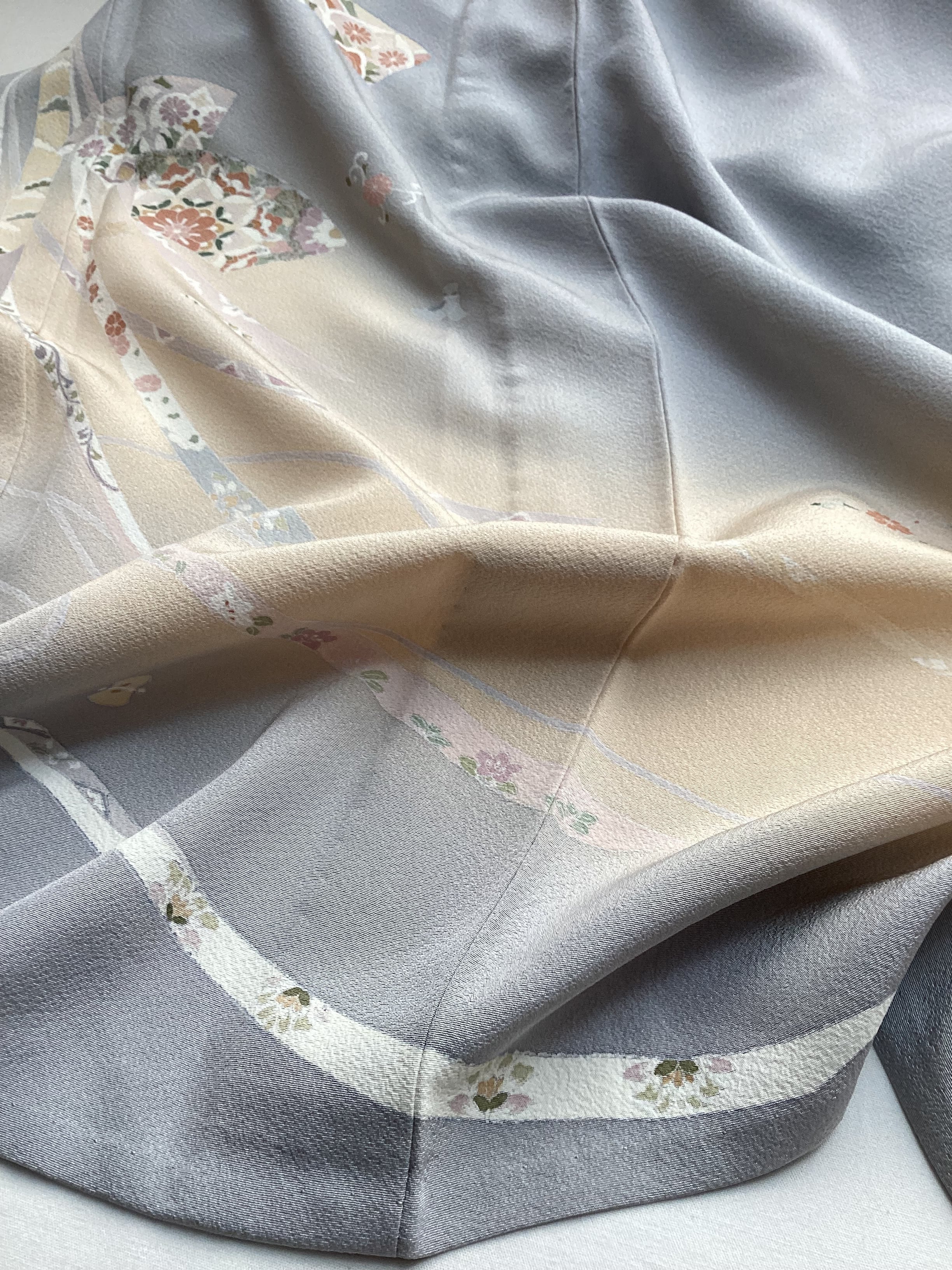 薄い紫がかった灰色をベースに、裾に赤みのあるベージュ色の暈しが入った優しい雰囲気の単衣の訪問着です。柔らかく軽やかな生地の上に扇の地紙と流れる美しい曲線の鬘帯が描かれており、後ろ姿や袖には宝尽くしのモチーフが点々と配置されています。あっさりとした柄付けではありますが、古典的な吉祥文様が上品で、一歩下がった礼を尽くした装いが叶います。