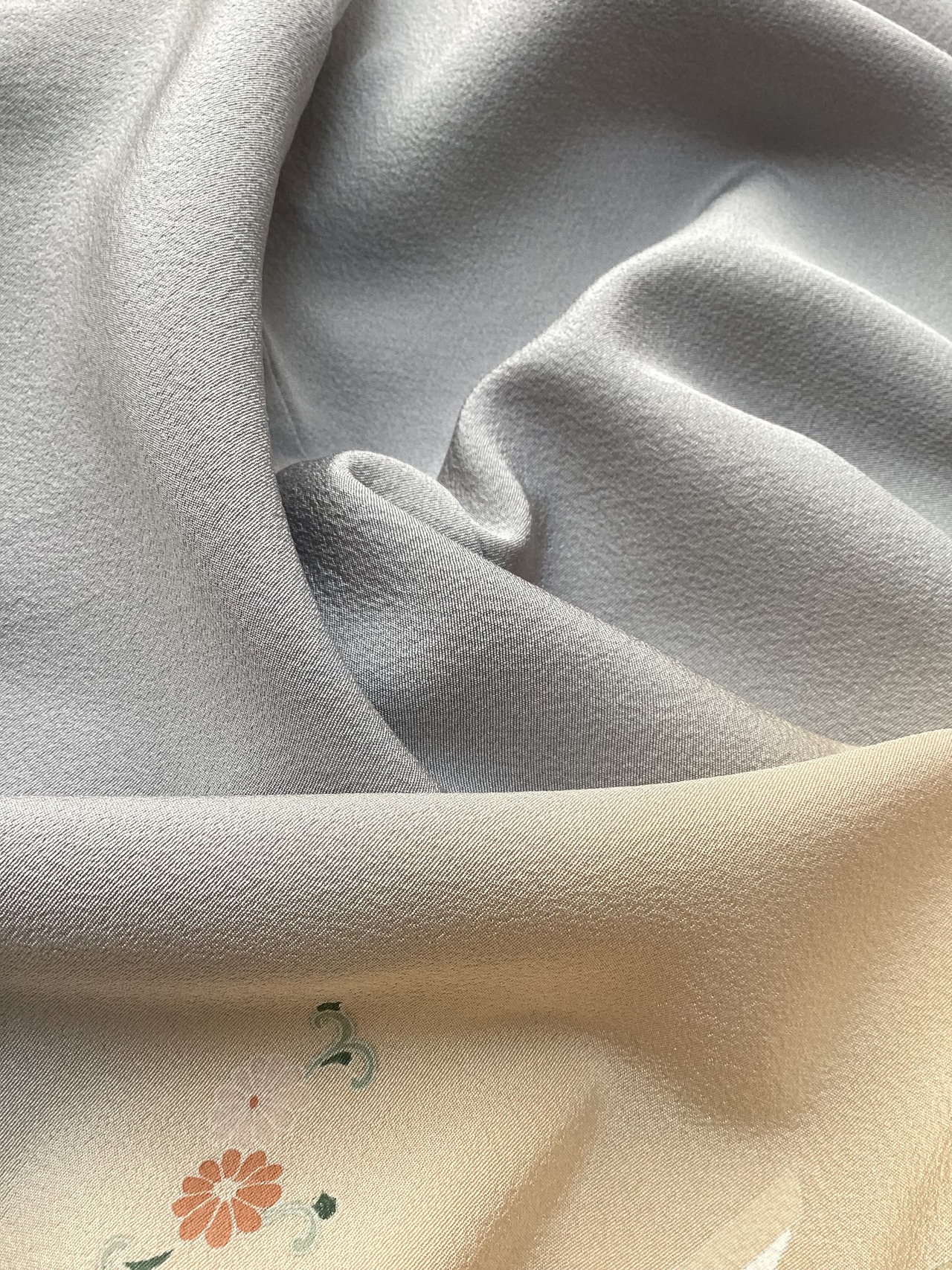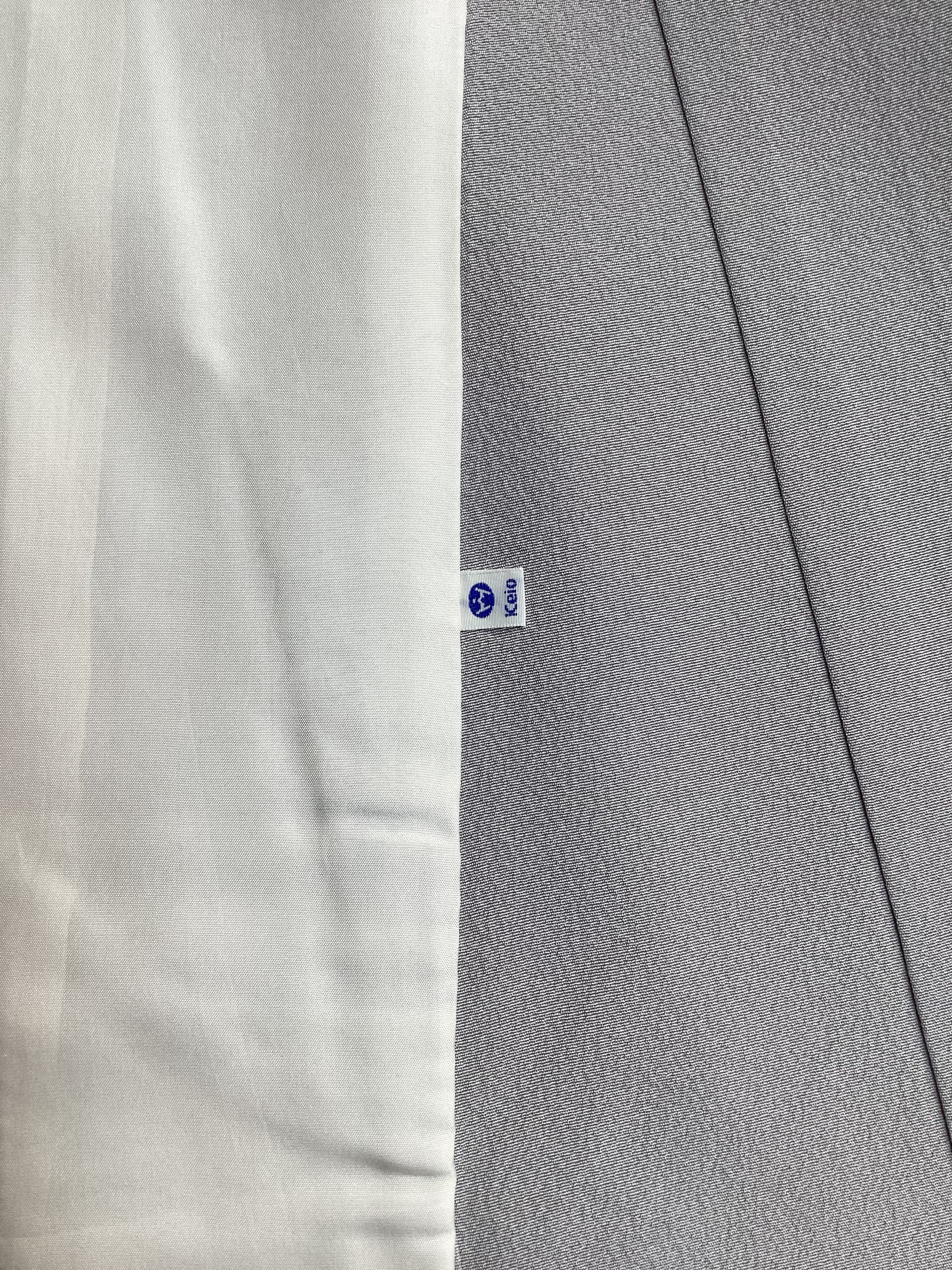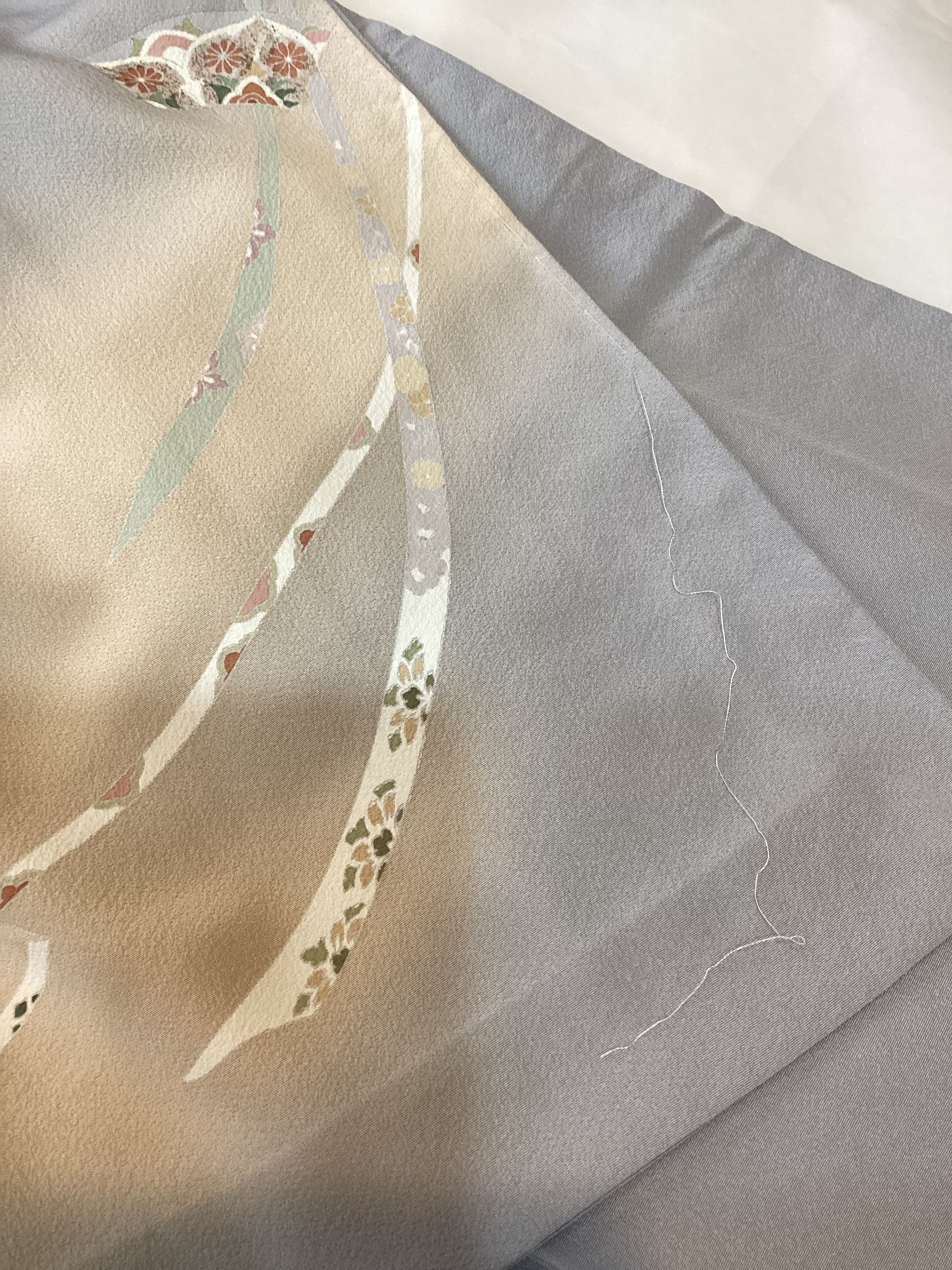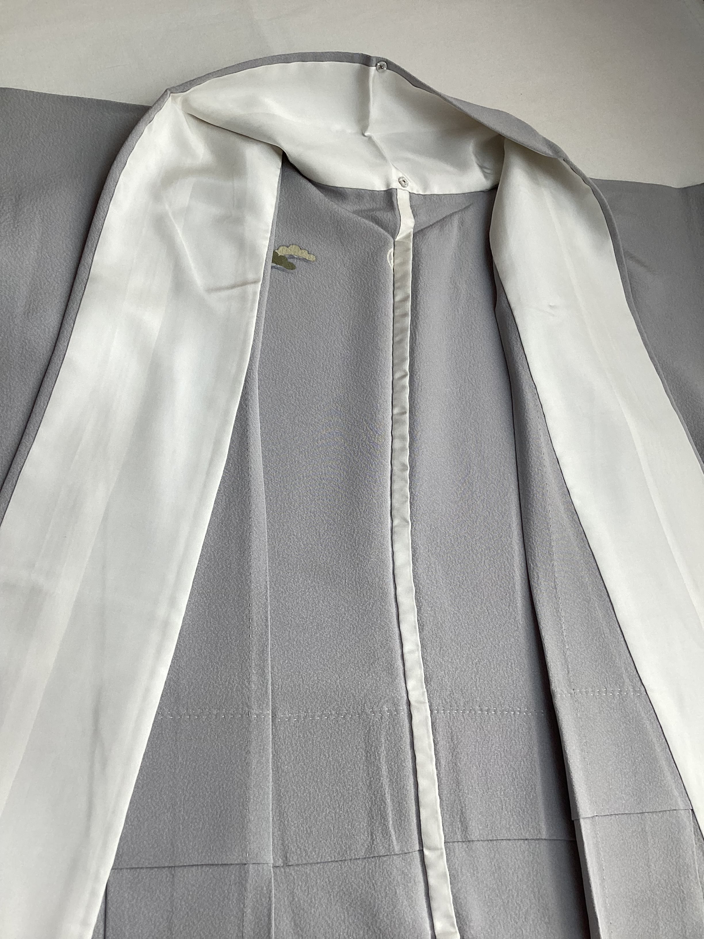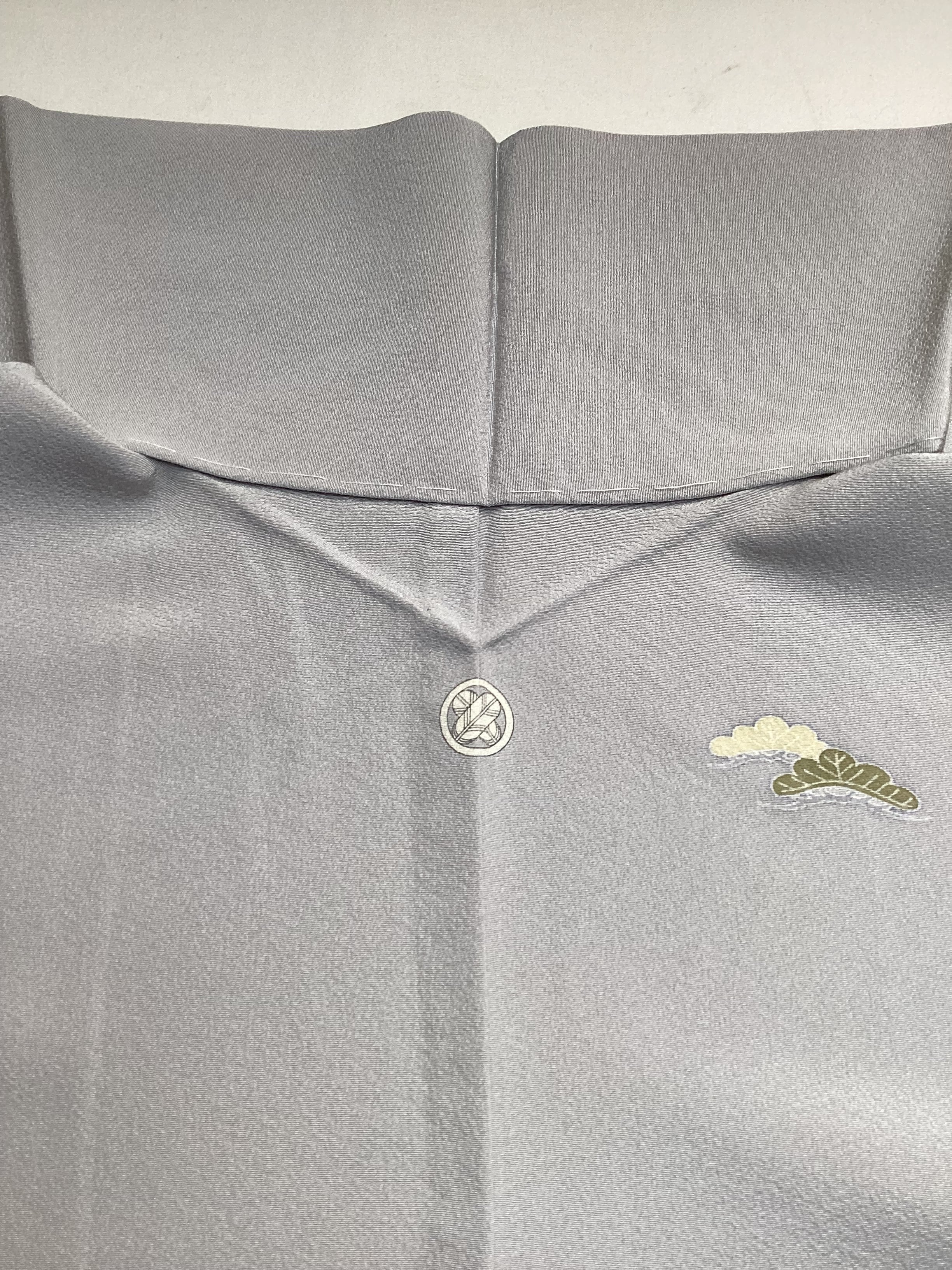 薄い紫がかった灰色をベースに、裾に赤みのあるベージュ色の暈しが入った優しい雰囲気の単衣の訪問着です。柔らかく軽やかな生地の上に扇の地紙と流れる美しい曲線の鬘帯が描かれており、後ろ姿や袖には宝尽くしのモチーフが点々と配置されています。あっさりとした柄付けではありますが、古典的な吉祥文様が上品で、一歩下がった礼を尽くした装いが叶います。