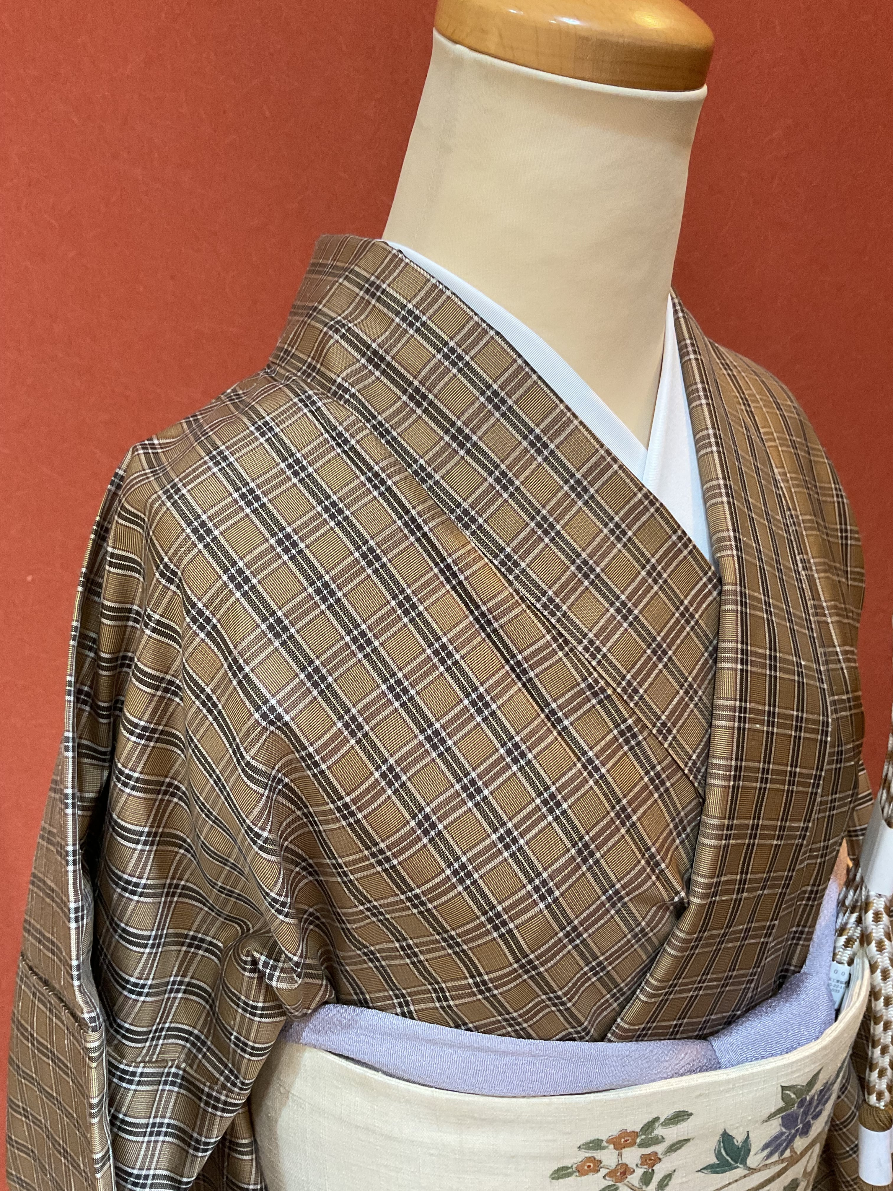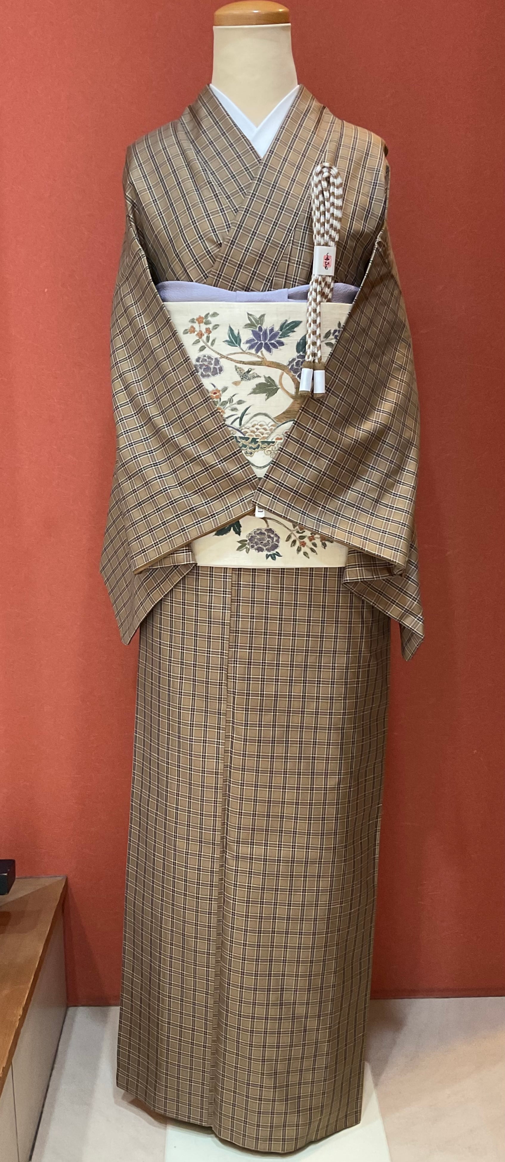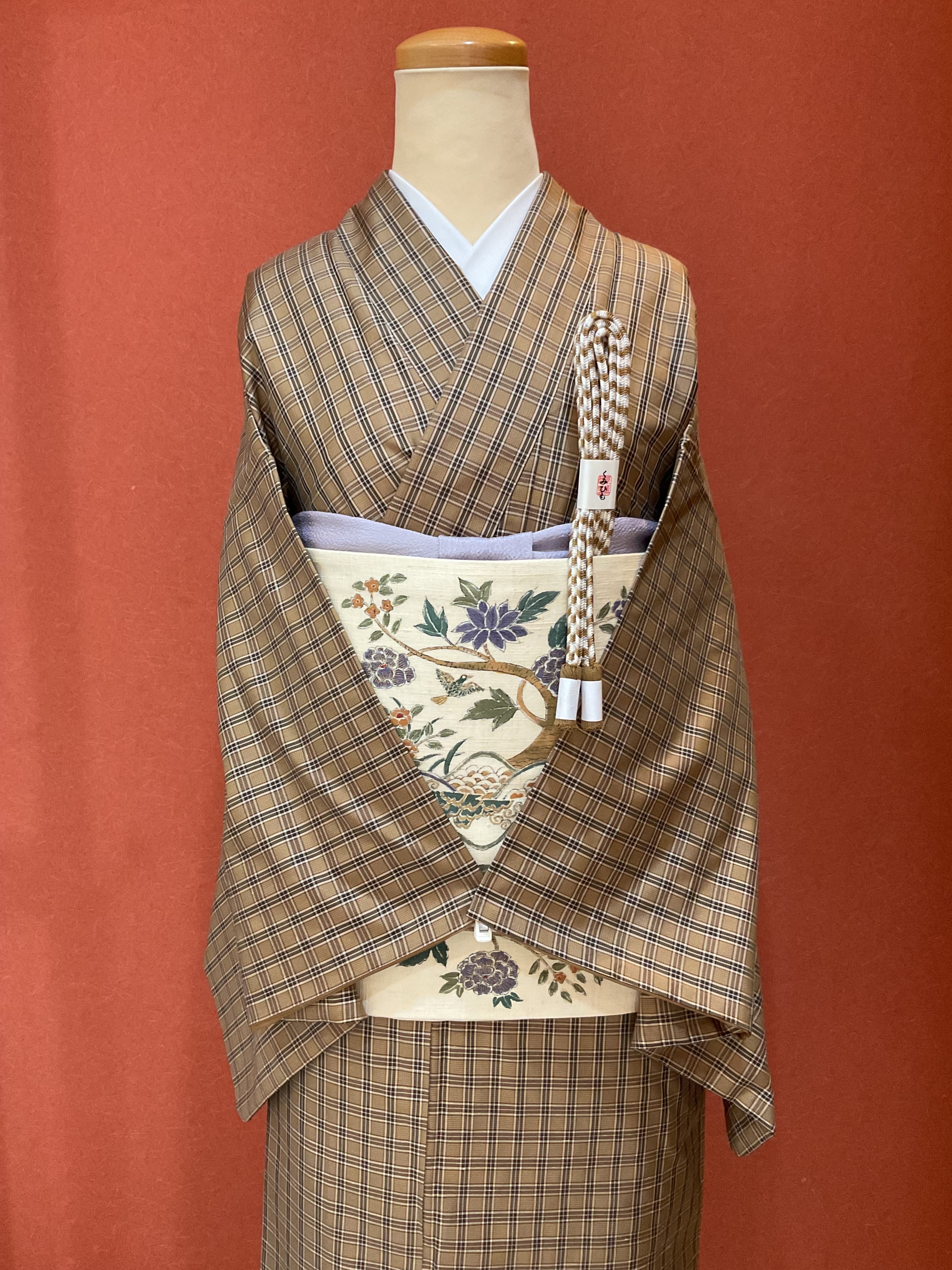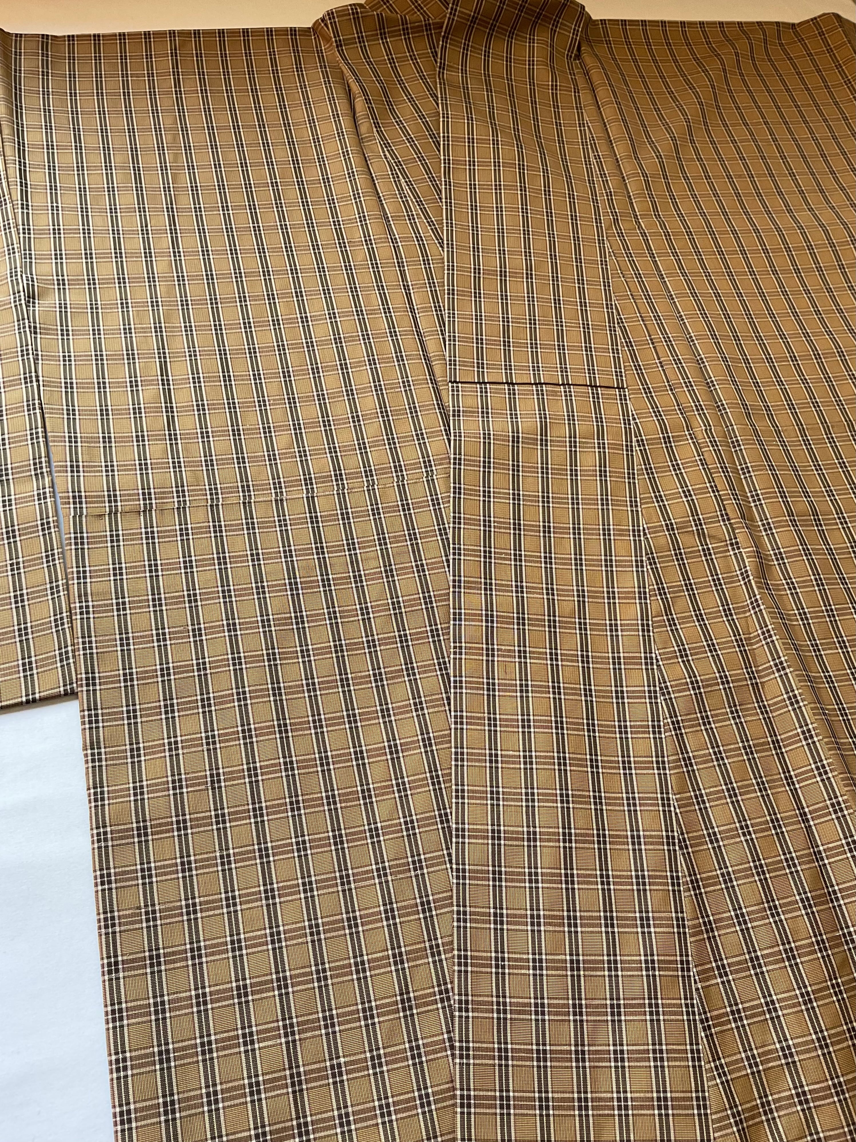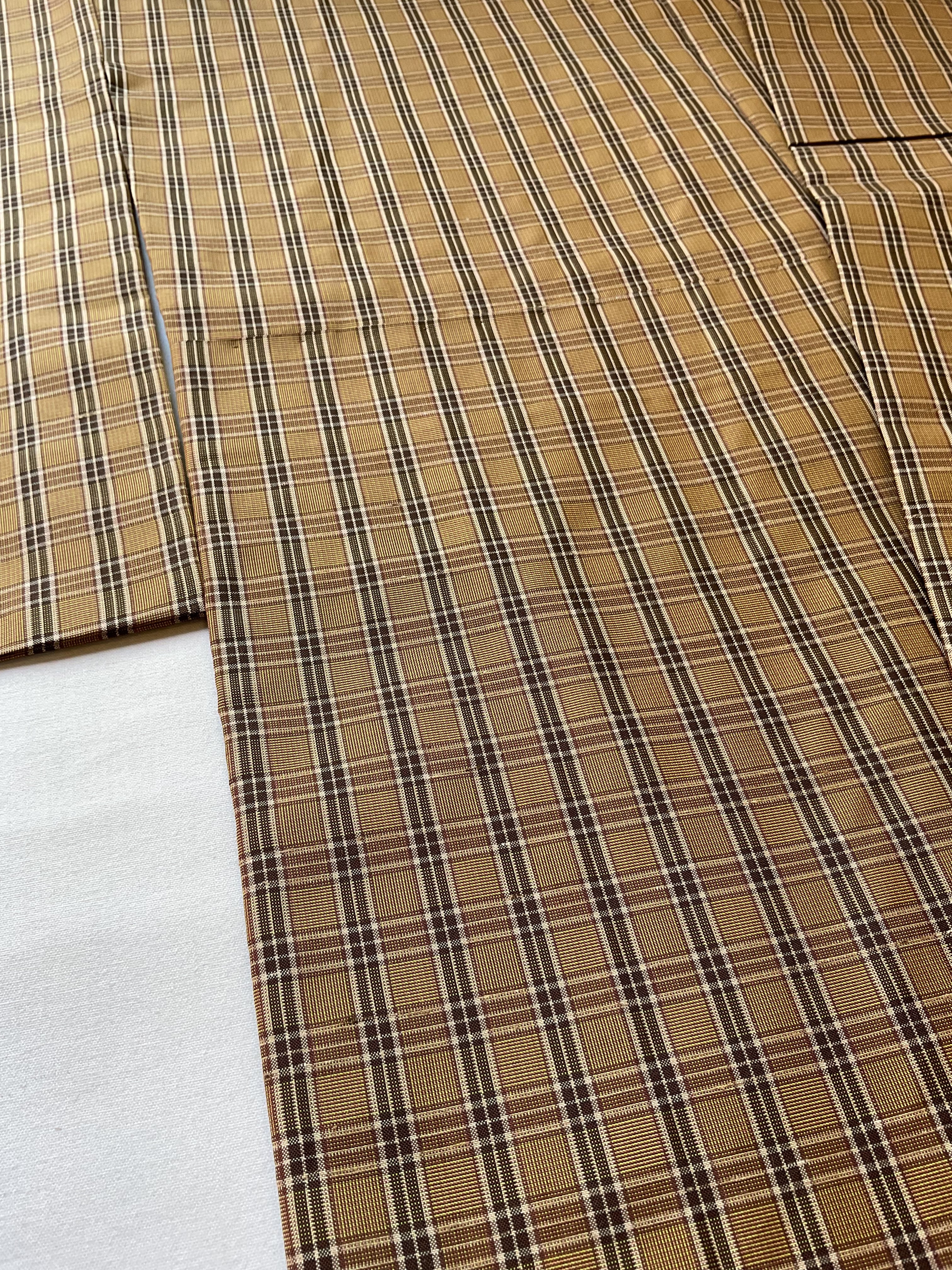 やや金茶寄りの茶色をベースとした格子文のきものです。本場縞大島証紙付き。