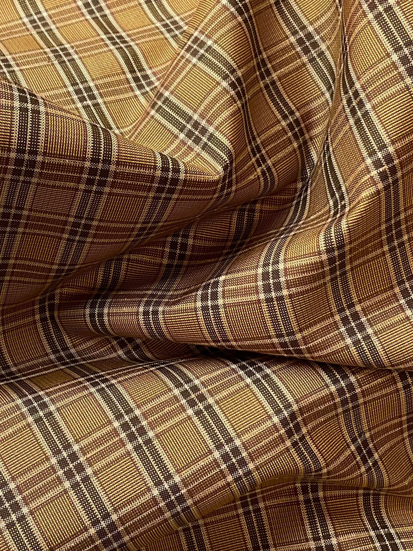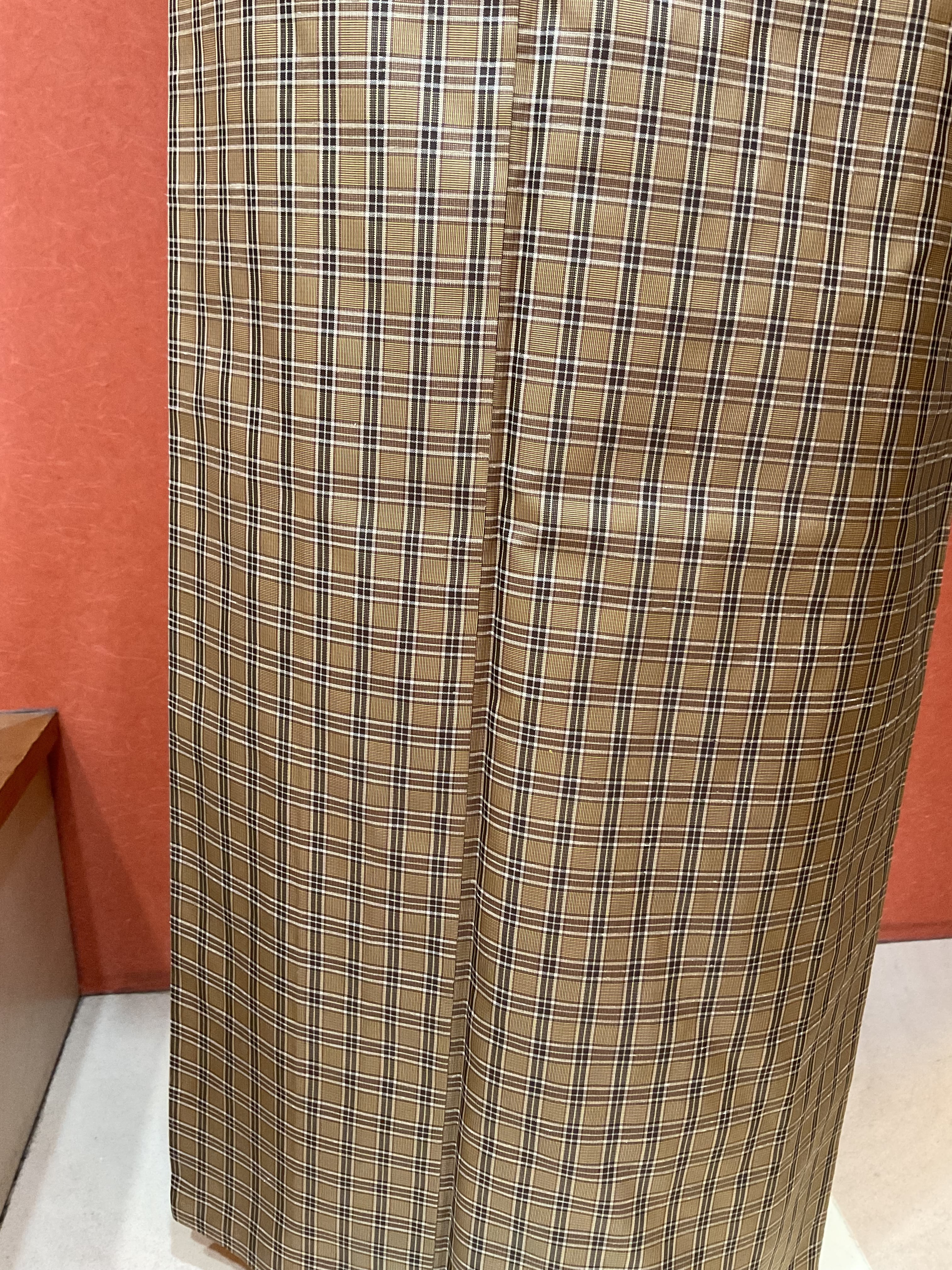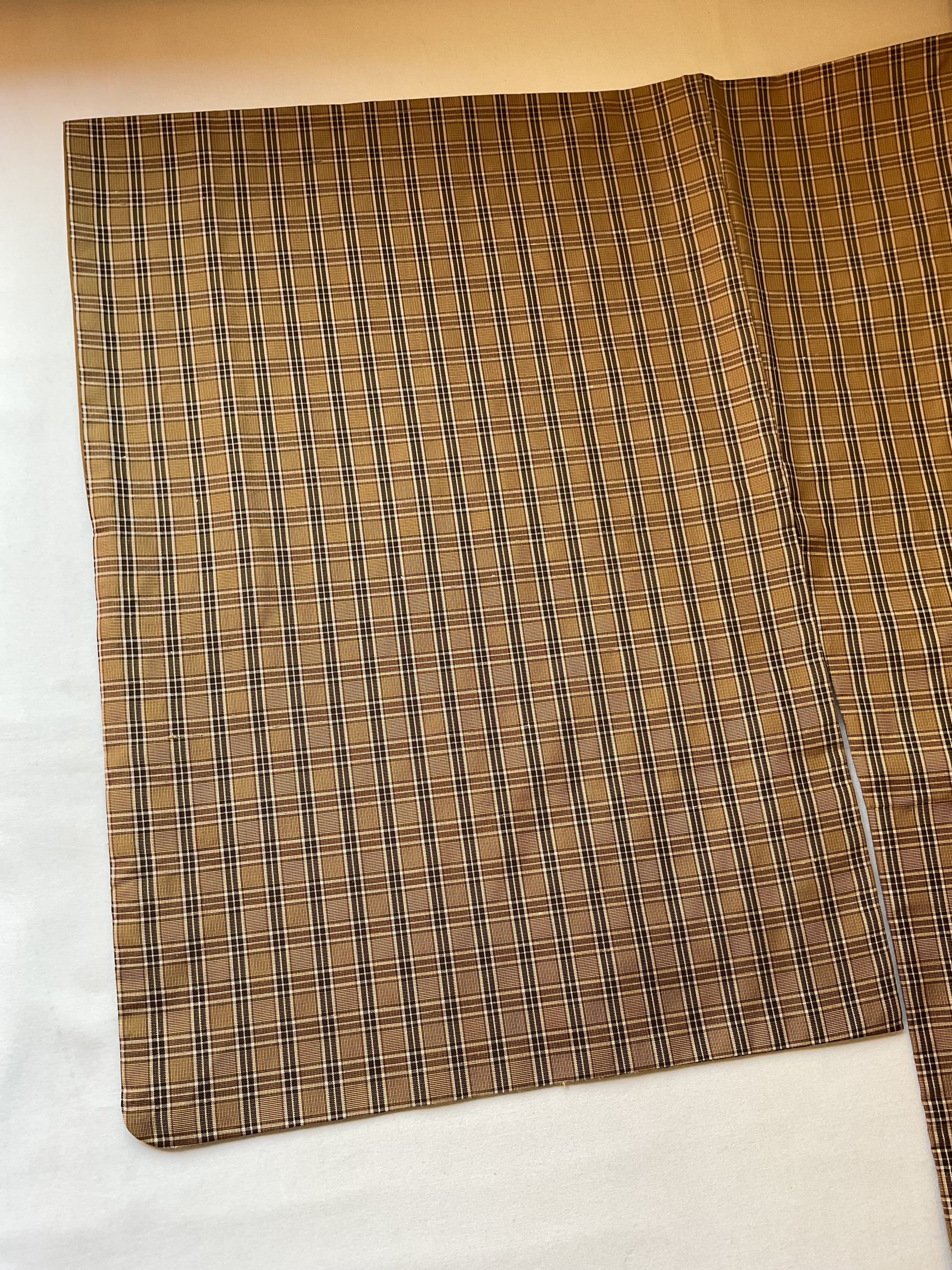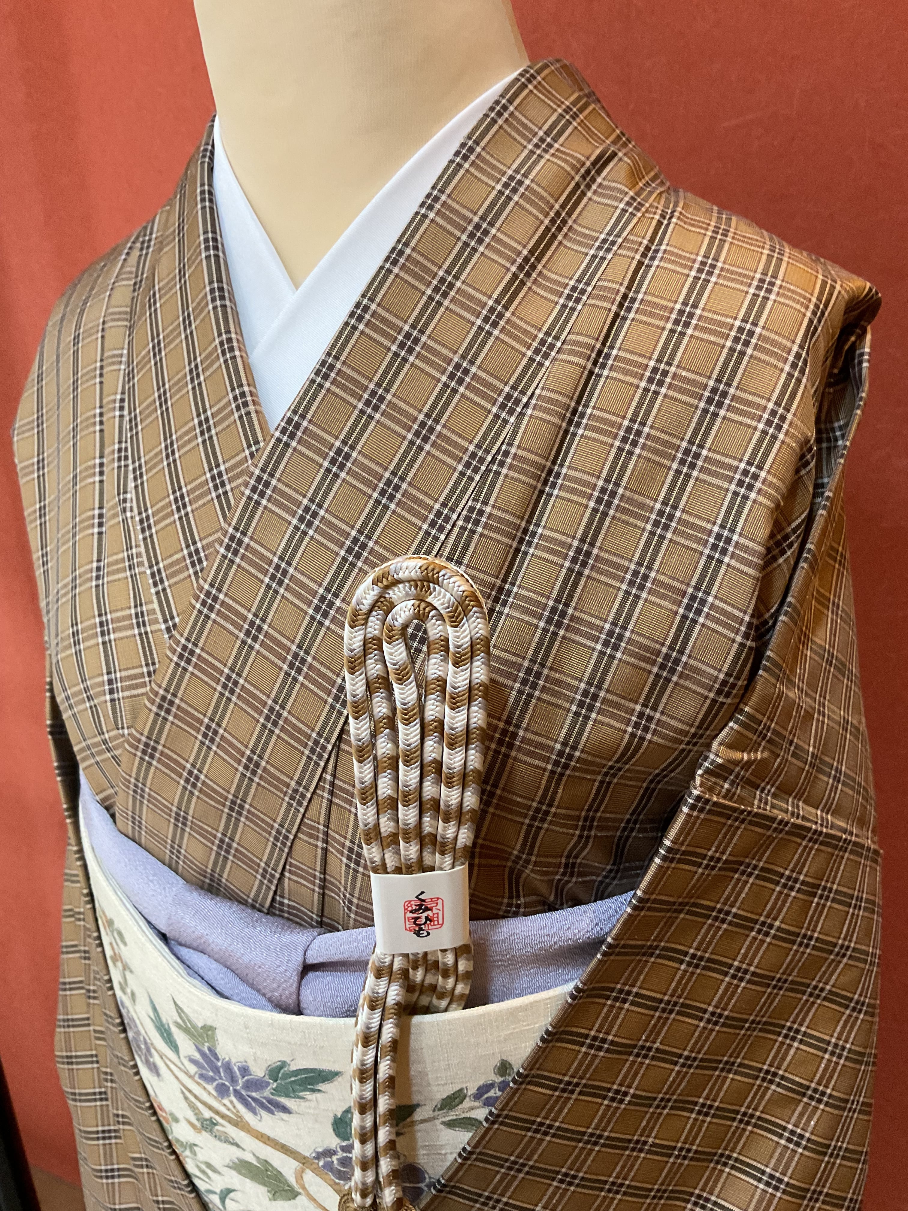 やや金茶寄りの茶色をベースとした格子文のきものです。本場縞大島証紙付き。