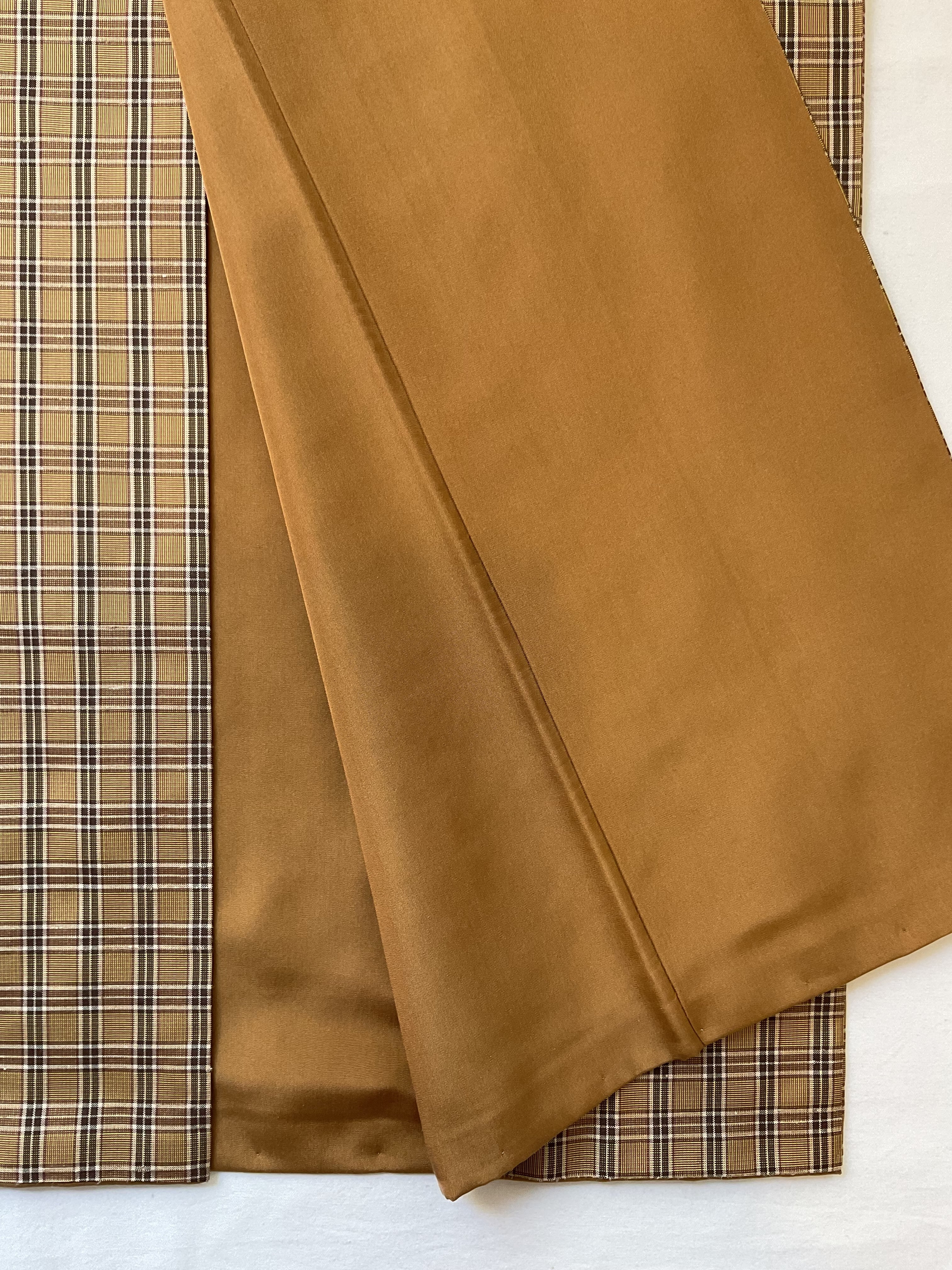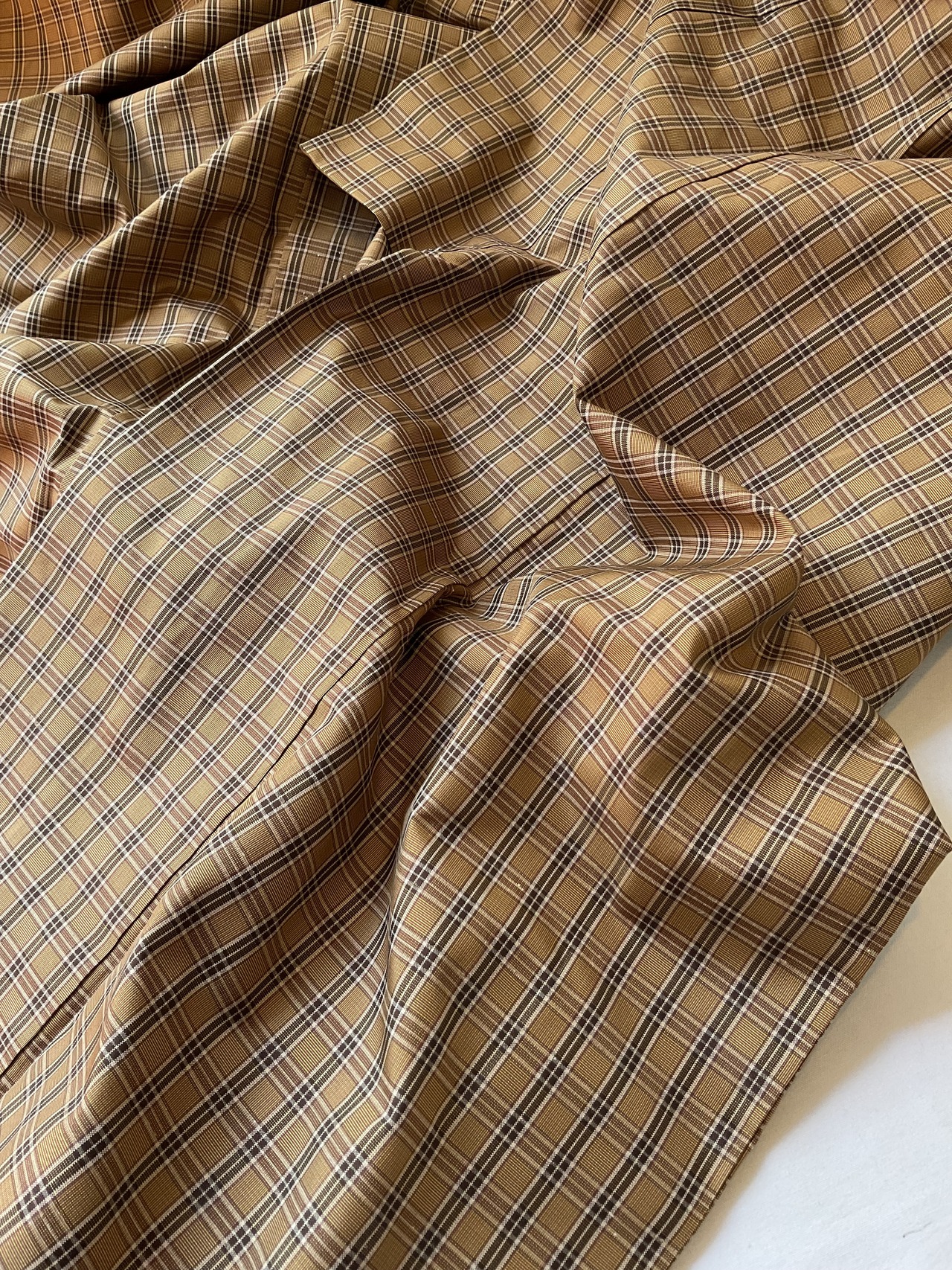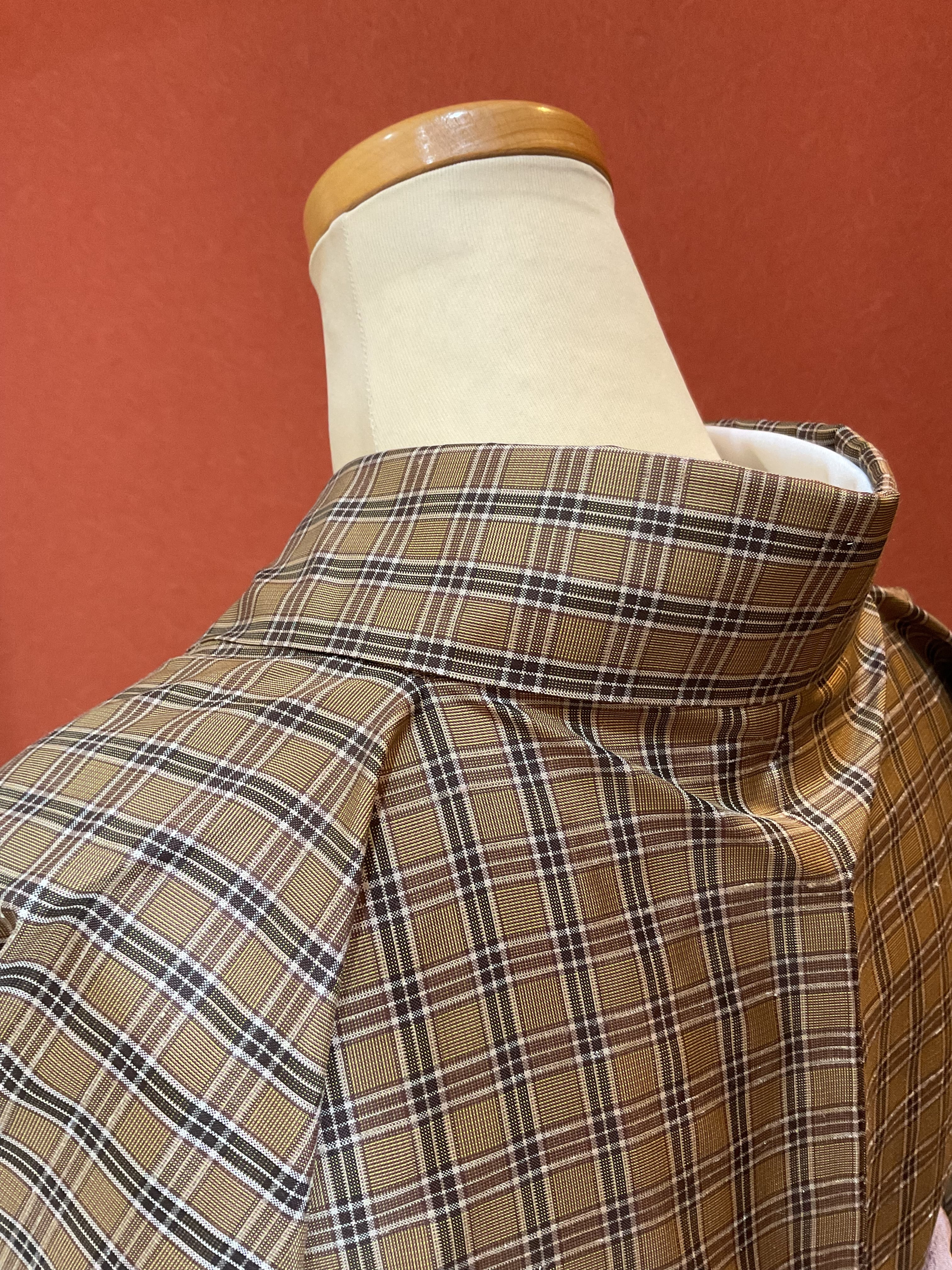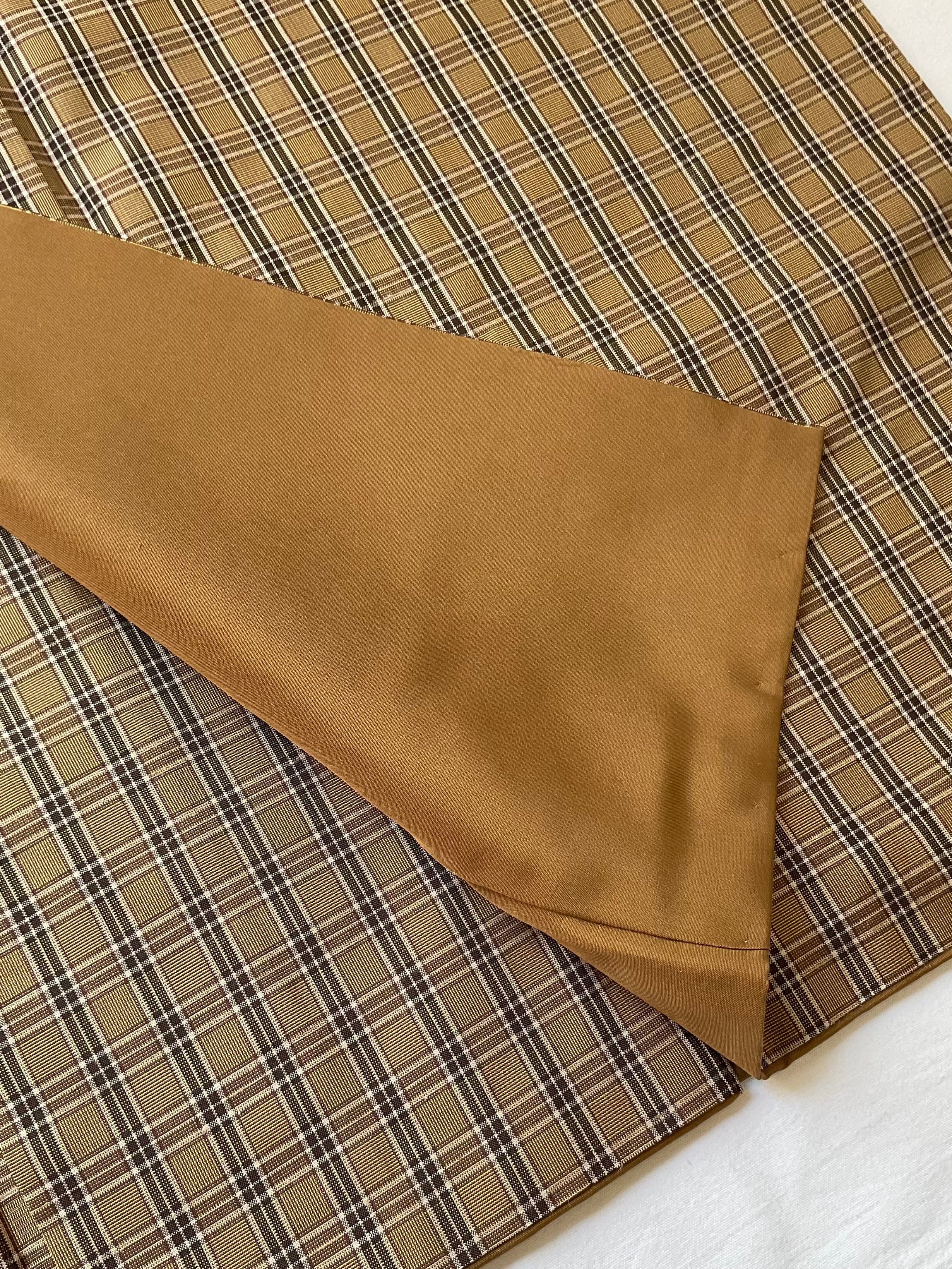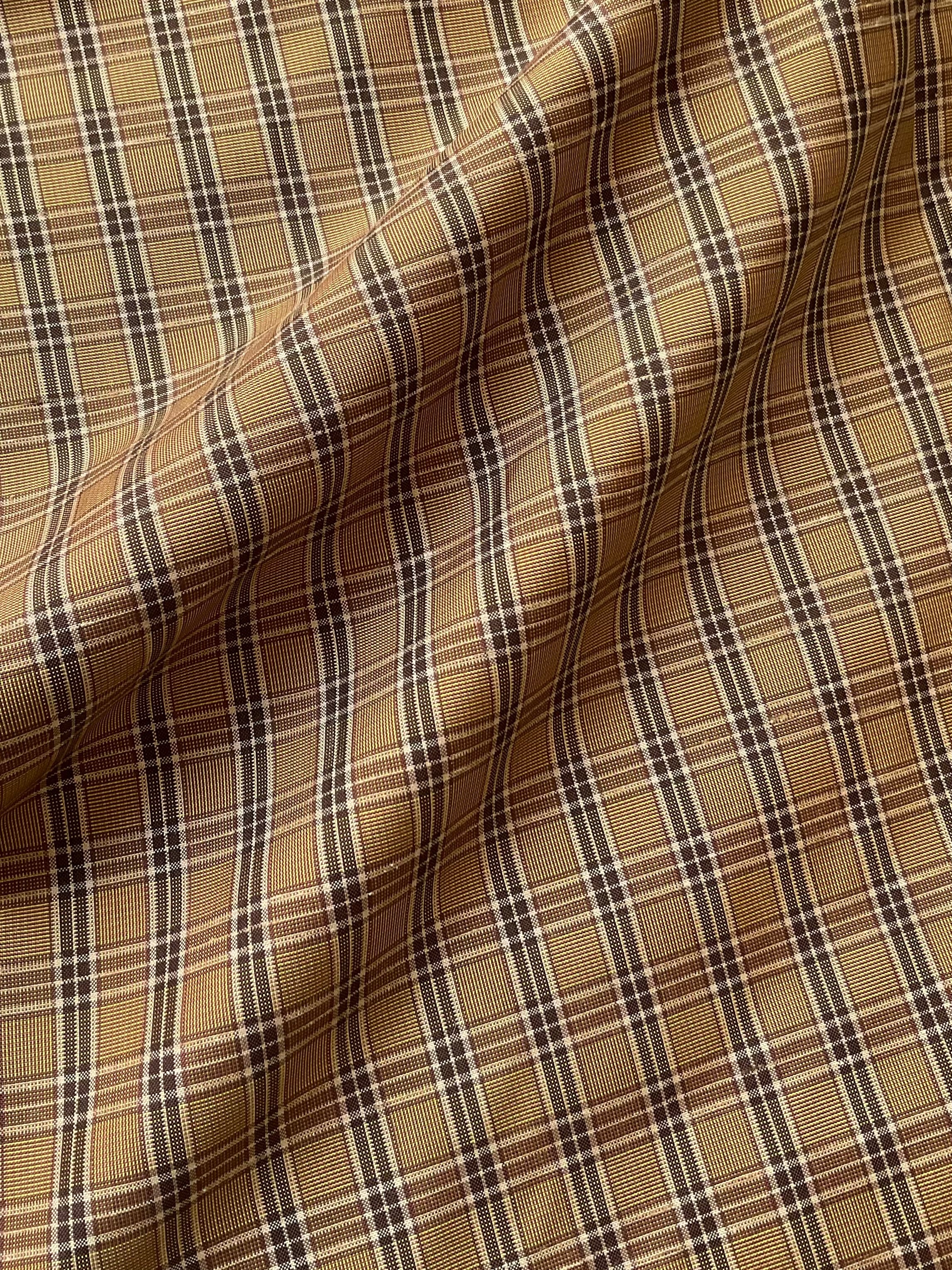 やや金茶寄りの茶色をベースとした格子文のきものです。本場縞大島証紙付き。
