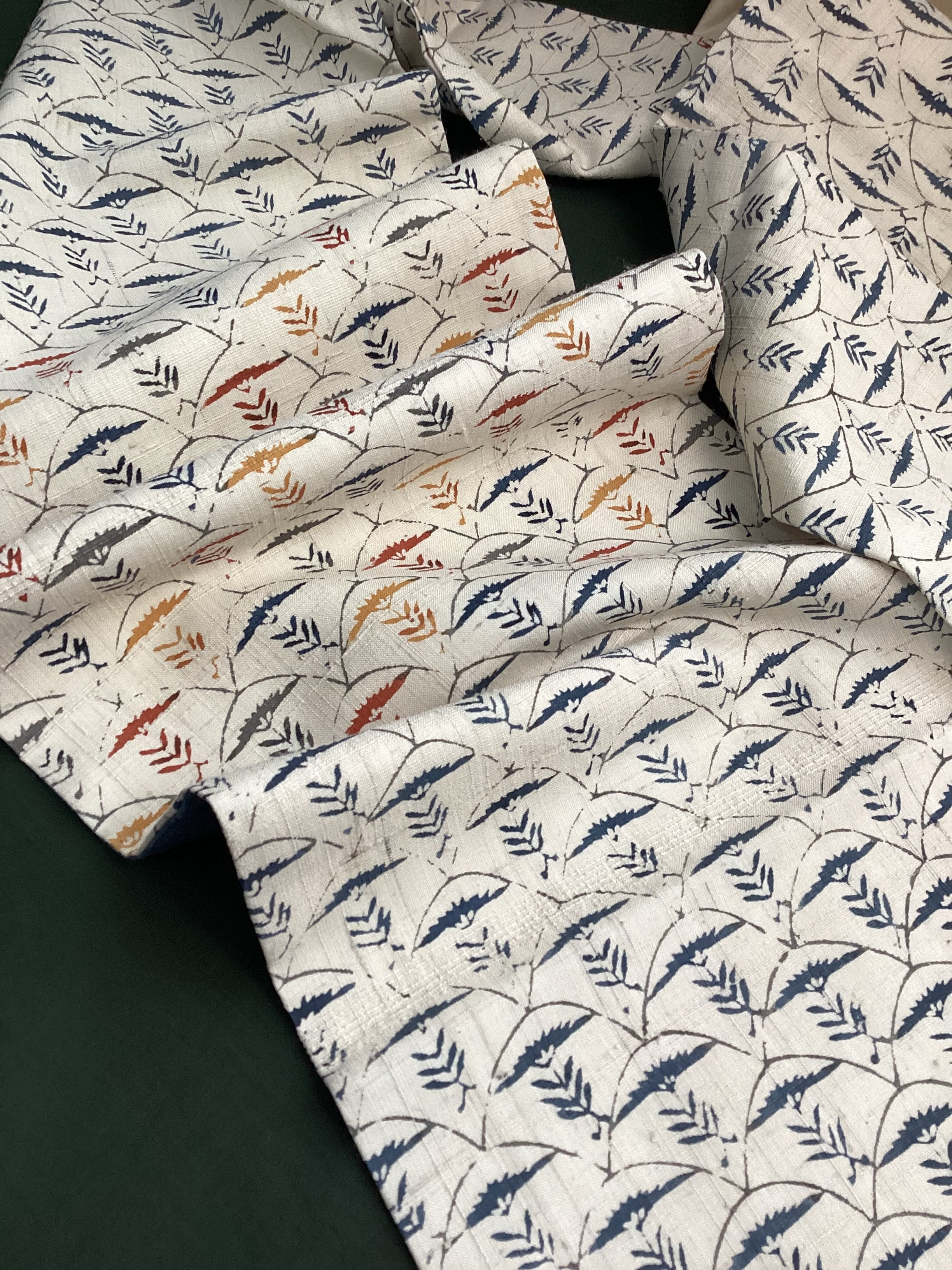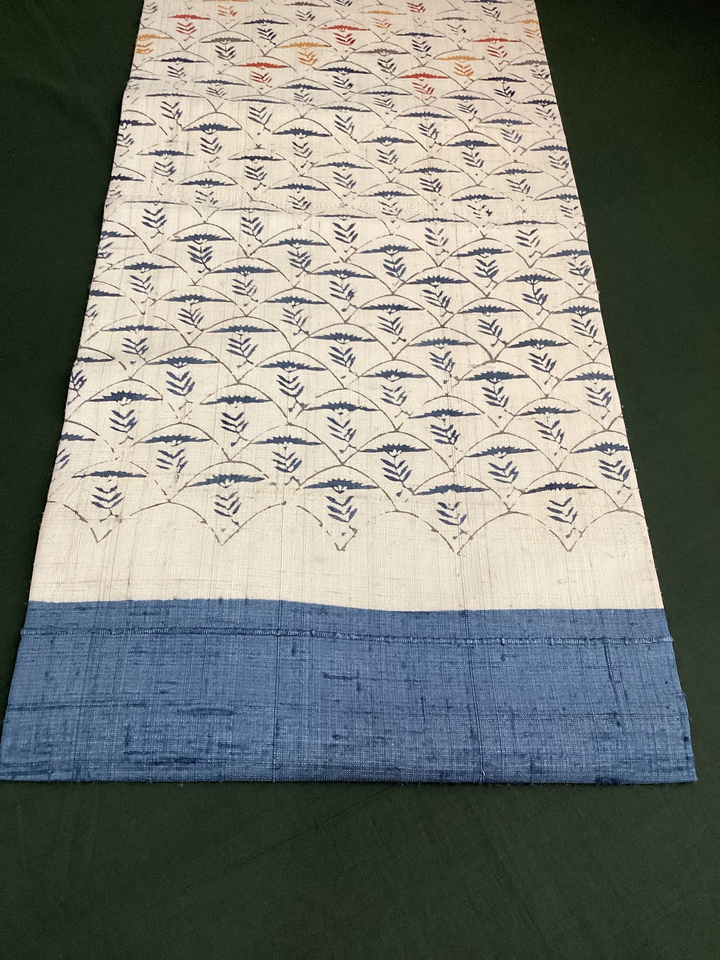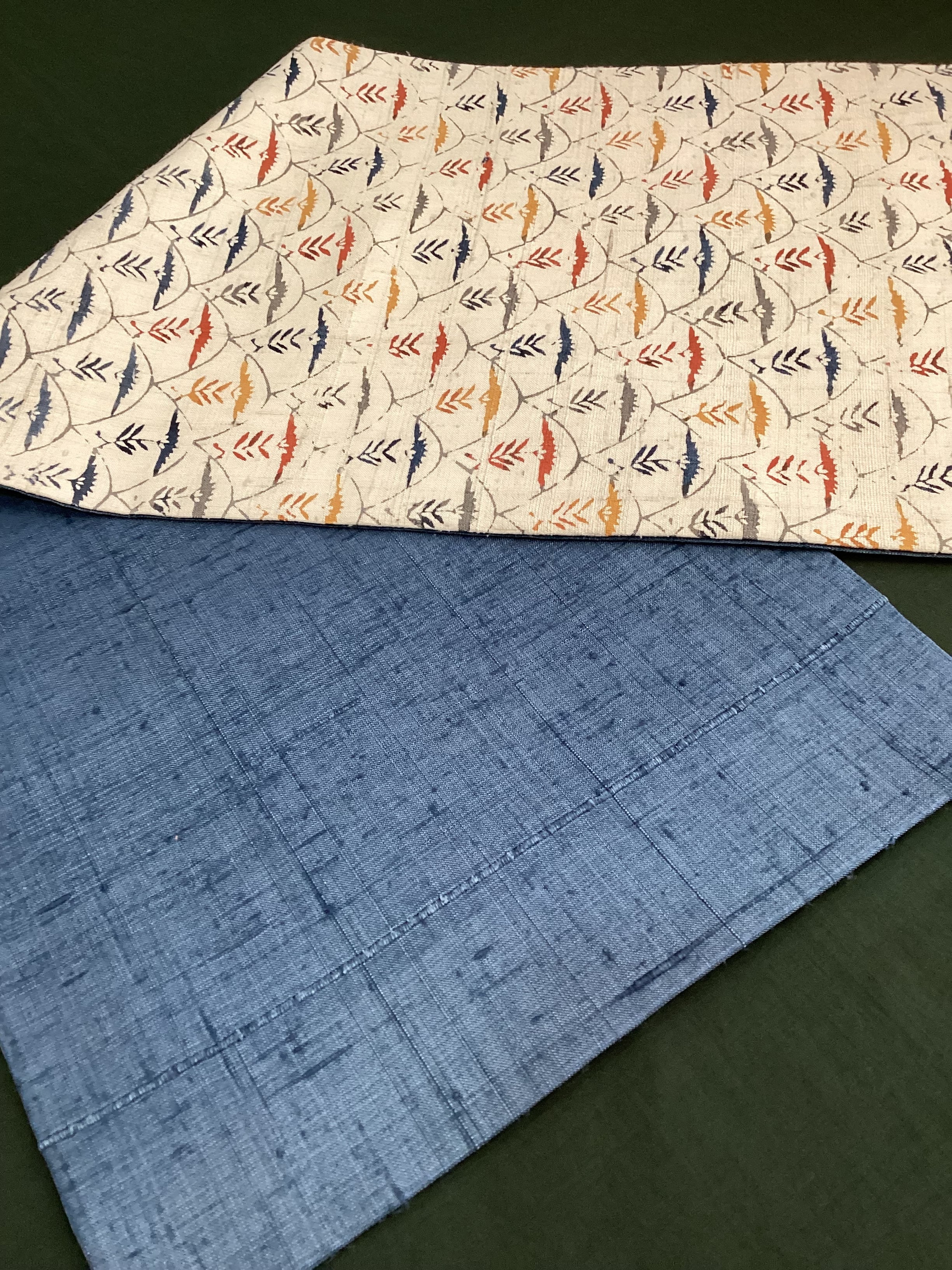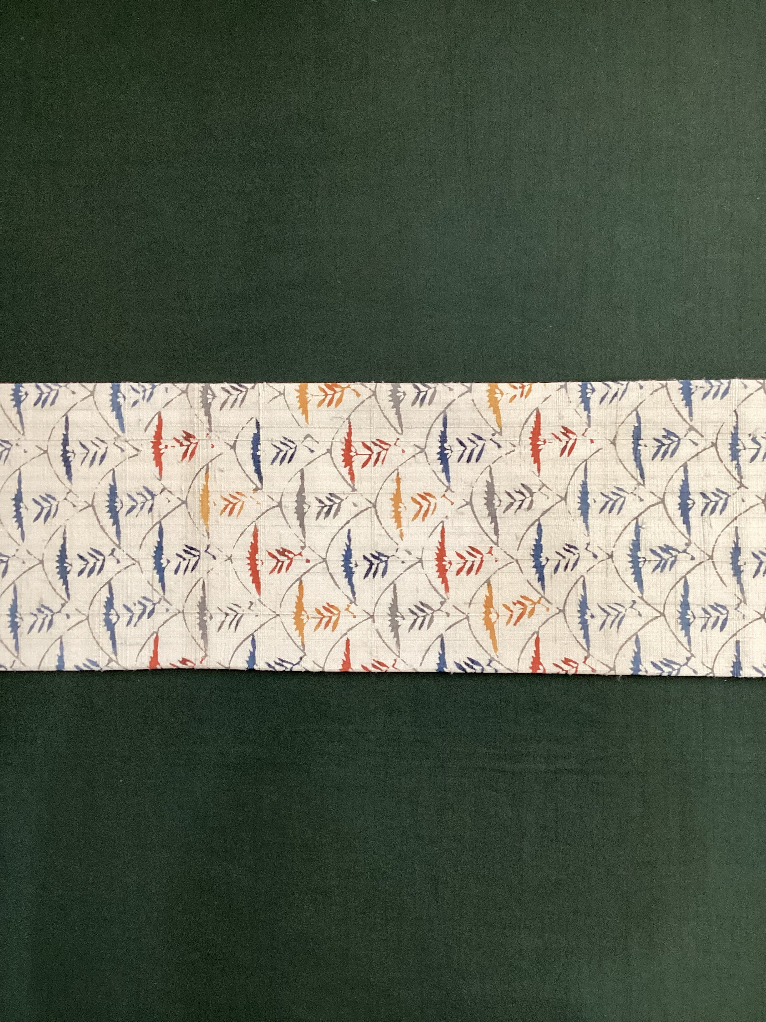 白っぽいベージュの紬地に型染め文様の風合いが味わい深い九寸なごや帯です。青海波のような波の間にアザミでしょうか?菊でしょうか?一輪の草花が並んだモチーフで、前柄とオタイコ部分に黄色や赤で彩色されてアクセントを付けています。ベースに用いられている藍色がタレ先やタレ裏にも配色されて、オタイコに結んだ時にチラ見えする裏の藍色が爽やかで洒落味のあるなごや帯です。柔らかくくたっとした風合いです。
