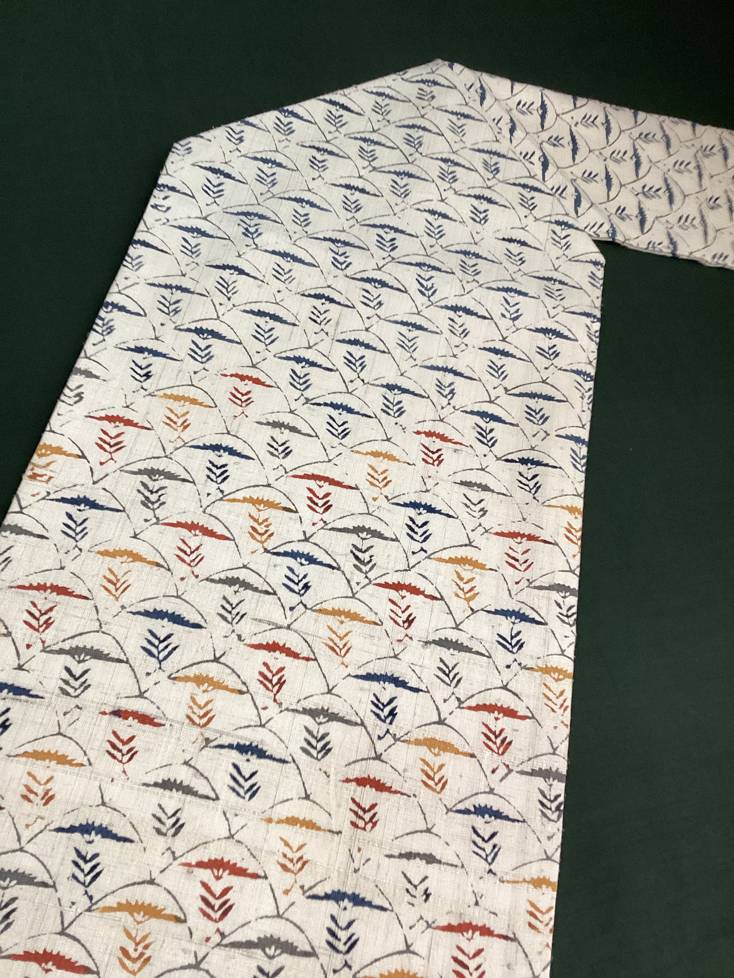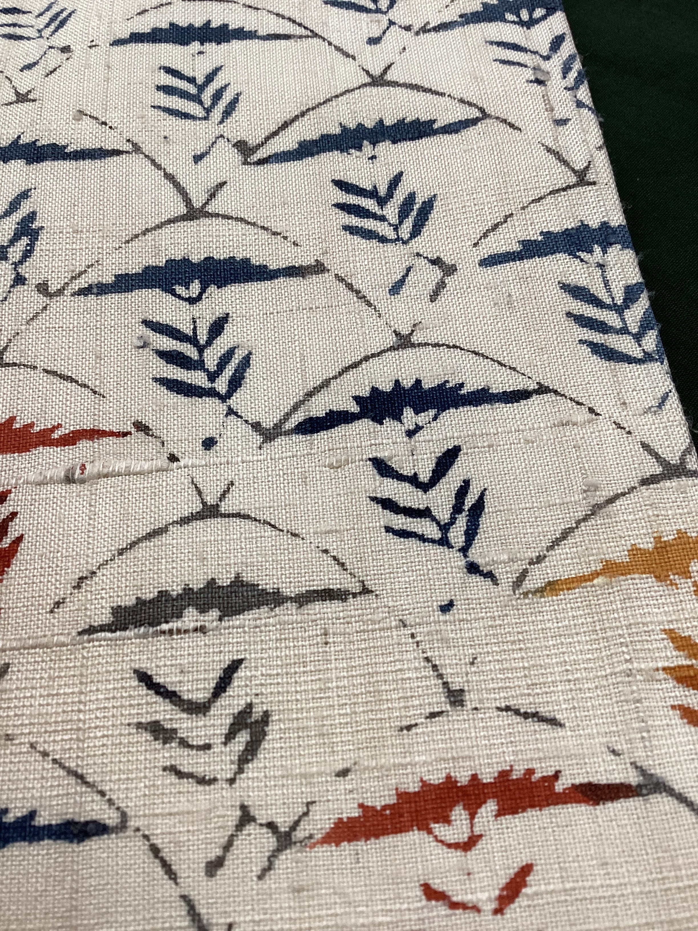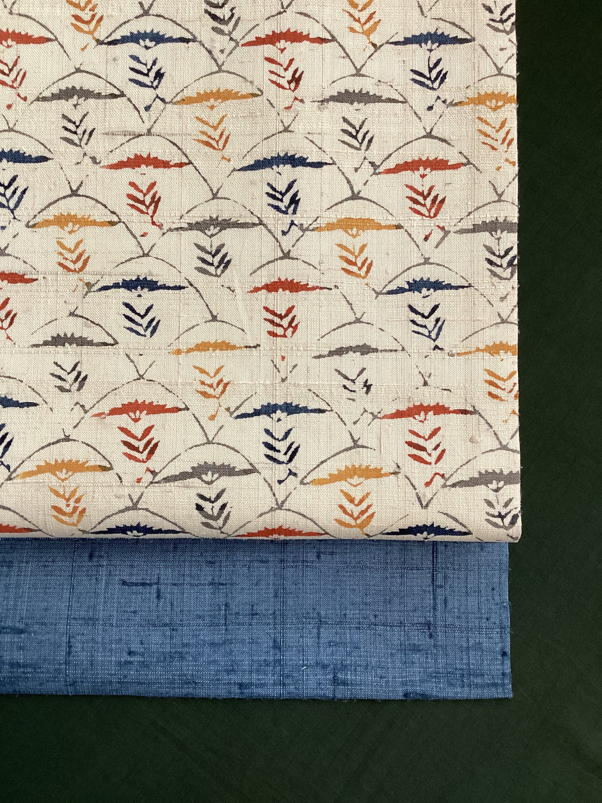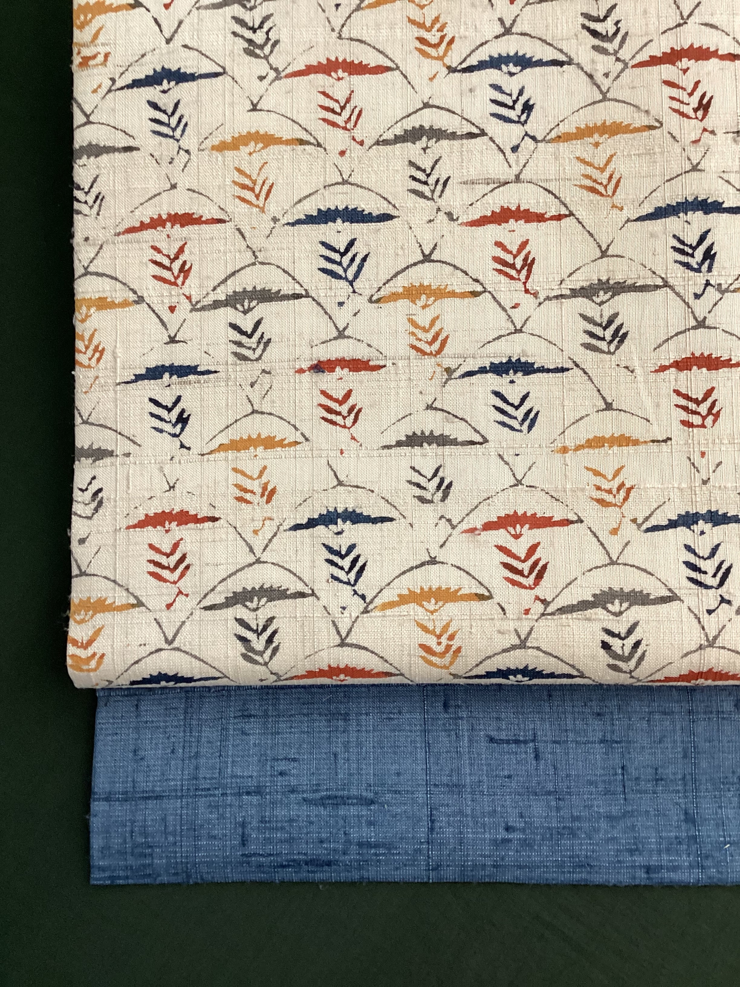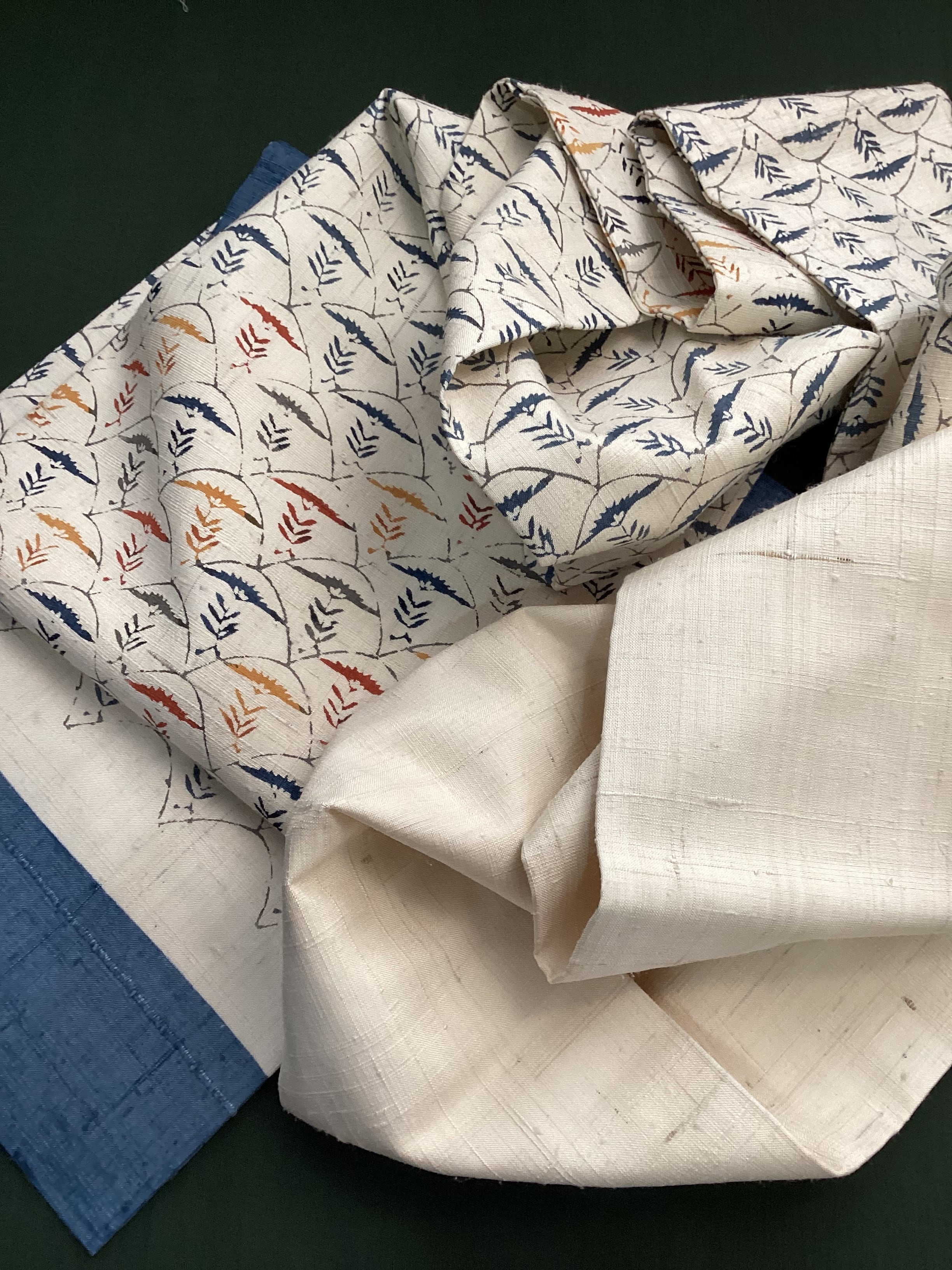 白っぽいベージュの紬地に型染め文様の風合いが味わい深い九寸なごや帯です。青海波のような波の間にアザミでしょうか?菊でしょうか?一輪の草花が並んだモチーフで、前柄とオタイコ部分に黄色や赤で彩色されてアクセントを付けています。ベースに用いられている藍色がタレ先やタレ裏にも配色されて、オタイコに結んだ時にチラ見えする裏の藍色が爽やかで洒落味のあるなごや帯です。柔らかくくたっとした風合いです。