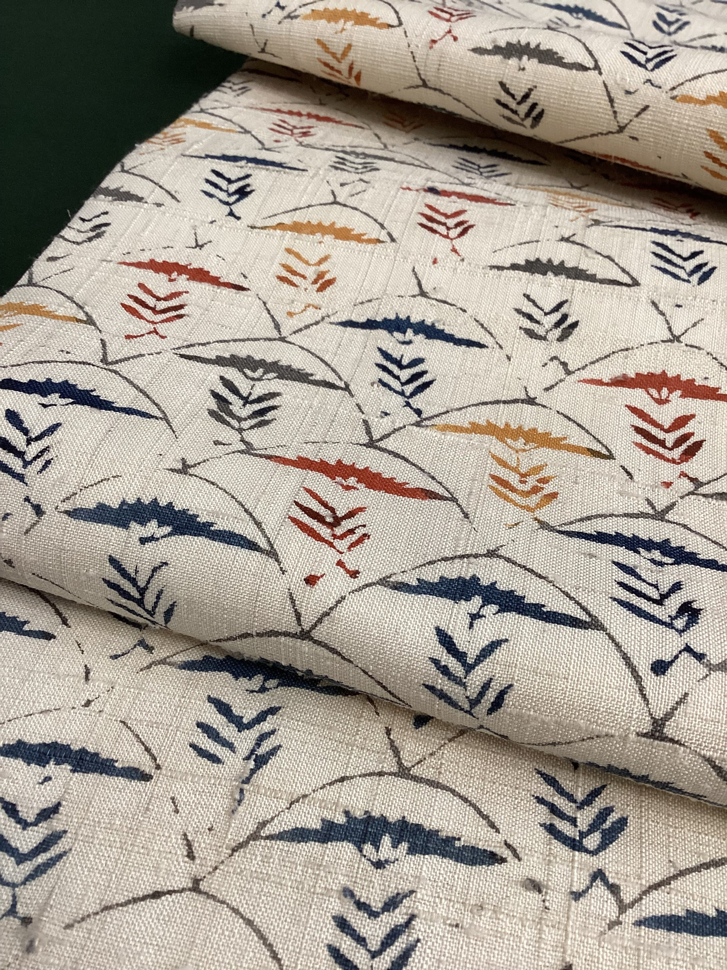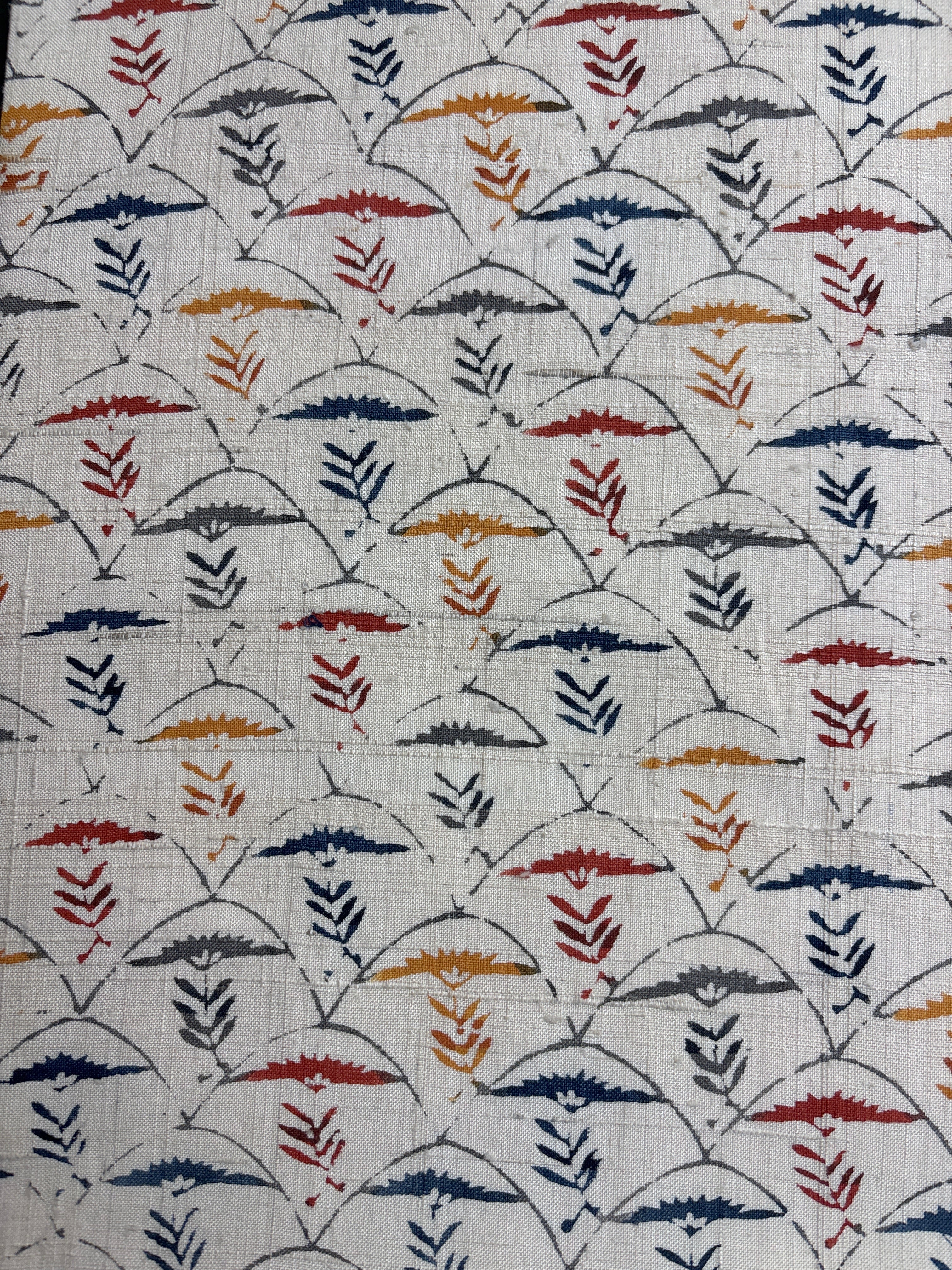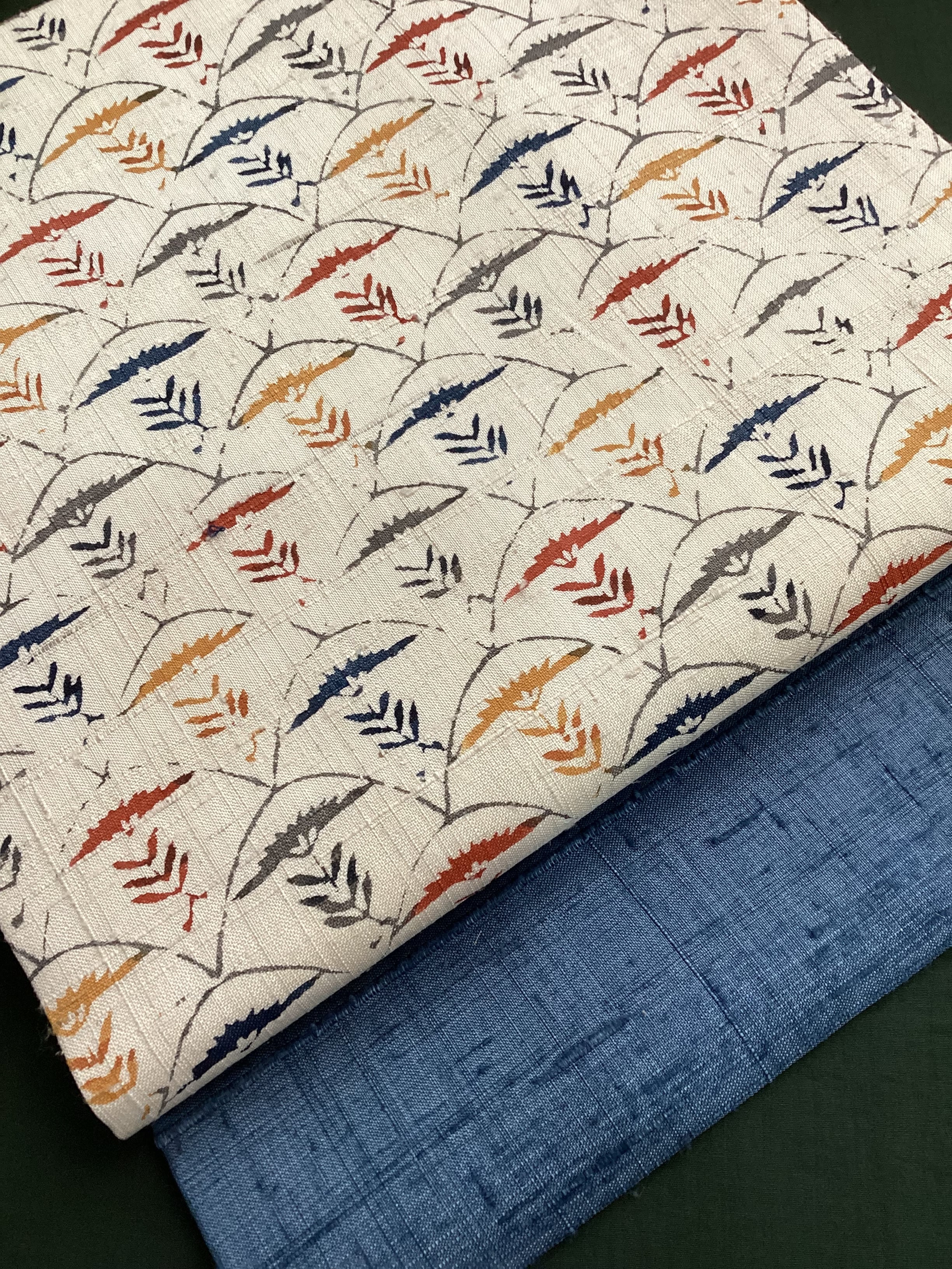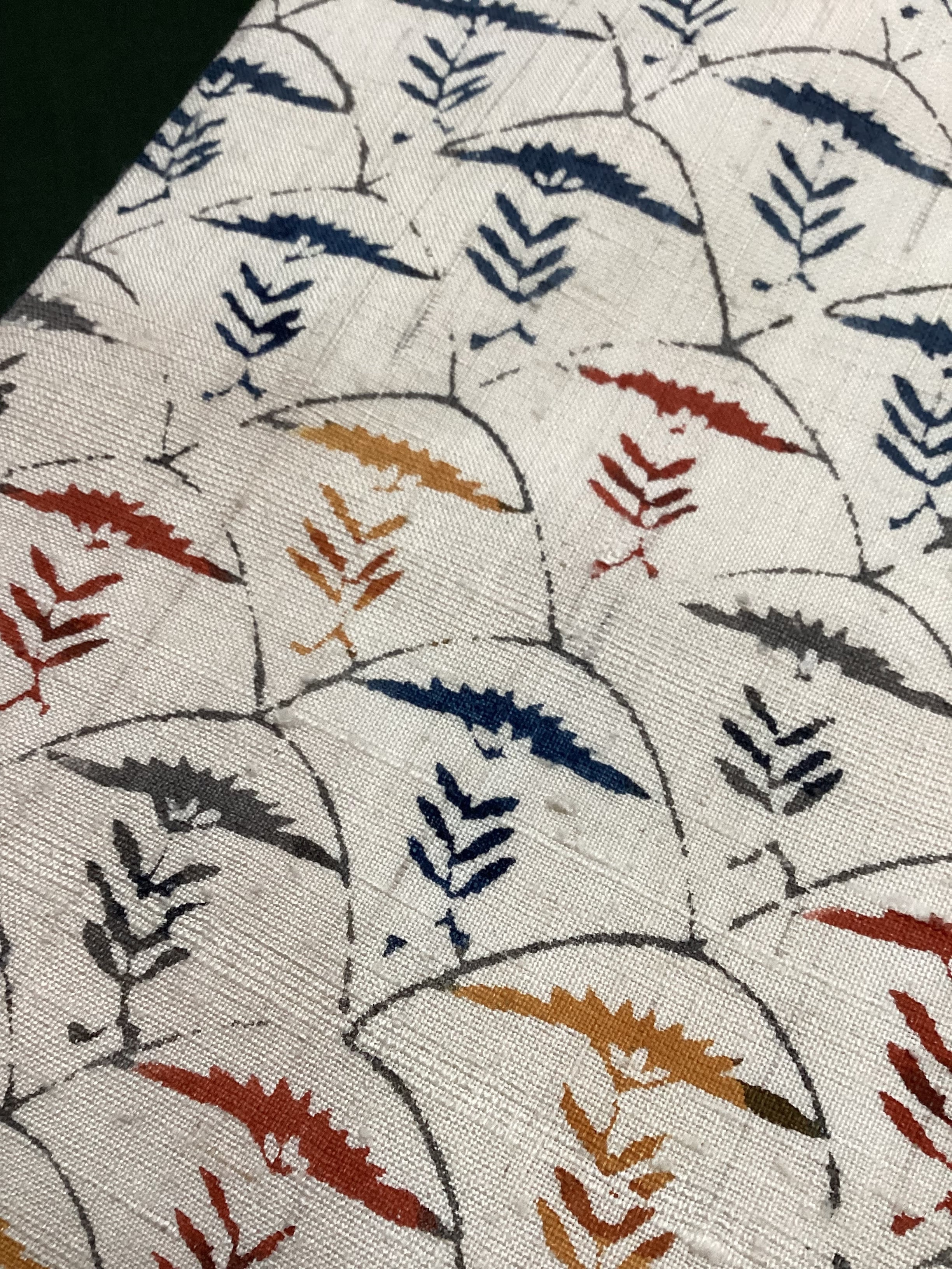 白っぽいベージュの紬地に型染め文様の風合いが味わい深い九寸なごや帯です。青海波のような波の間にアザミでしょうか?菊でしょうか?一輪の草花が並んだモチーフで、前柄とオタイコ部分に黄色や赤で彩色されてアクセントを付けています。ベースに用いられている藍色がタレ先やタレ裏にも配色されて、オタイコに結んだ時にチラ見えする裏の藍色が爽やかで洒落味のあるなごや帯です。柔らかくくたっとした風合いです。