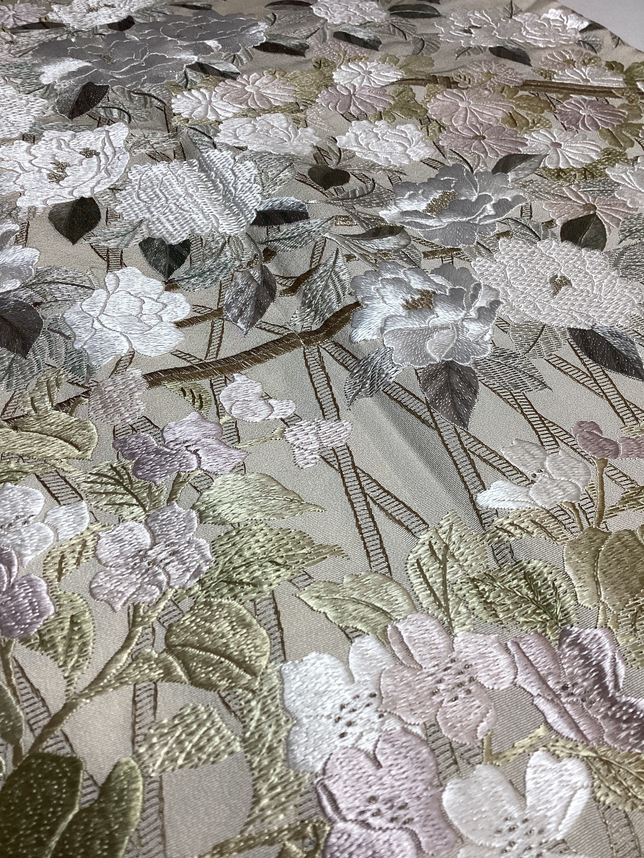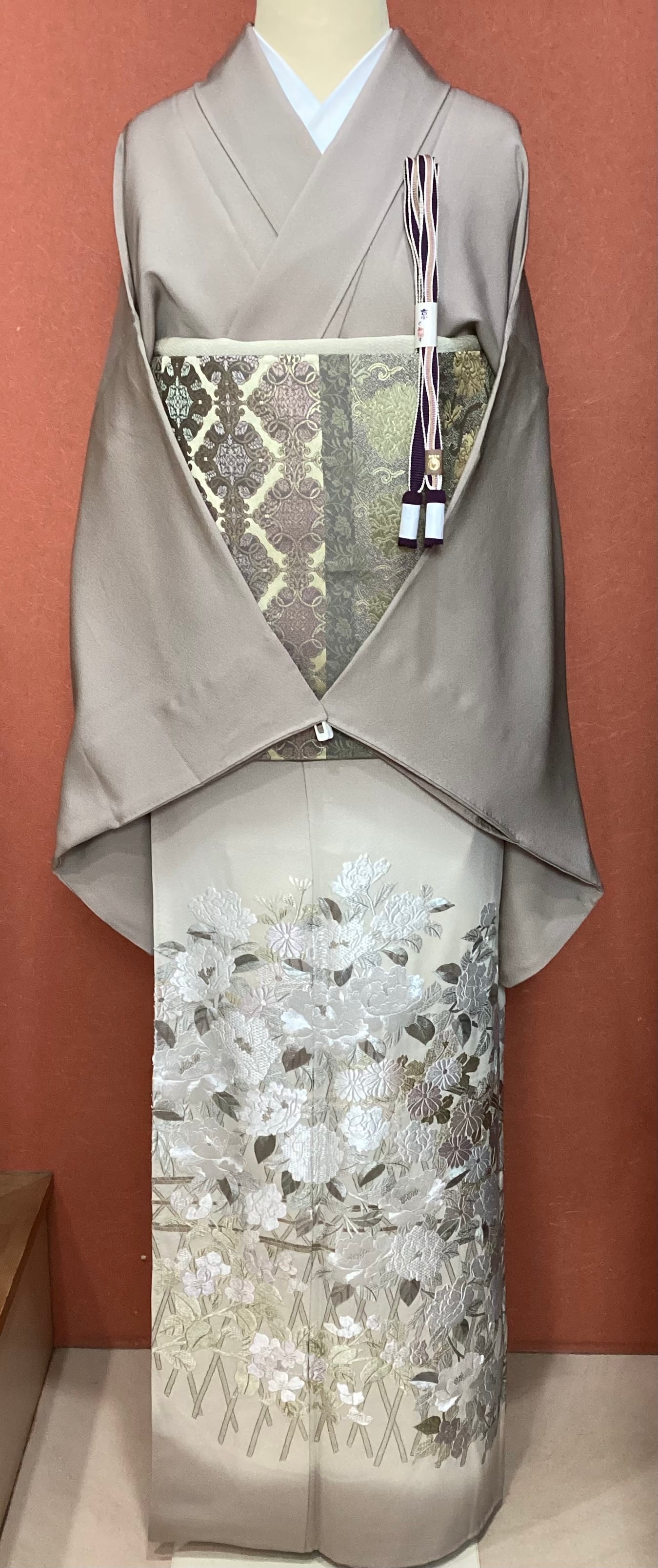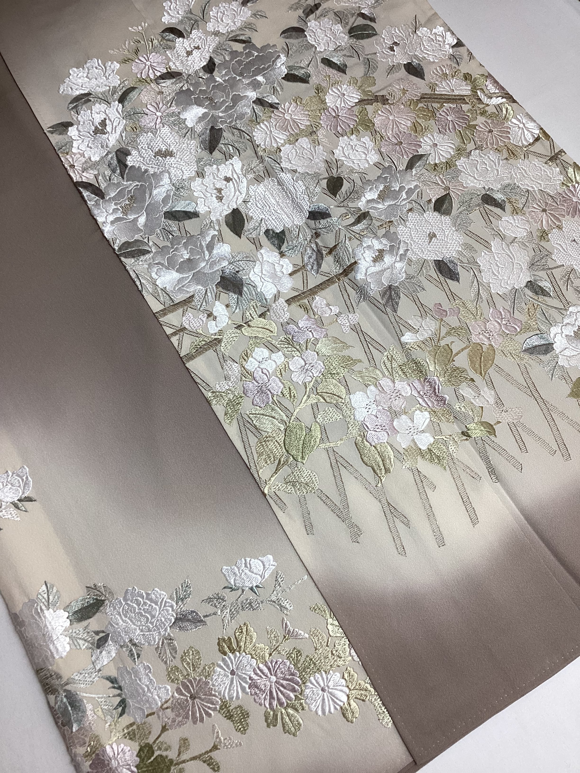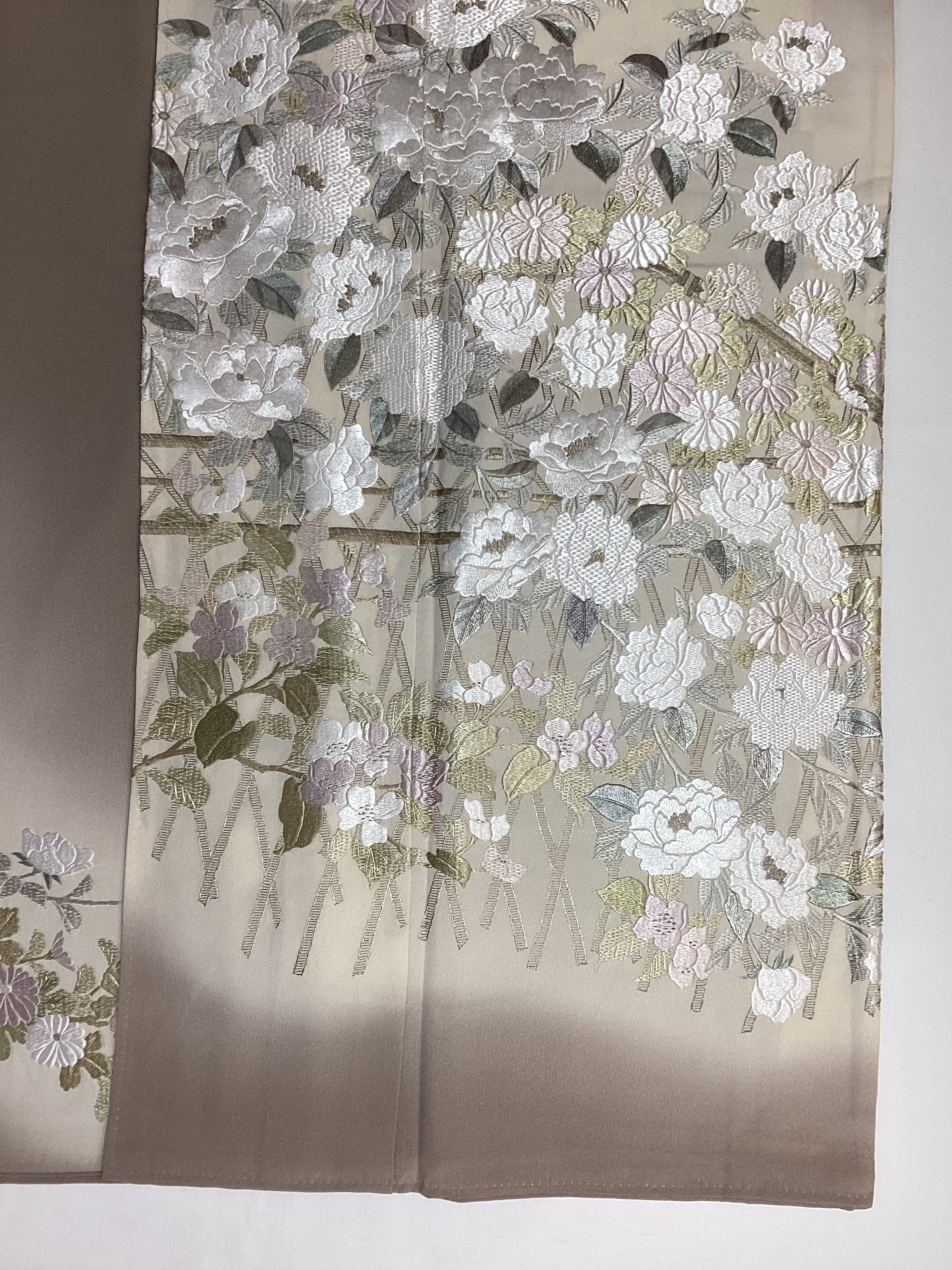 グレージュ色地垣根に四季花刺繍文一つ縫紋色留袖 260325-1