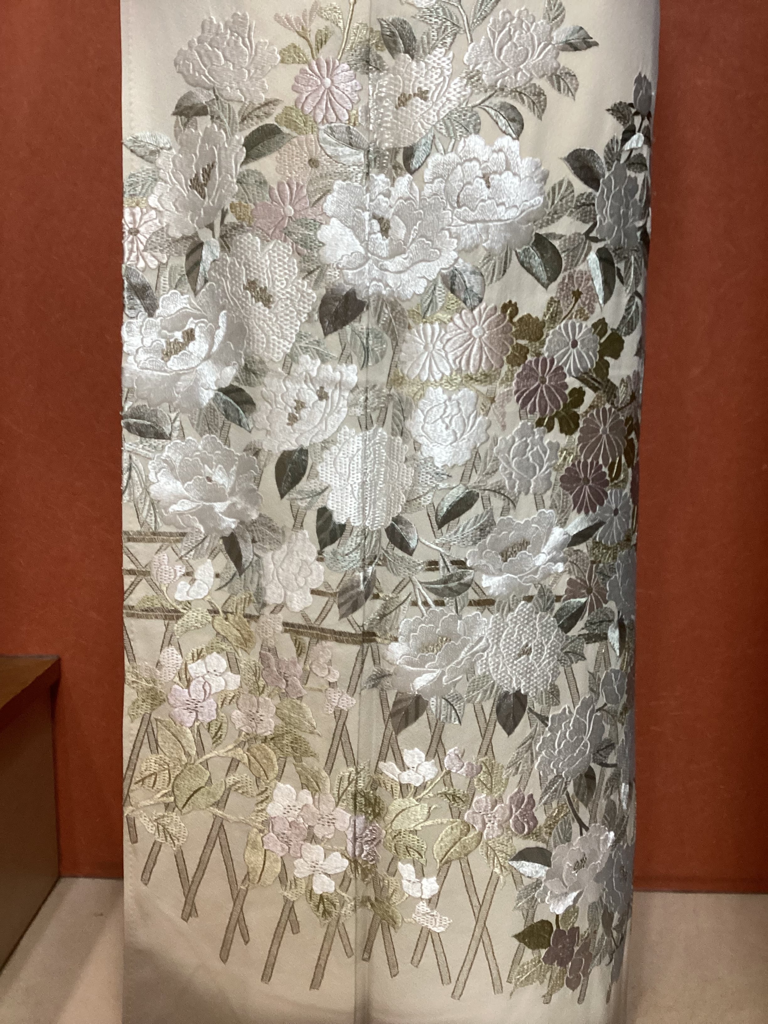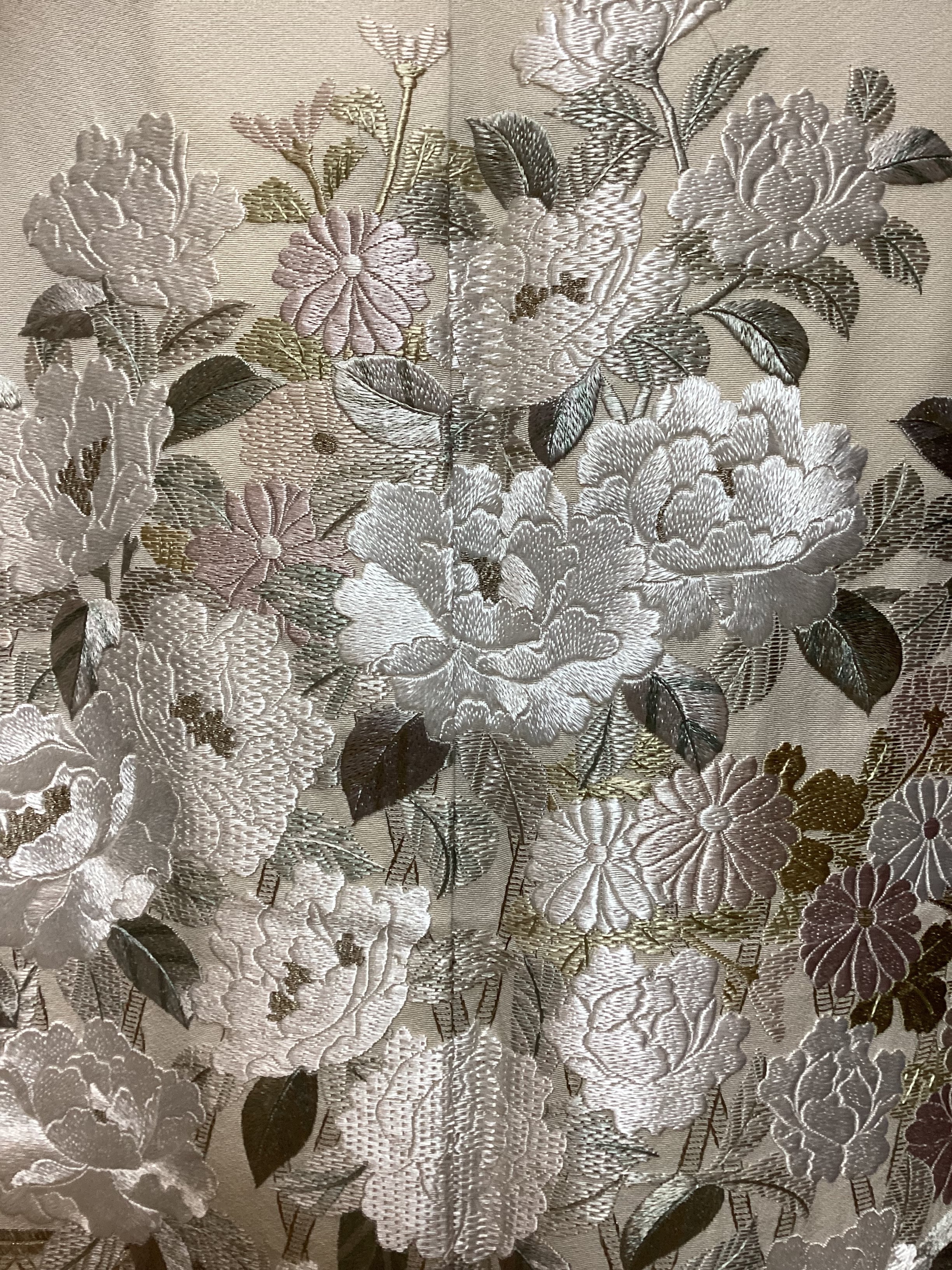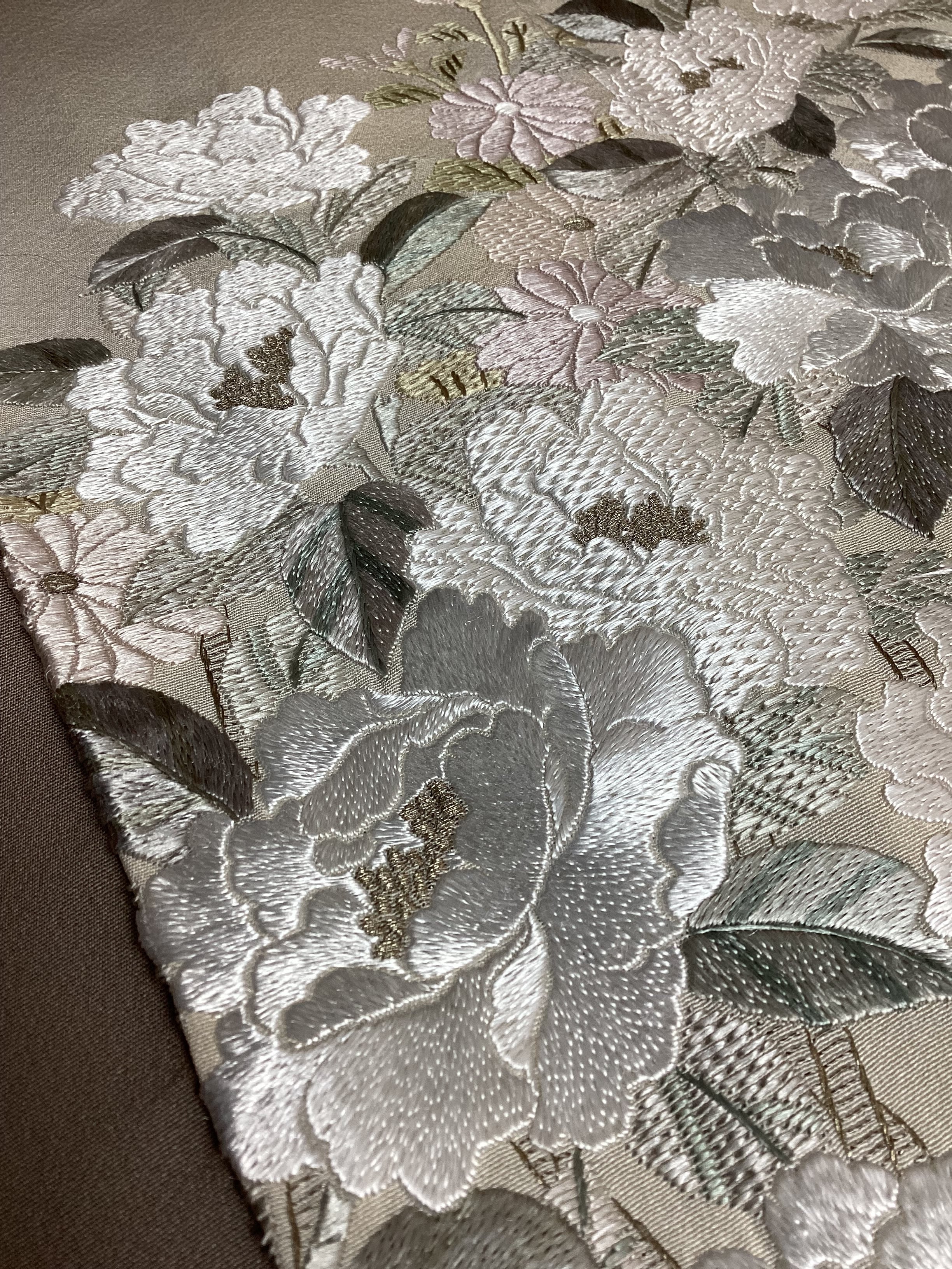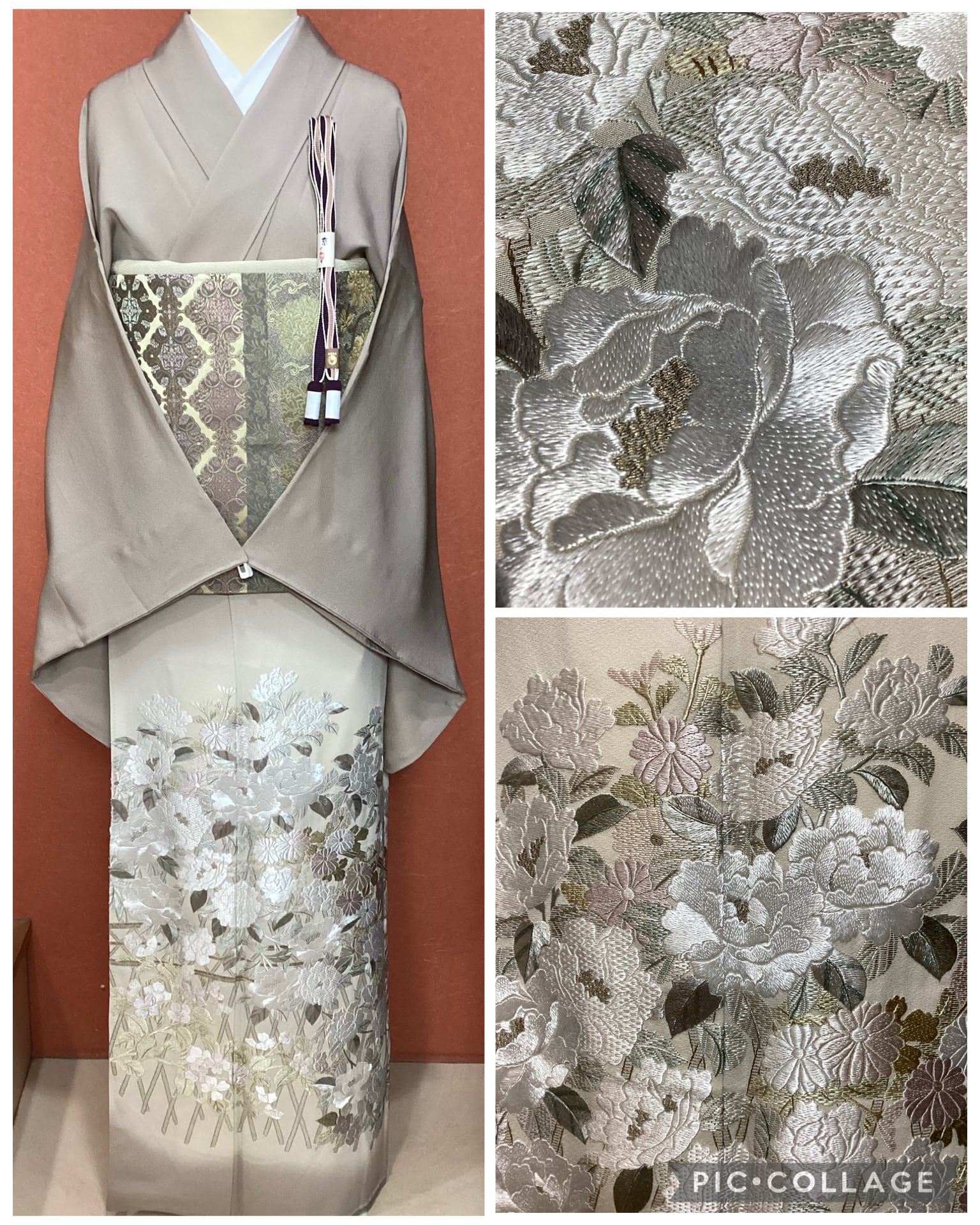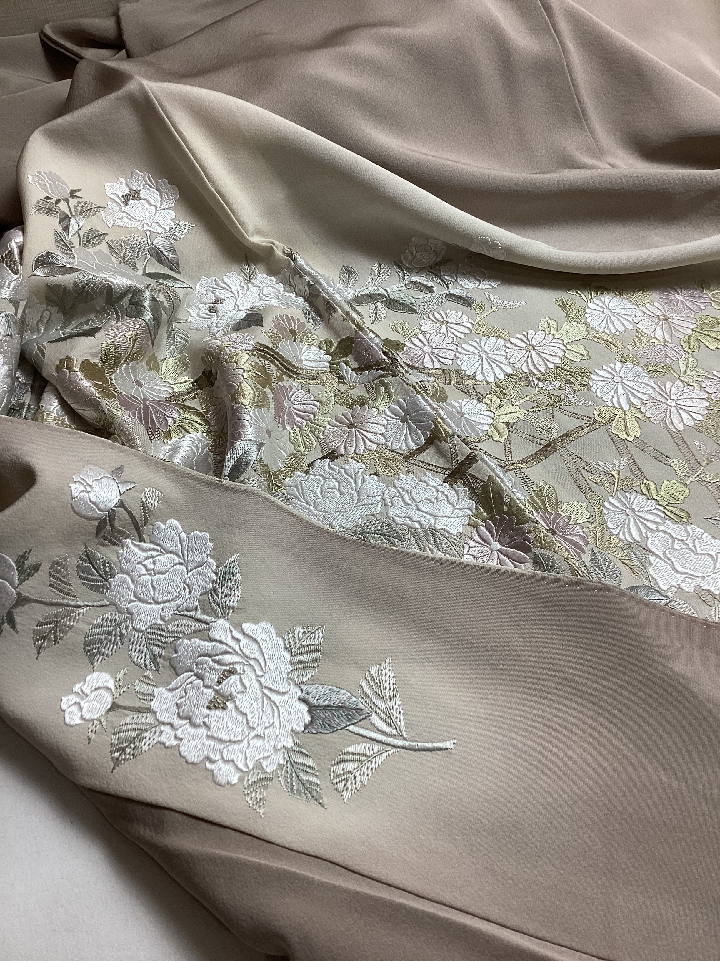 裾文様に大変美しい刺繍が施された色留袖のご紹介です。桜色がかった赤みを感じるグレーベージュ地、ニュアンスカラーで上品なお色味です。その上に白をベースとした艶やかな糸で、牡丹、桜、菊といった日本の四季を彩る花々がたっぷりと贅沢に重なるように刺繍されております。刺繍の技法も様々なステッチを使って表現されております。八掛にも刺繍入りの色留袖がお値打ち価格となってございます、是非この機会にいかがでしょうか?