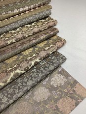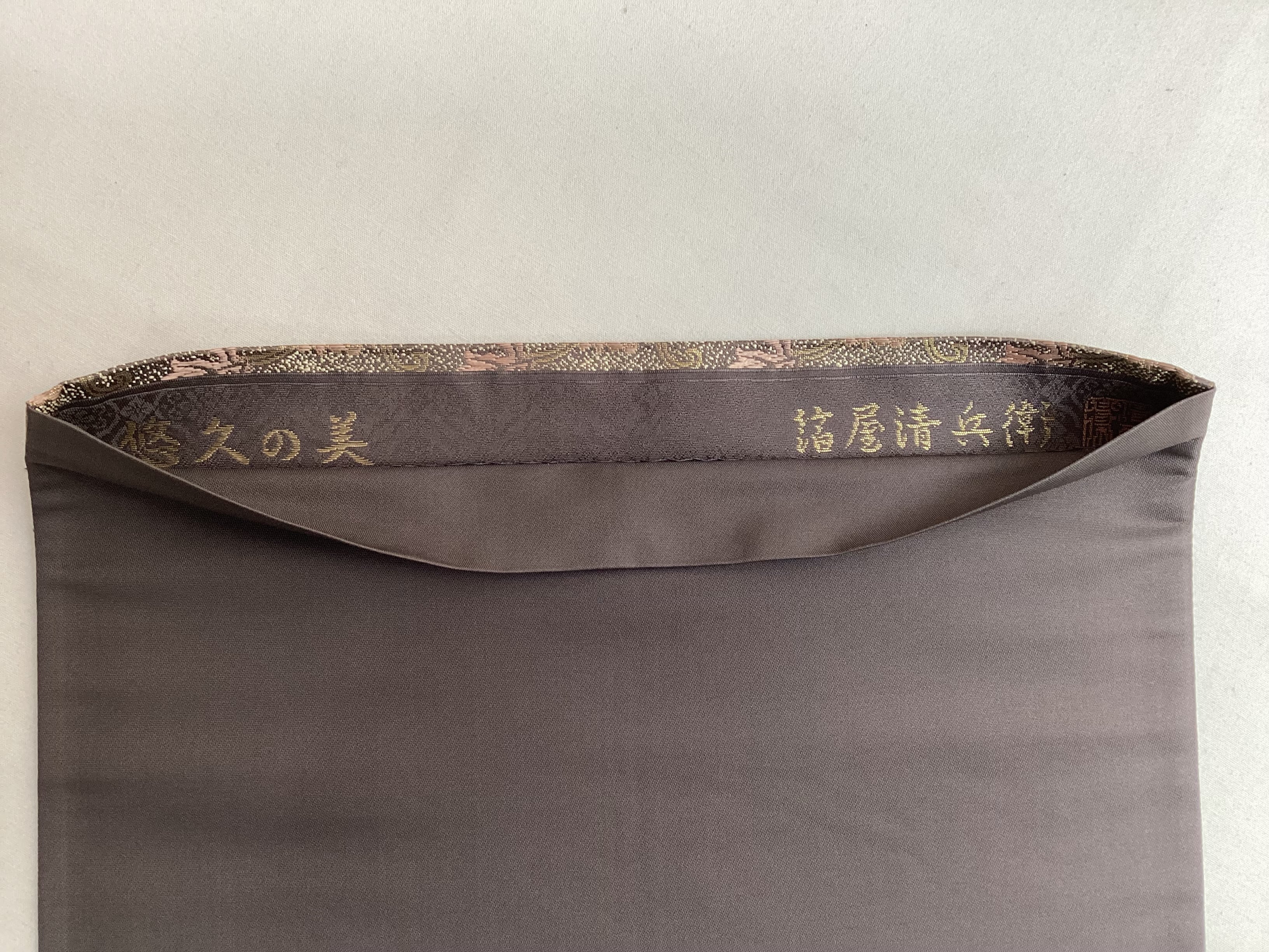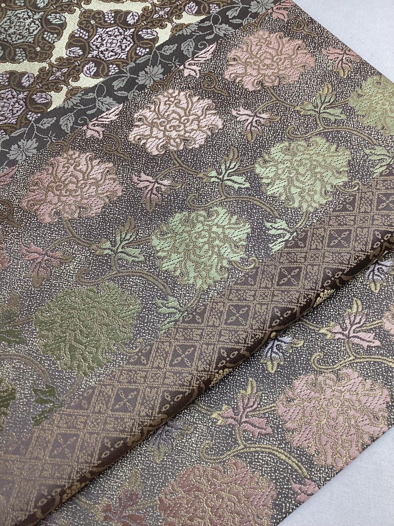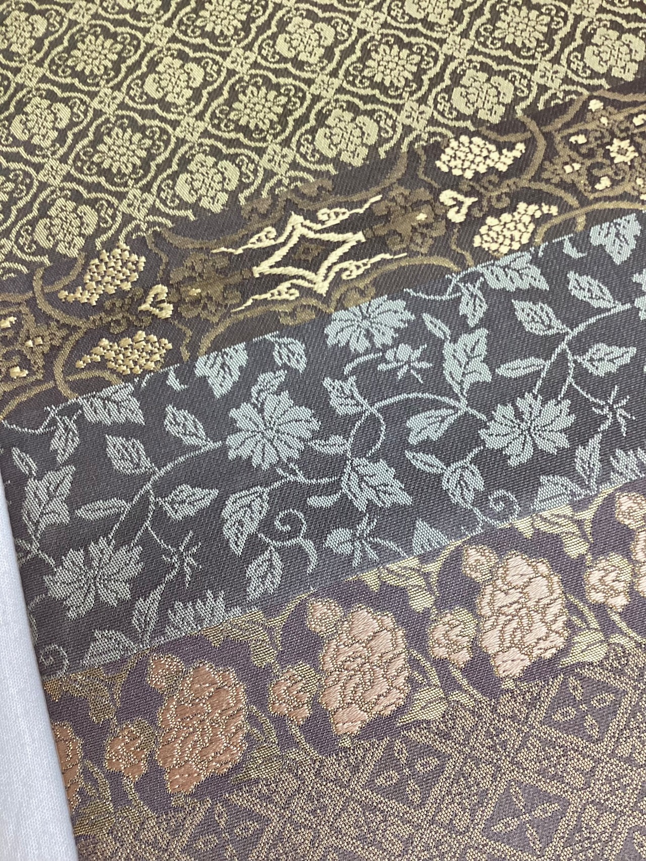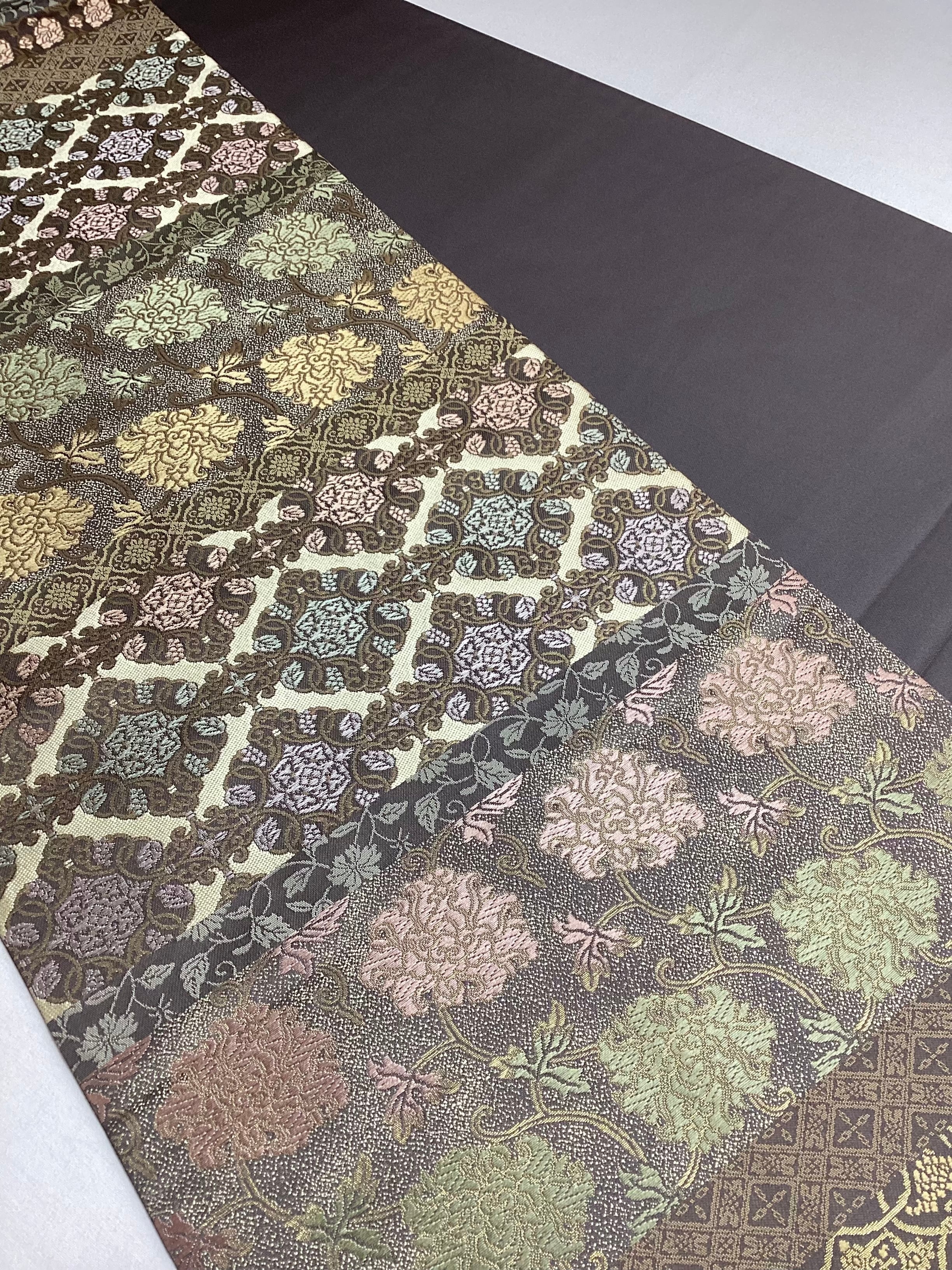 京都西陣の機元【箔屋清兵衛・陰山織物】の袋帯です。【箔屋清兵衛】の帯は、柔らかくしなやかな地風で締めやすく、また軽くて扱い安いので、大変人気のあるお品です。こちらの帯は名物裂文様が横段に全通柄で織られており、柄出しに悩まず、着物ビギナーさんでも扱いやすい袋帯です。訪問着、附下、色無地にコーディネートして、フォーマルなお席やお子様の入卒の式典列席、お茶席などにいかがでしょうか。