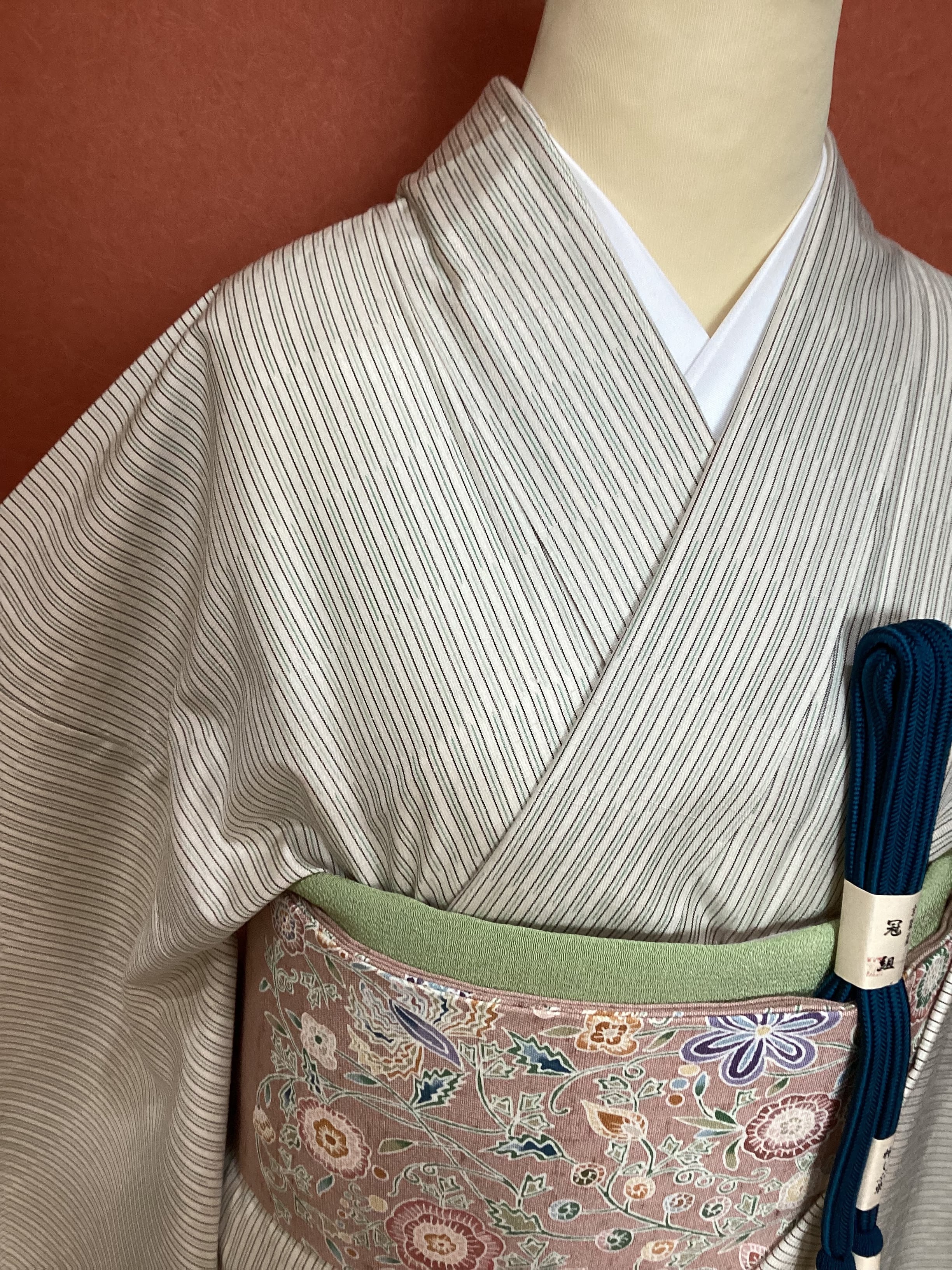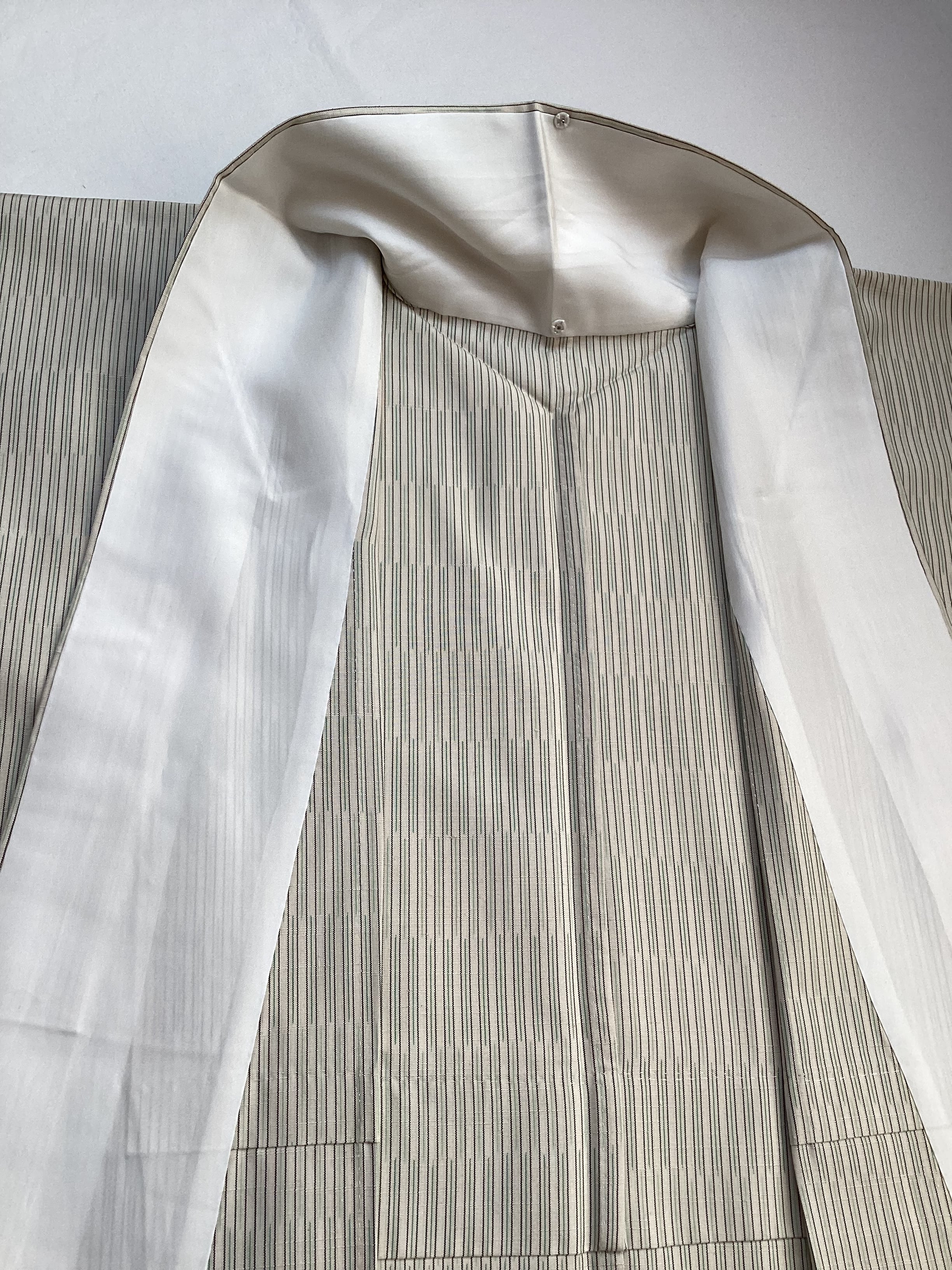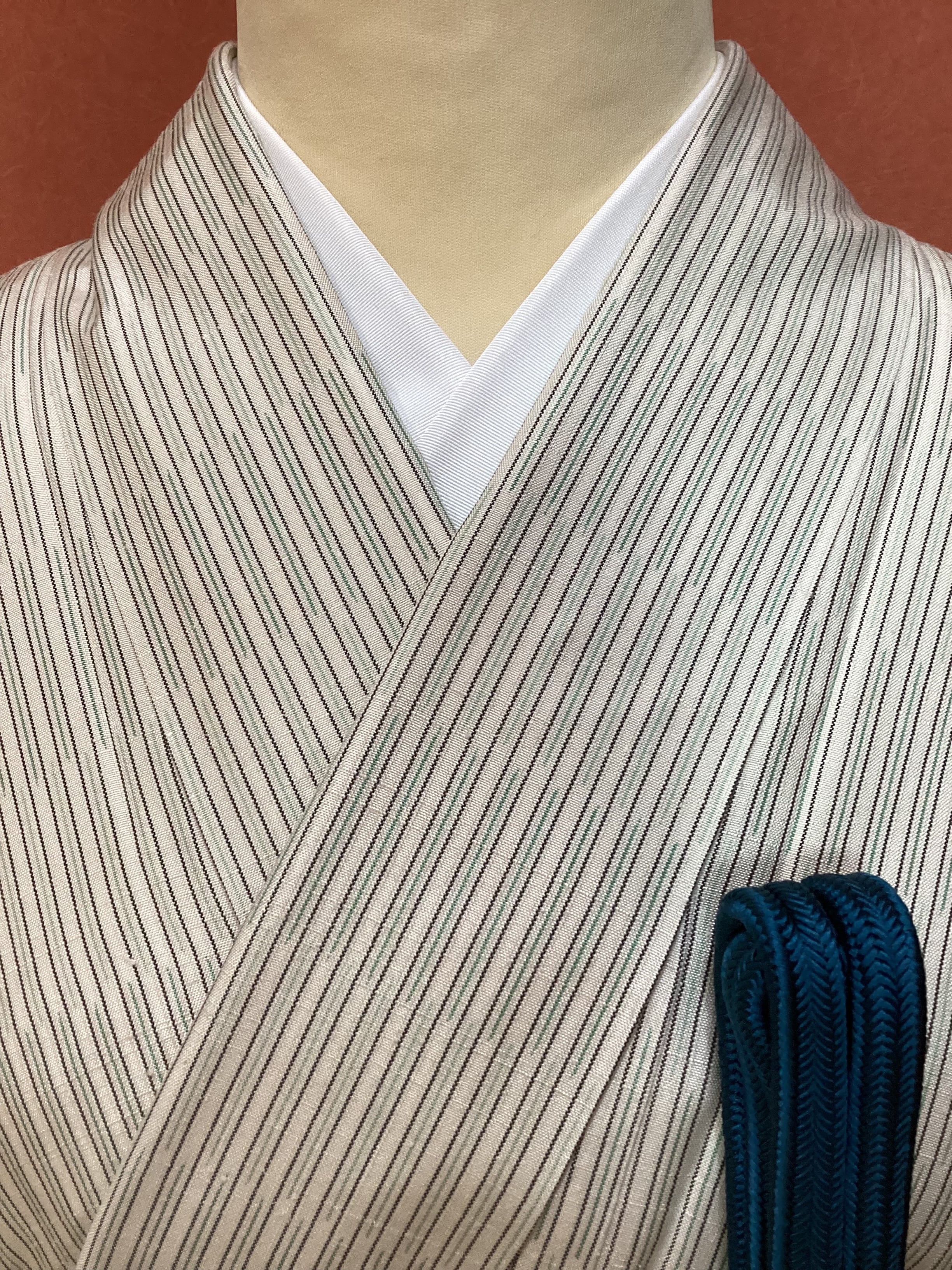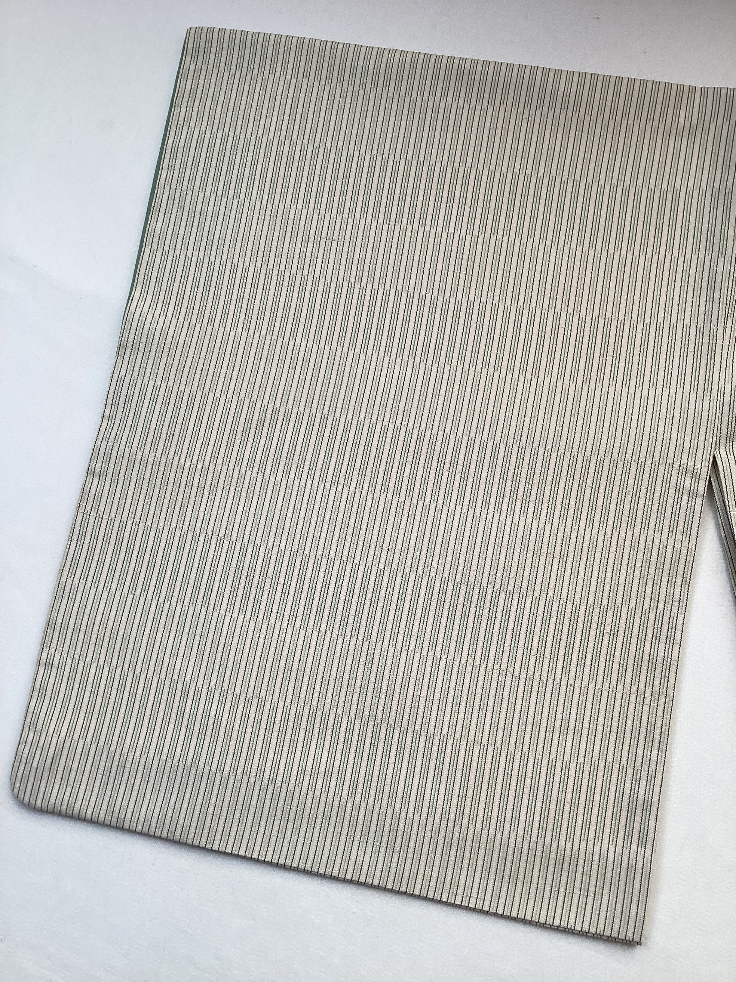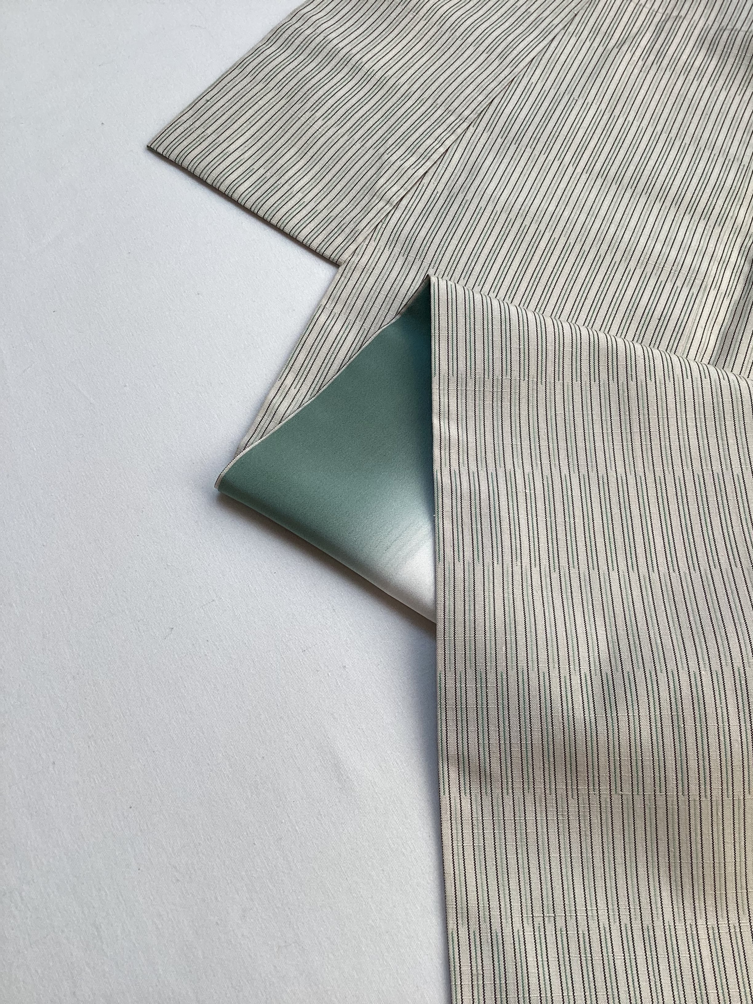 【胴抜き仕立て】生成りにミントグリーン縦縞文紬 260326-1