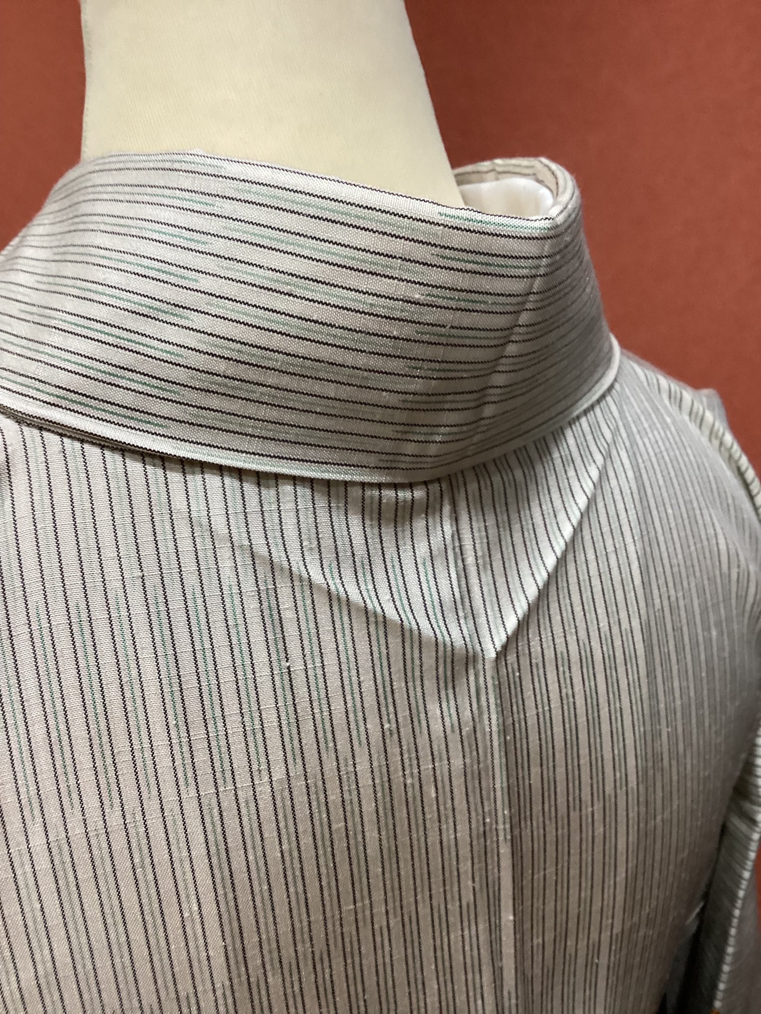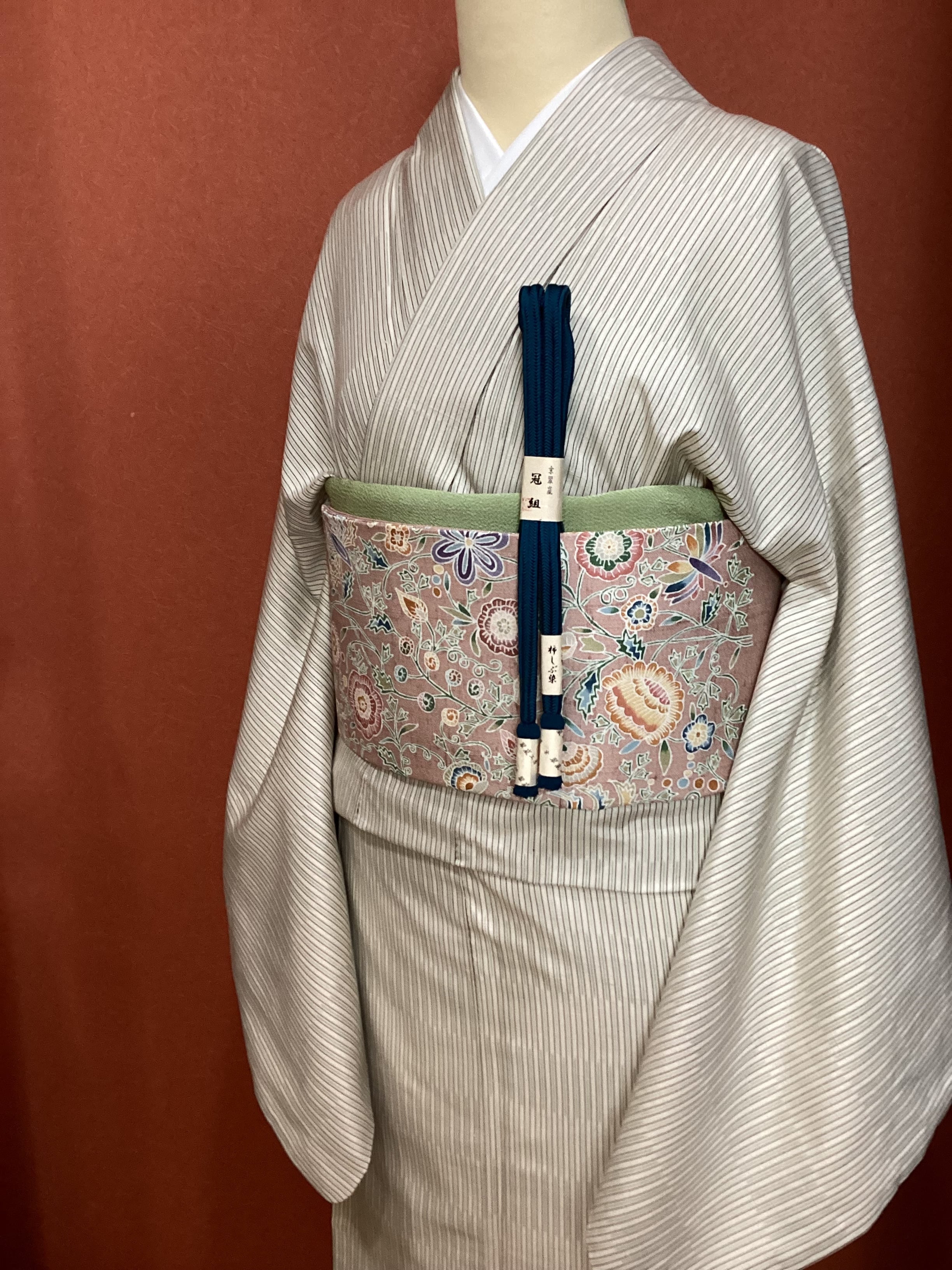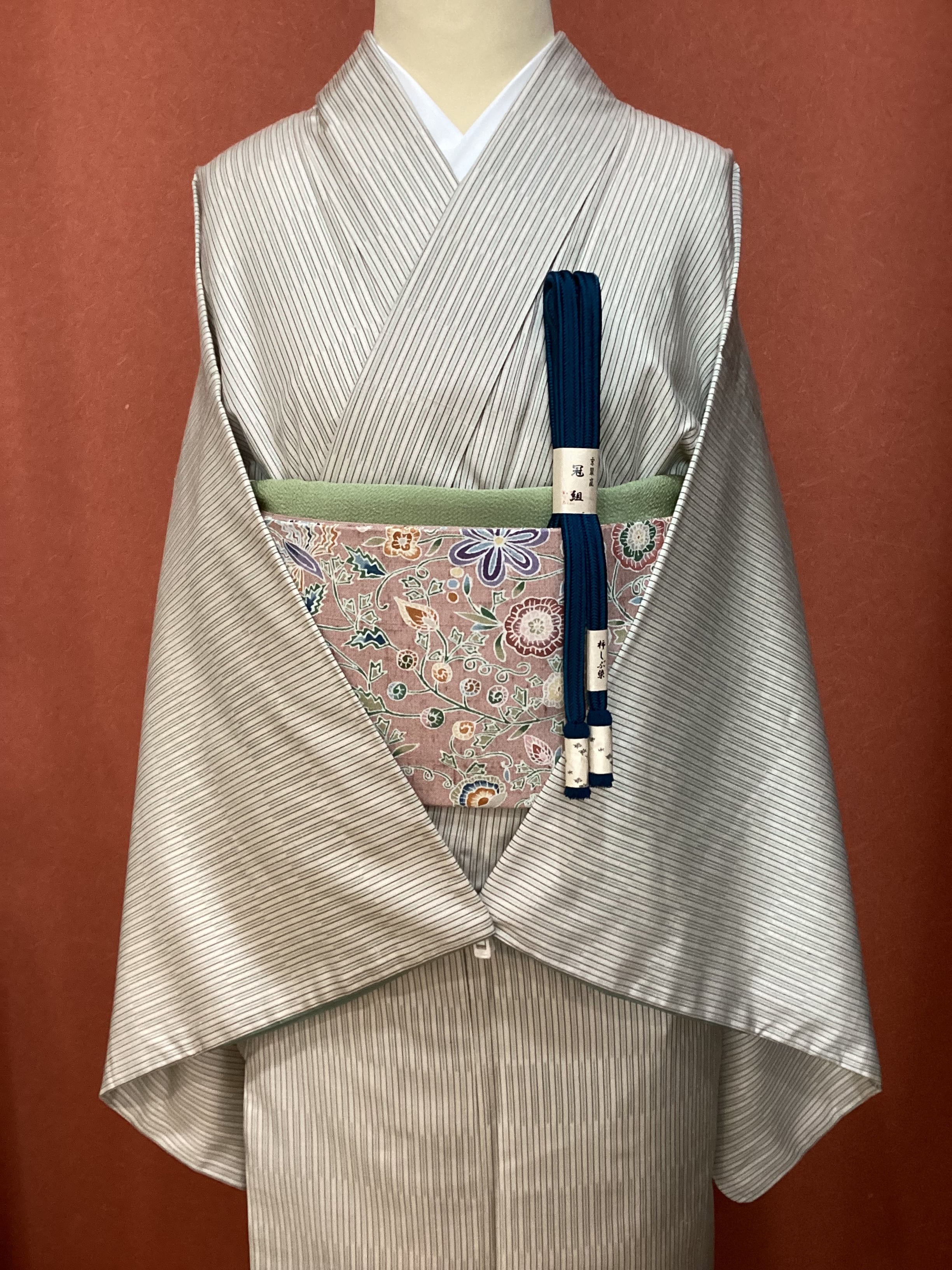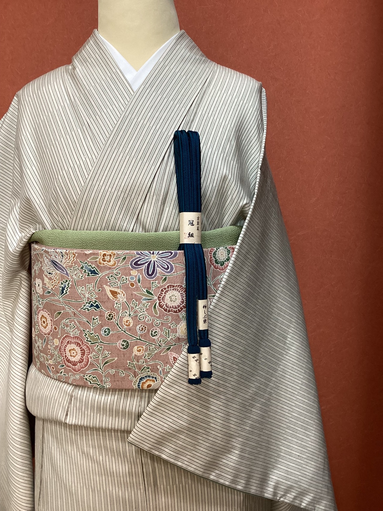 生成りにミントグリーンの縦縞文様が織られた爽やかなお色目の紬きものです。グリーンの八掛が効いて洒落味がございます。上半身に胴裏を省いた【胴抜き仕立て】で仕立てられているので、季節の変わり目や、暑がりの方にオススメする一枚です。身丈が十分ございますので、トールサイズをお探しの方にいかがでしょうか。