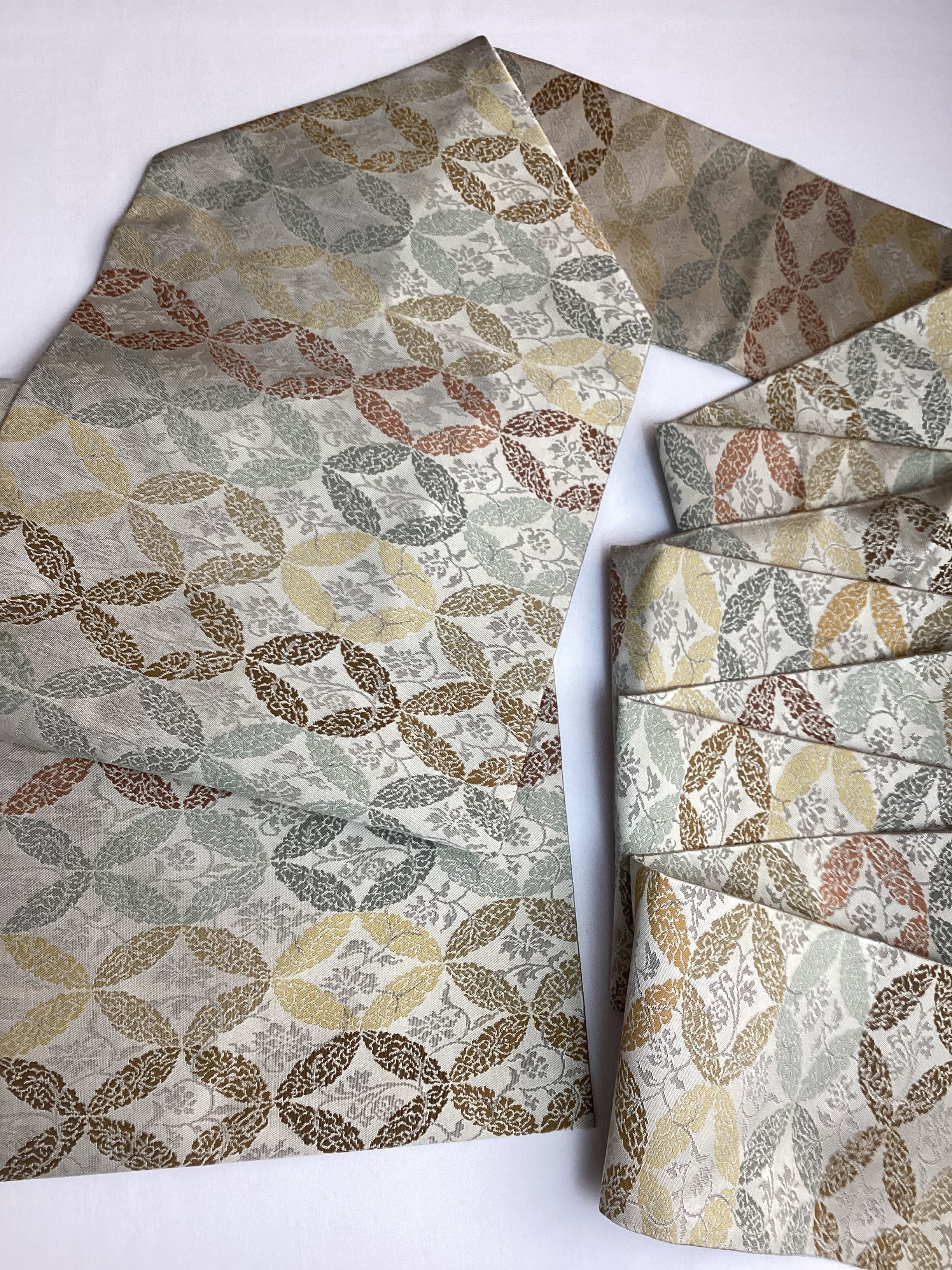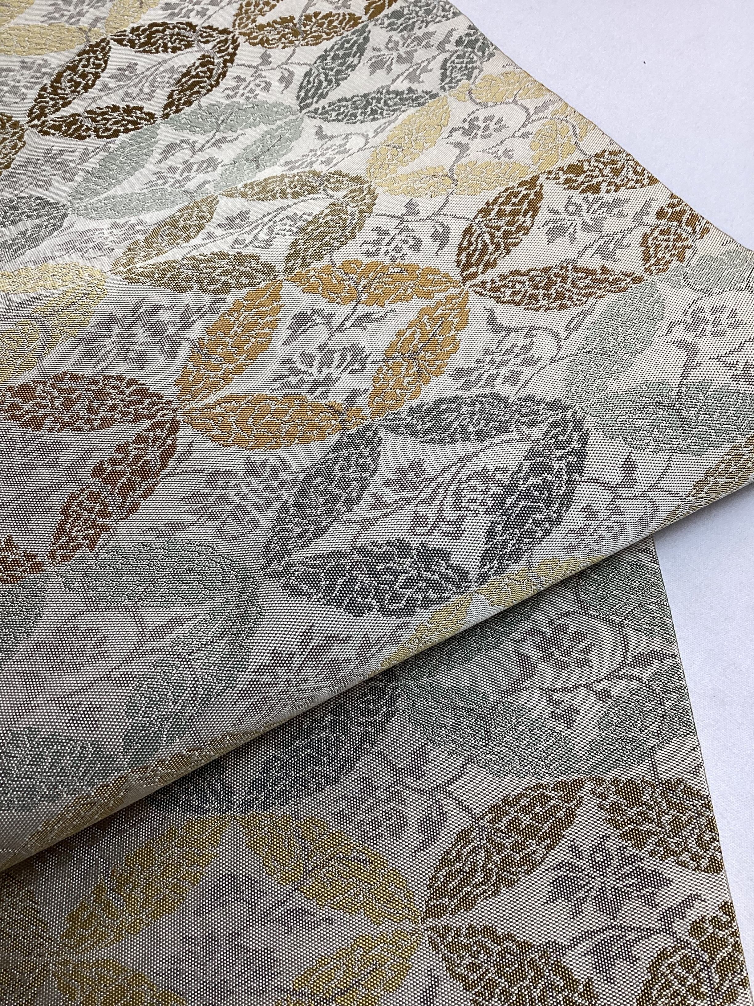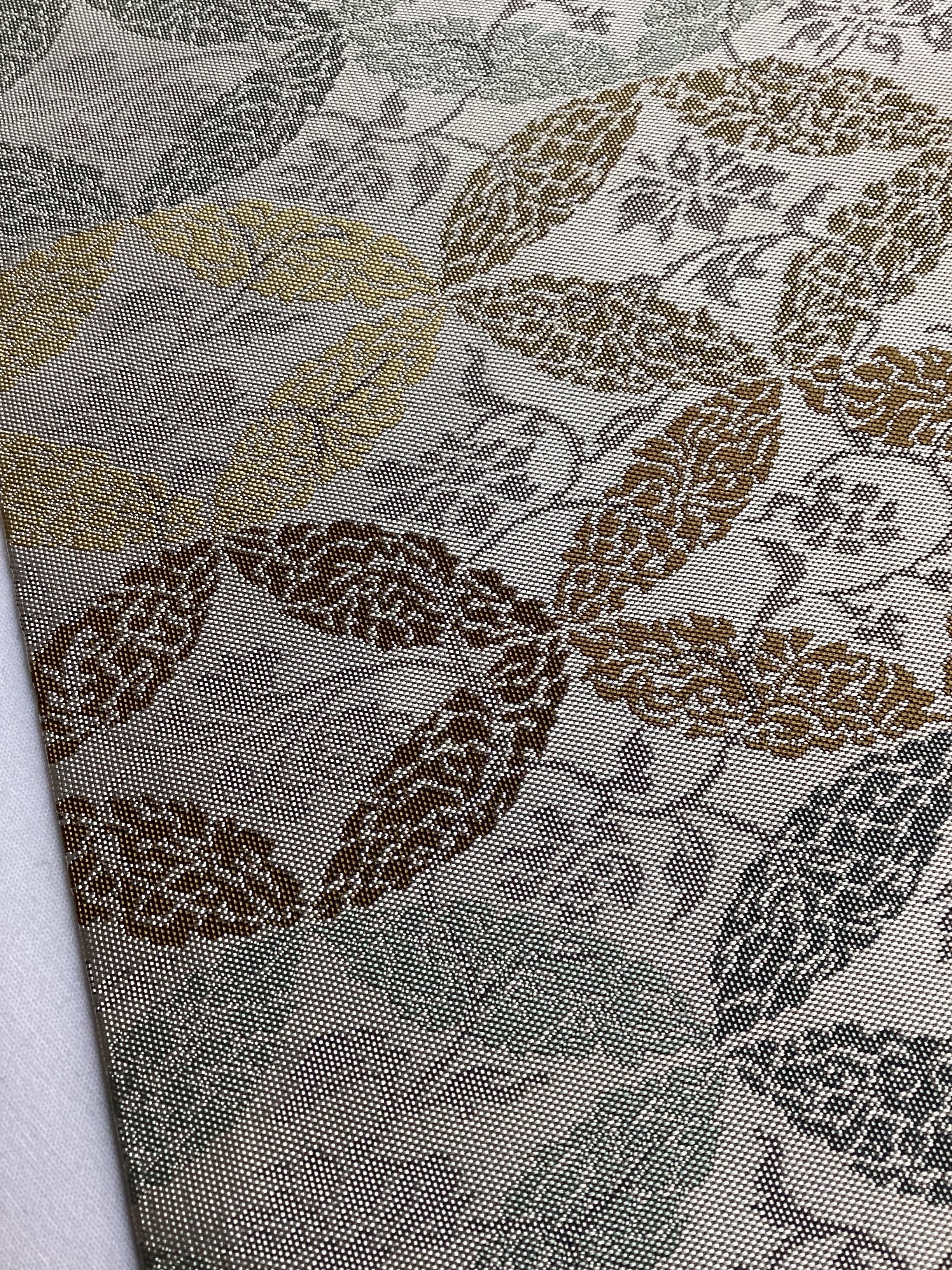 西陣の長谷川織物の全通柄の九寸なごや帯です。ひとつひとつ丁寧に織り上げる上質な帯が人気の機屋でしたが、残念ながら機をたたまれ、今では手に入らないお品となってしまいました。こちらのなごや帯も、張りがあり、しっかりとした上質な織地でオタイコが美しく決まります。また、格調のある全通柄の割り付け文様のため、扱い安く締めやすいのも嬉しい帯です。