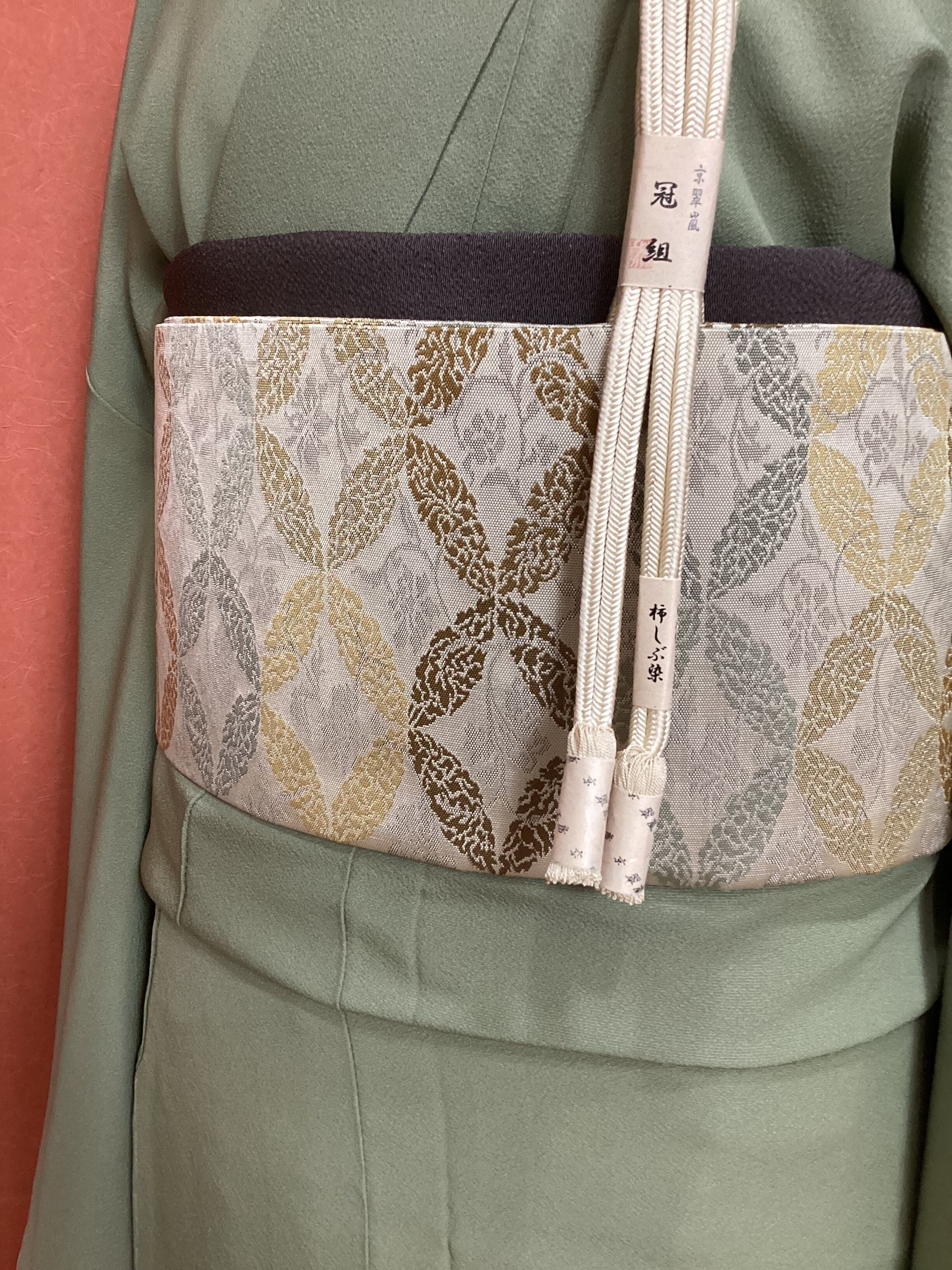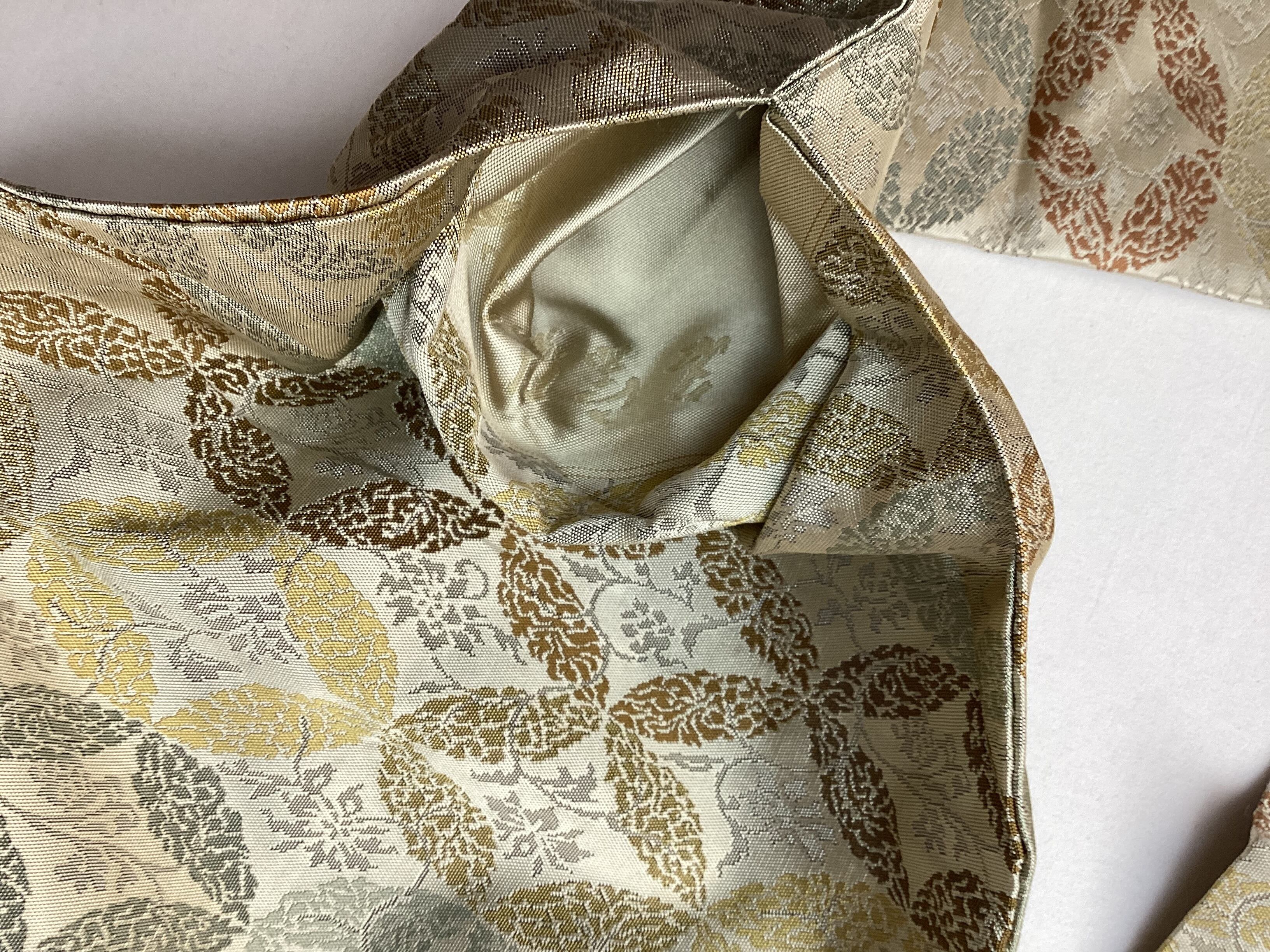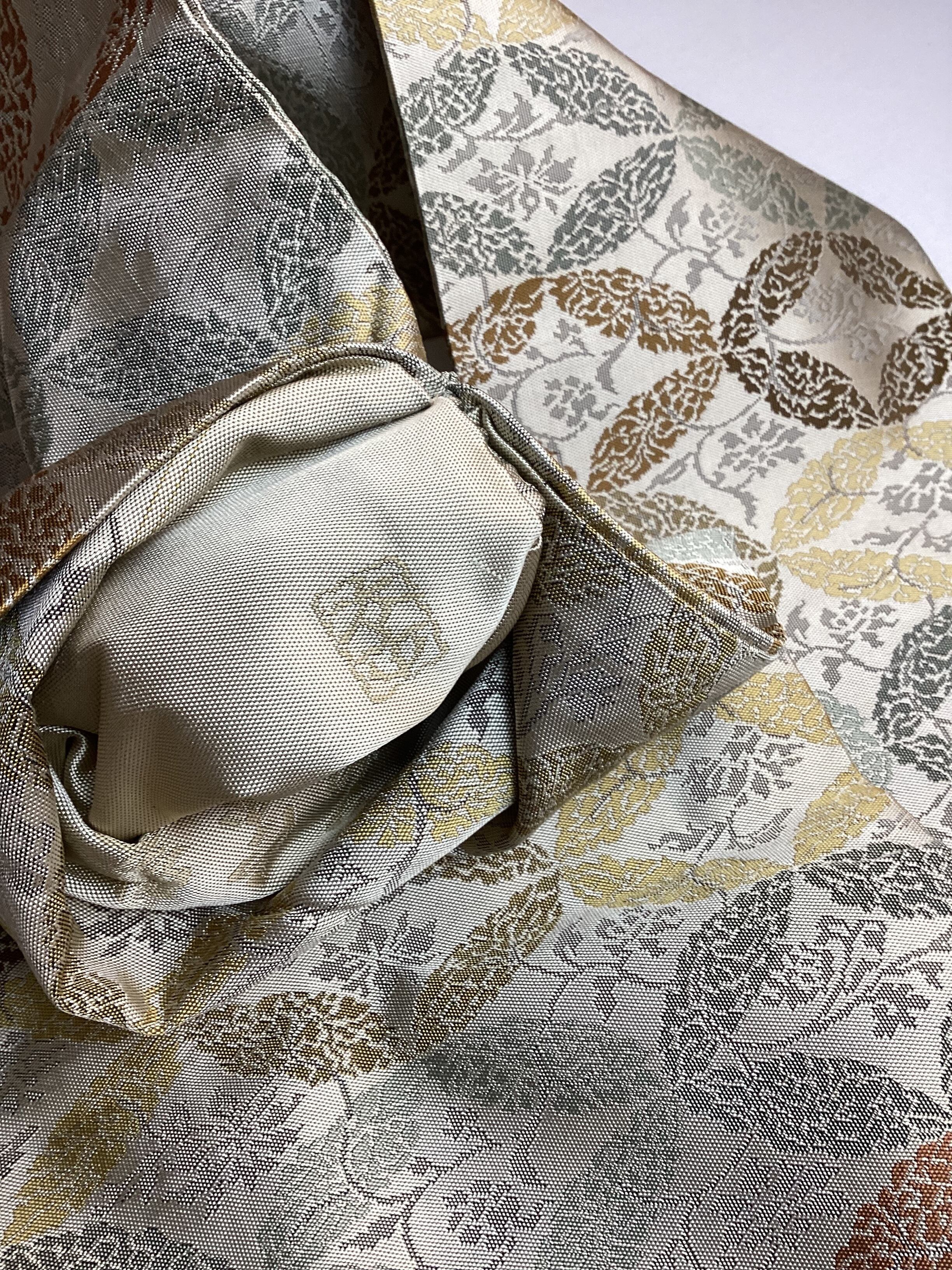 西陣の長谷川織物の全通柄の九寸なごや帯です。ひとつひとつ丁寧に織り上げる上質な帯が人気の機屋でしたが、残念ながら機をたたまれ、今では手に入らないお品となってしまいました。こちらのなごや帯も、張りがあり、しっかりとした上質な織地でオタイコが美しく決まります。また、格調のある全通柄の割り付け文様のため、扱い安く締めやすいのも嬉しい帯です。