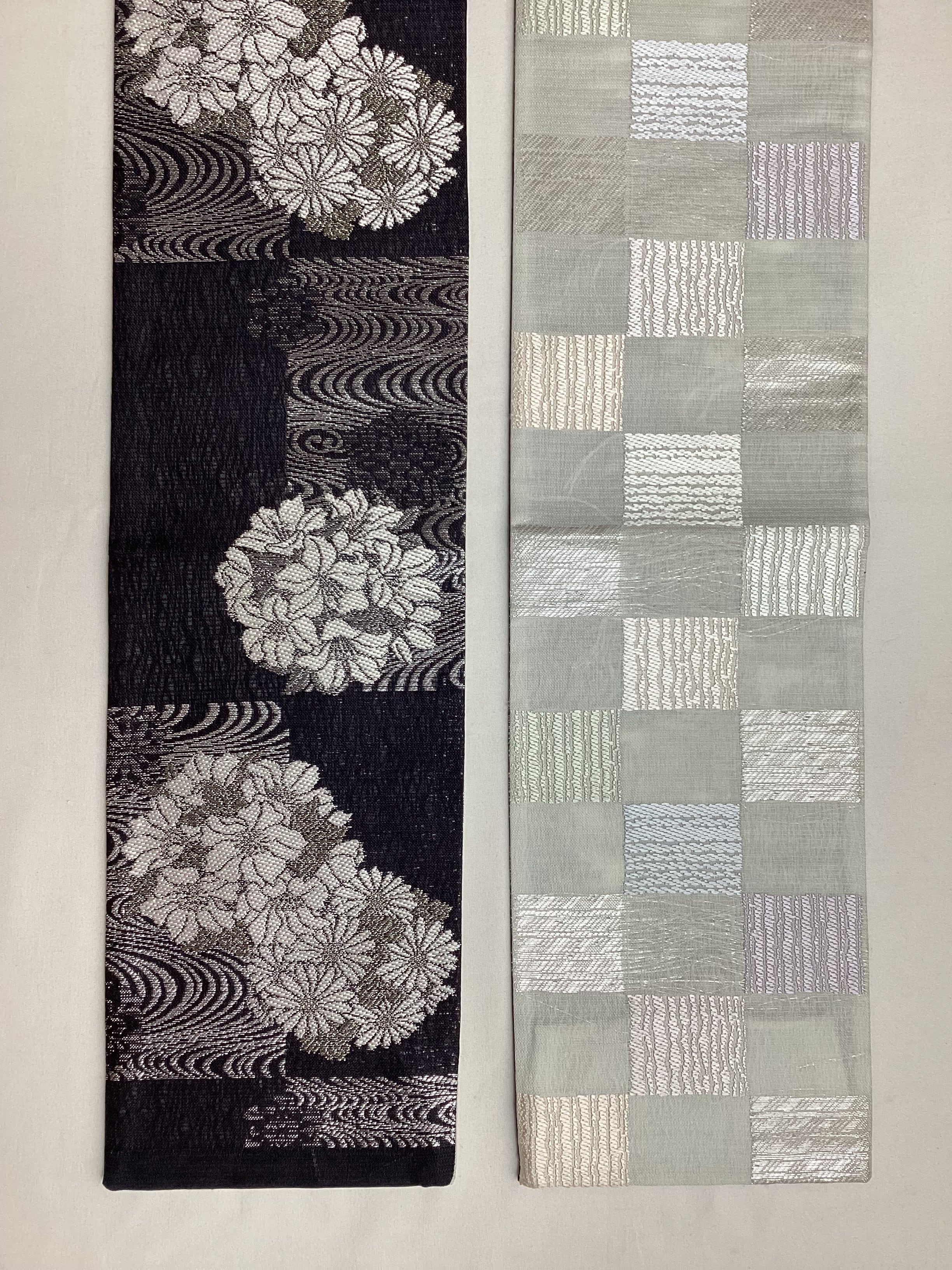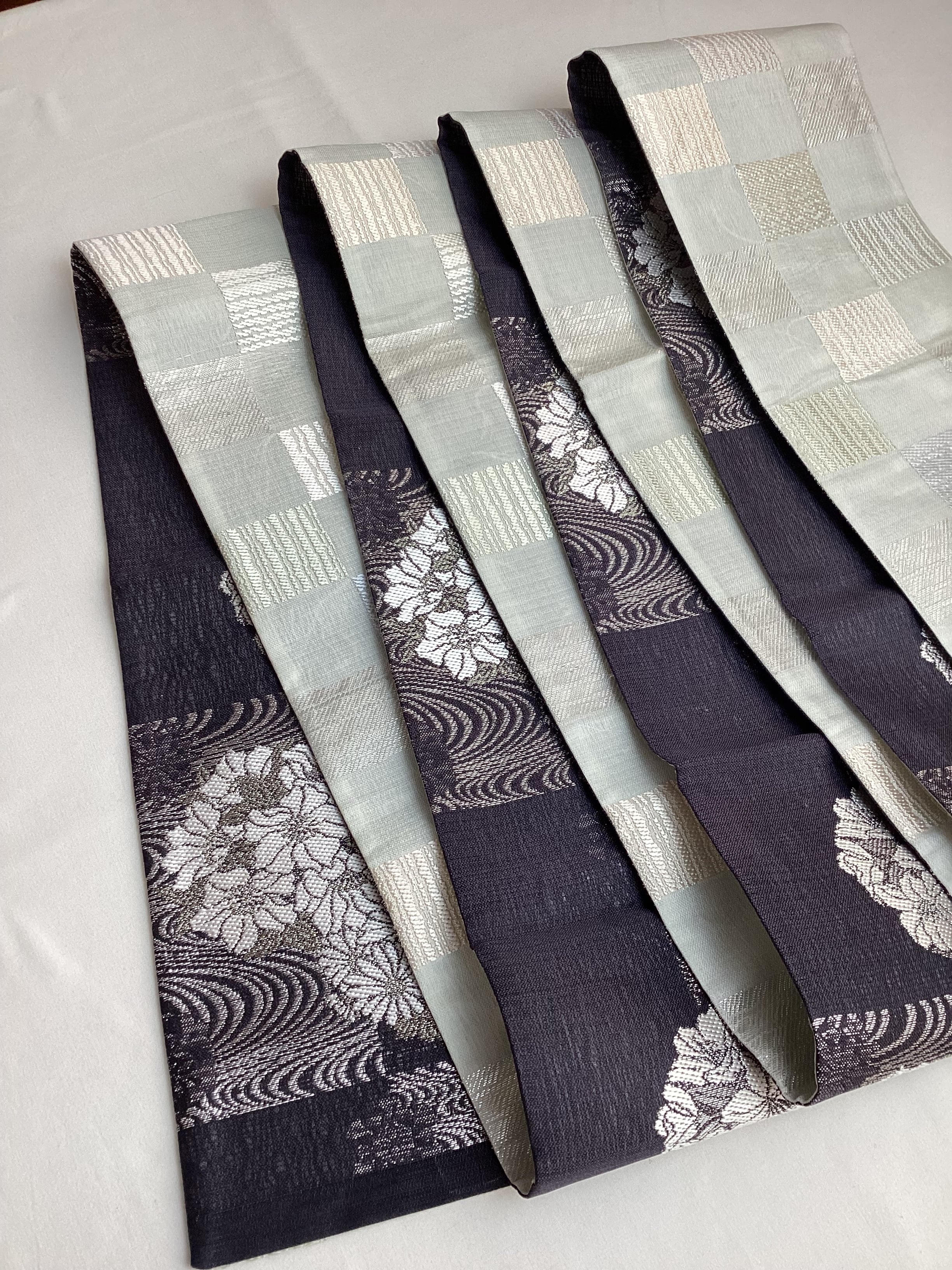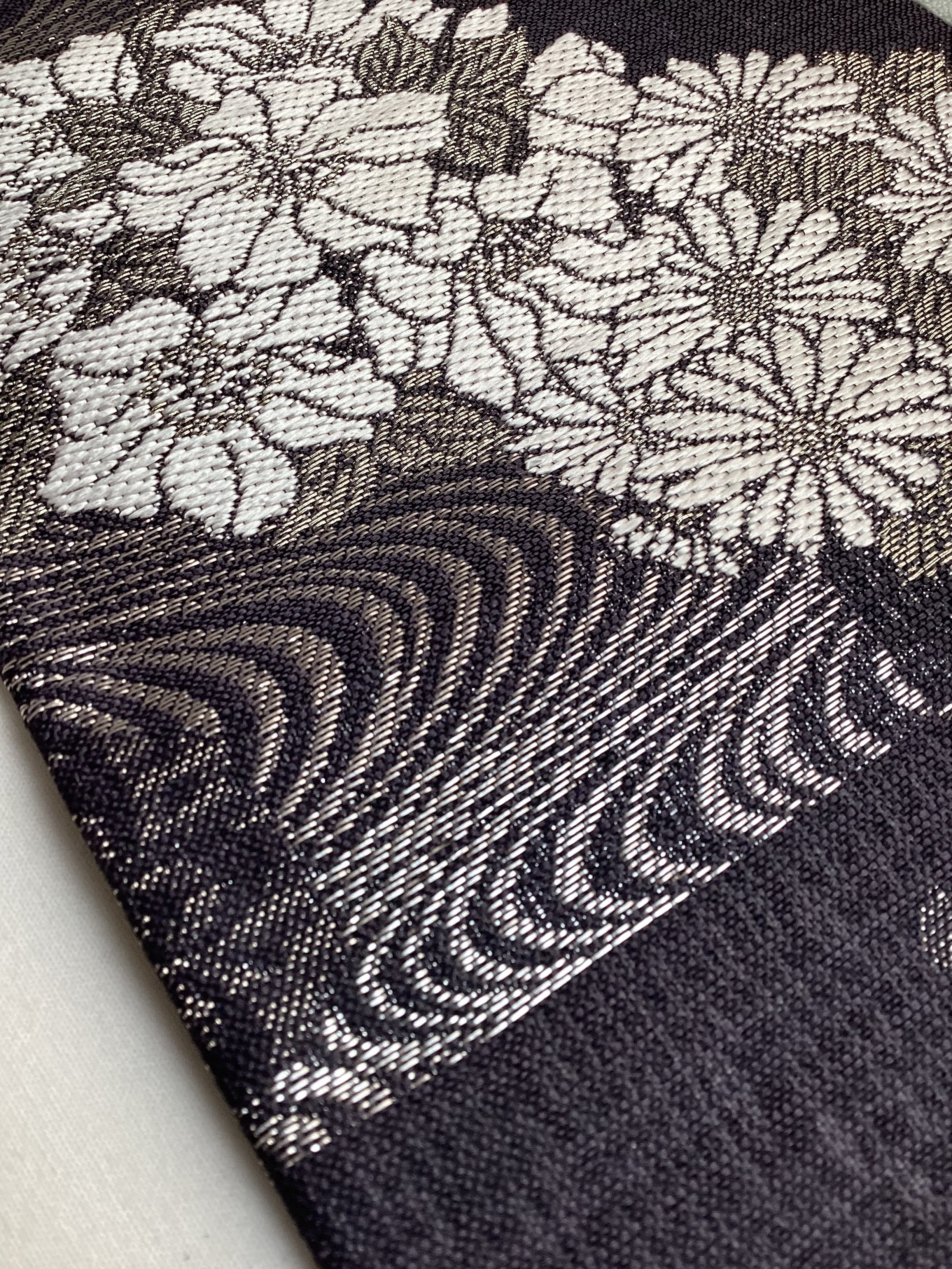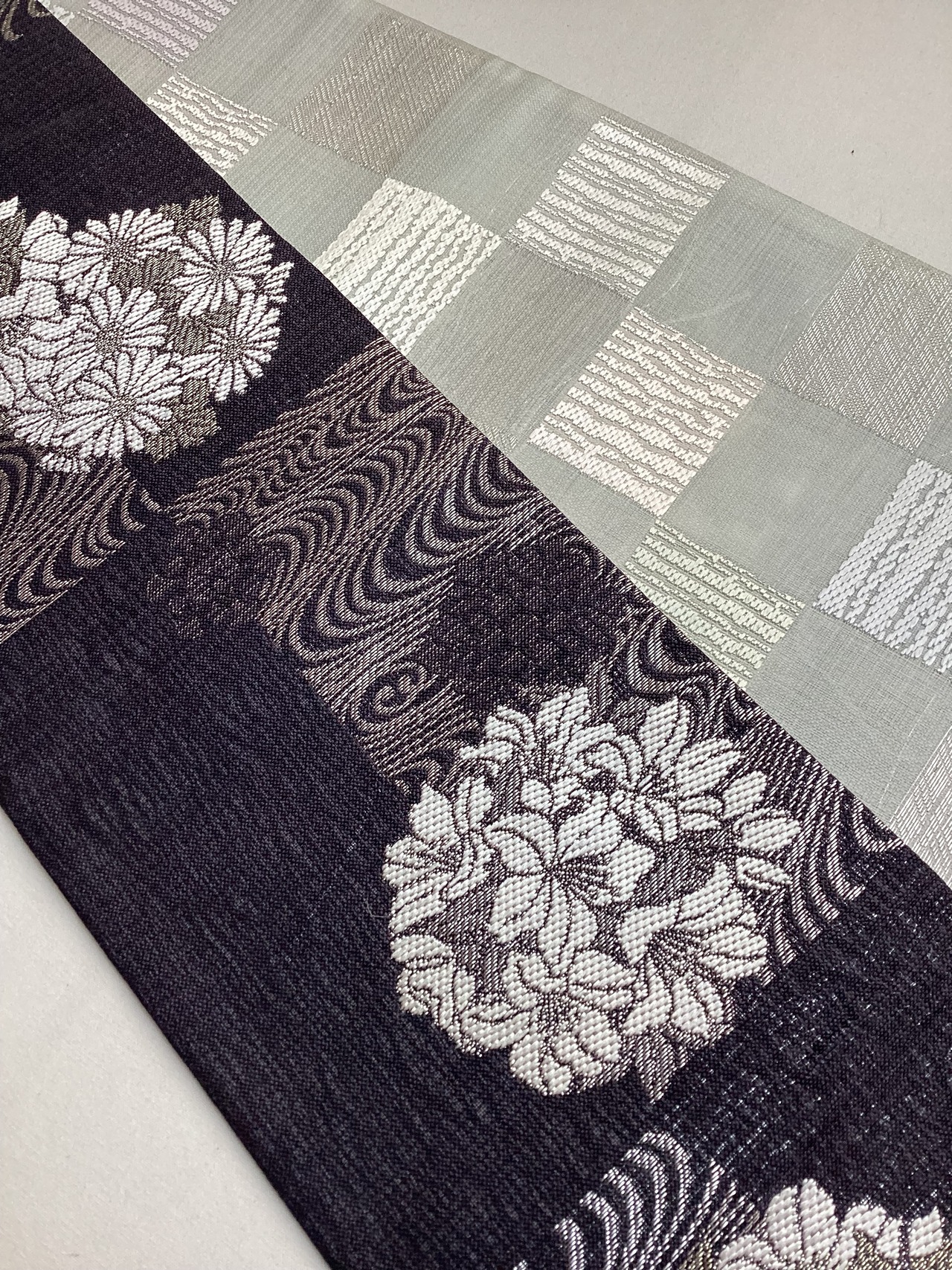 墨黒地花に流水文×乳白色地市松文両面半巾帯 260331-2