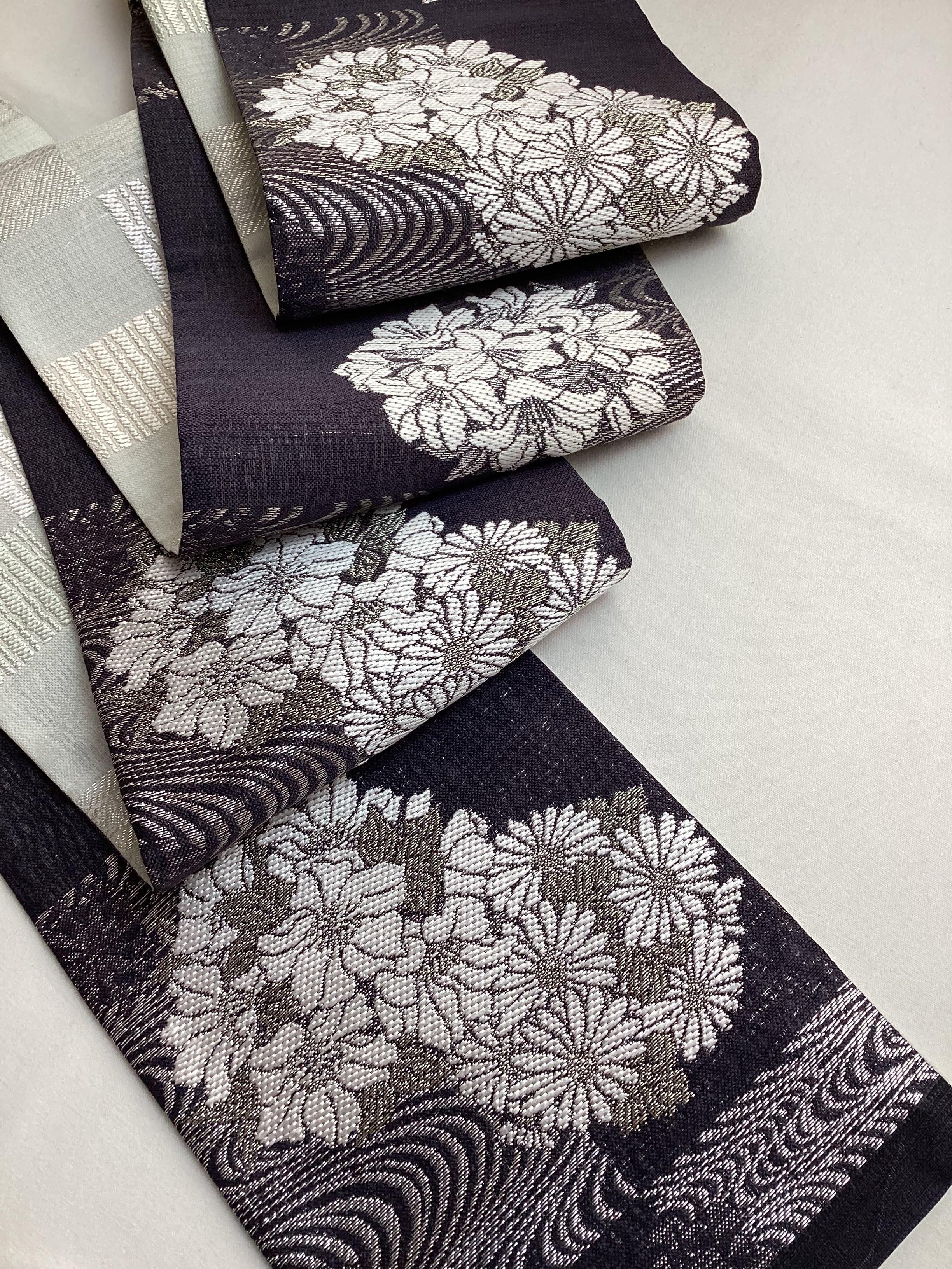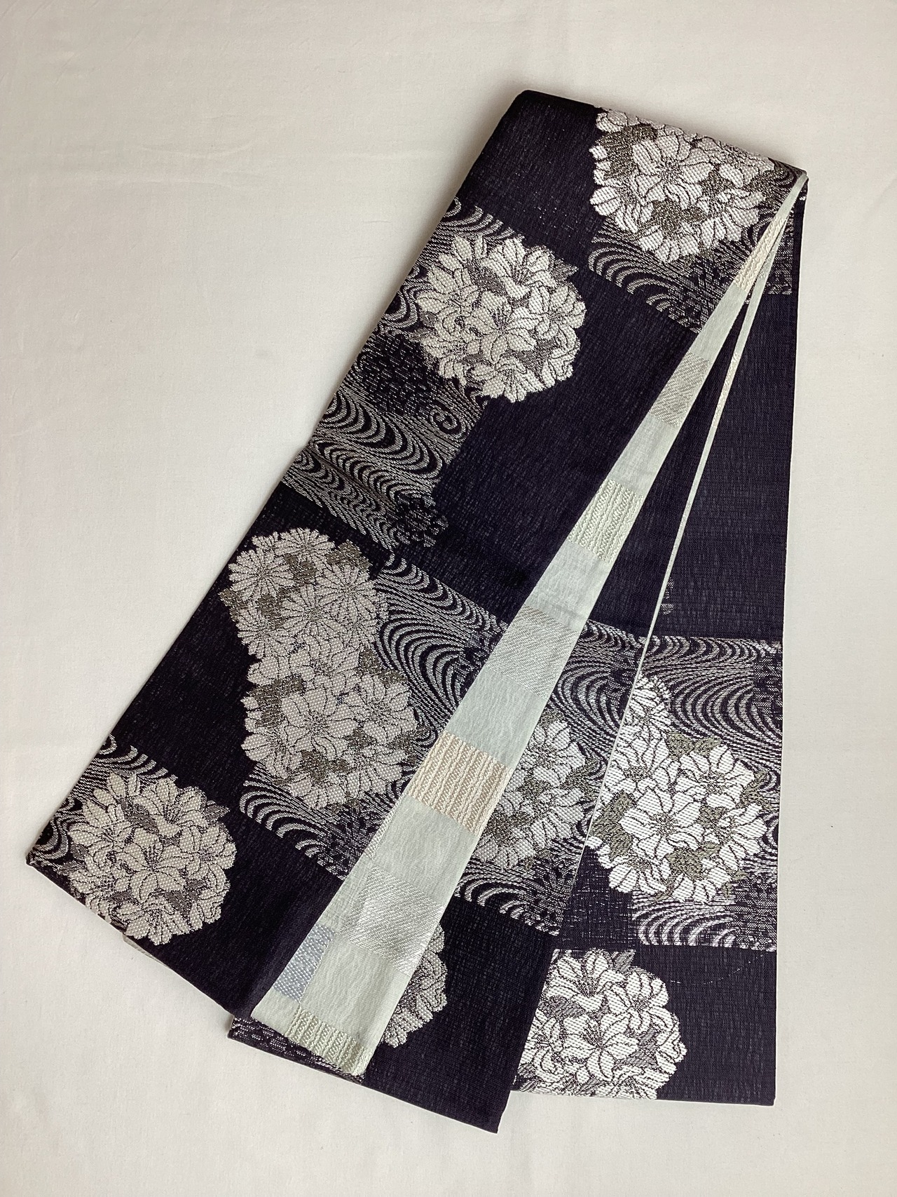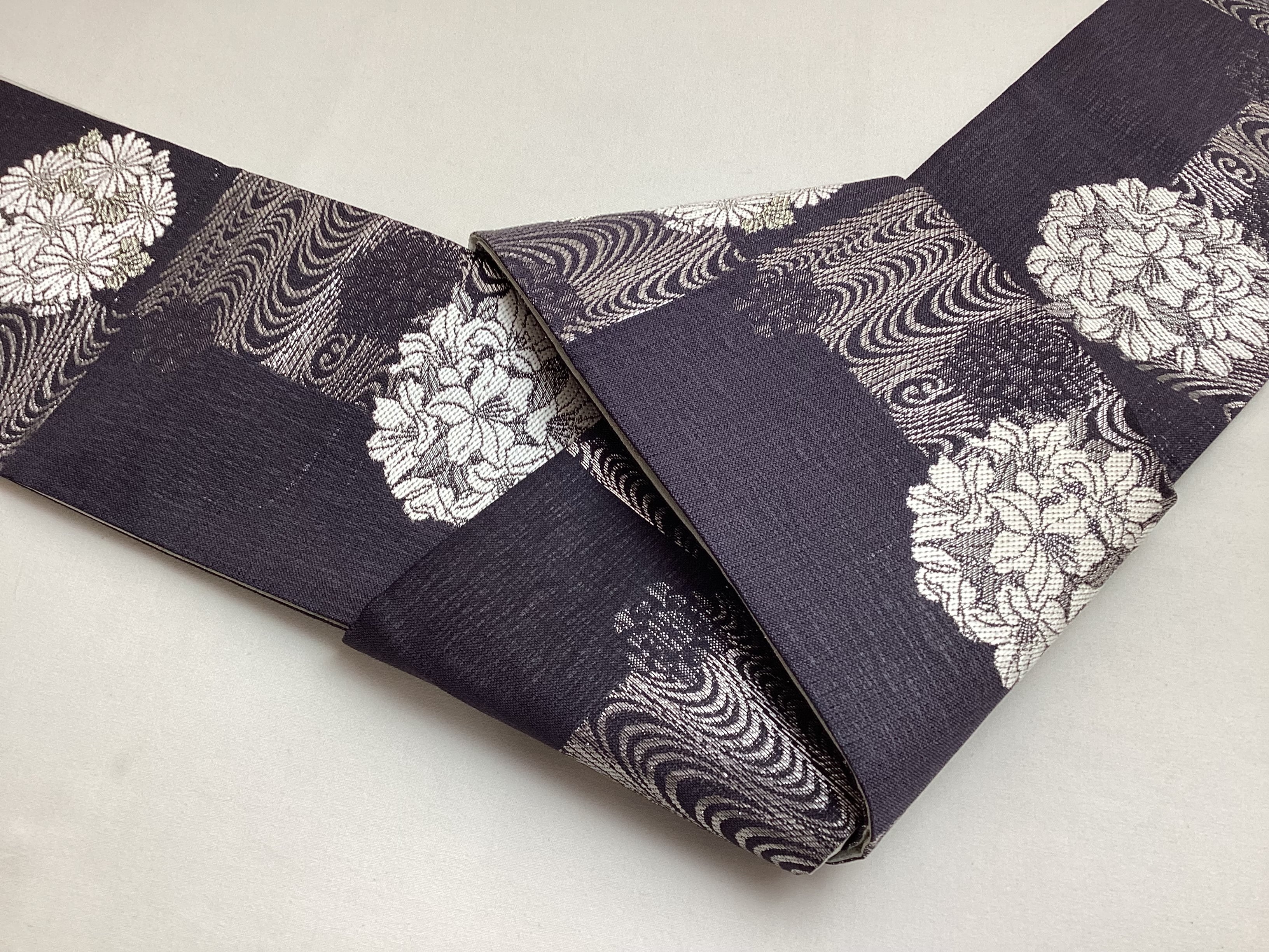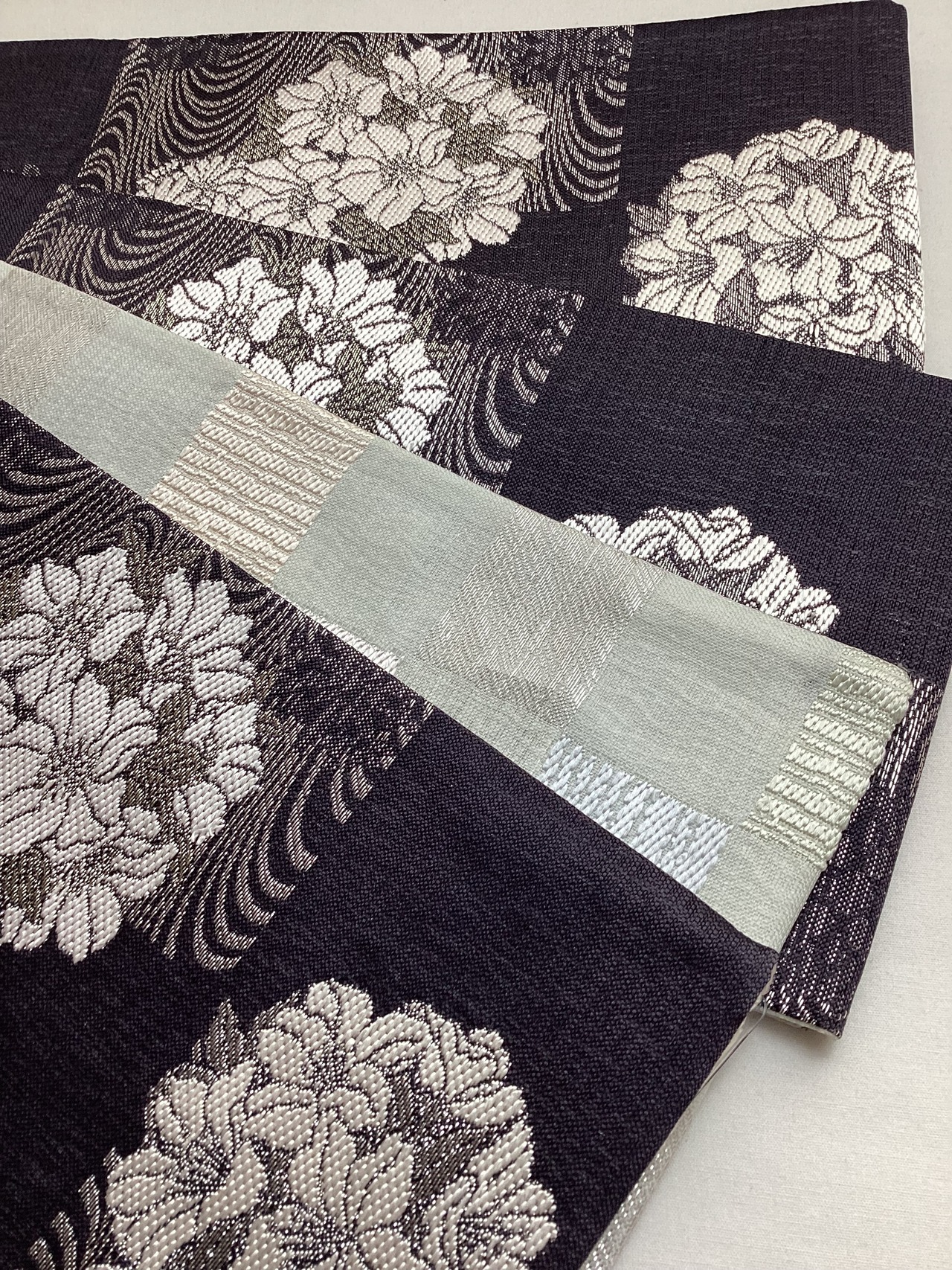 墨黒地花に流水文×乳白色地市松文両面半巾帯 260331-2