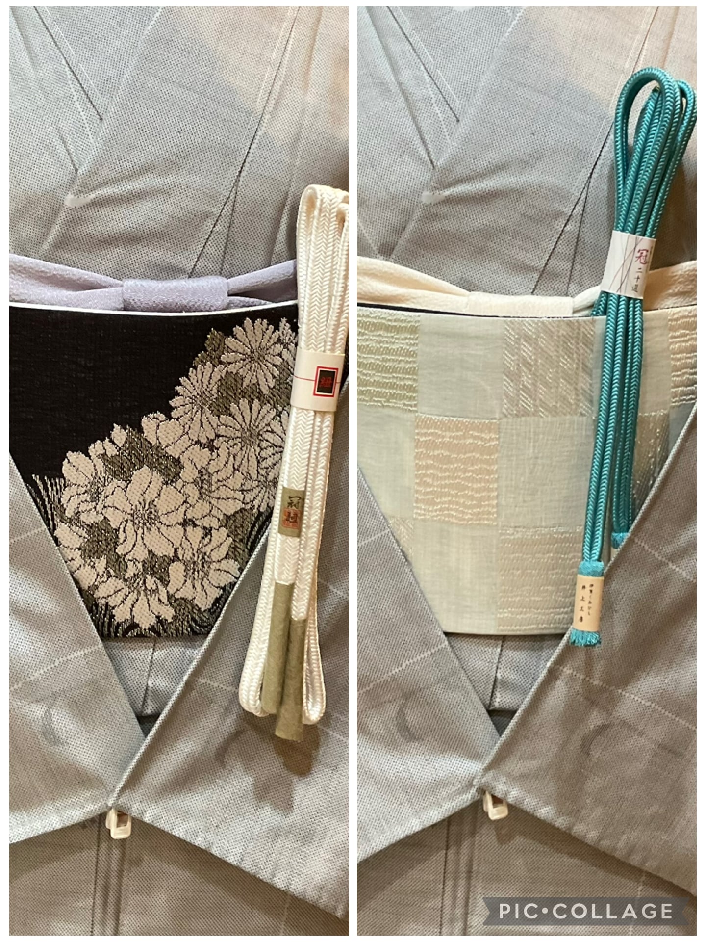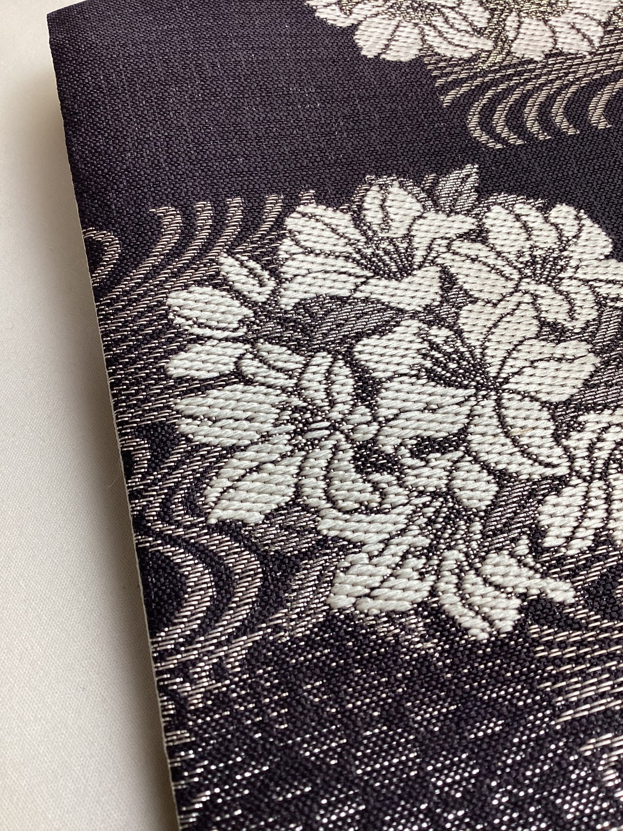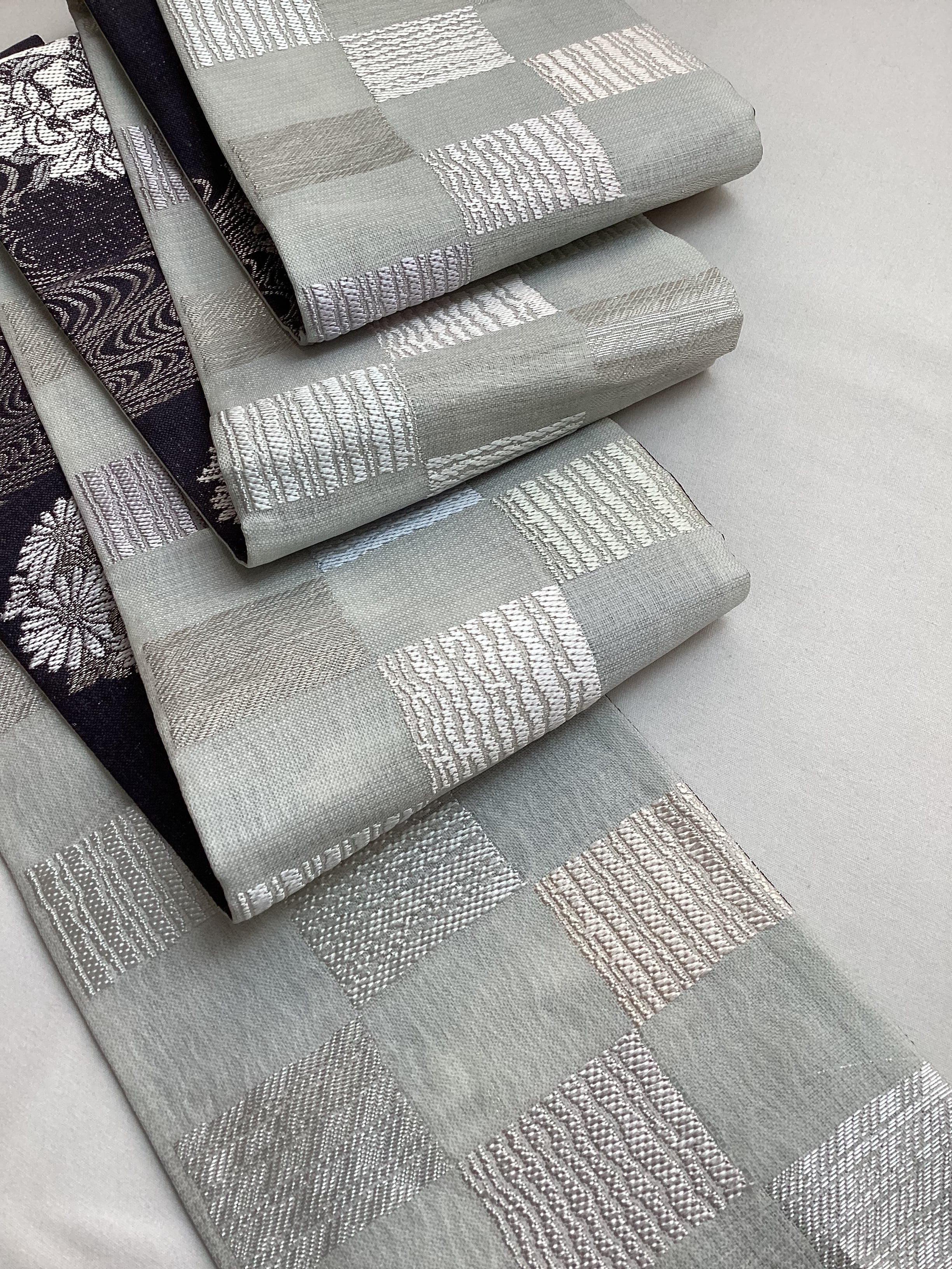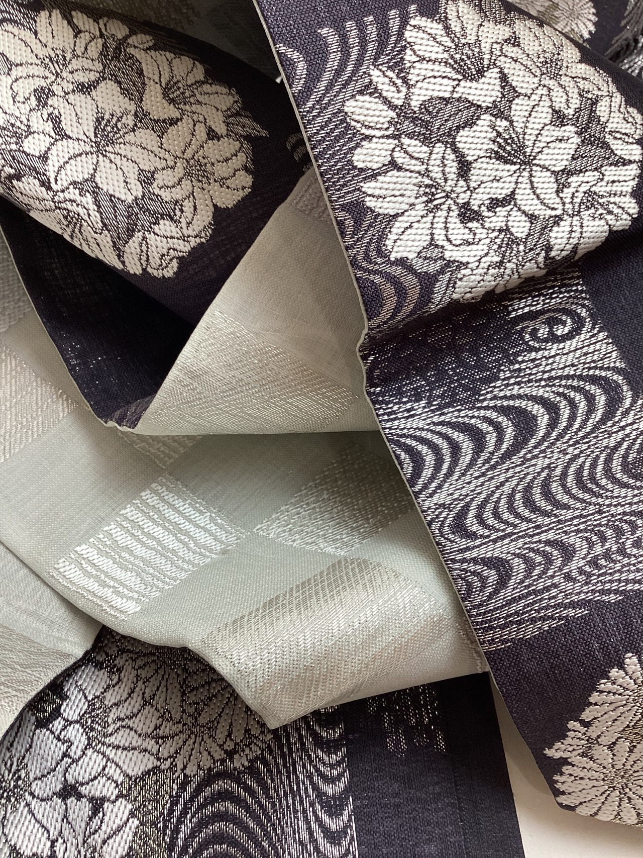 墨黒地花に流水文×乳白色地市松文両面半巾帯 260331-2